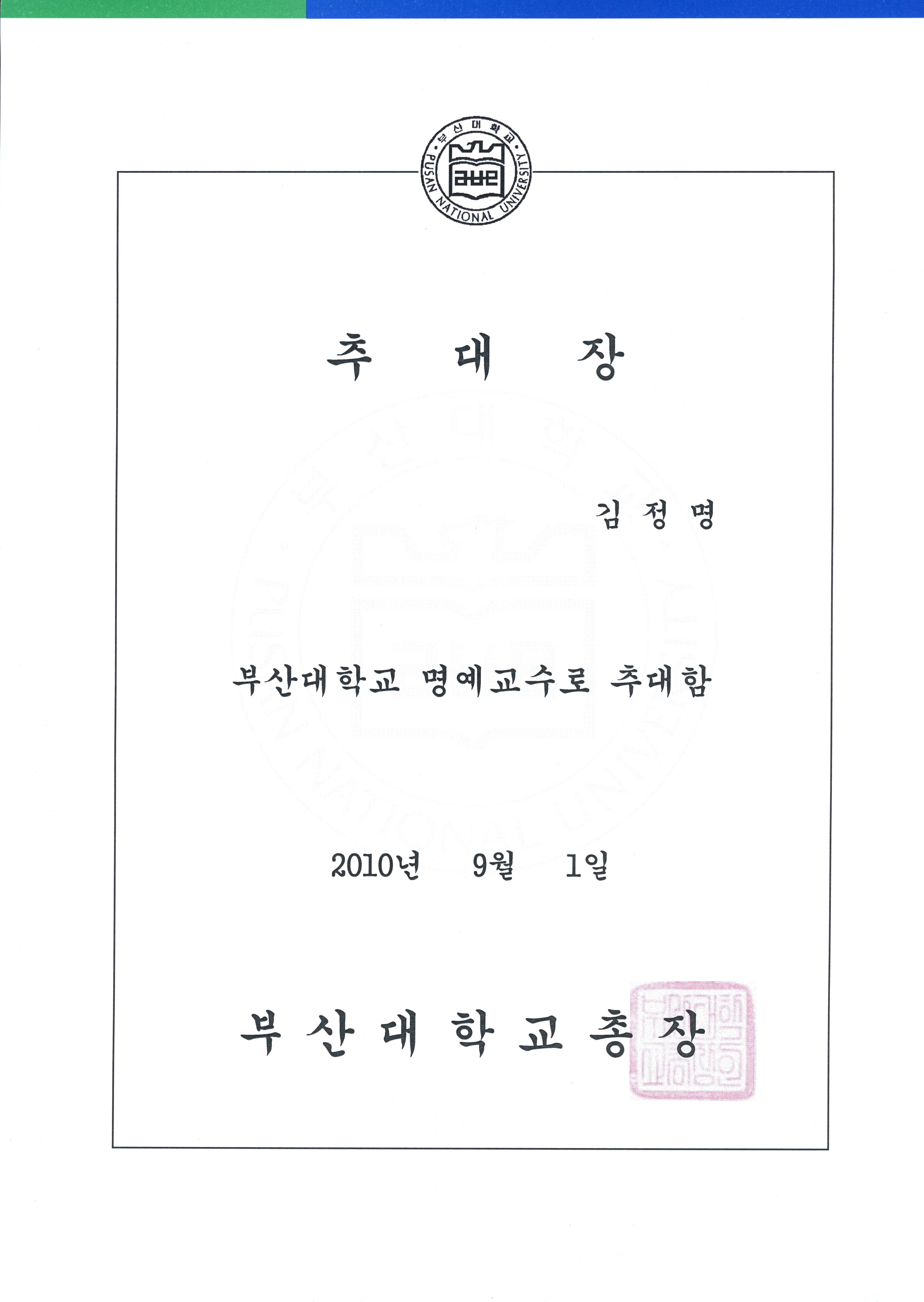 2010년 9월 1일 부산대학교 총장으로 받은 부산대학교 명예교수 추대장이다.