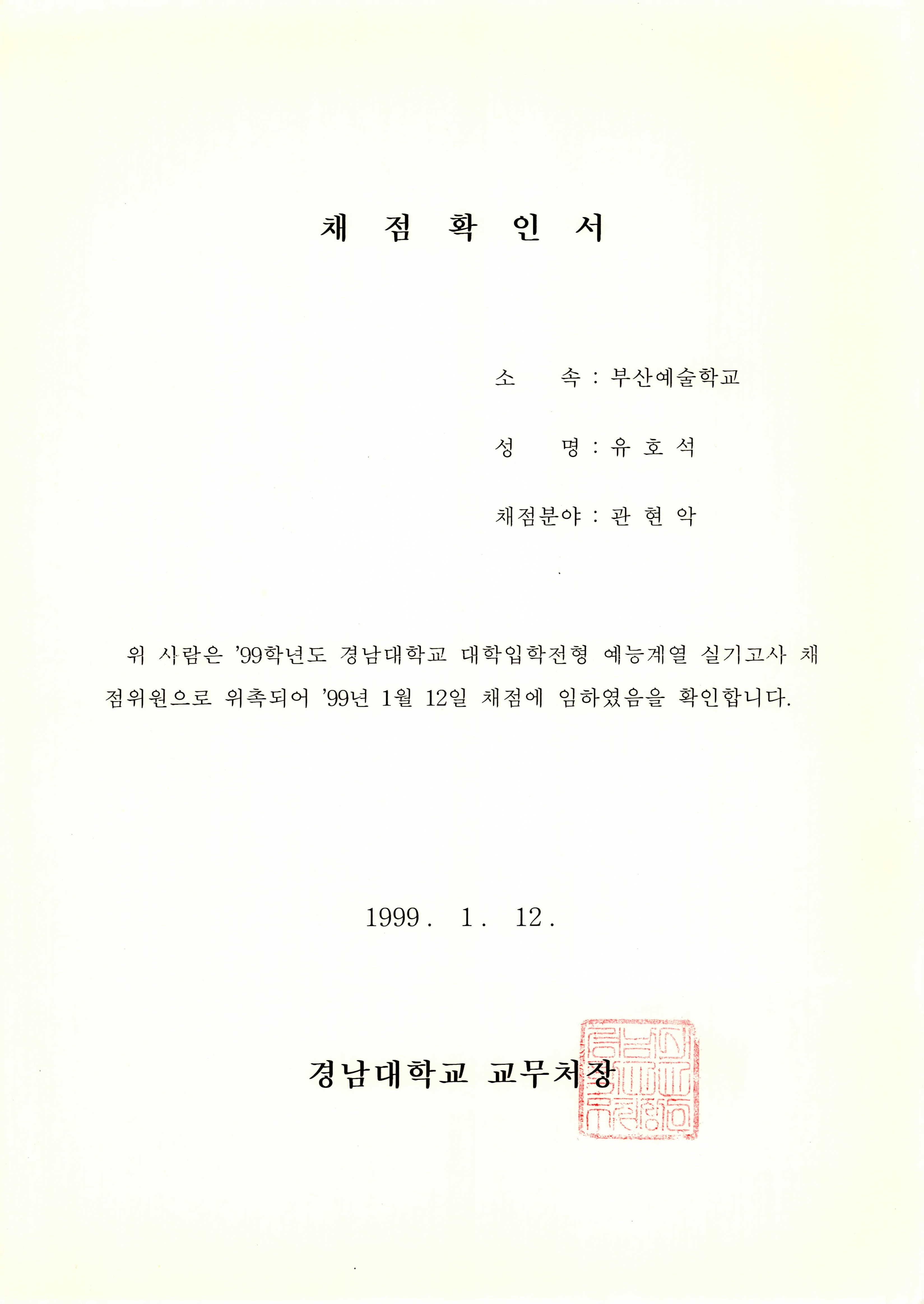 경남대학교 1999학년도 대학입학전형 실기고사 채점위원 확인서