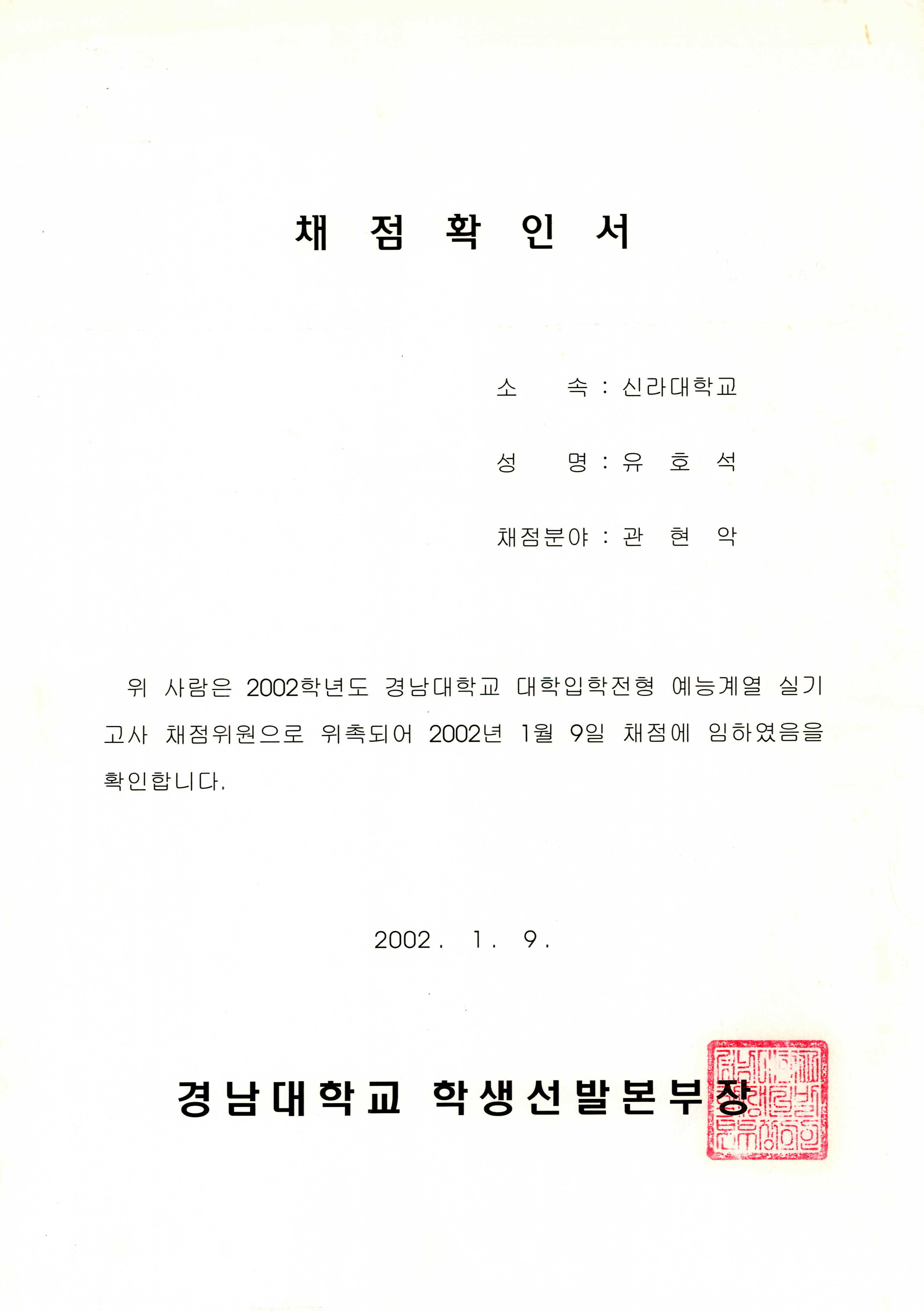 2002학년도 경남대학교 대학입학전형 예능계열 실기고사 채점위원 확인서
