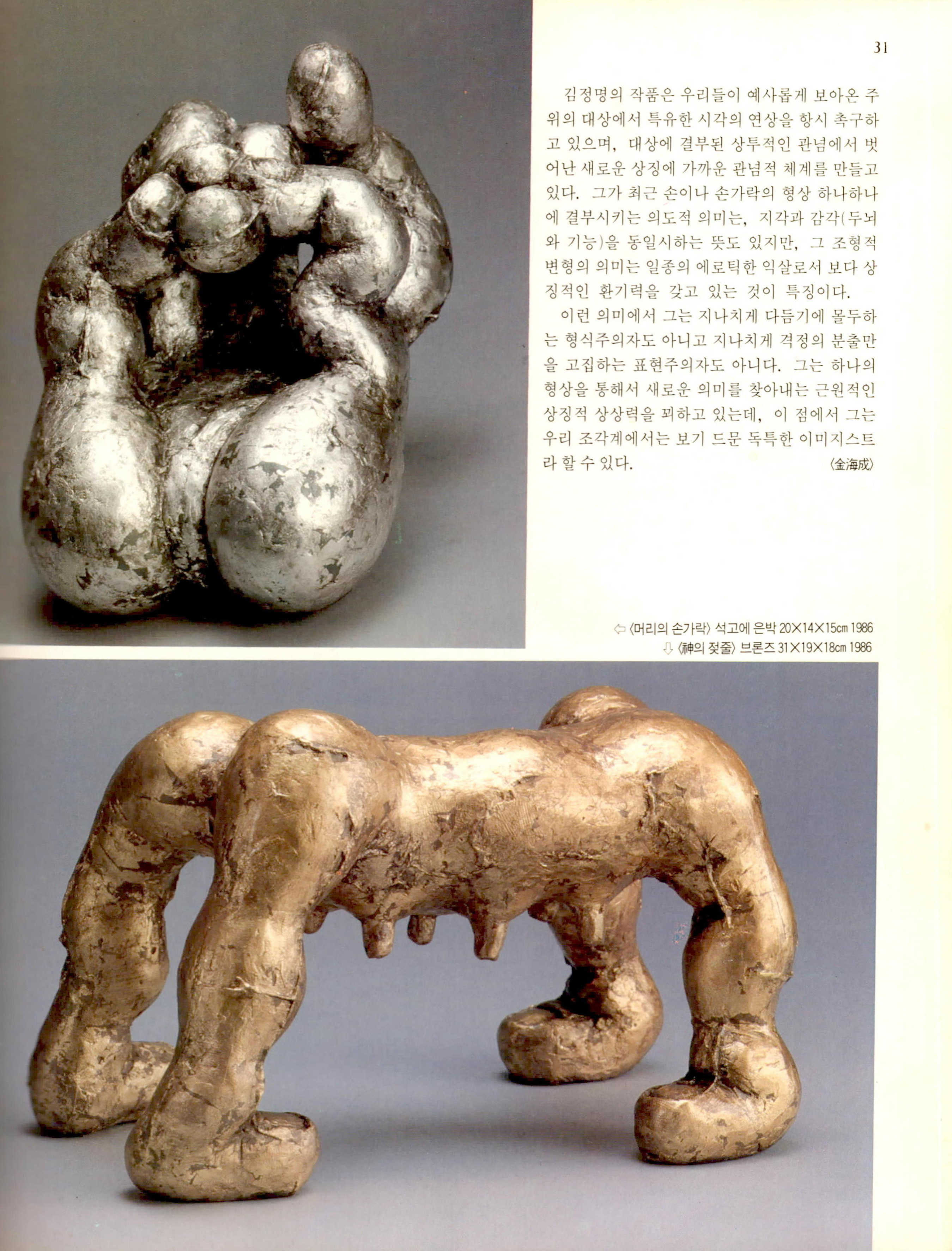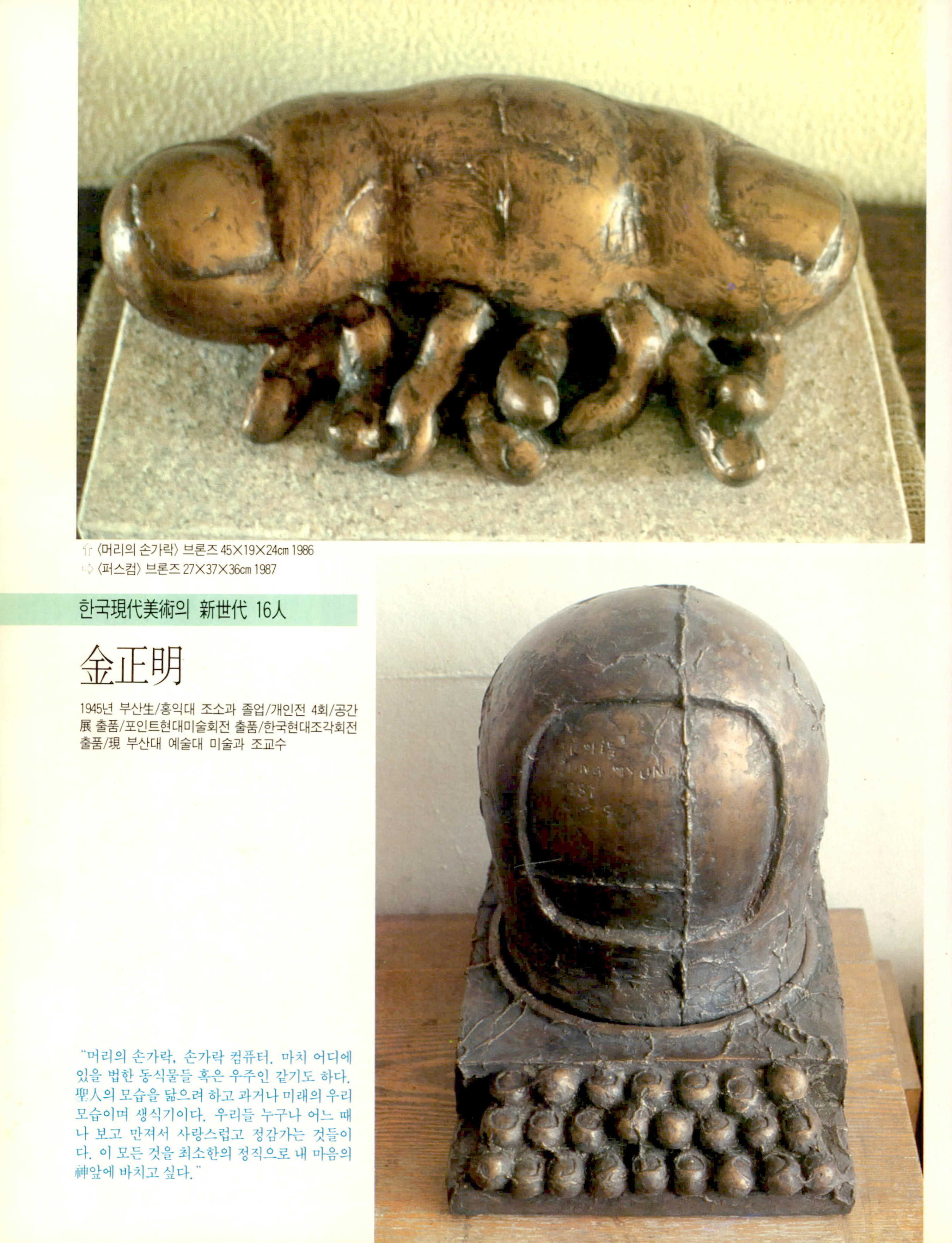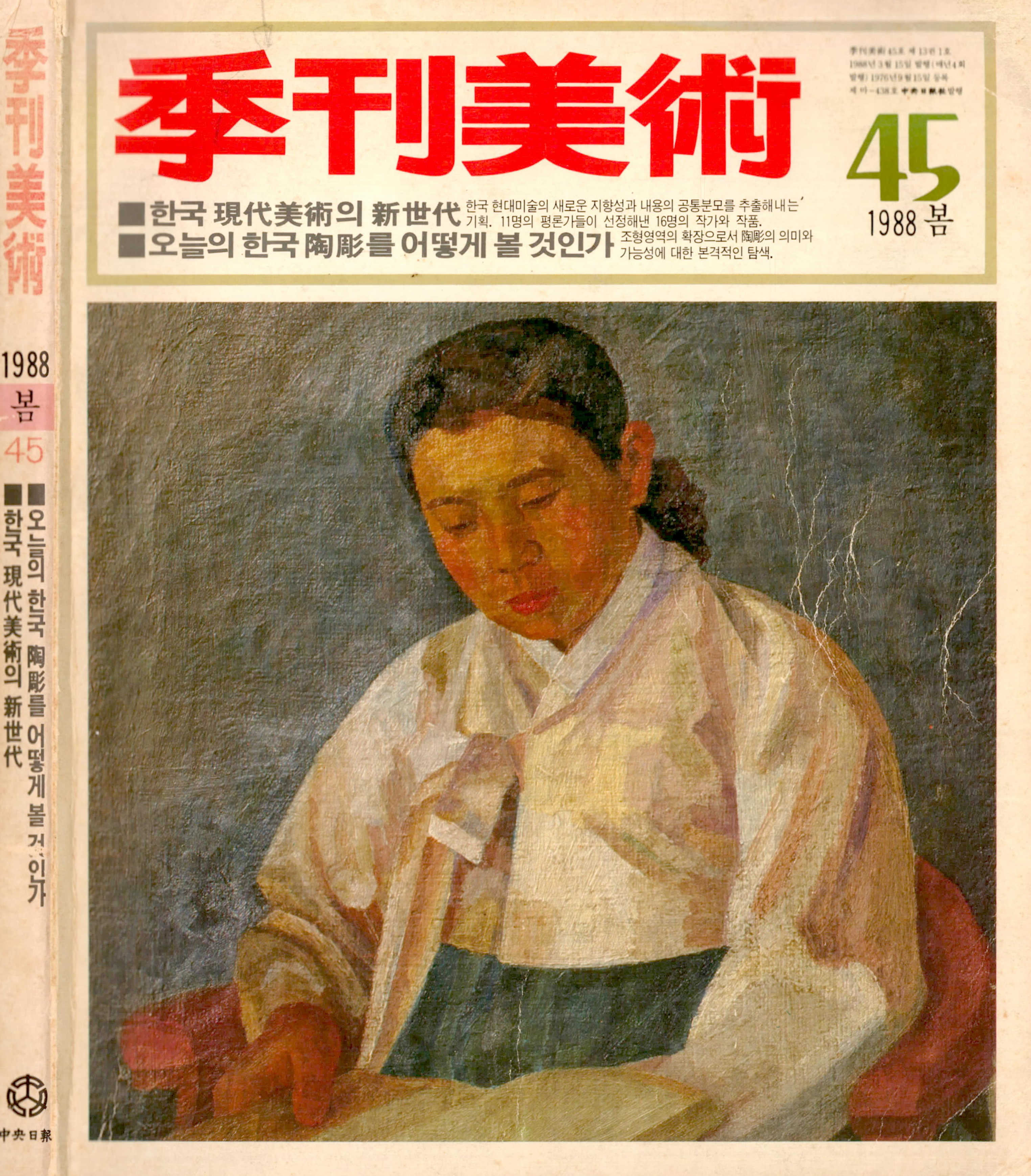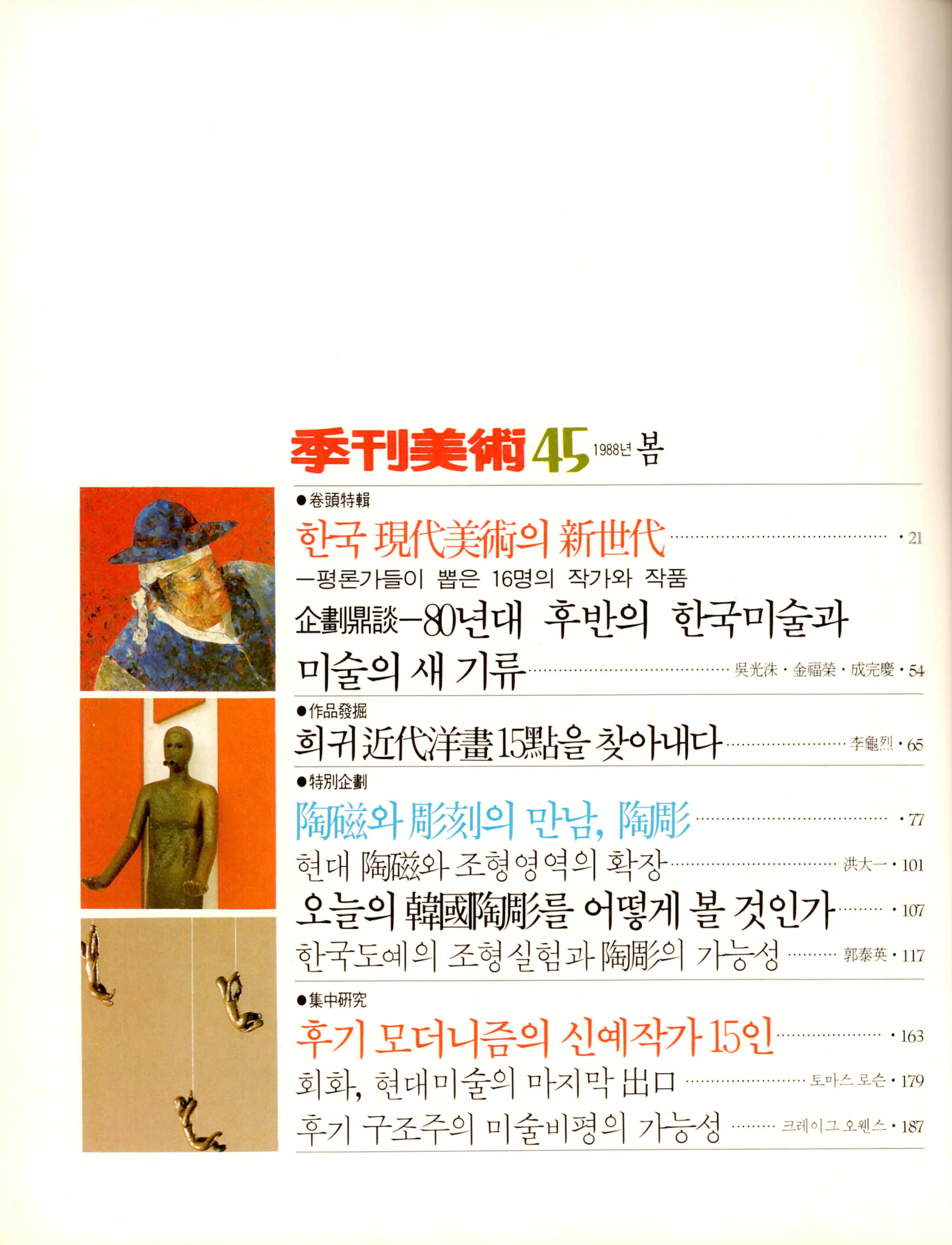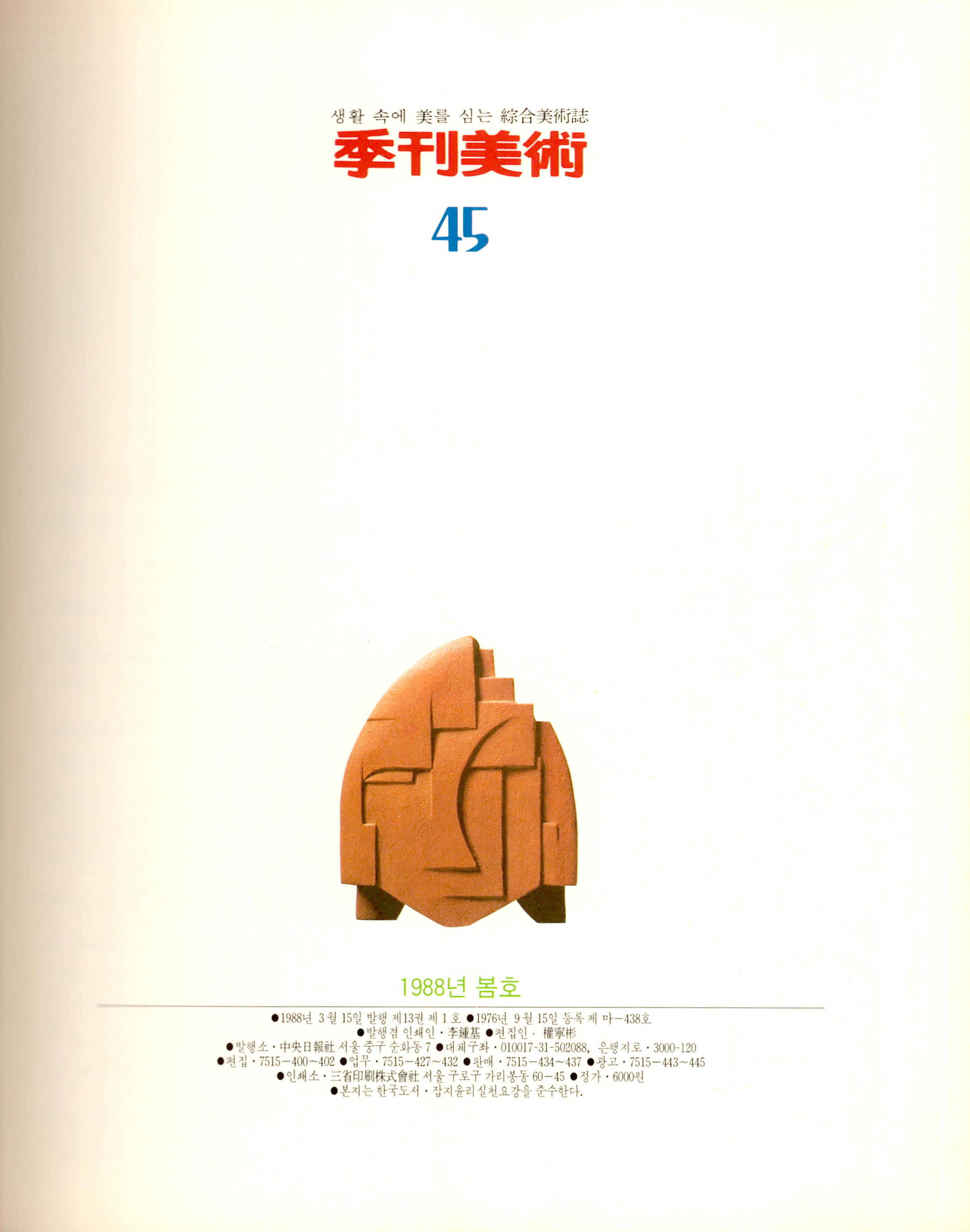 1988년 3월 15일에 발행된 계간미술 45 1988봄호로 작품 <머리의 손가락>(브론즈, 45X19X24cm, 1986), <퍼스컴>(브론즈, 27X37X36cm, 1987), <머리의 손가락>(석고에 은박, 20X14X15cm, 1986), <神(신)의 젖줄>(브론즈, 31X19X18cm, 1986)과 설명이 기술되어 있다.