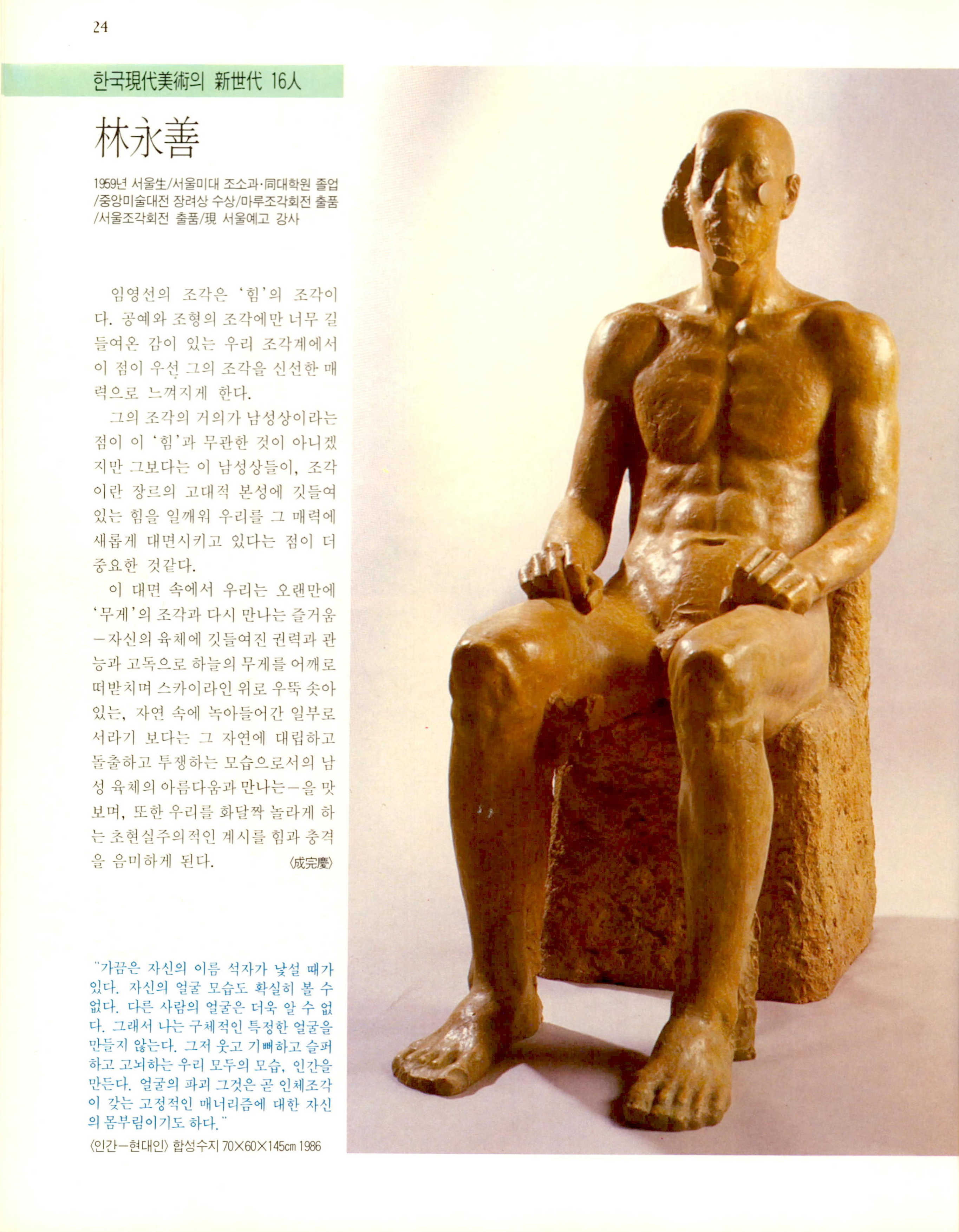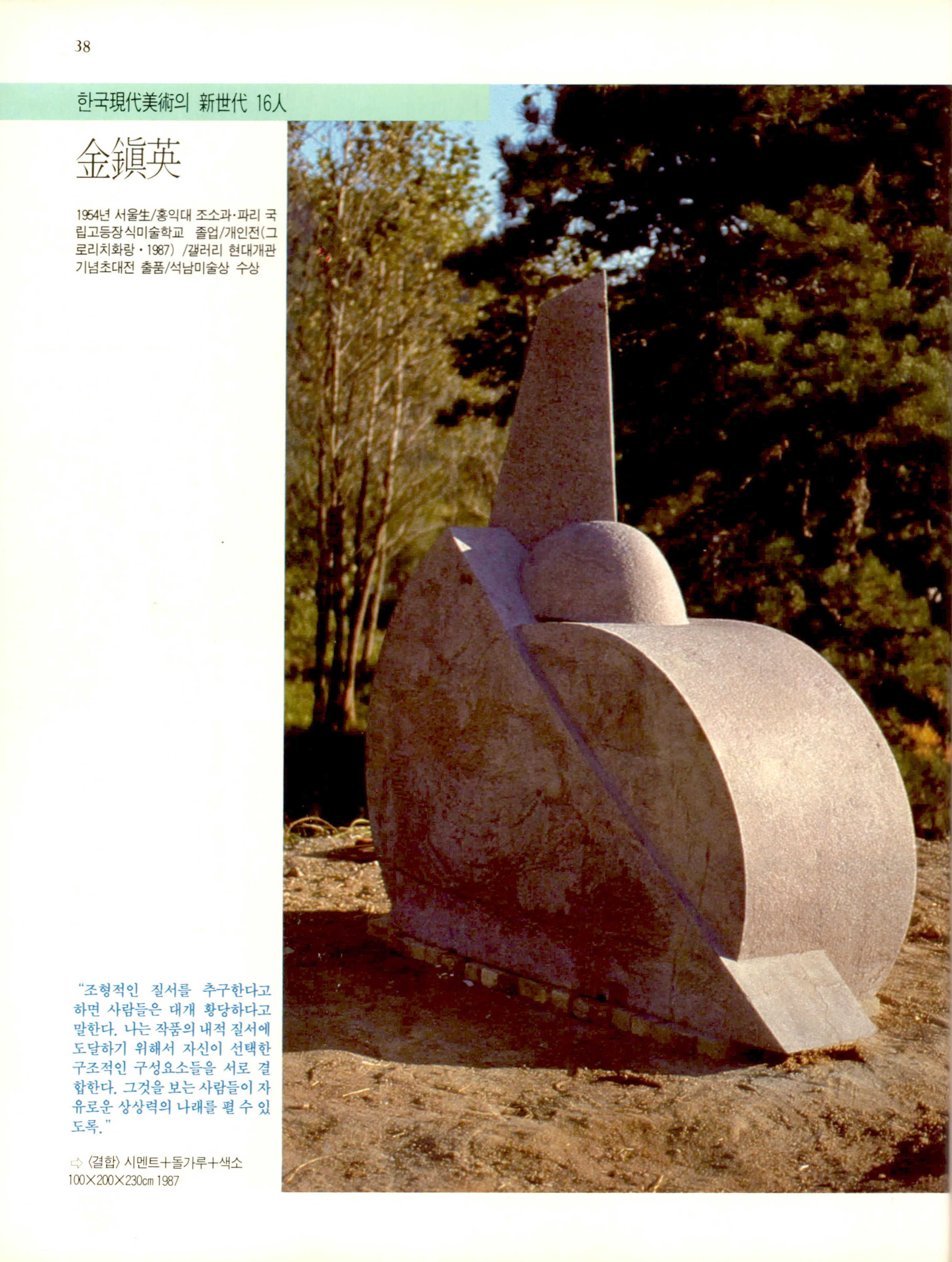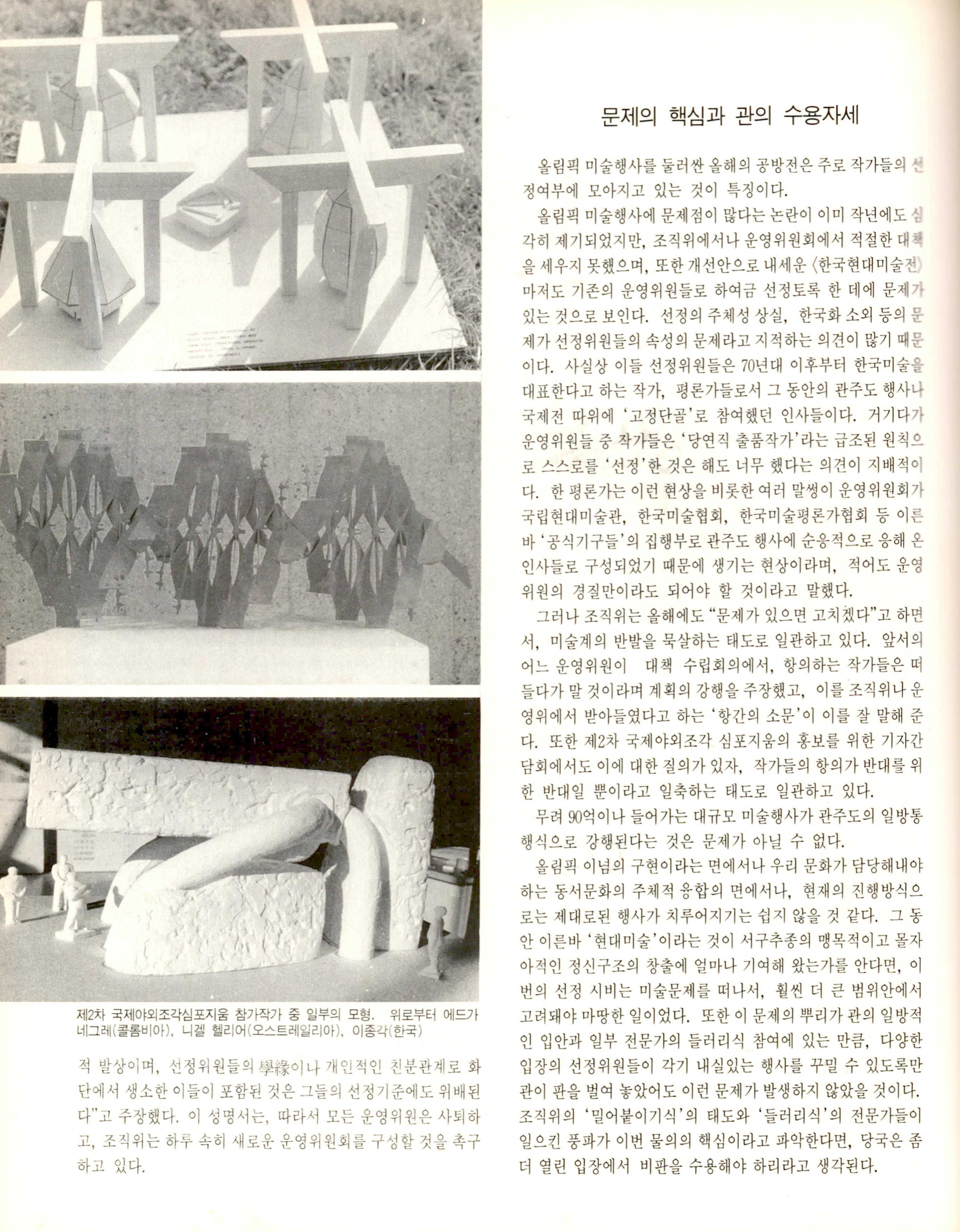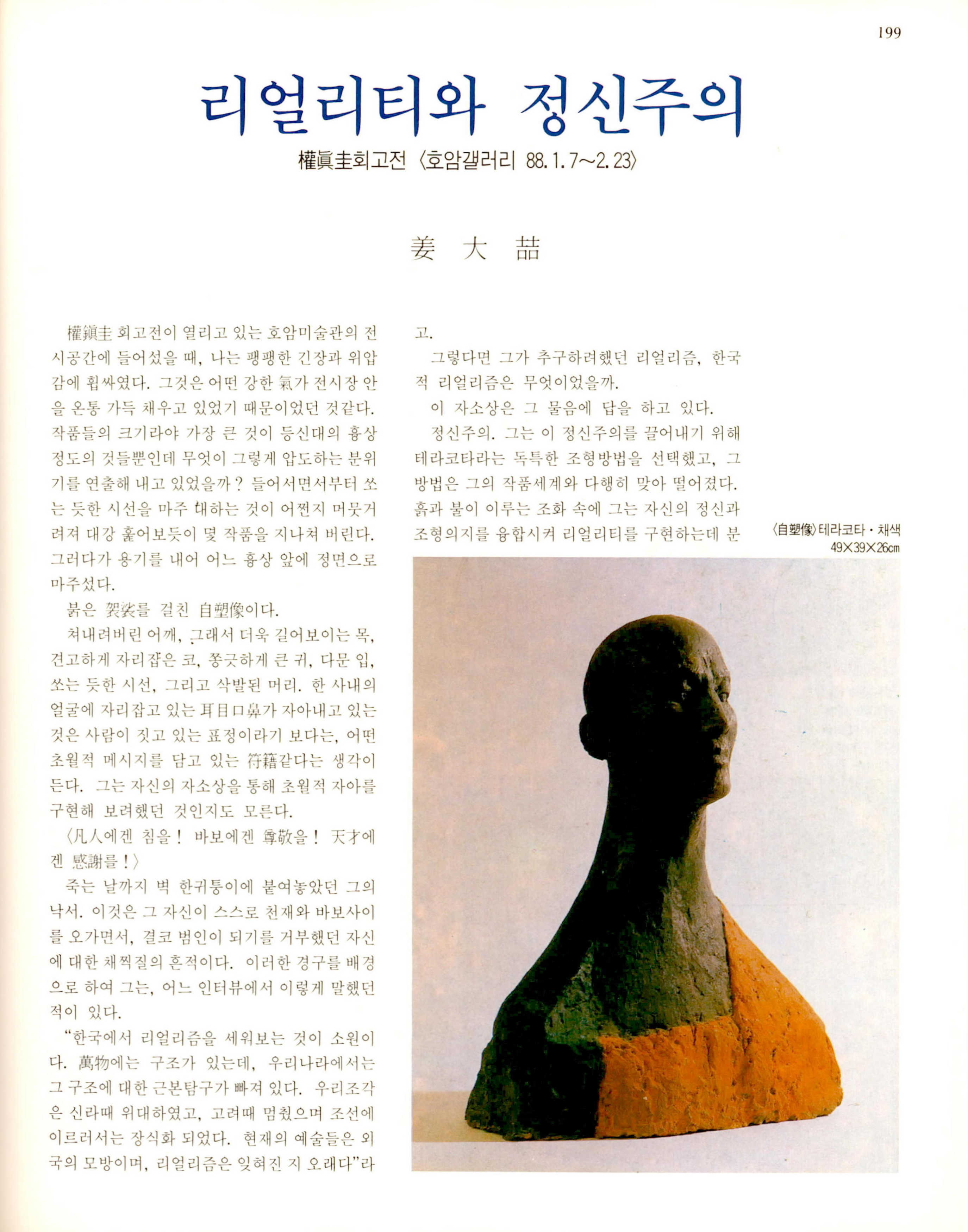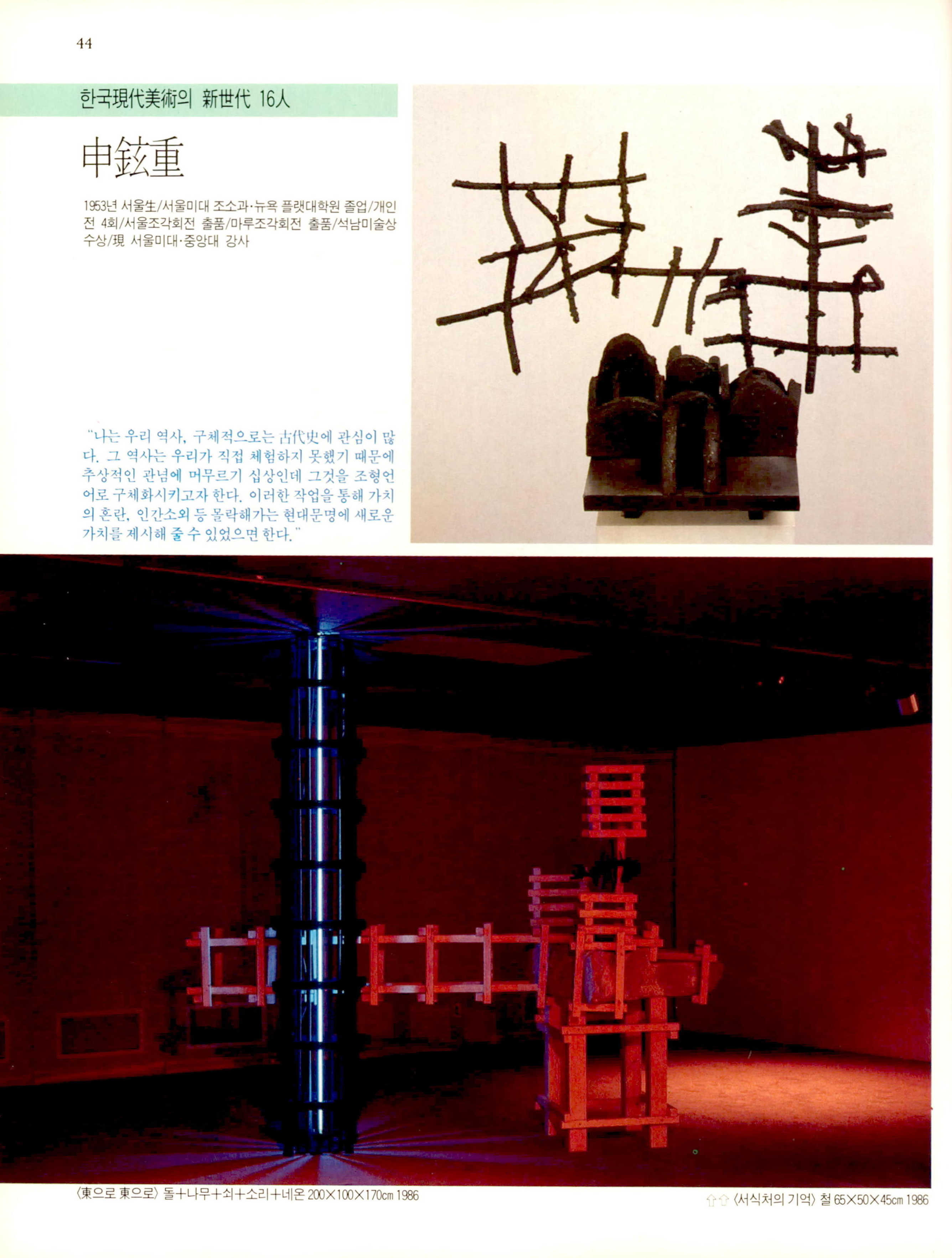 1988년 3월 15일에 발행된 계간미술 45 1988봄호로 작품 <머리의 손가락>(브론즈, 45X19X24cm, 1986), <퍼스컴>(브론즈, 27X37X36cm, 1987), <머리의 손가락>(석고에 은박, 20X14X15cm, 1986), <神(신)의 젖줄>(브론즈, 31X19X18cm, 1986)과 설명이 기술되어 있다.