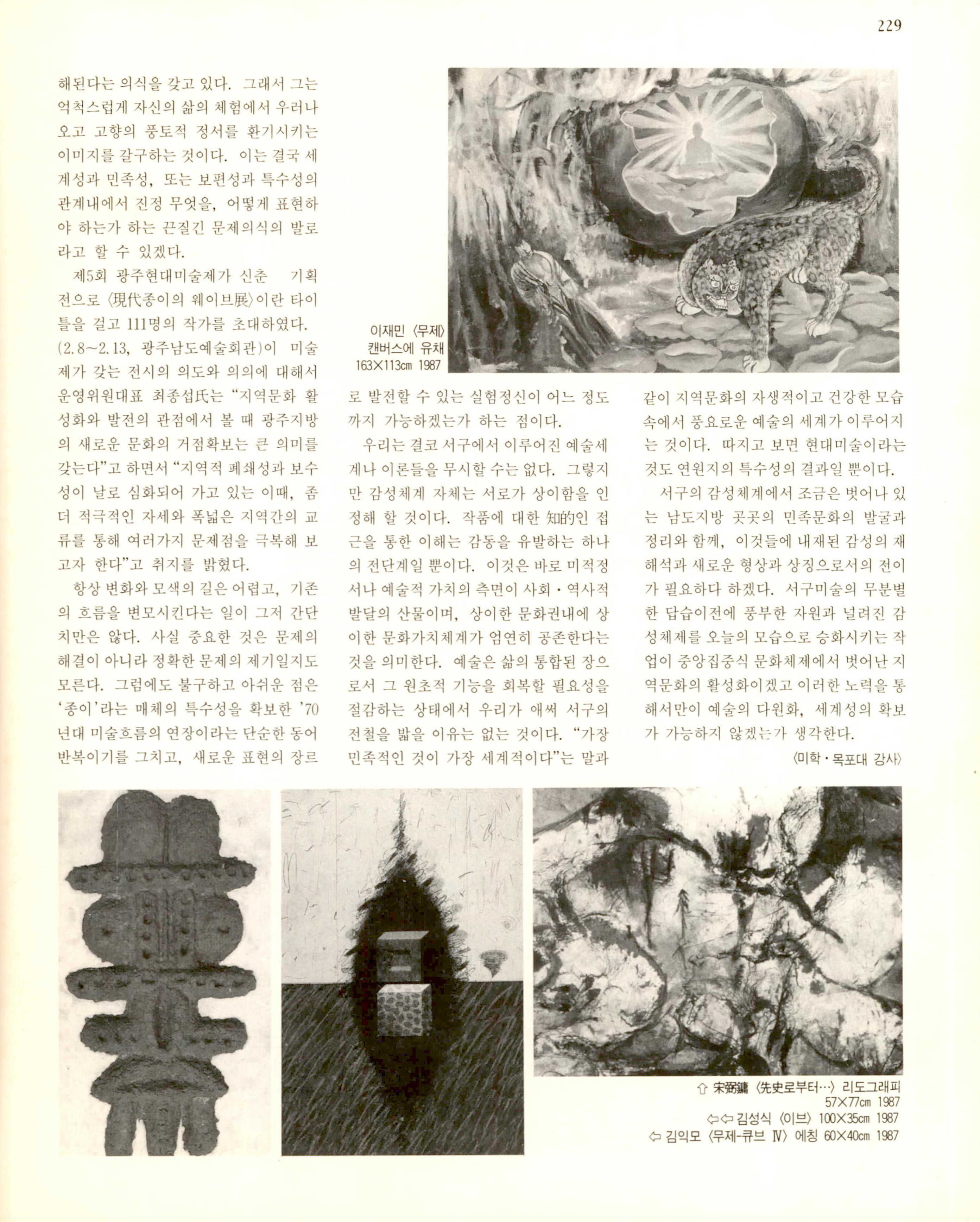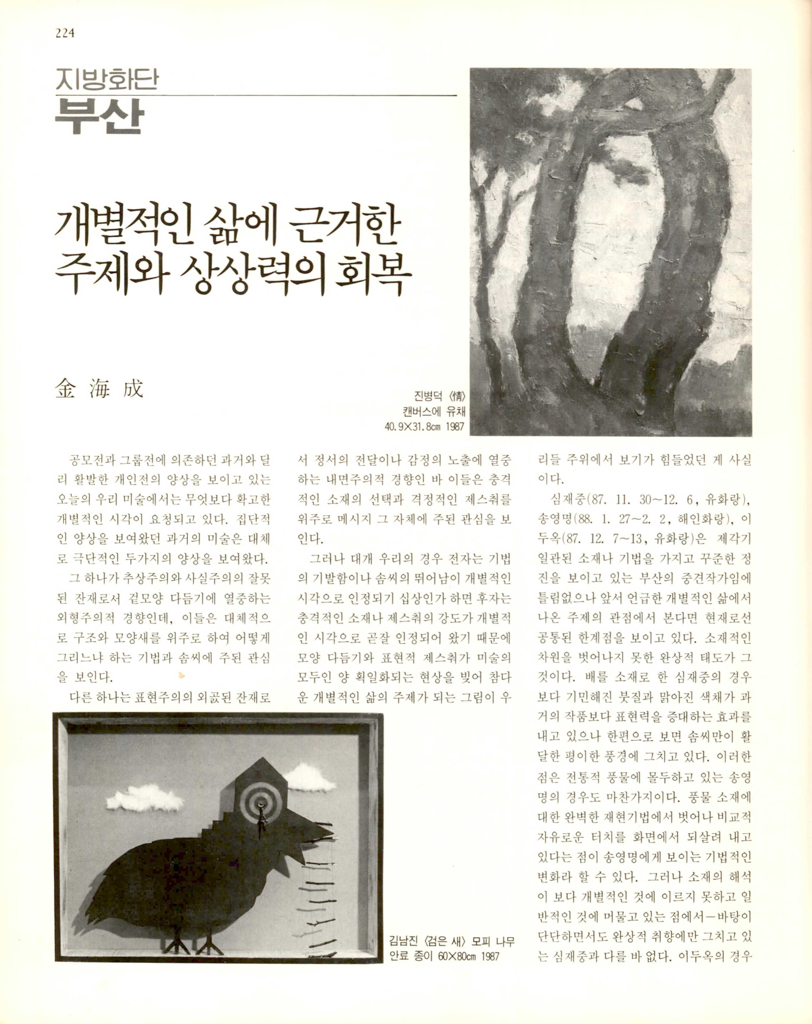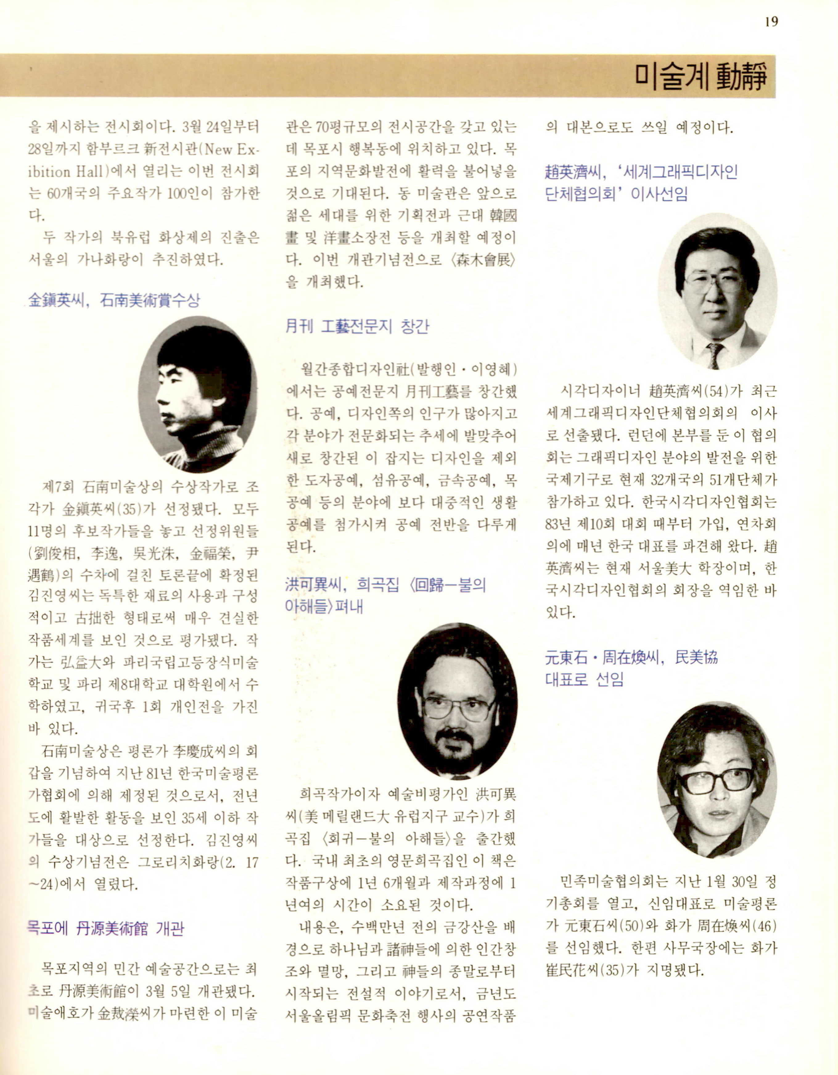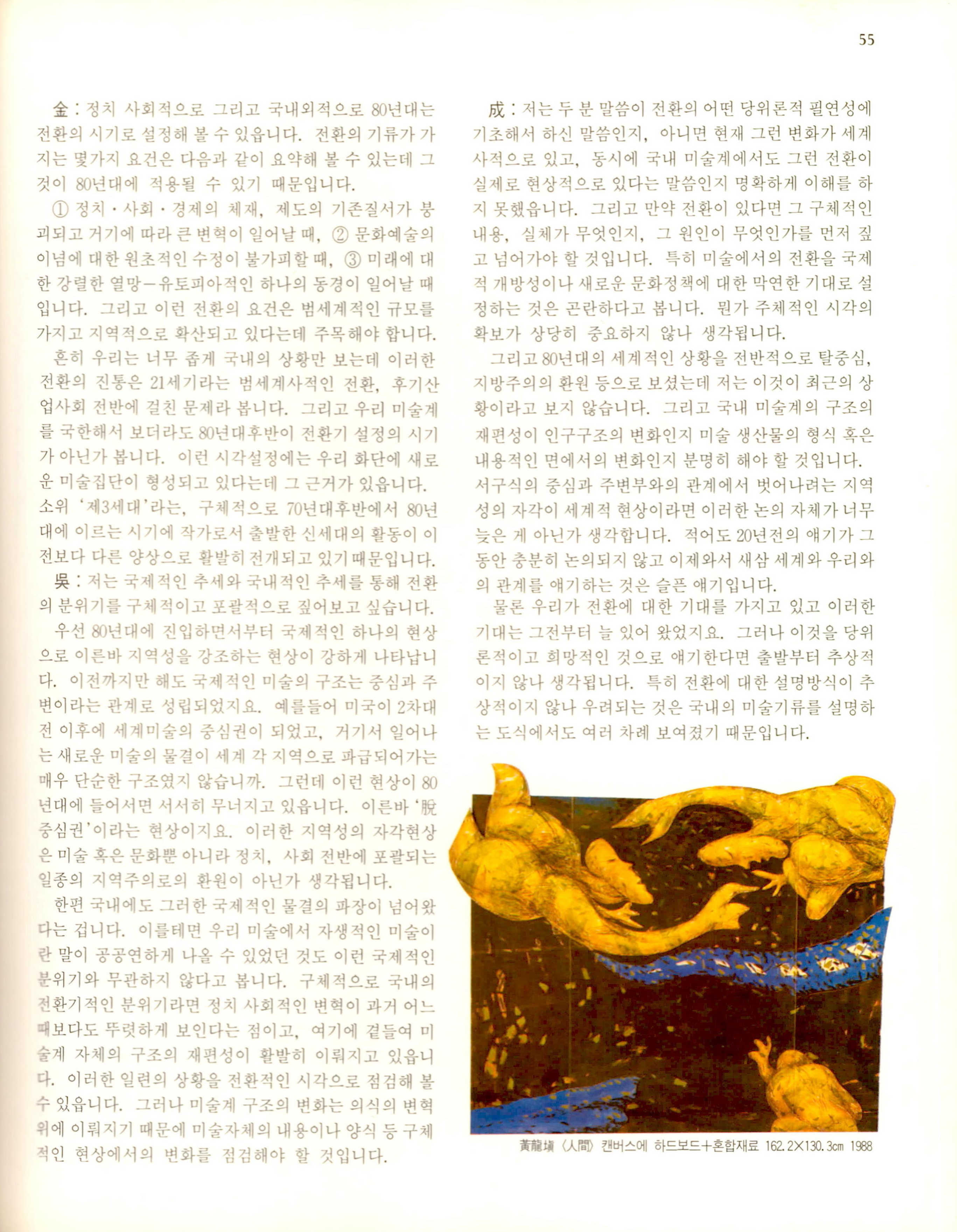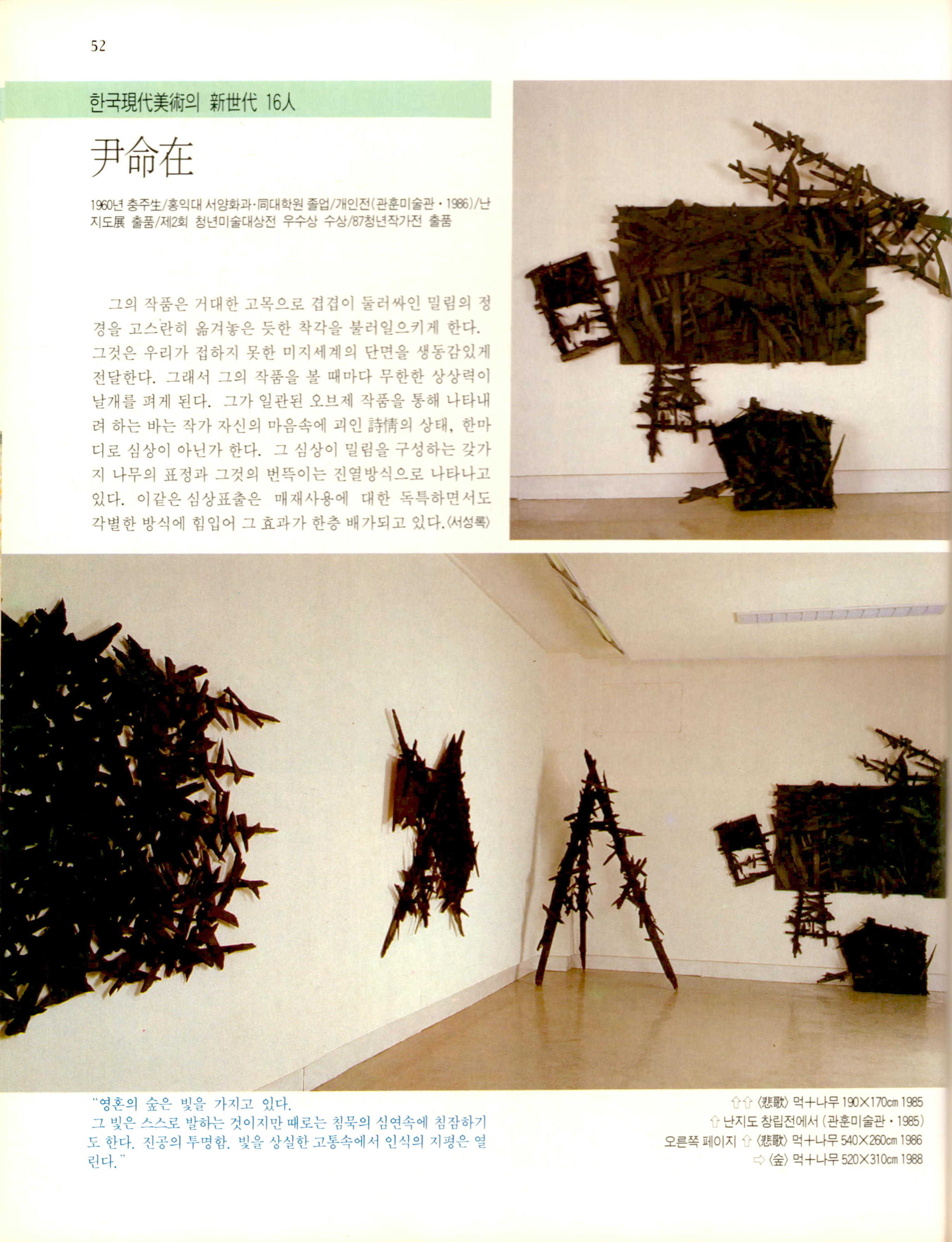 1988년 3월 15일에 발행된 계간미술 45 1988봄호로 작품 <머리의 손가락>(브론즈, 45X19X24cm, 1986), <퍼스컴>(브론즈, 27X37X36cm, 1987), <머리의 손가락>(석고에 은박, 20X14X15cm, 1986), <神(신)의 젖줄>(브론즈, 31X19X18cm, 1986)과 설명이 기술되어 있다.