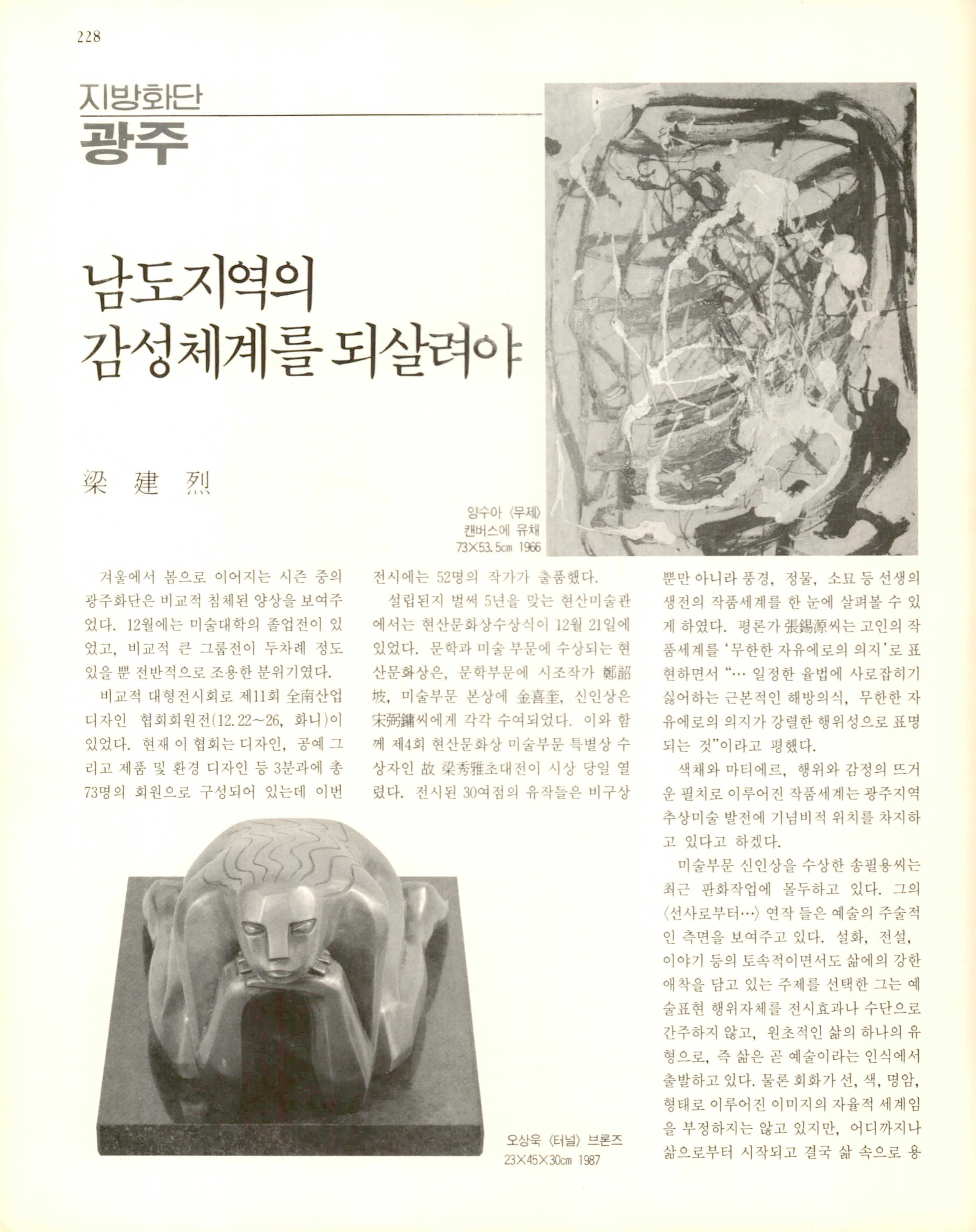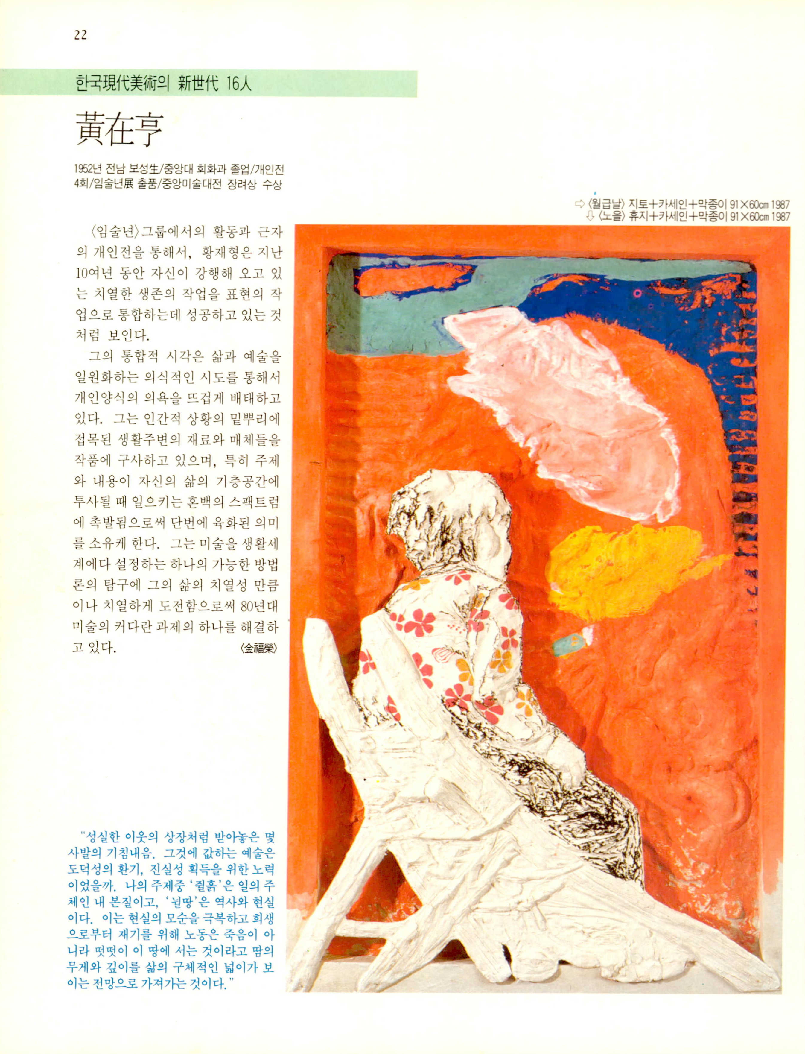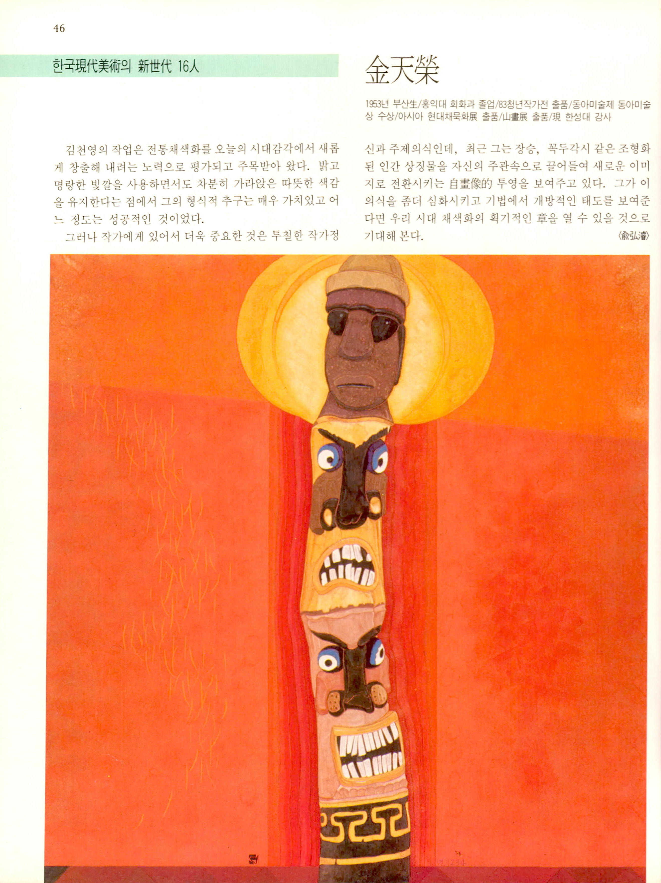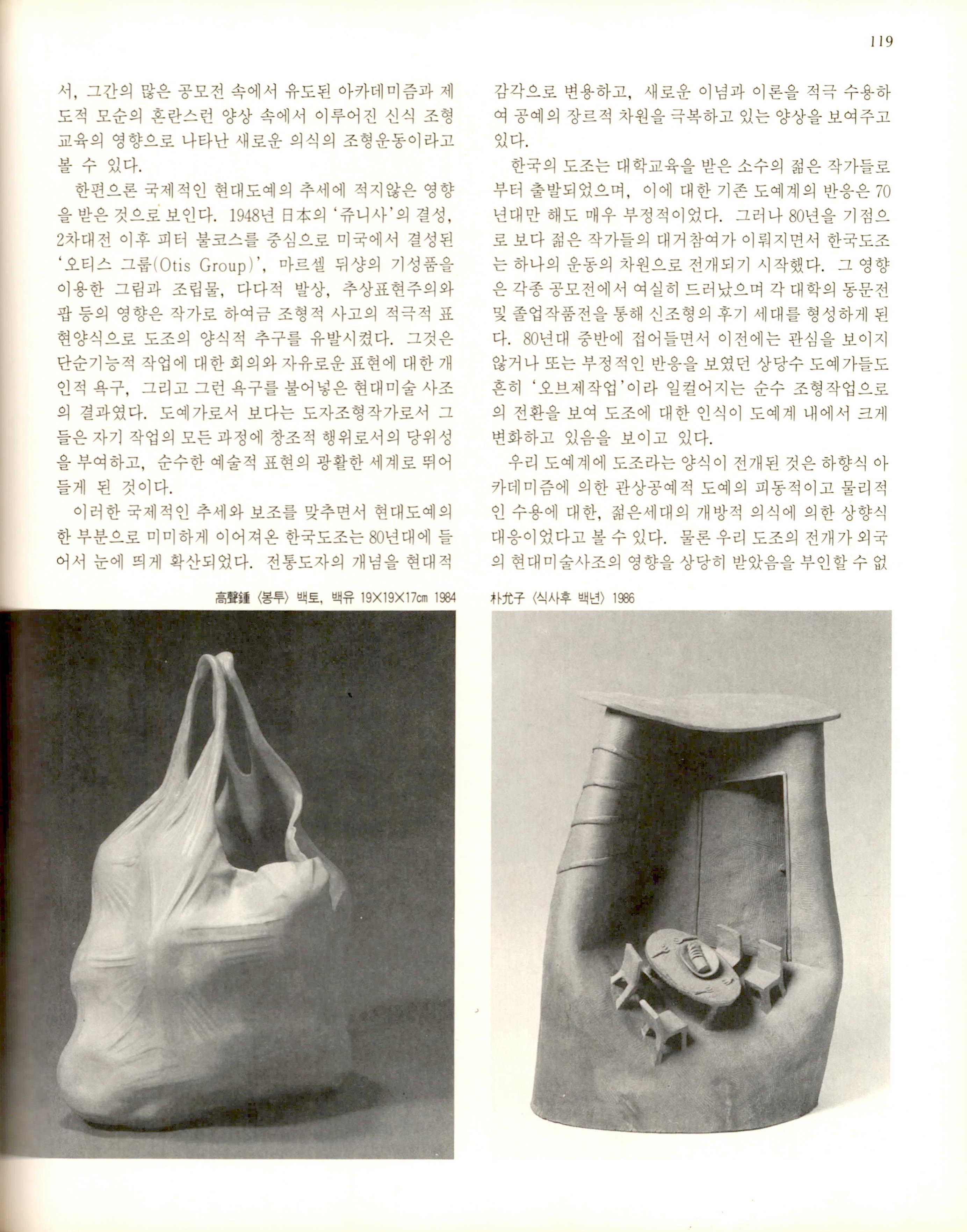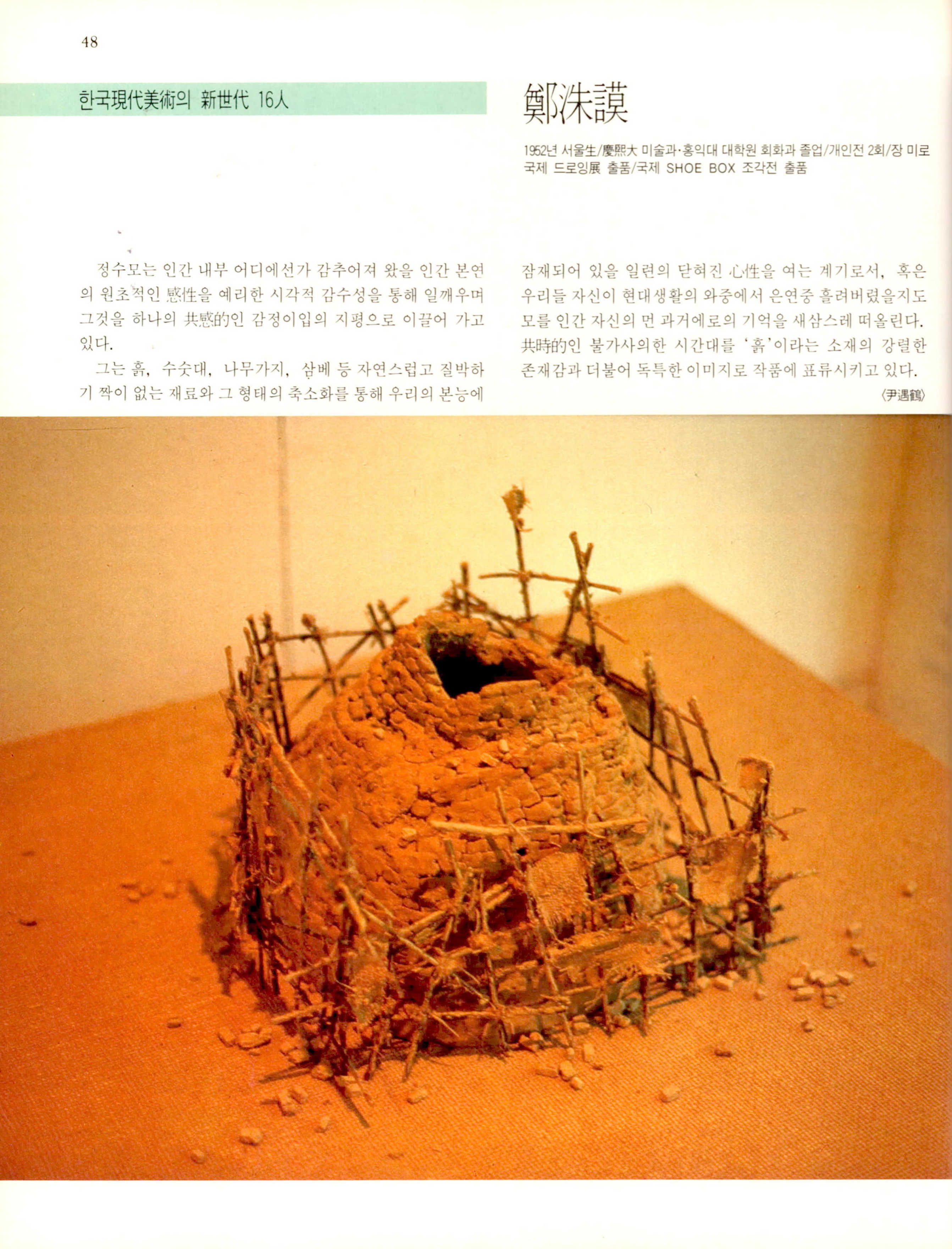 1988년 3월 15일에 발행된 계간미술 45 1988봄호로 작품 <머리의 손가락>(브론즈, 45X19X24cm, 1986), <퍼스컴>(브론즈, 27X37X36cm, 1987), <머리의 손가락>(석고에 은박, 20X14X15cm, 1986), <神(신)의 젖줄>(브론즈, 31X19X18cm, 1986)과 설명이 기술되어 있다.