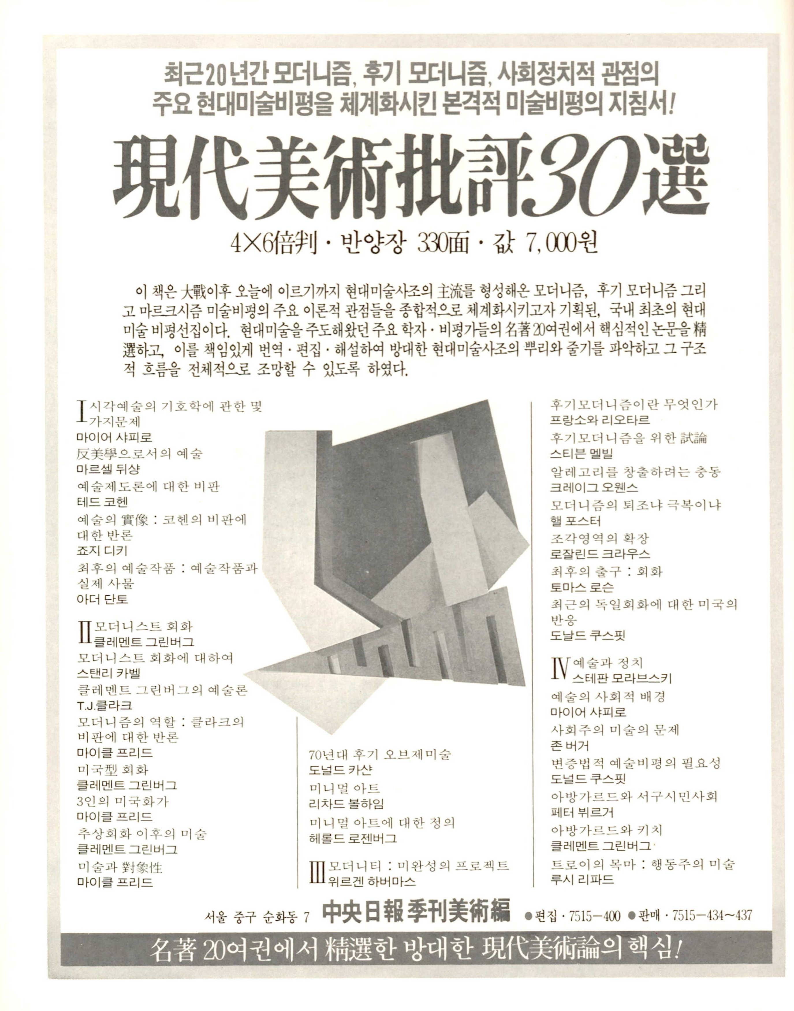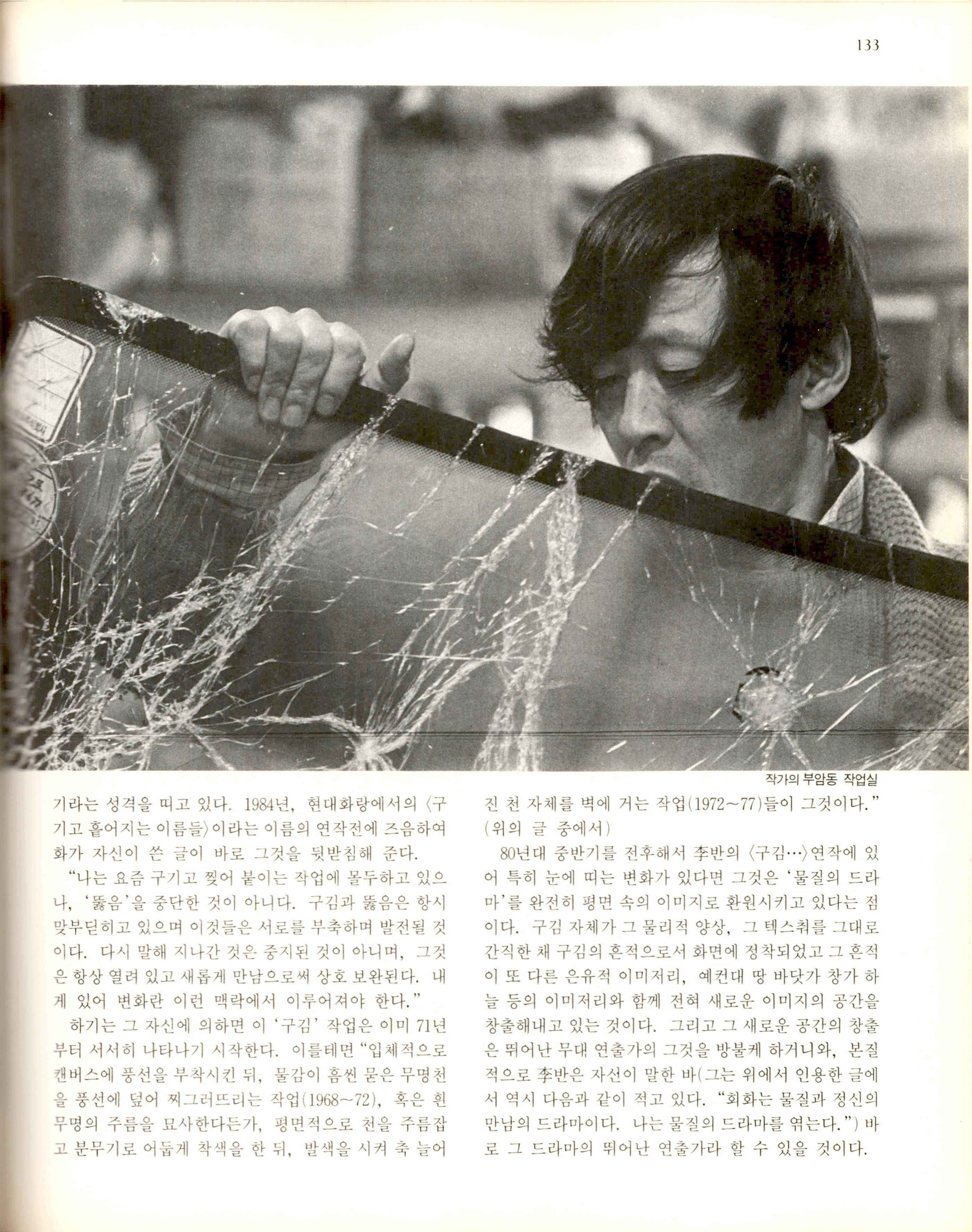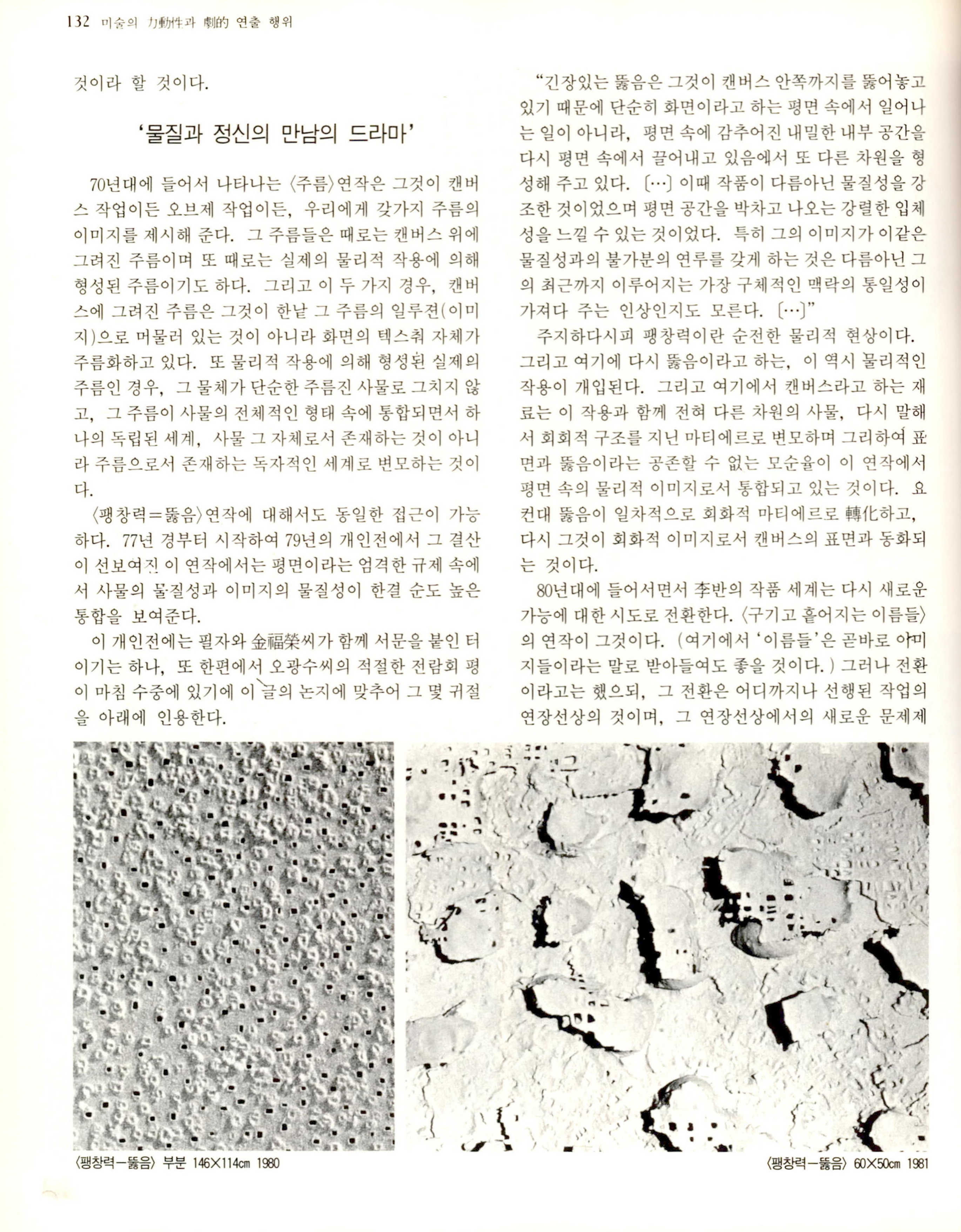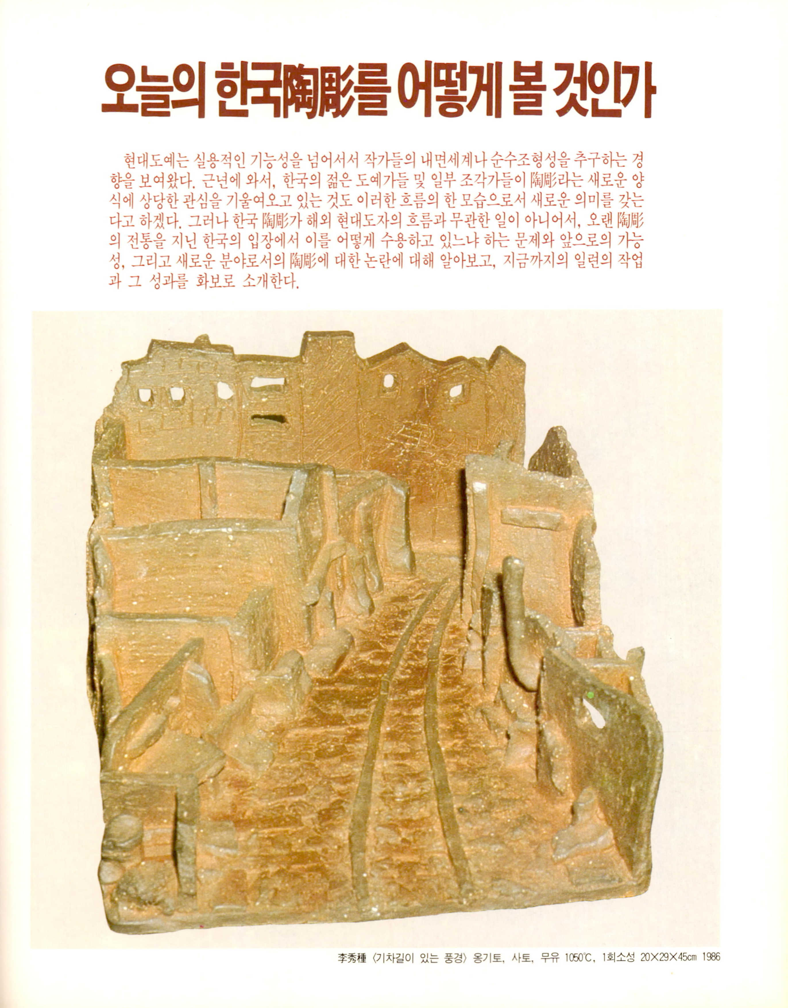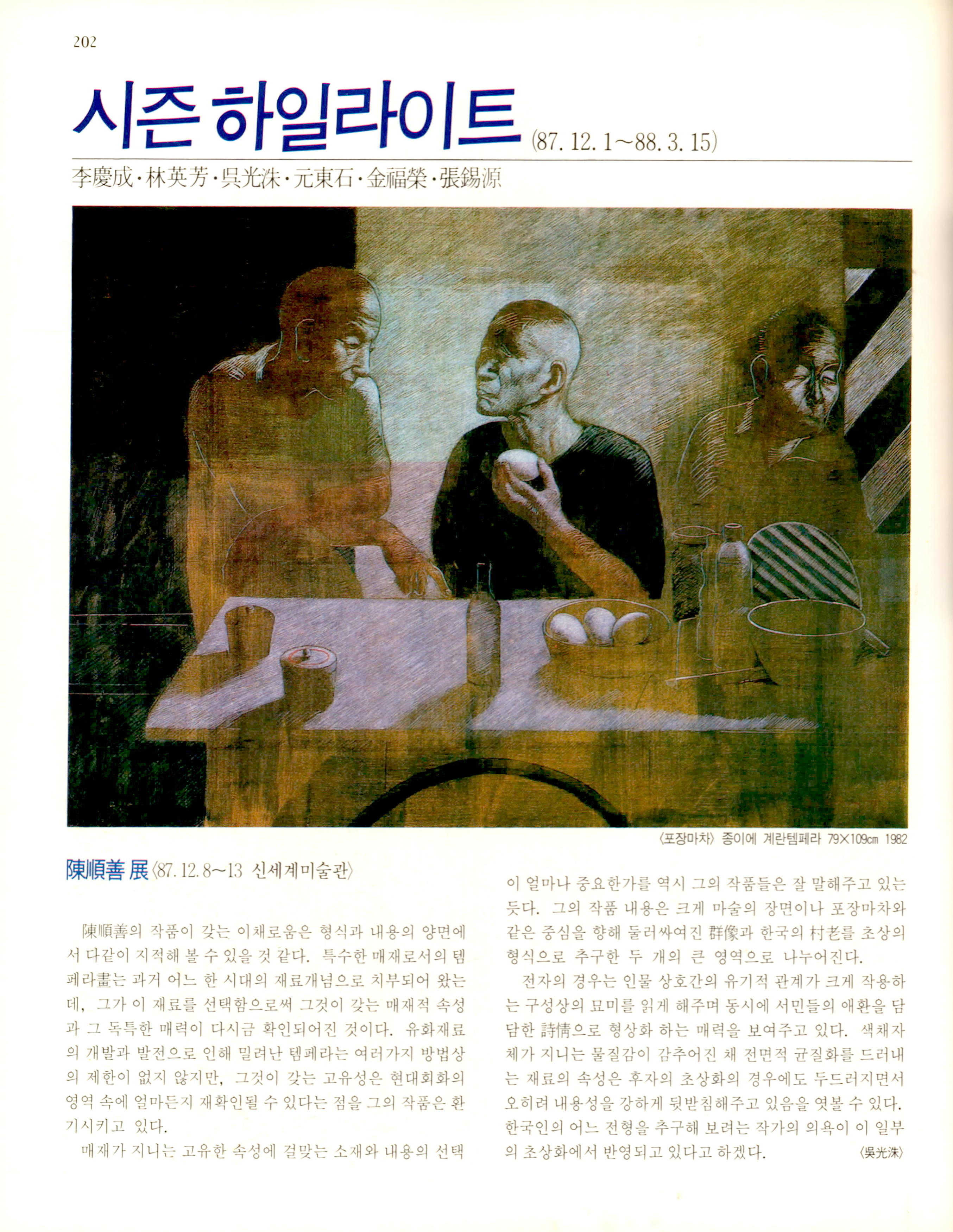 1988년 3월 15일에 발행된 계간미술 45 1988봄호로 작품 <머리의 손가락>(브론즈, 45X19X24cm, 1986), <퍼스컴>(브론즈, 27X37X36cm, 1987), <머리의 손가락>(석고에 은박, 20X14X15cm, 1986), <神(신)의 젖줄>(브론즈, 31X19X18cm, 1986)과 설명이 기술되어 있다.