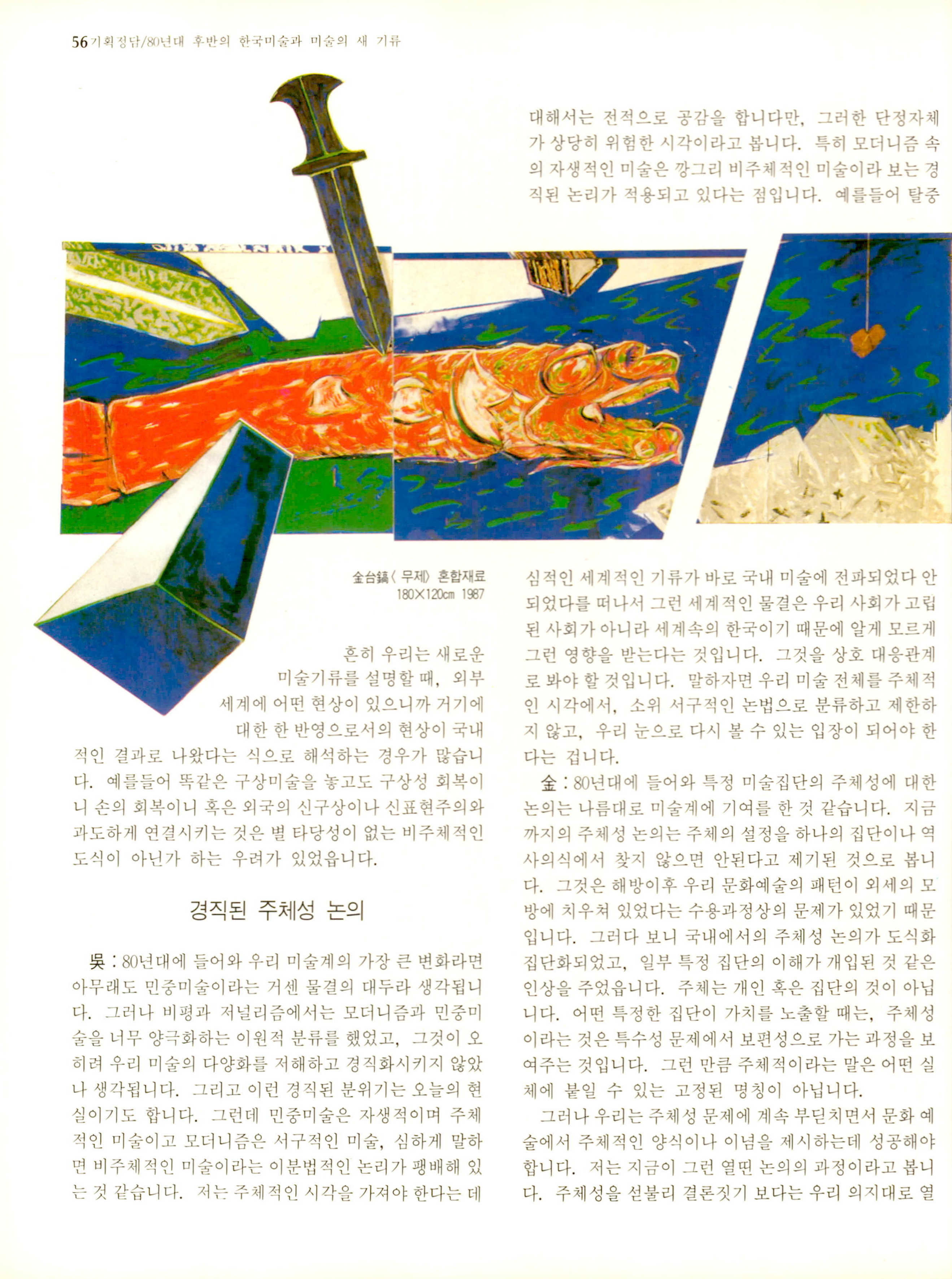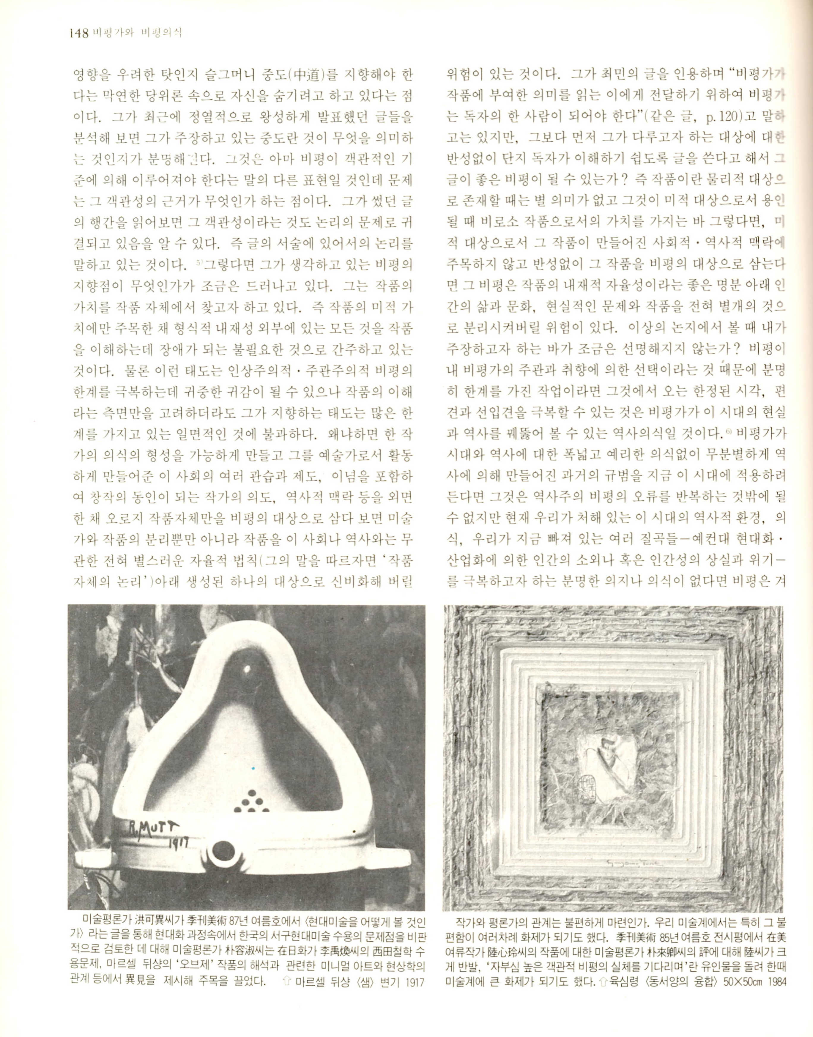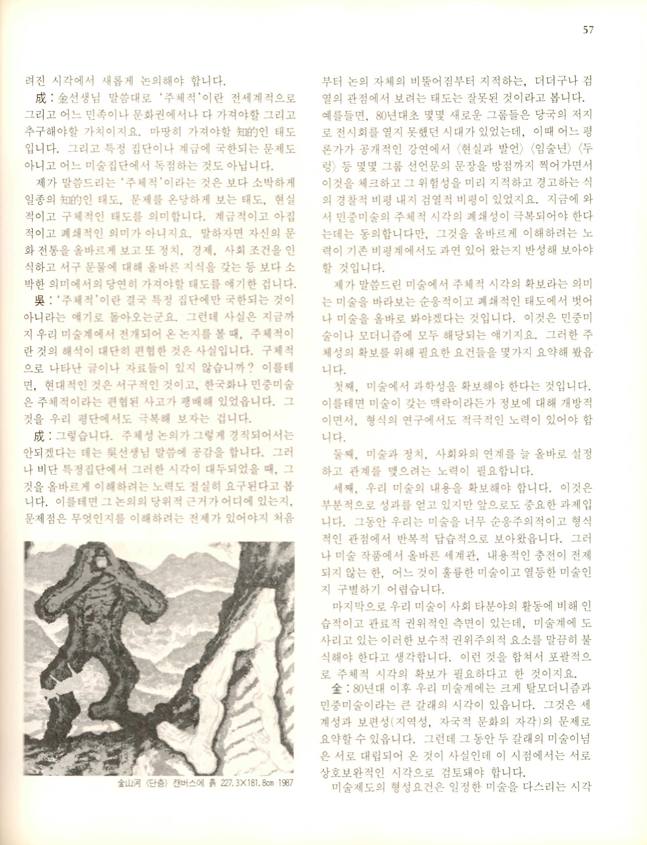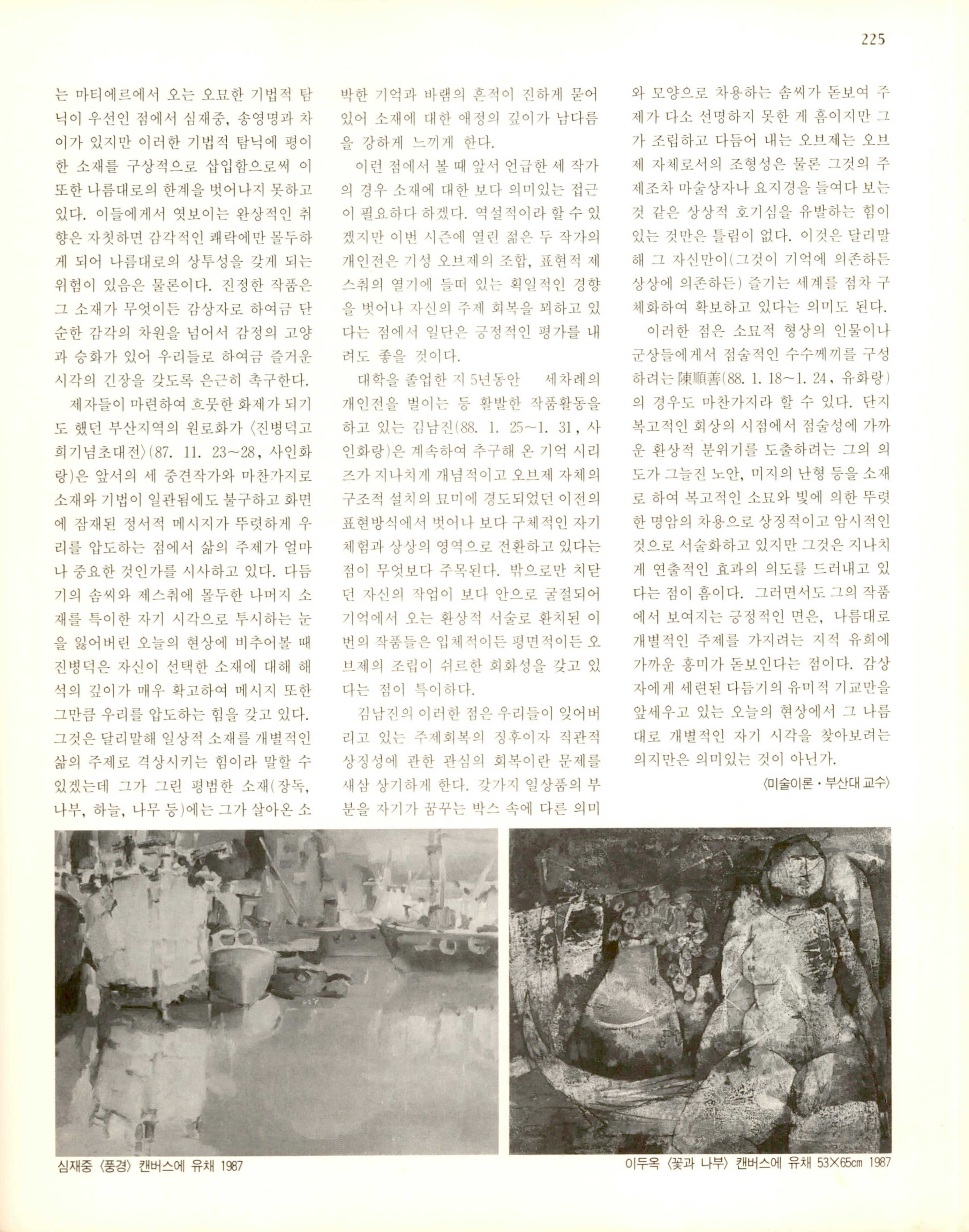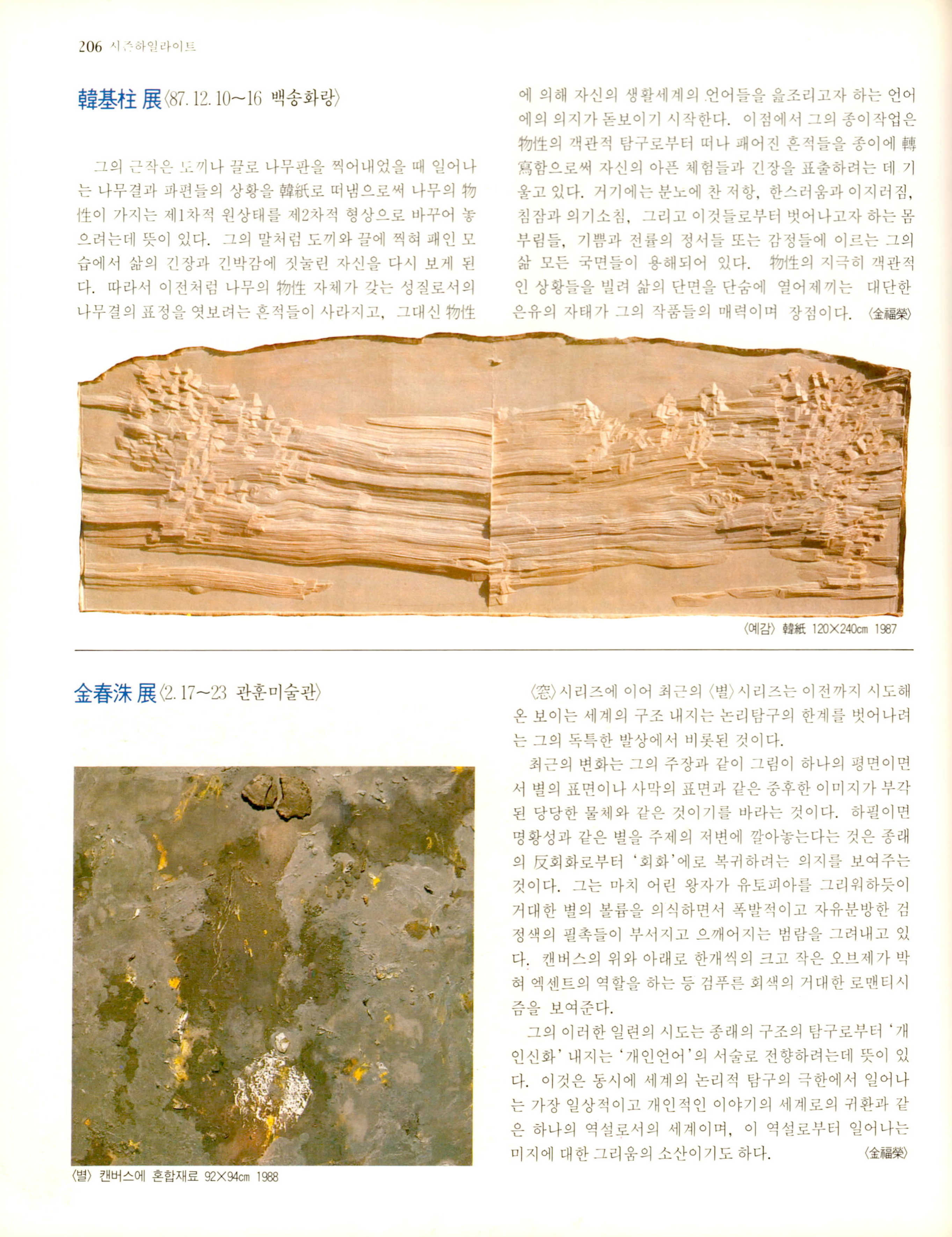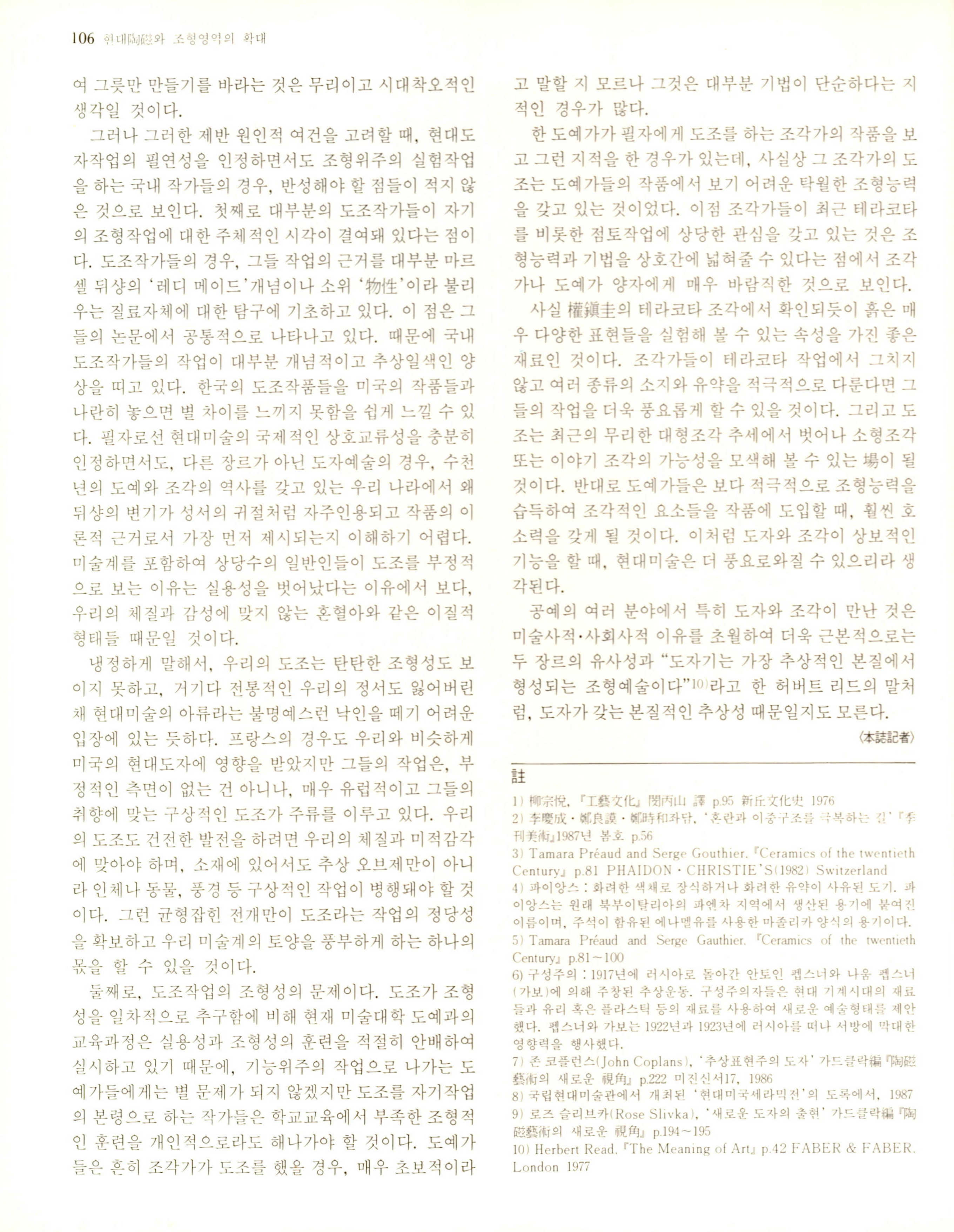 1988년 3월 15일에 발행된 계간미술 45 1988봄호로 작품 <머리의 손가락>(브론즈, 45X19X24cm, 1986), <퍼스컴>(브론즈, 27X37X36cm, 1987), <머리의 손가락>(석고에 은박, 20X14X15cm, 1986), <神(신)의 젖줄>(브론즈, 31X19X18cm, 1986)과 설명이 기술되어 있다.
