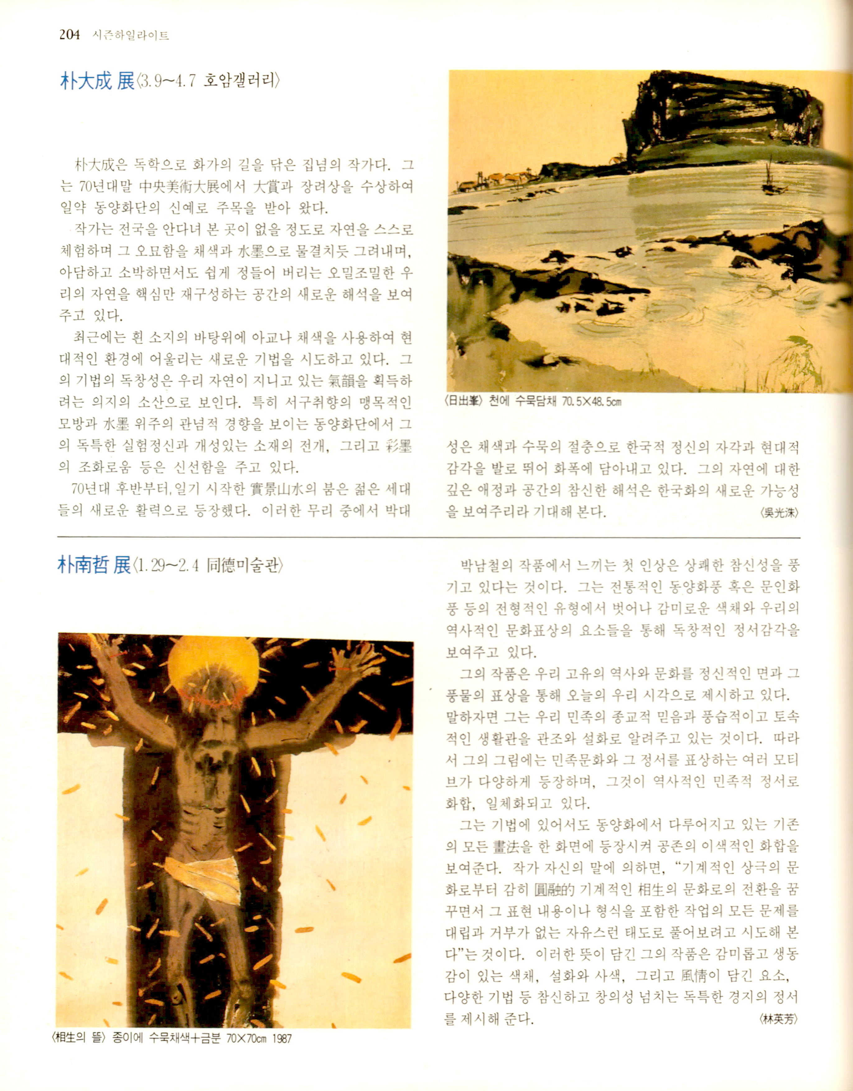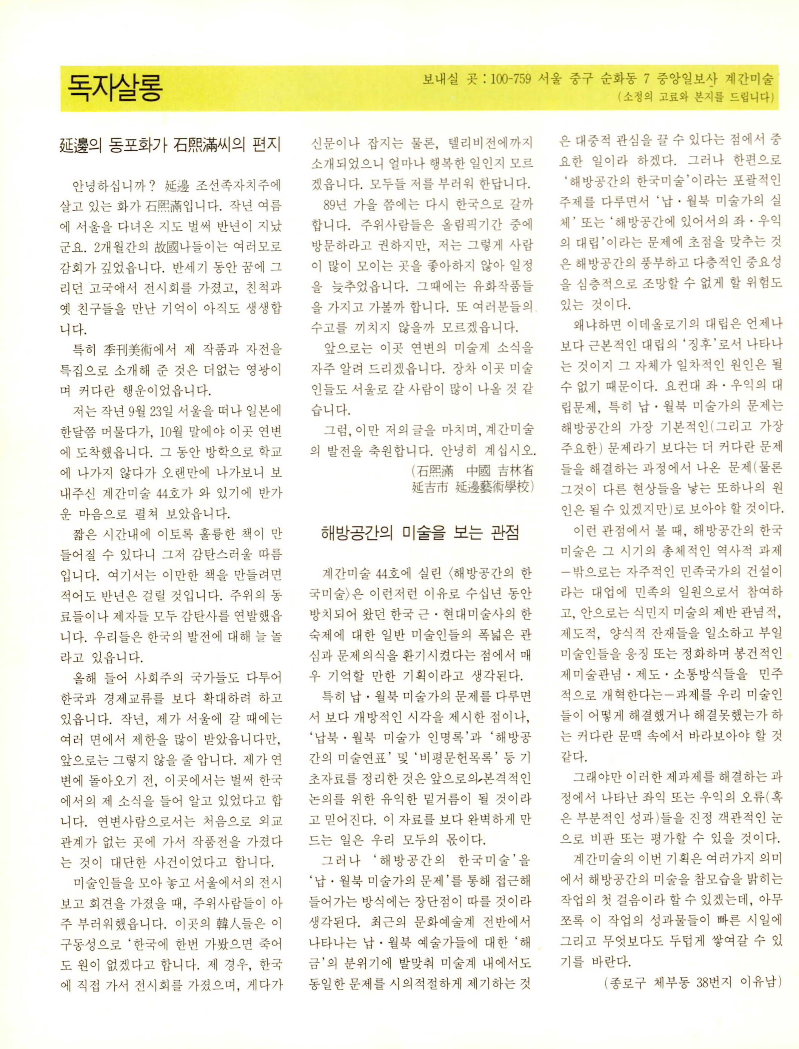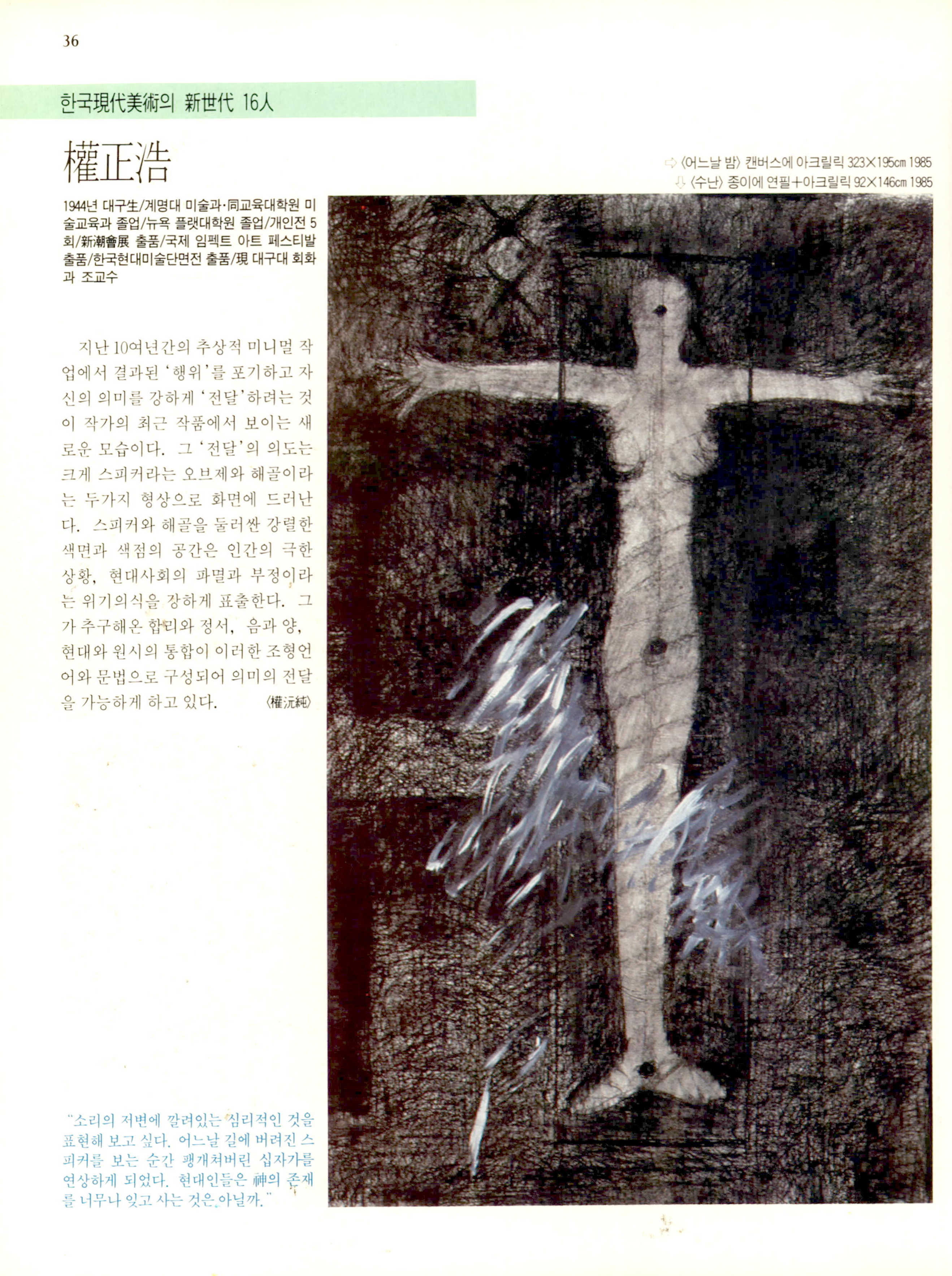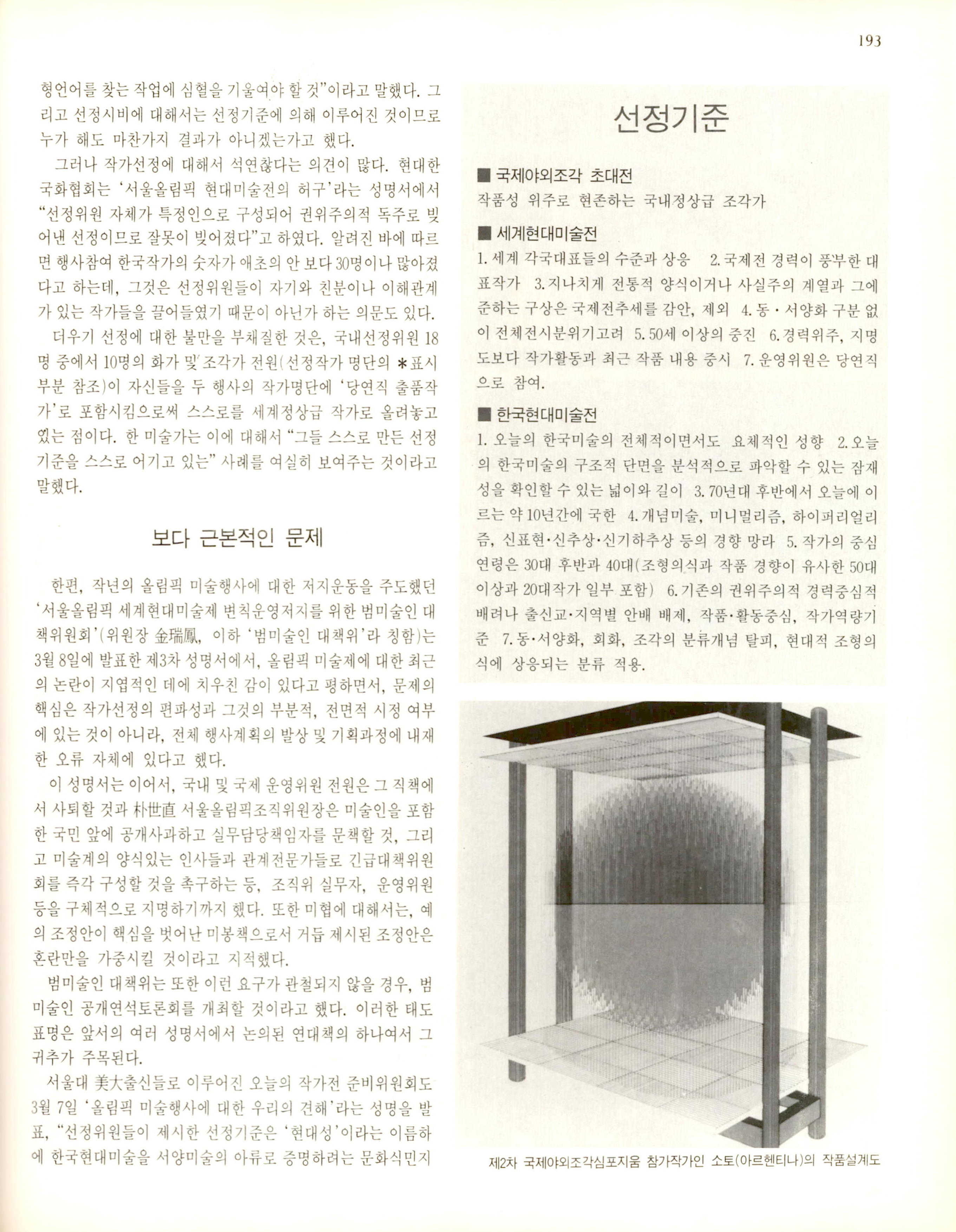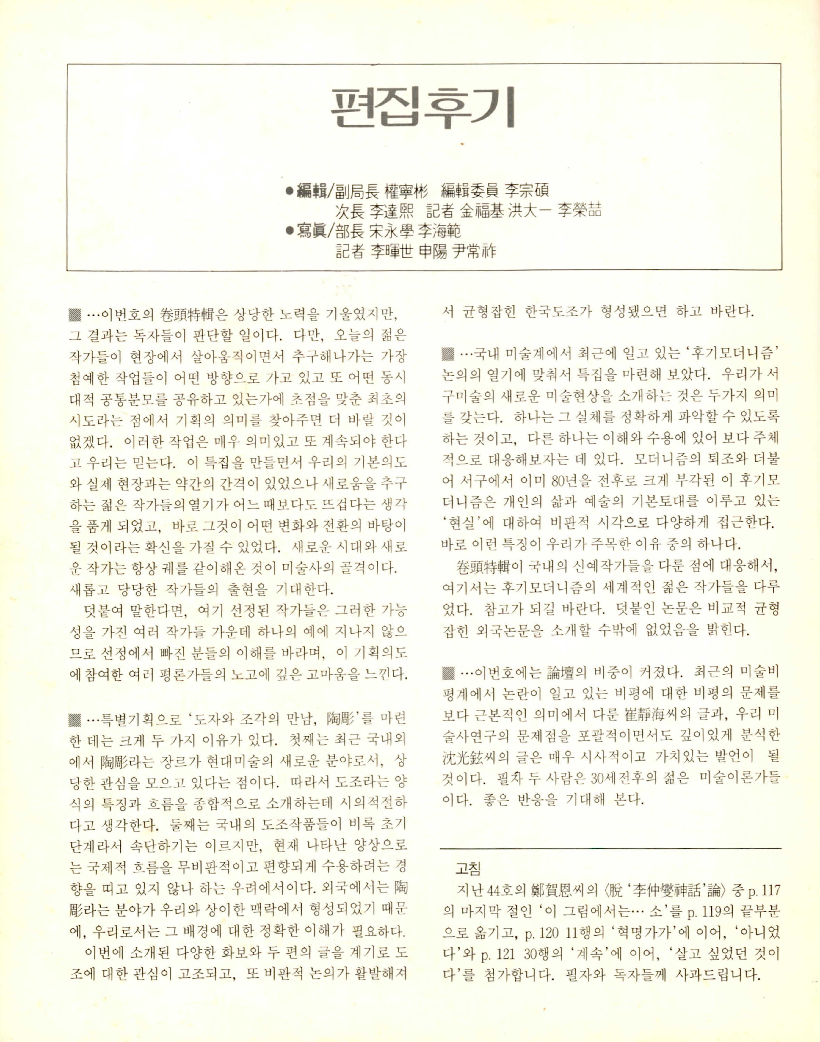 1988년 3월 15일에 발행된 계간미술 45 1988봄호로 작품 <머리의 손가락>(브론즈, 45X19X24cm, 1986), <퍼스컴>(브론즈, 27X37X36cm, 1987), <머리의 손가락>(석고에 은박, 20X14X15cm, 1986), <神(신)의 젖줄>(브론즈, 31X19X18cm, 1986)과 설명이 기술되어 있다.