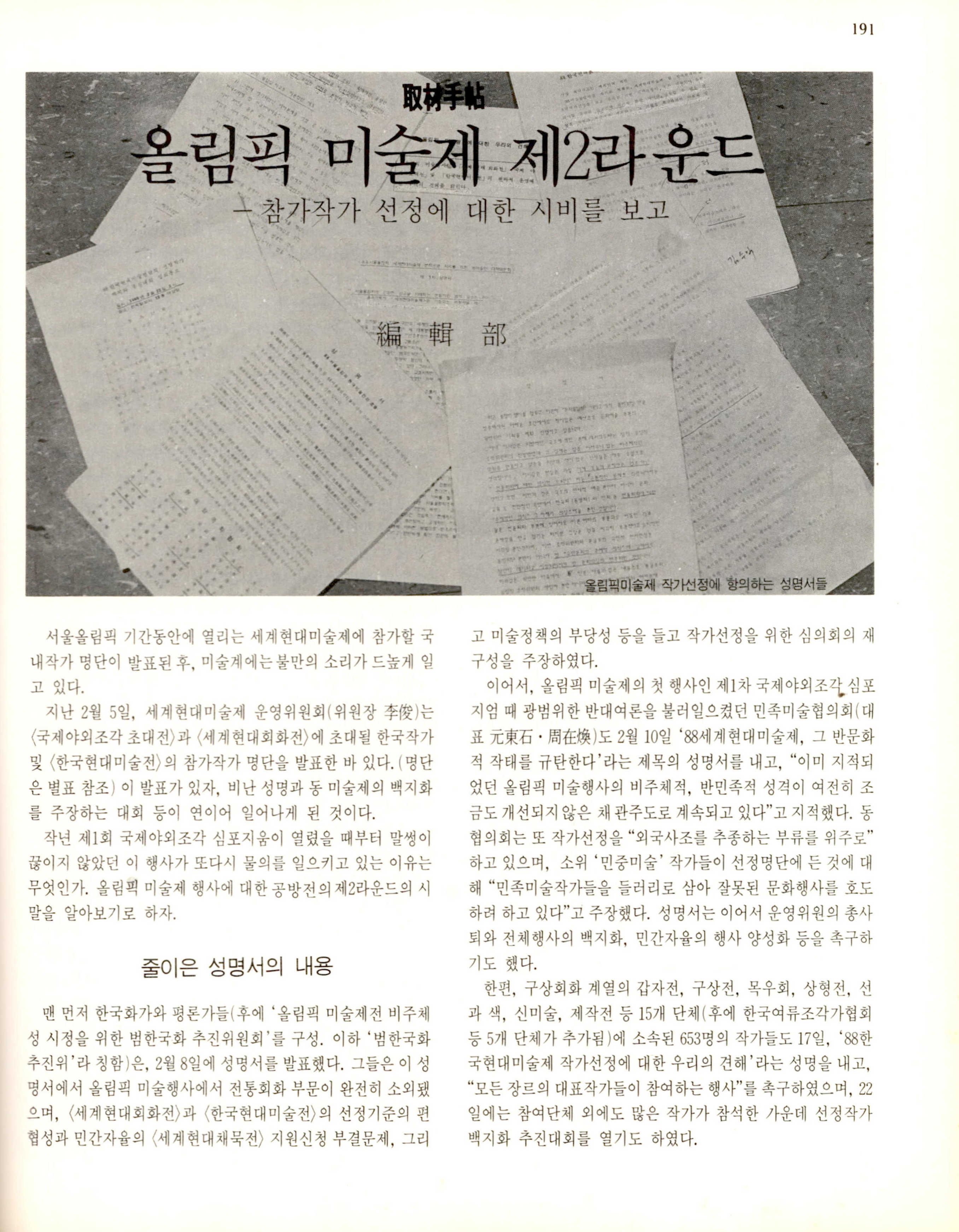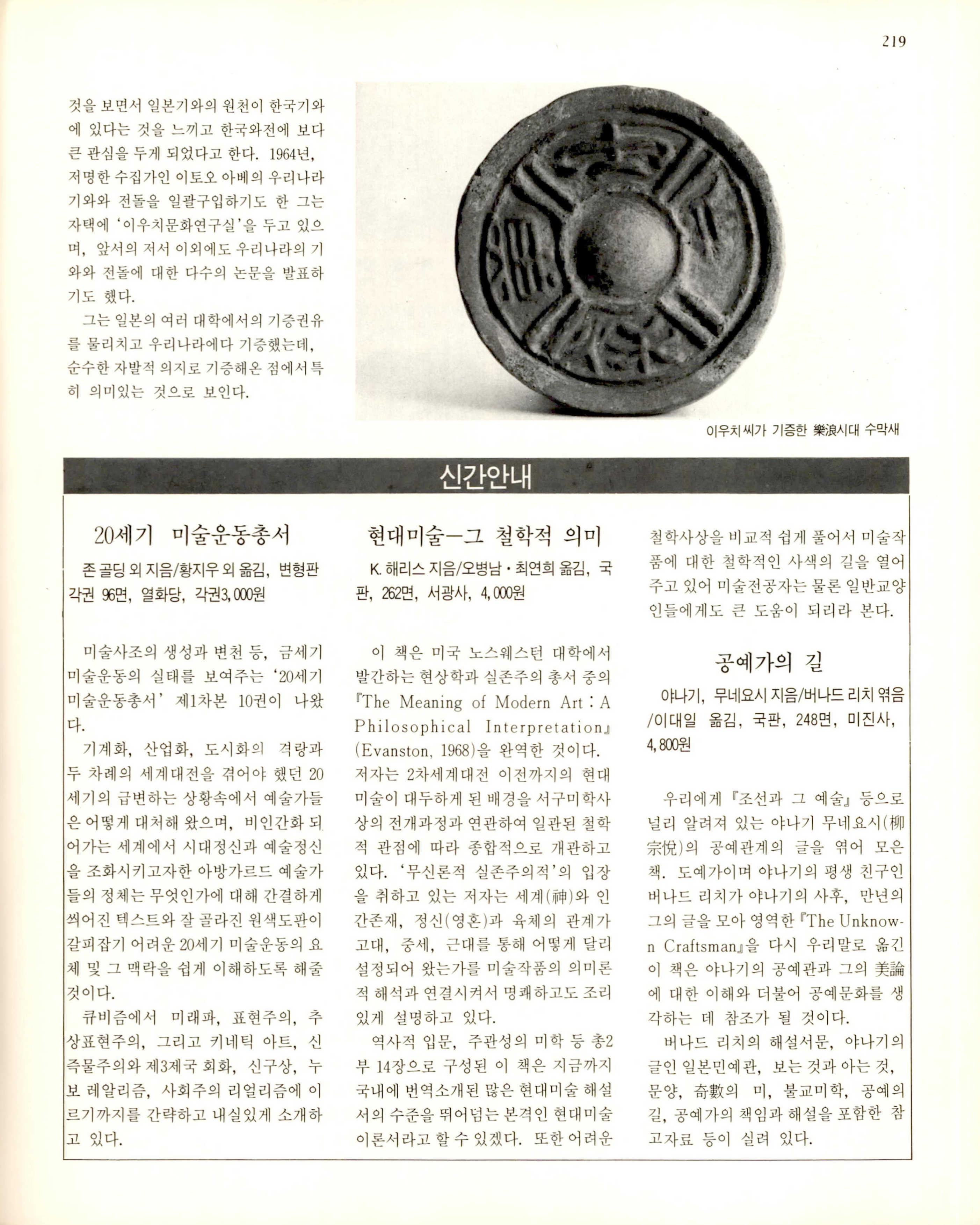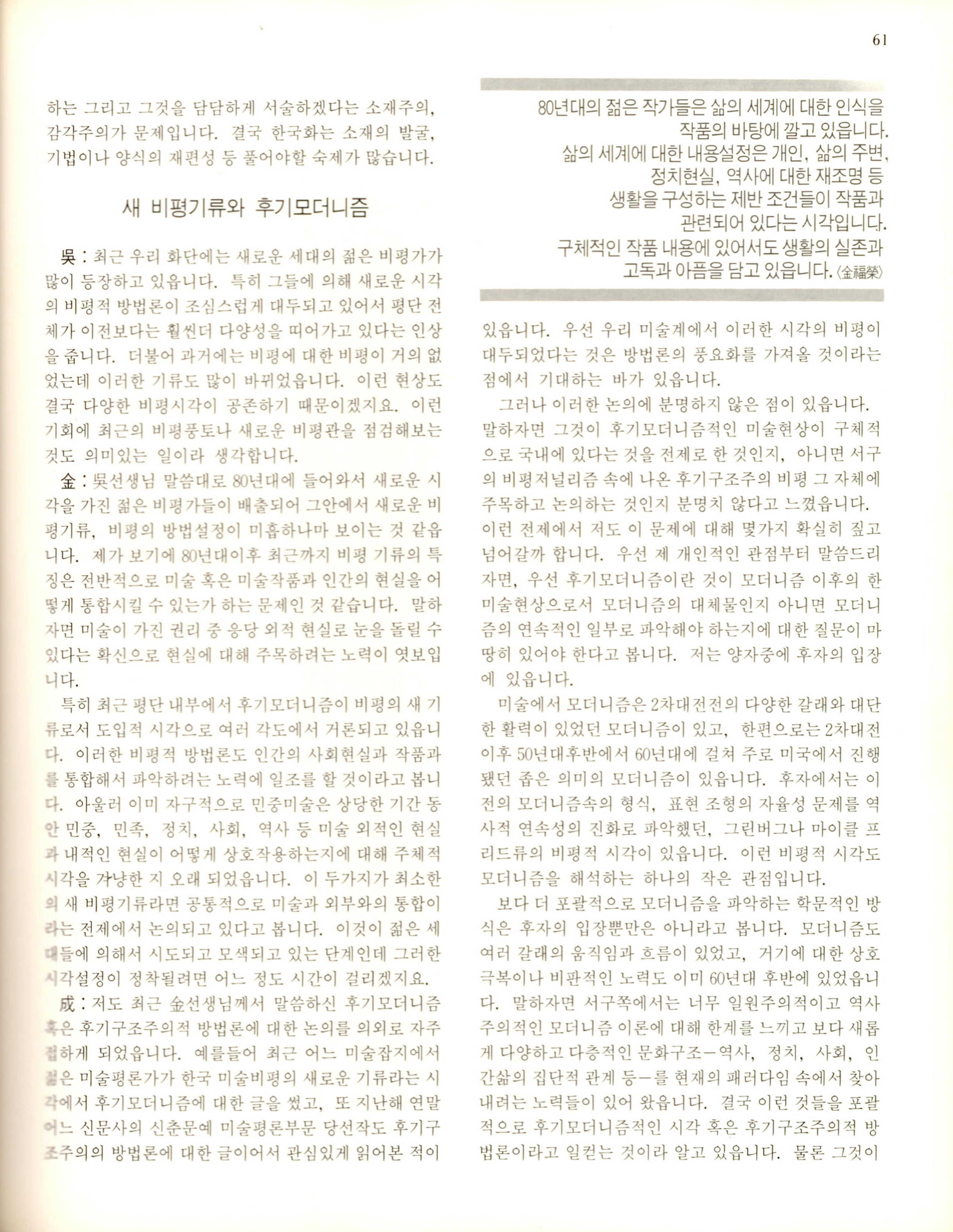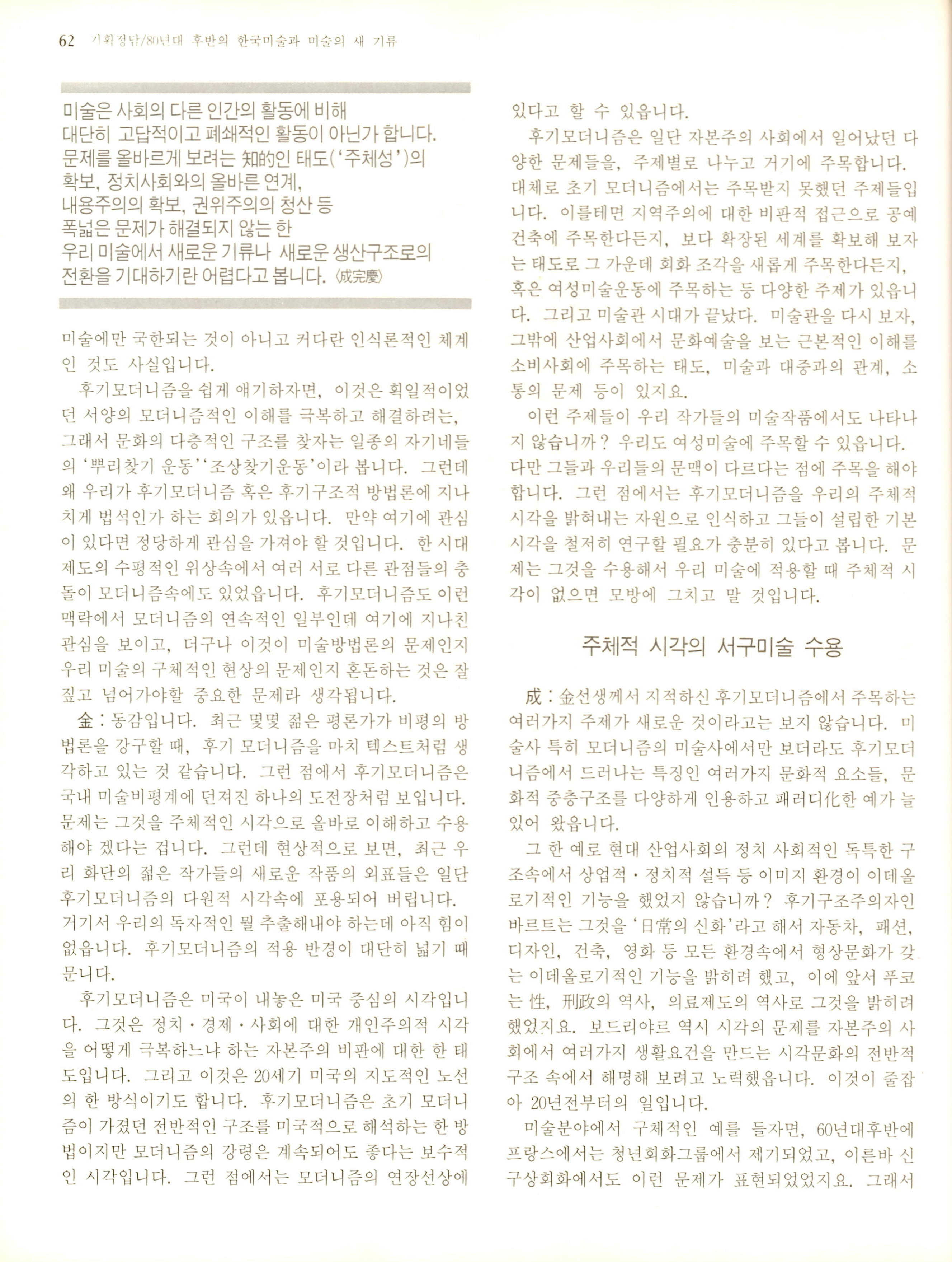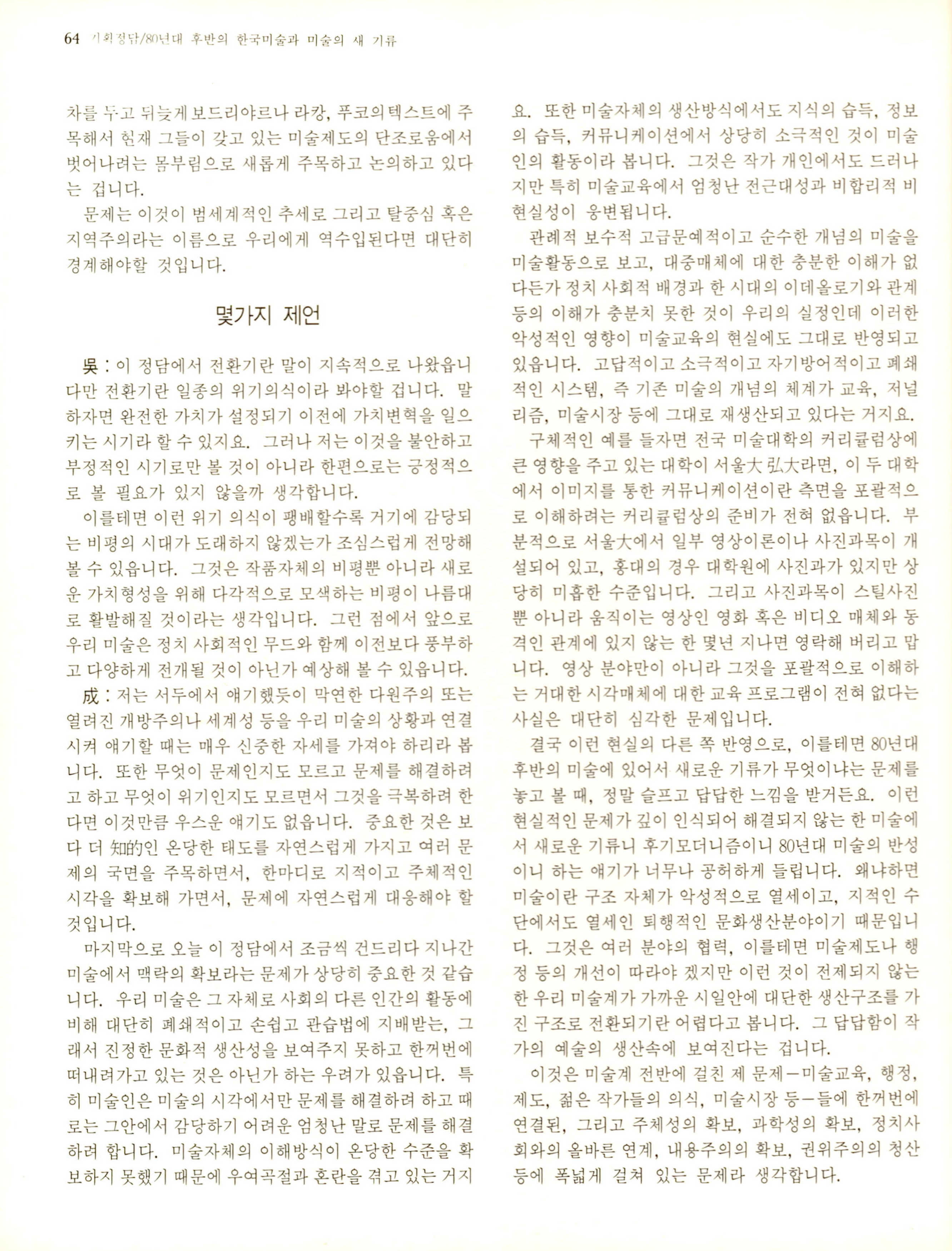 1988년 3월 15일에 발행된 계간미술 45 1988봄호로 작품 <머리의 손가락>(브론즈, 45X19X24cm, 1986), <퍼스컴>(브론즈, 27X37X36cm, 1987), <머리의 손가락>(석고에 은박, 20X14X15cm, 1986), <神(신)의 젖줄>(브론즈, 31X19X18cm, 1986)과 설명이 기술되어 있다.