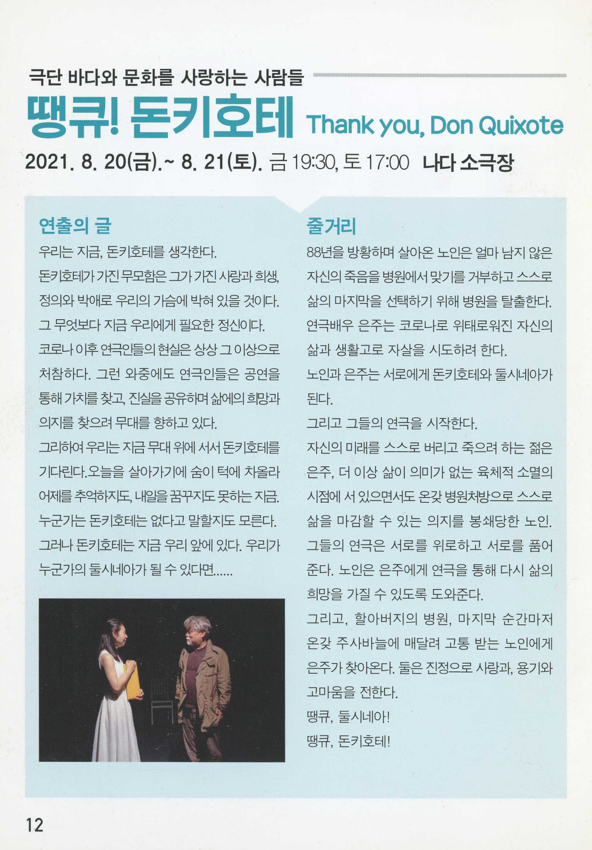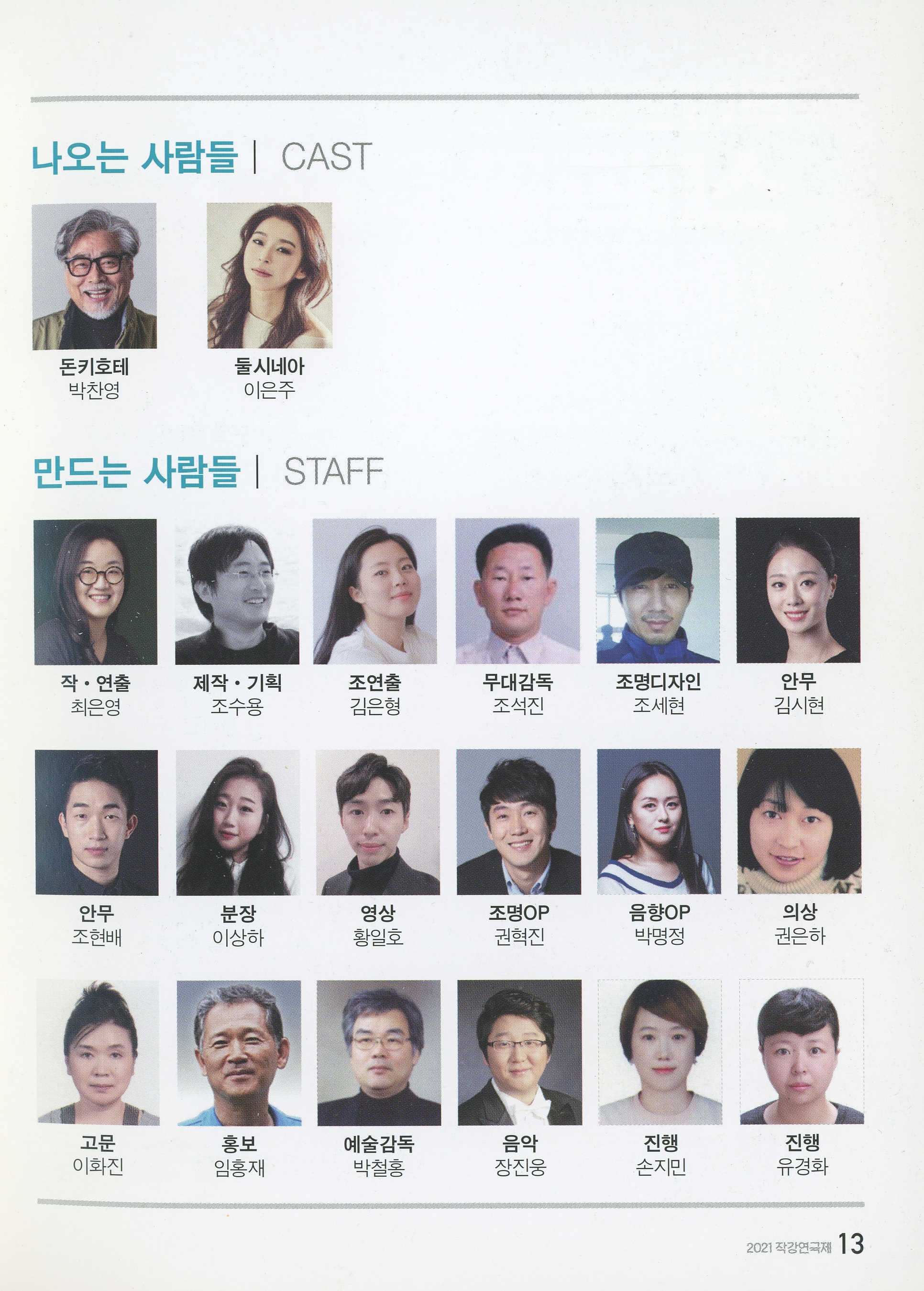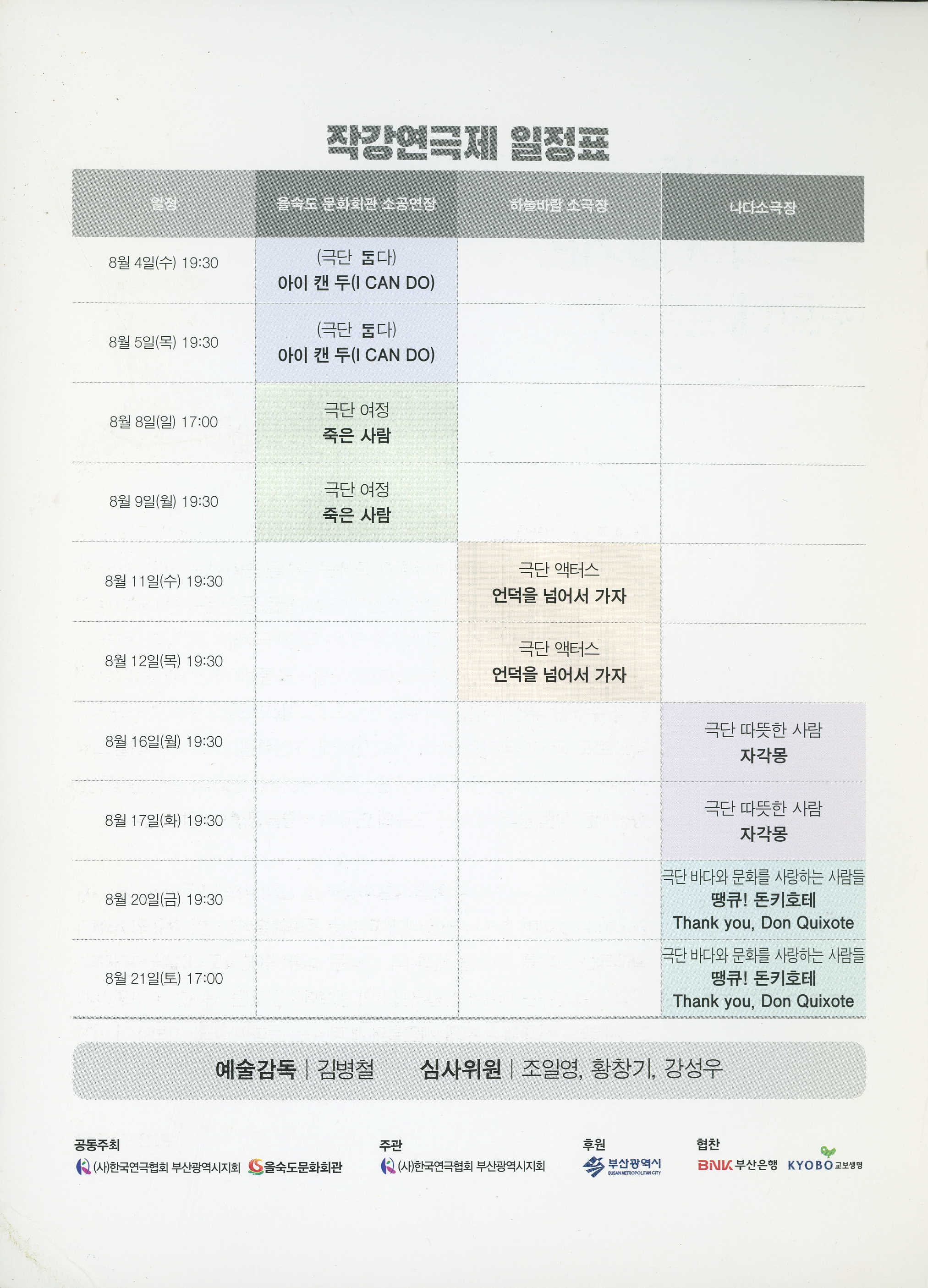 아이 캔 두(I CAN DO)_박호천, 정졍환, 강혜란, 강현민, 정인국, 김경민, 홍영미, 강순보, 강혜경, 드림아트 김희진, 극단 담다, 극단 자유바다 / 죽은 사람_오후 이윤경, 김태호, 임수빈, 김유리라, 임혜선, 강진구, 박은주, 김수령, AURA 정희원, AURA 박동휘, 강정희, 오버레이미디어, 정소희, 이재영, 구남용 / 언덕을 넘어서 가자_이만희, 손병태, 송순임, 김재욱, 조경수, 심유섭, 최주영 / 자각몽_허석민, 임민경, 이경진, 엄주하, 김세휘, 김유리라, I KONW STAGE 이안호, 윤서영 / 땡큐! 돈키호테_최은영, 조수용, 김은형, 조석진, 조세현, 김시현, 조현배, 이상하, 황일호, 권혁진, 박명정, 권은하, 이화진, 임홍재, 박철홍, 장진웅, 손지민, 유경화