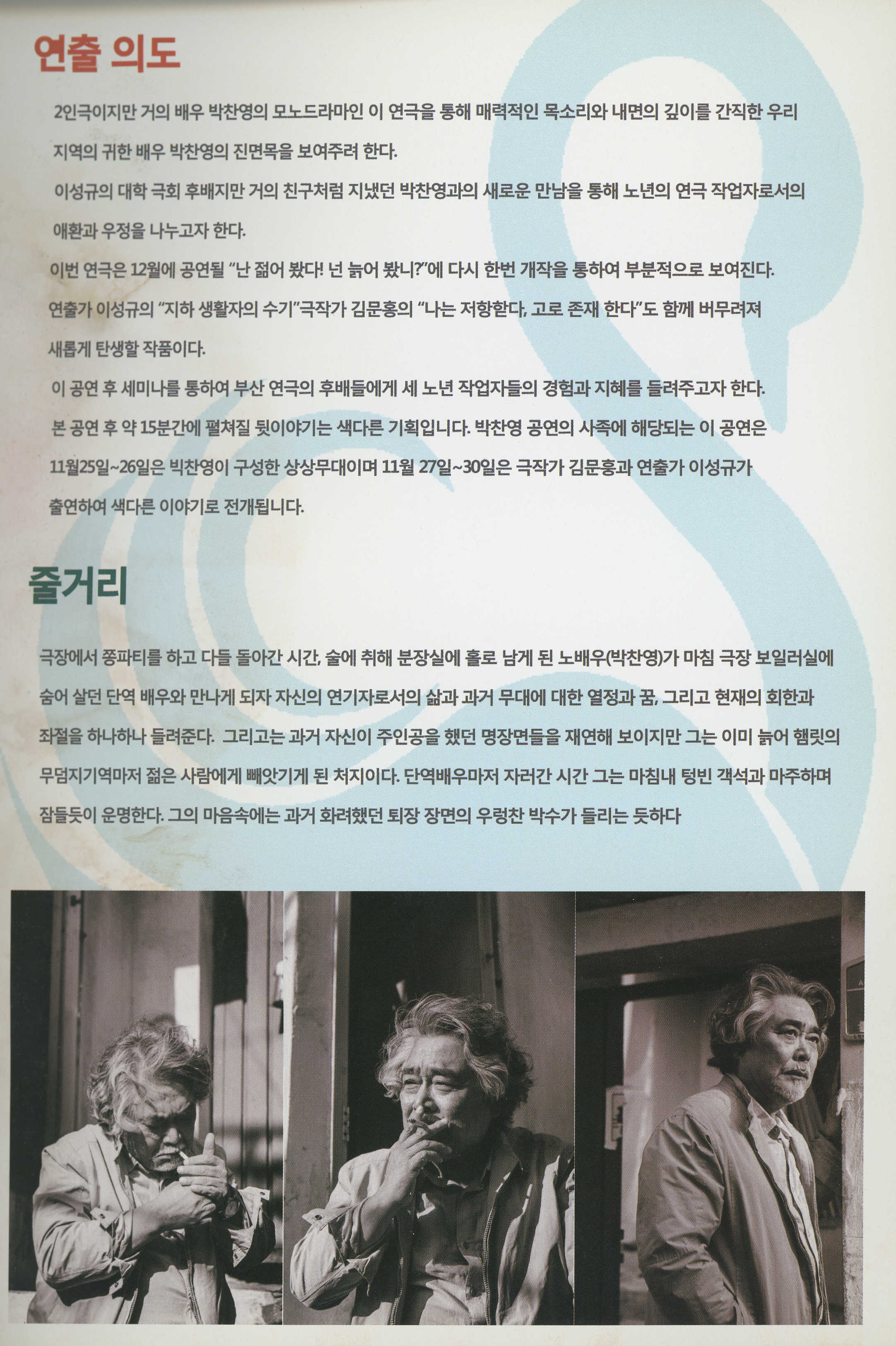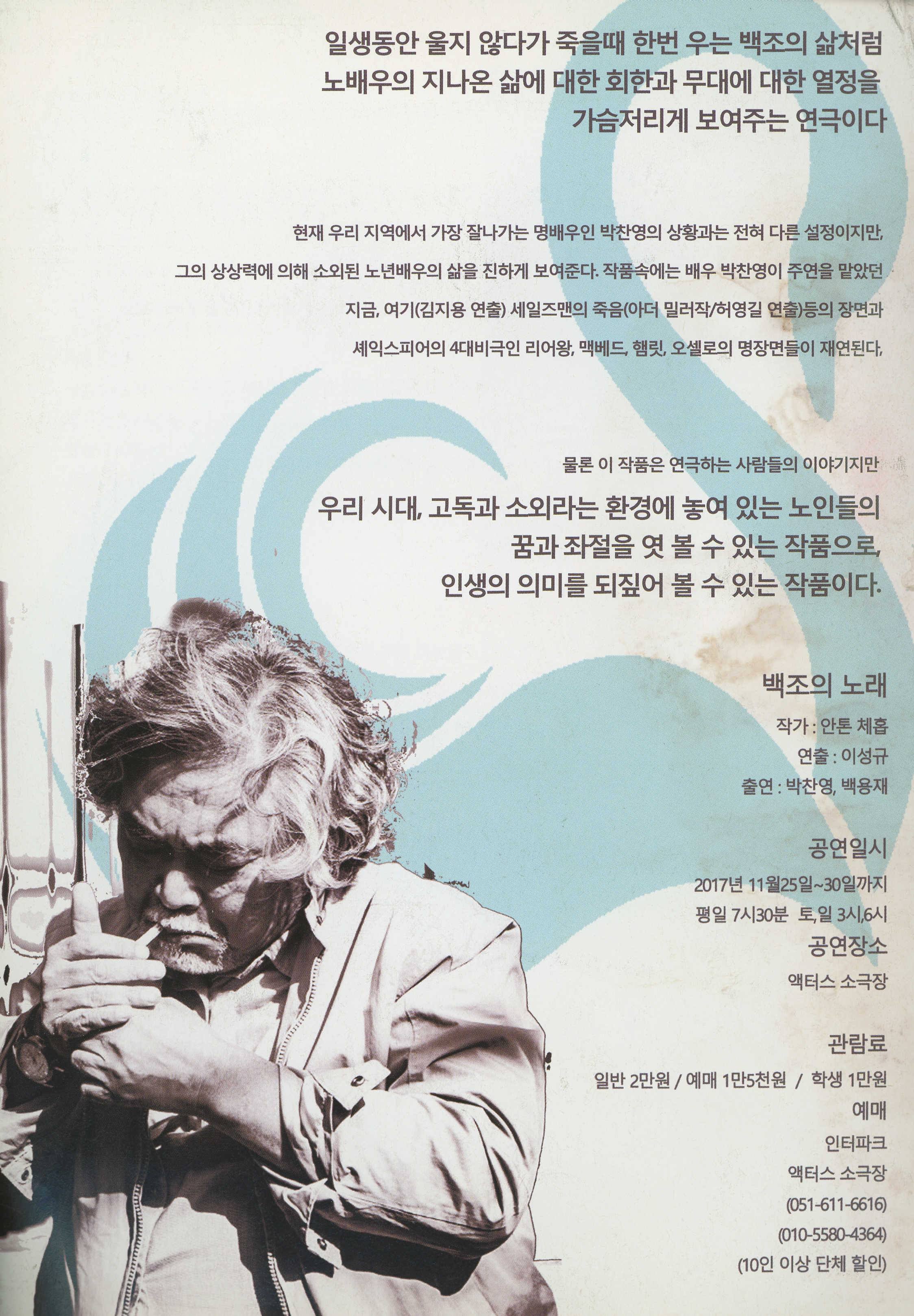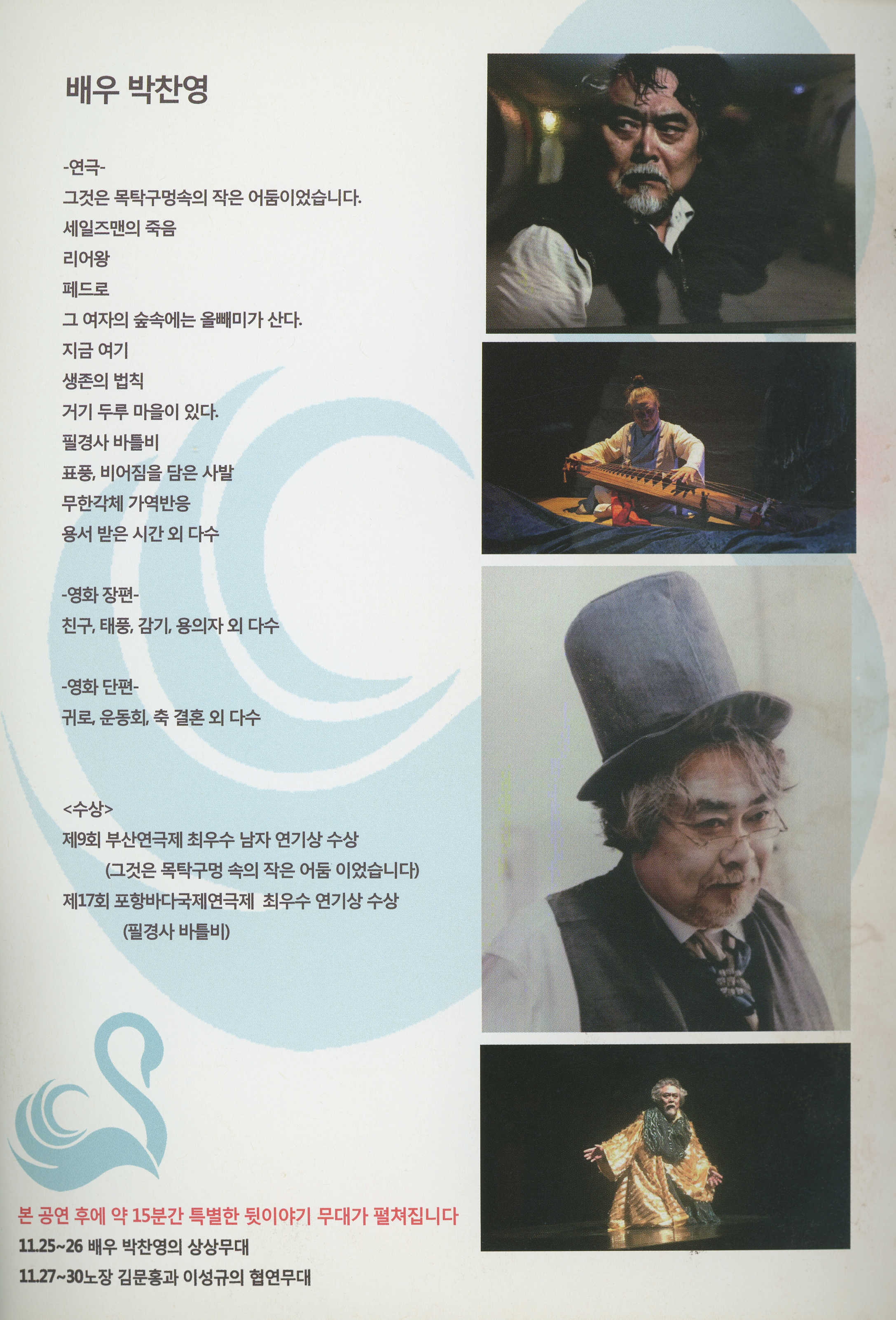 2017년 11월 25일부터 30일가지 액터스소극장에서 공연한 '노배우의 마지막노래 백조의 노래' 리플릿이다. 공연정보, 출연배우 박찬영의 약력 및 사진, 연출의도, 줄거리 등이 기술되어 있다.
