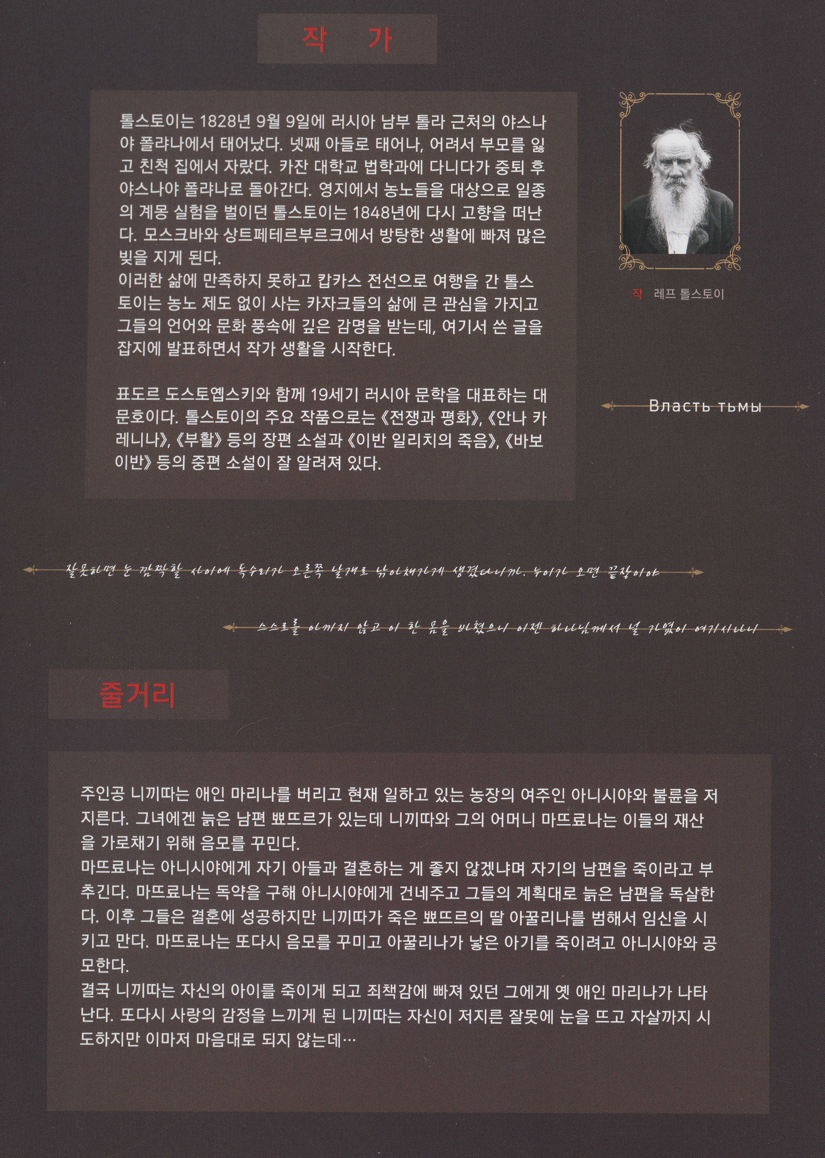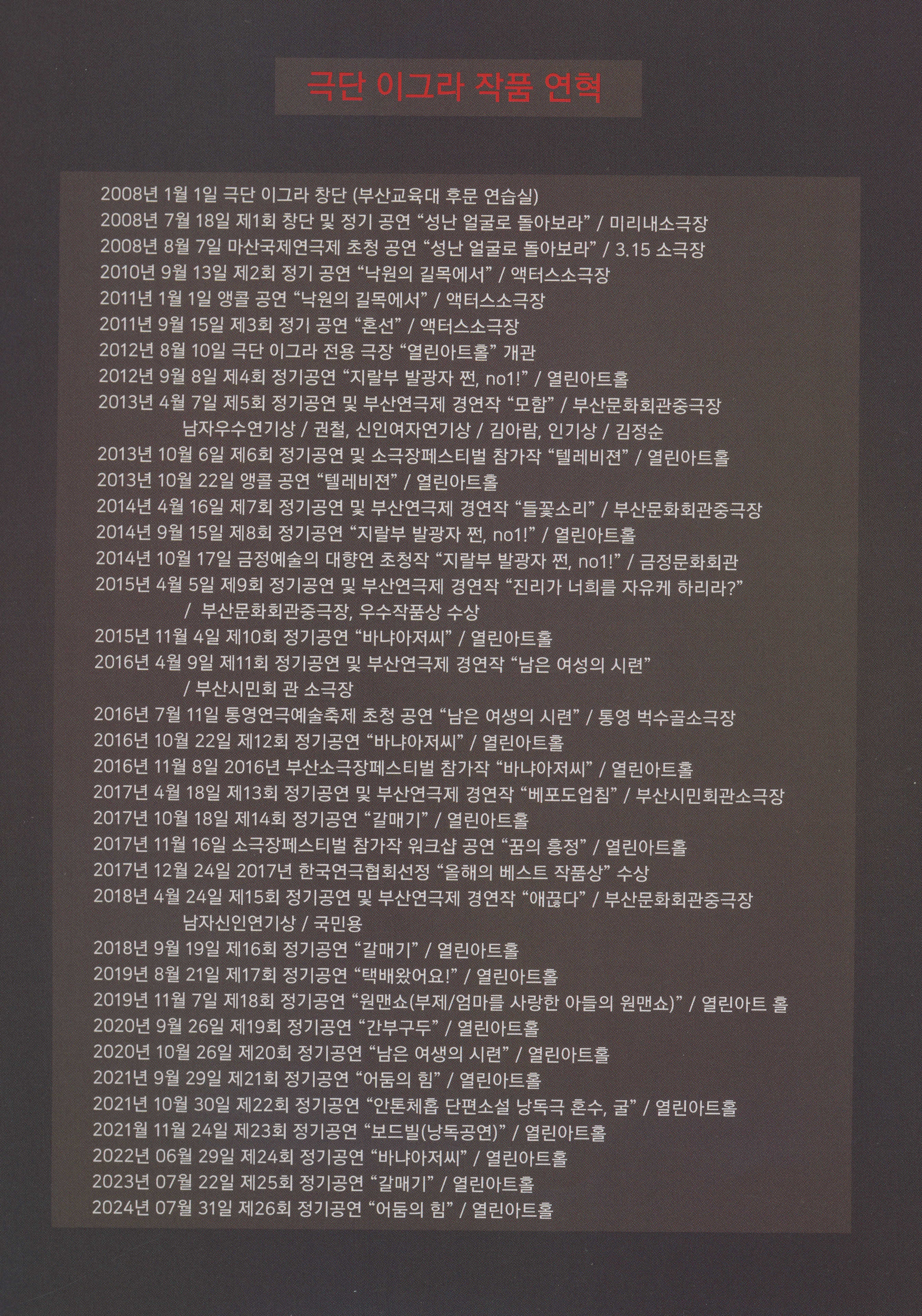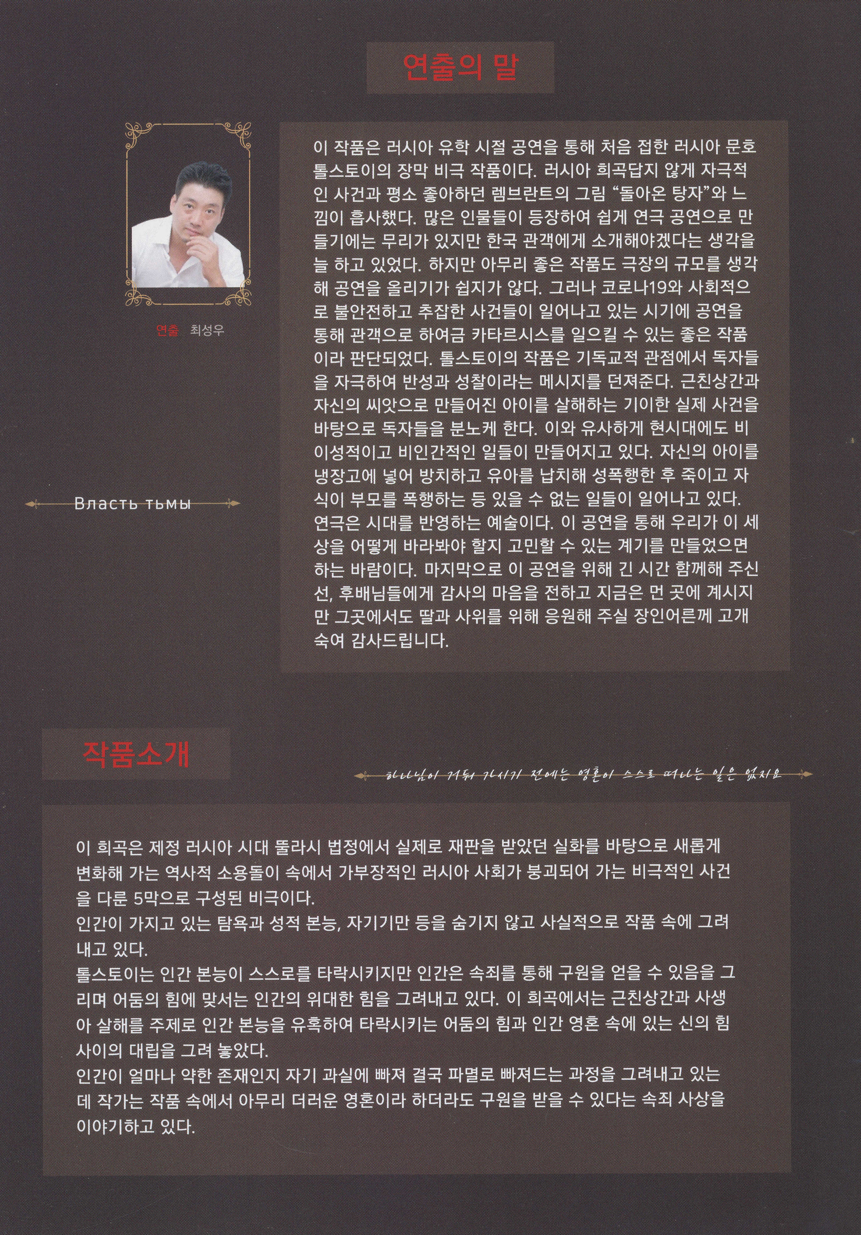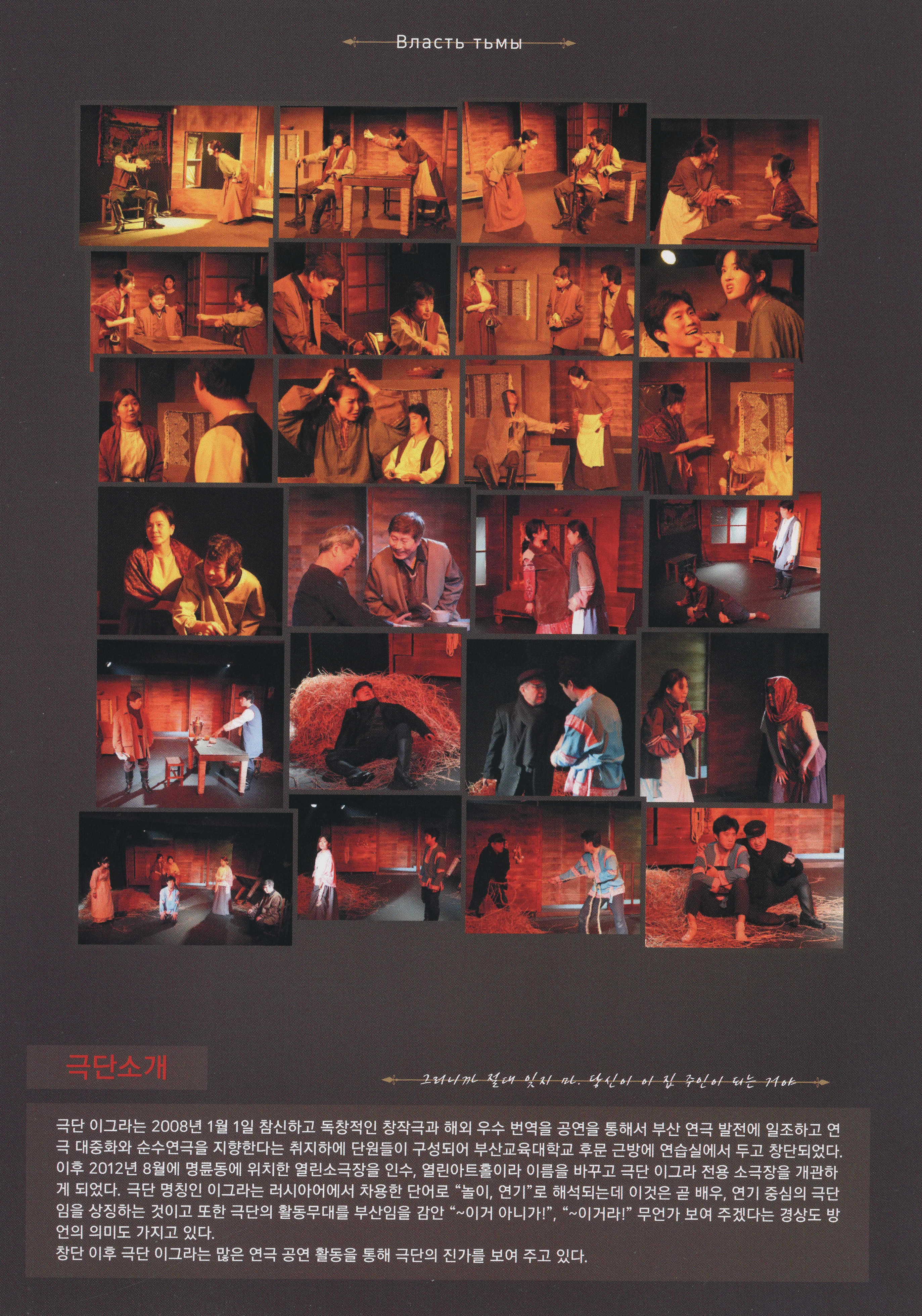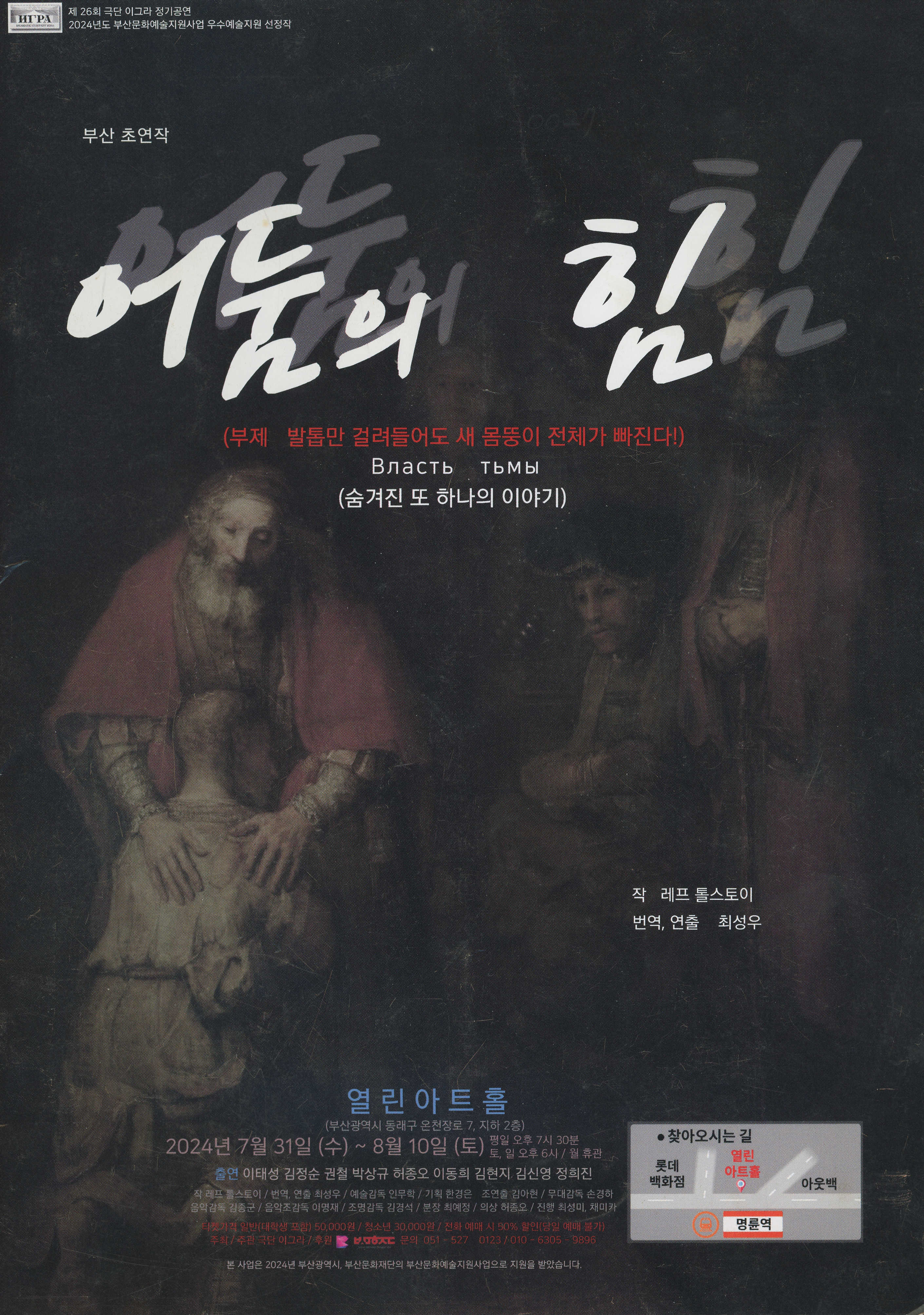 2024년 7월 31일부터 8월 10일까지 열린아트홀에서 공연한 '어둠의 힘(부제 : 발톱만 걸려들어도 새 몸뚱이 전체가 빠진다!) ' 프로그램북이다.