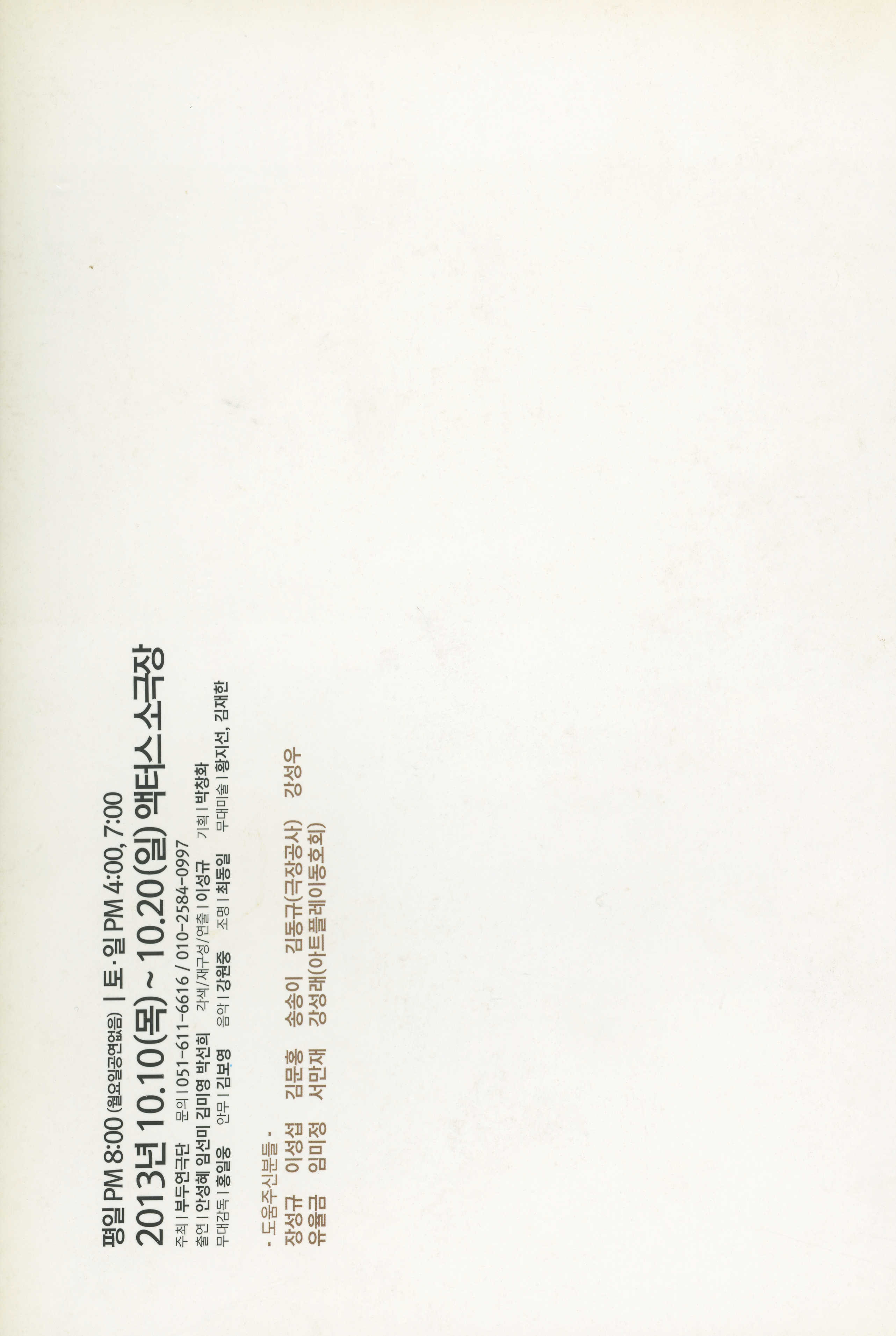 2013년 10월 10일부터 20일까지 액터스소극장에서 공연한 '부두연극단 30주년맞이 준비공연 NO.1 / 부산소극장연극페스티발 참가작 : 여배우를 위한 연극… 오프-스테이지(Off-Stage)' 프로그램북이다.
