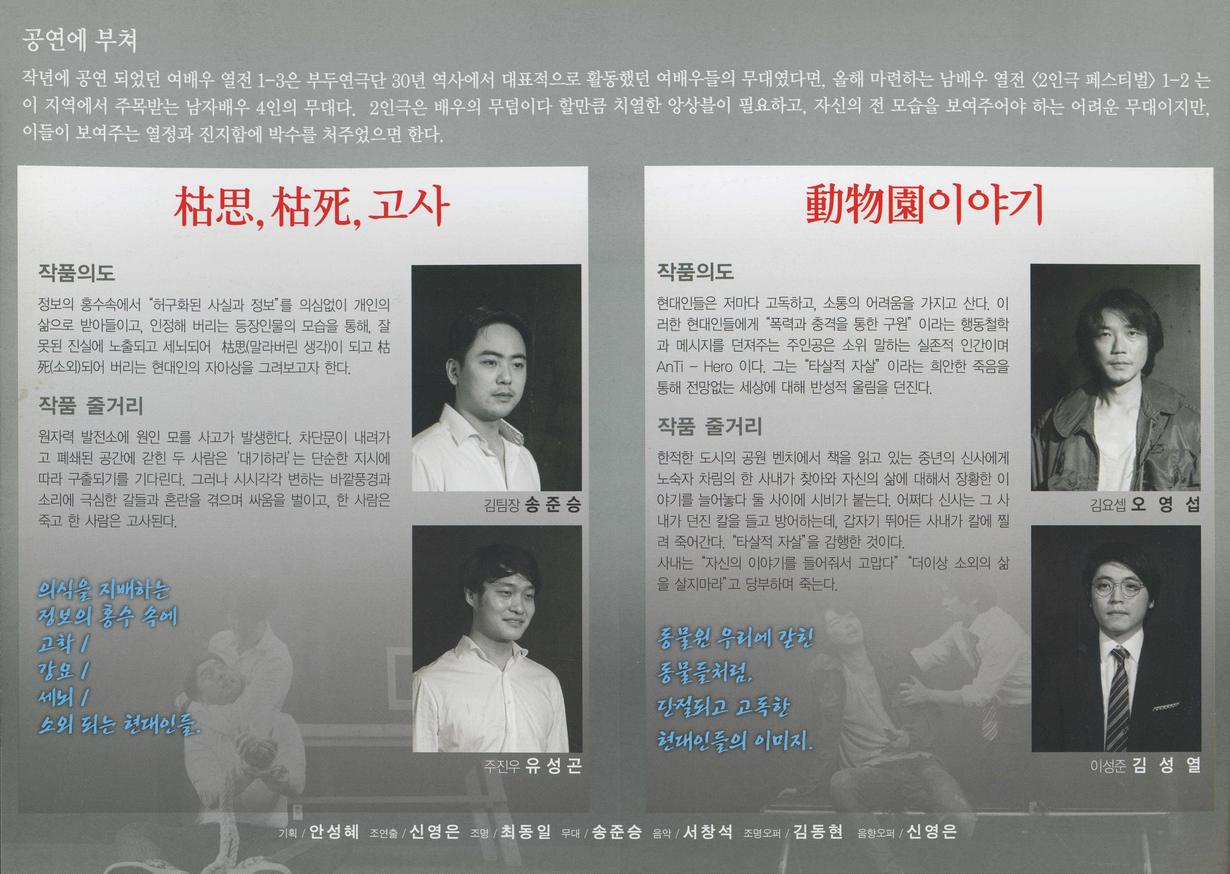 2016년 10월 24일부터 11월 21일까지 액터스 소극장에서 공연한 '男배우열전 2인극 페스티벌 枯思, 枯死, 고사 / 動物園이야기' 팜플렛이다. 공연일정(2016년 10월 24일부터 11월 7일까지 枯思, 枯死, 고사/11월 11일부터 21일까지 動物園이야기) 및 공연사진, 소개말씀, 공연정보(작품의도, 작품 줄거리, 출연진) 등이 기술되어 있다.