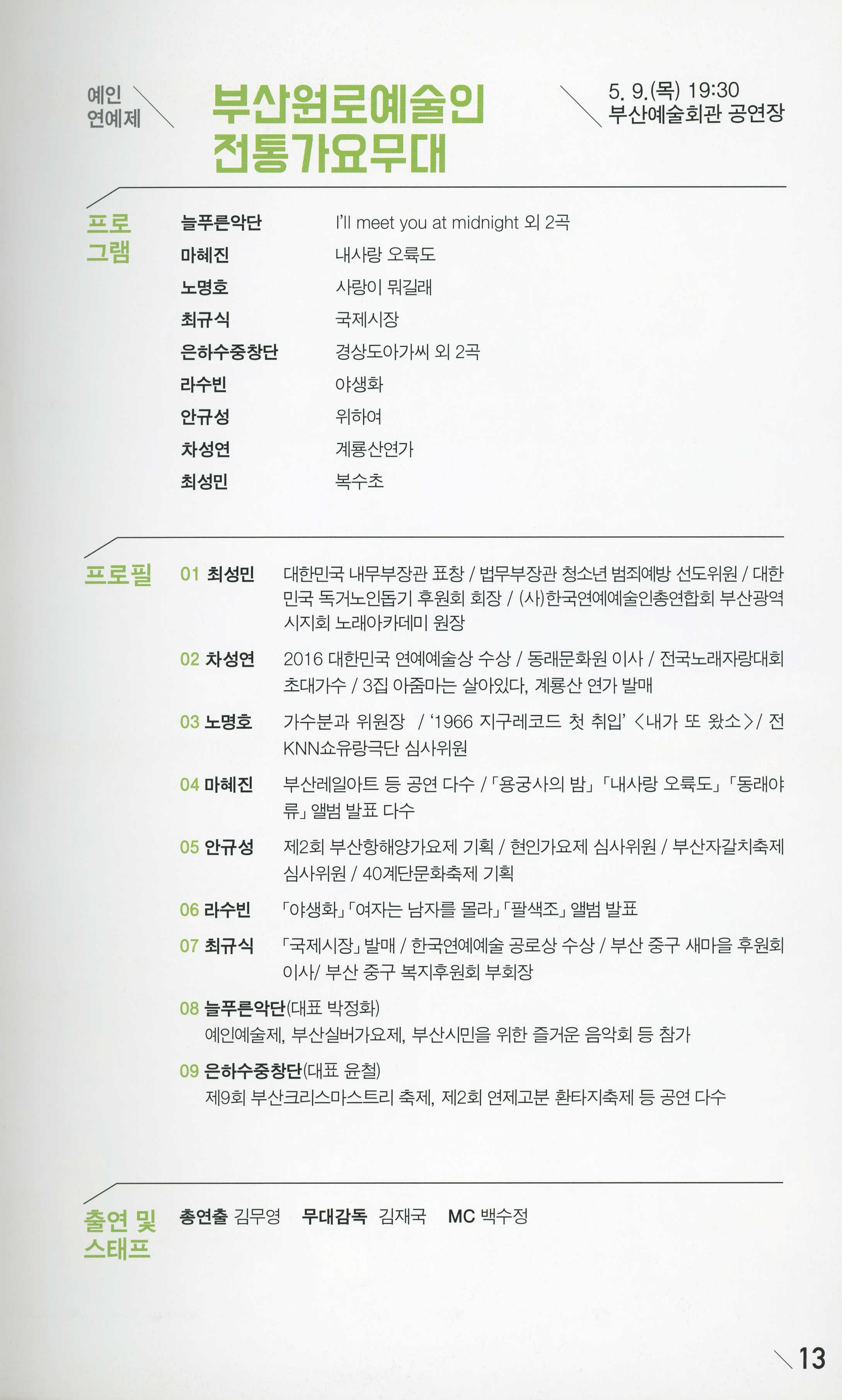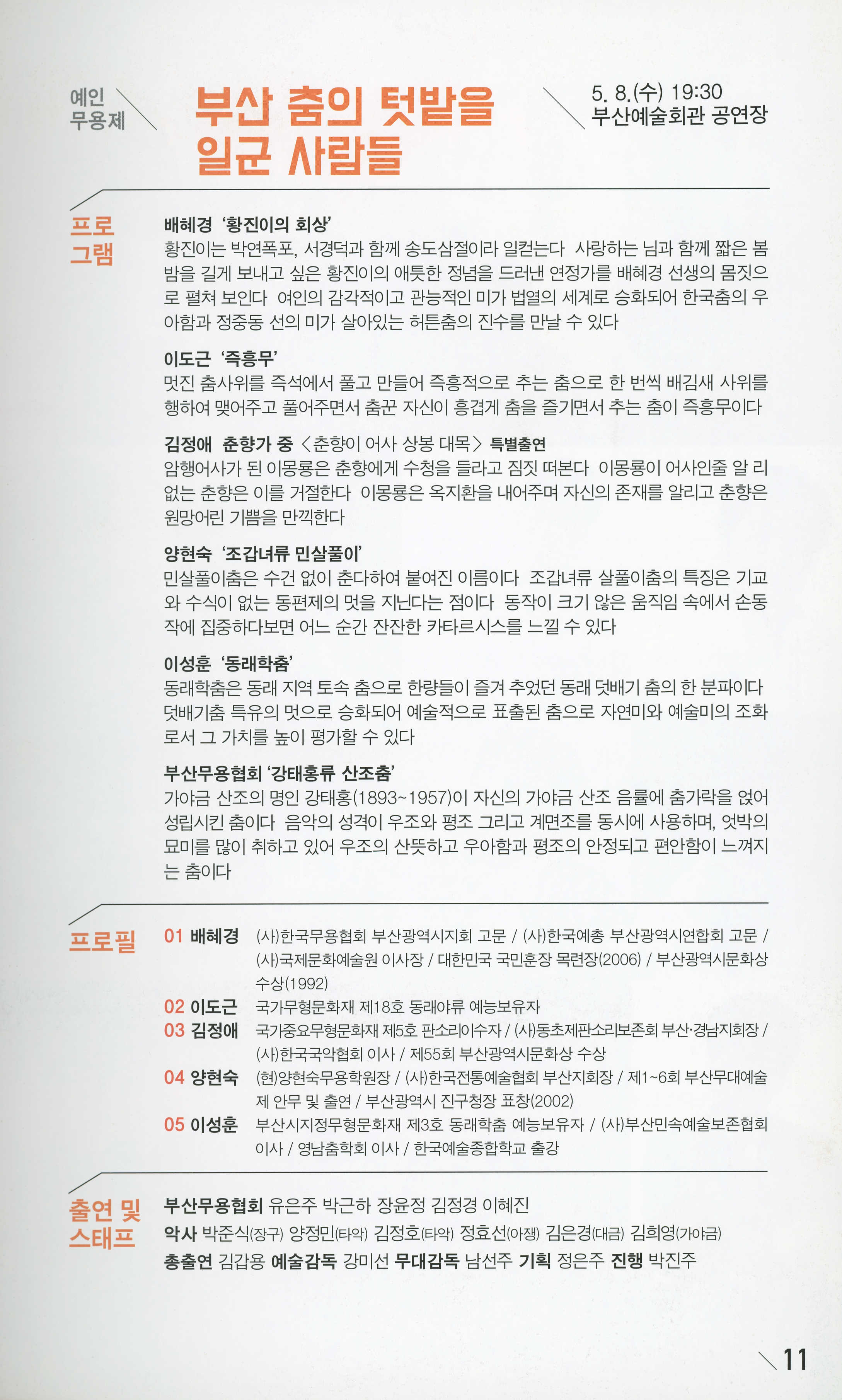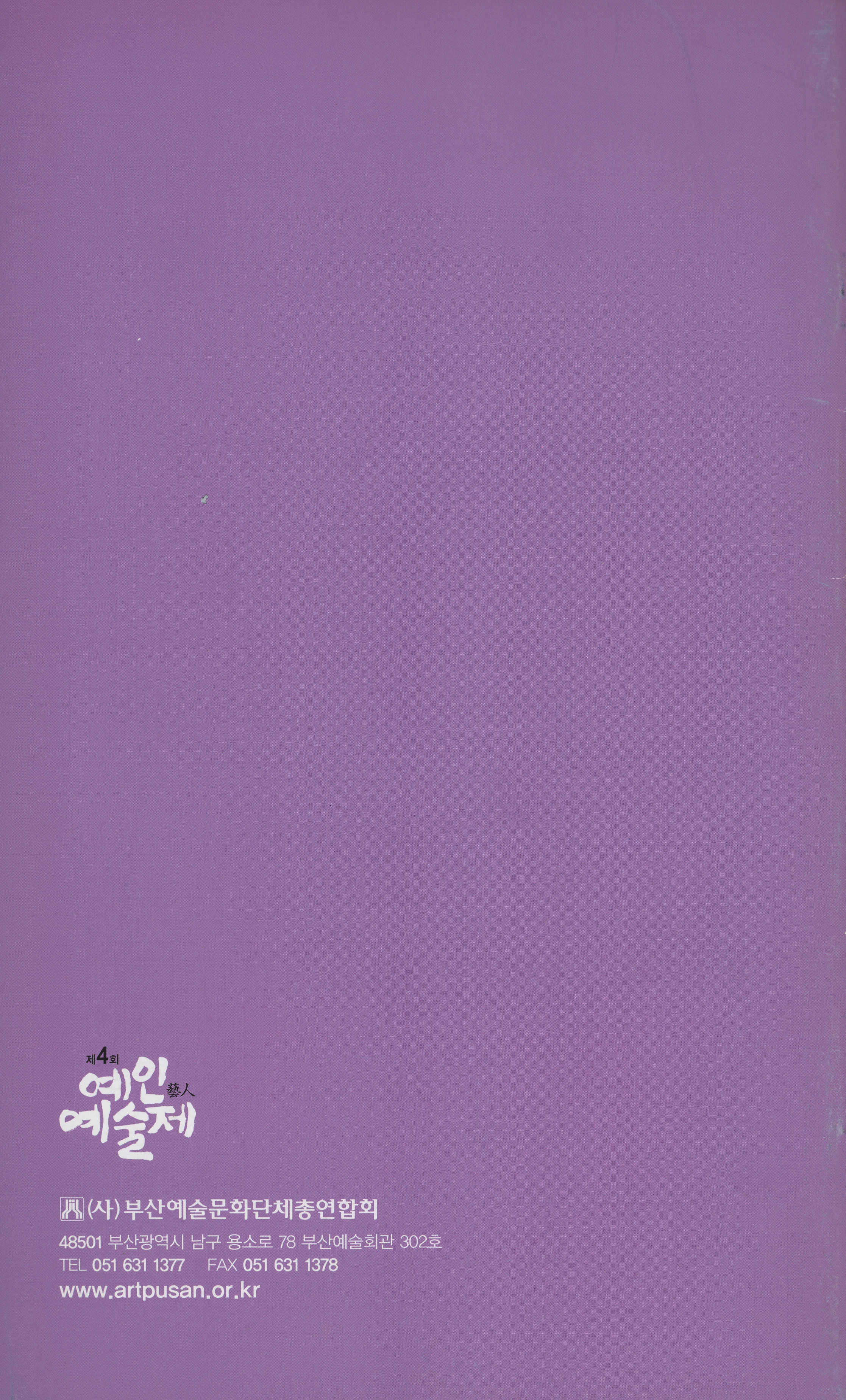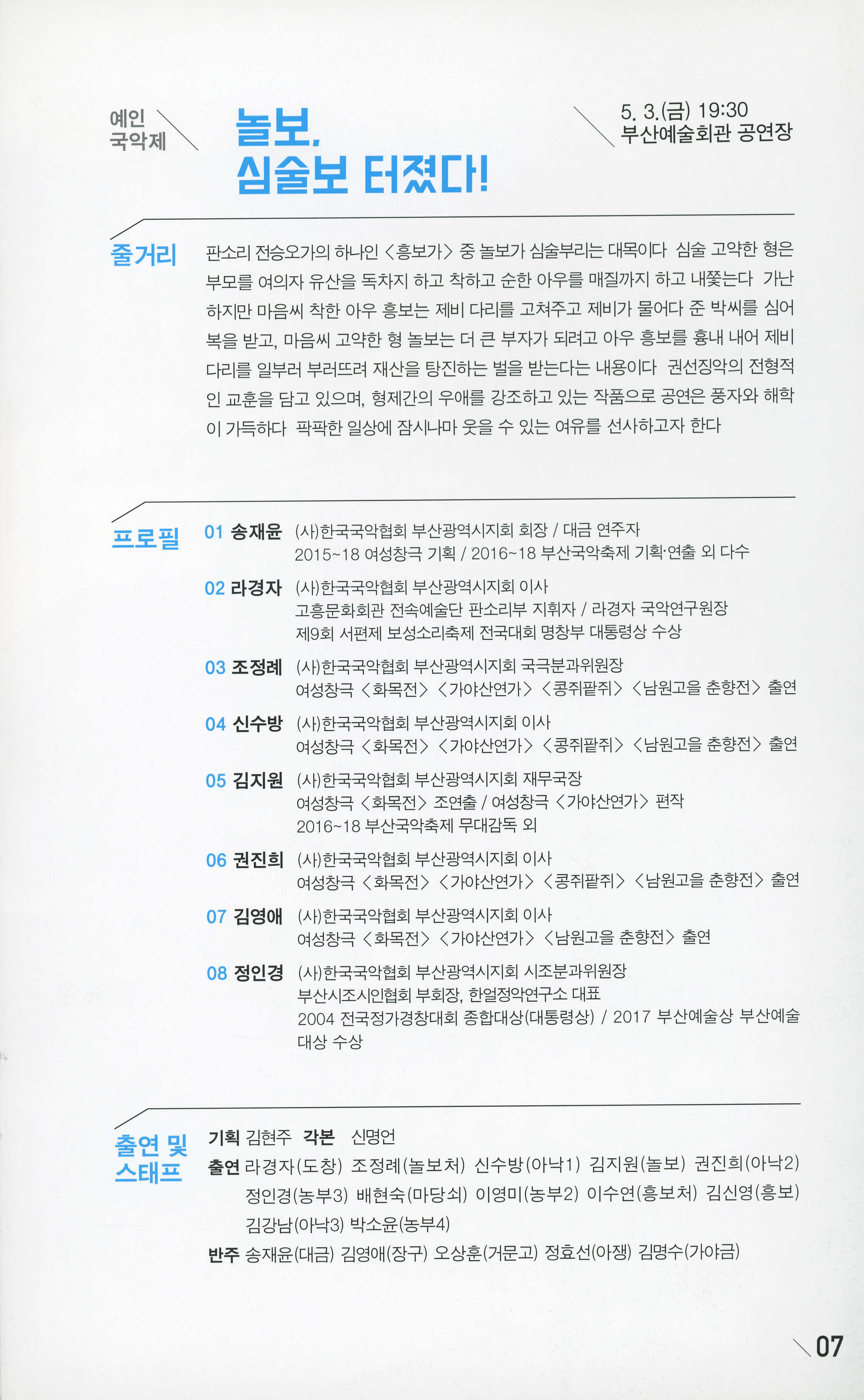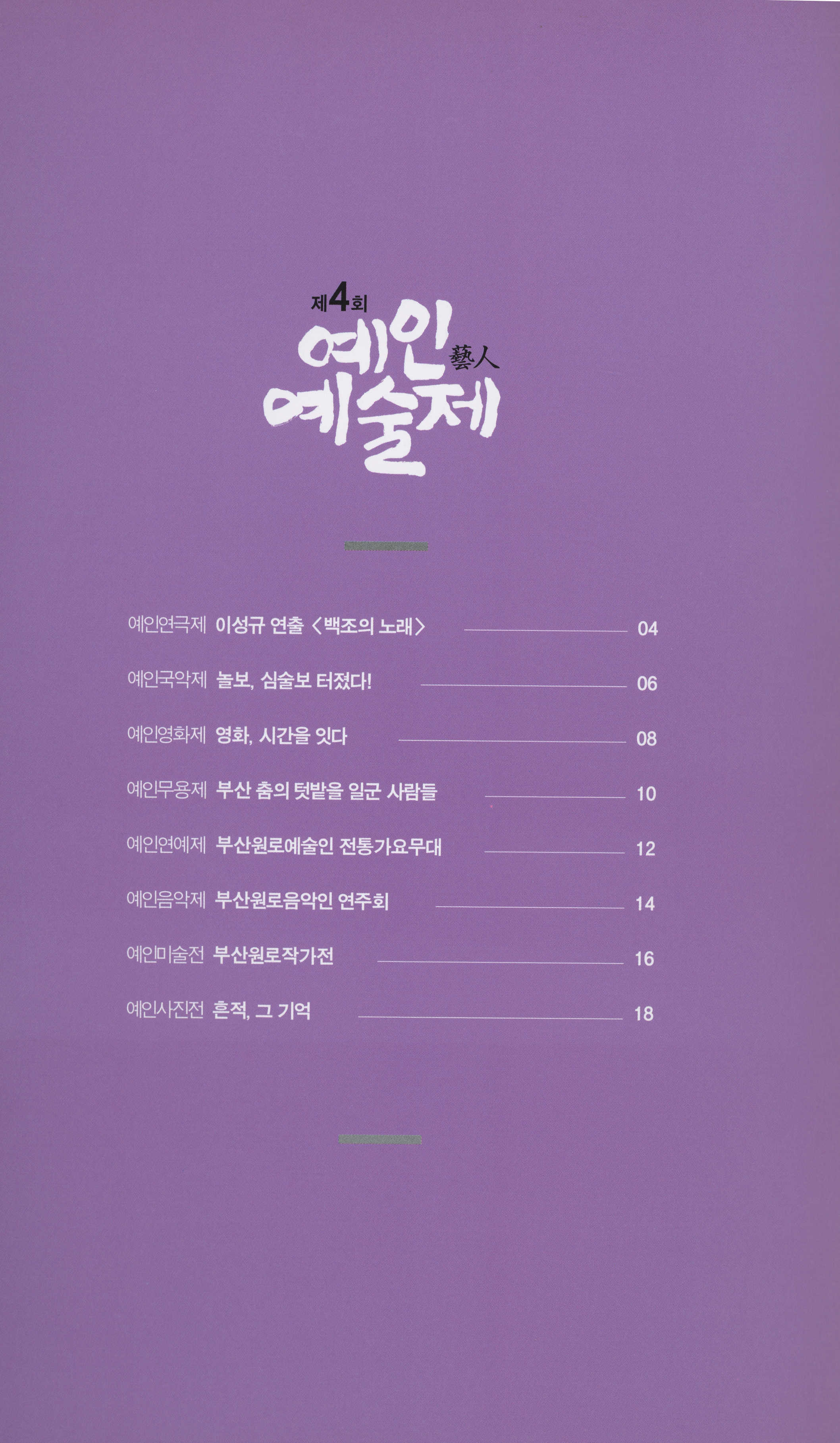 2019년 4월 29일부터 5월 10일까지 부산예술회관 공연장·전시장에서 공연한 부산예술회관 기획 '제4회 예인藝人예술제' 프로그램북이다. (사)부산예술문화단체총연합회 회장 김동석의 글, 예술제 프로그램(이성규 연출 <백조의 노래>/ 놀보, 심술보 터졌다!/ 영화, 시간을 잇다/부산 춤의 텃밭을 일군 사람들/부산원로예술인 전통가요무대/부산원로음악인 연주회/부산원로작가전/흔적, 그 기억) 안내 등이 기술되어 있다.