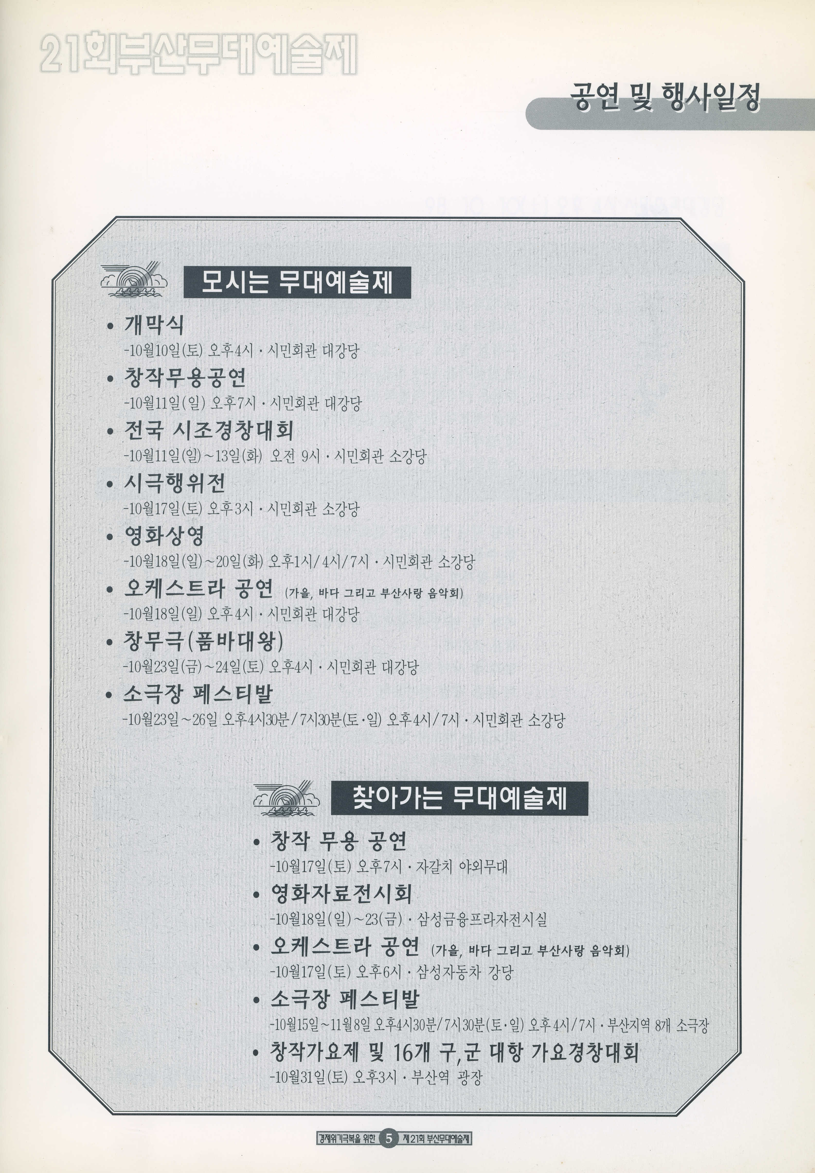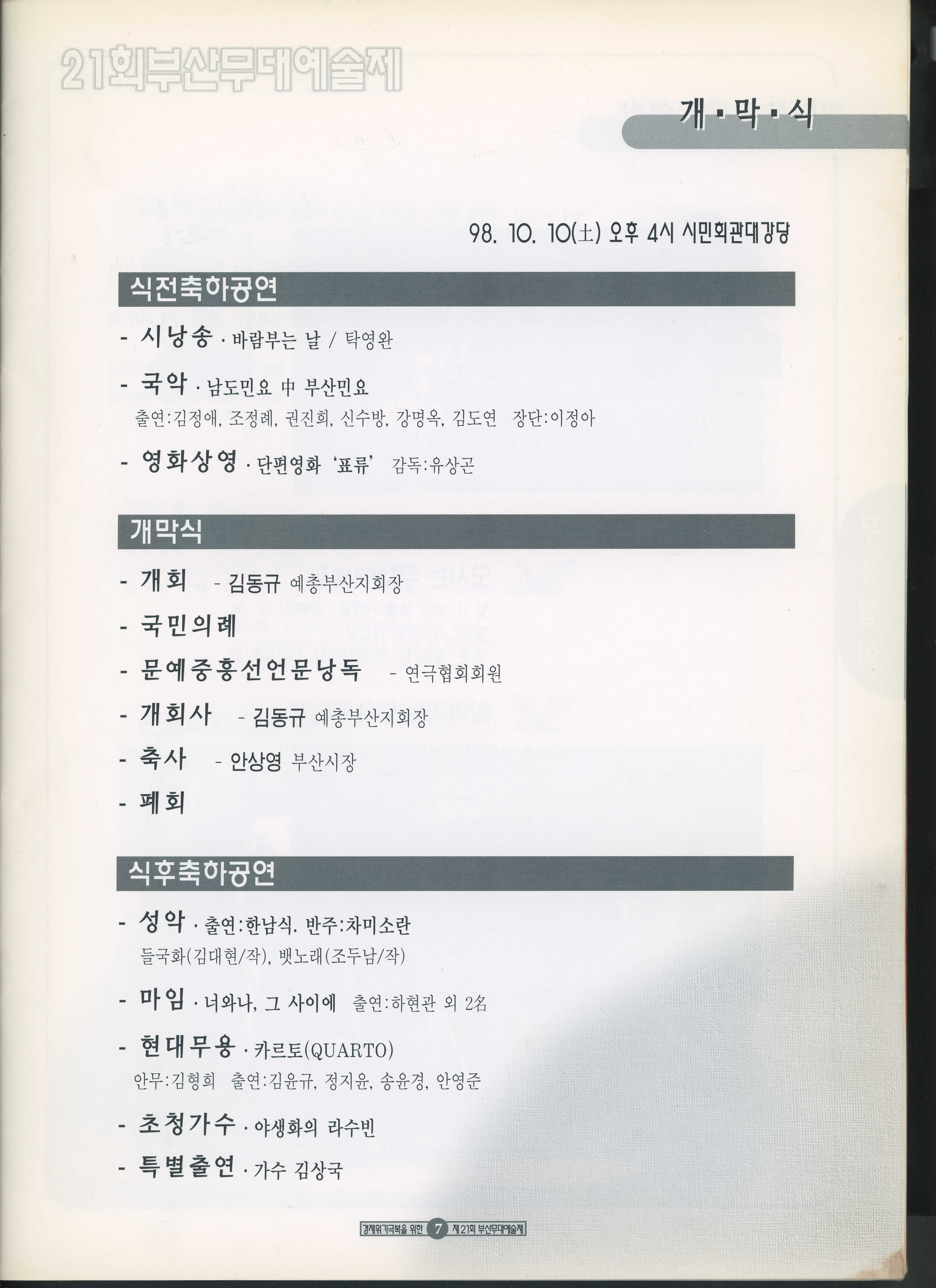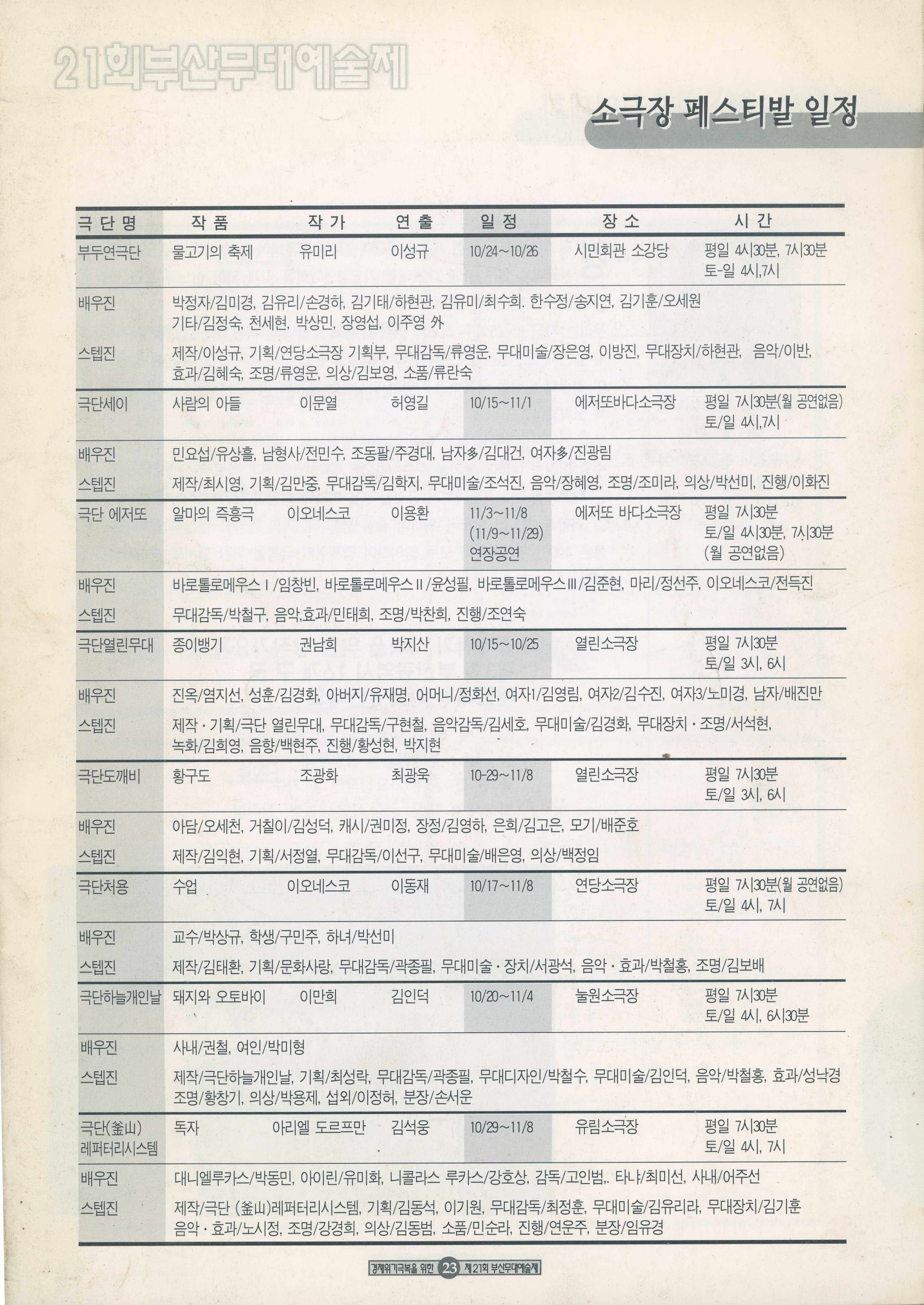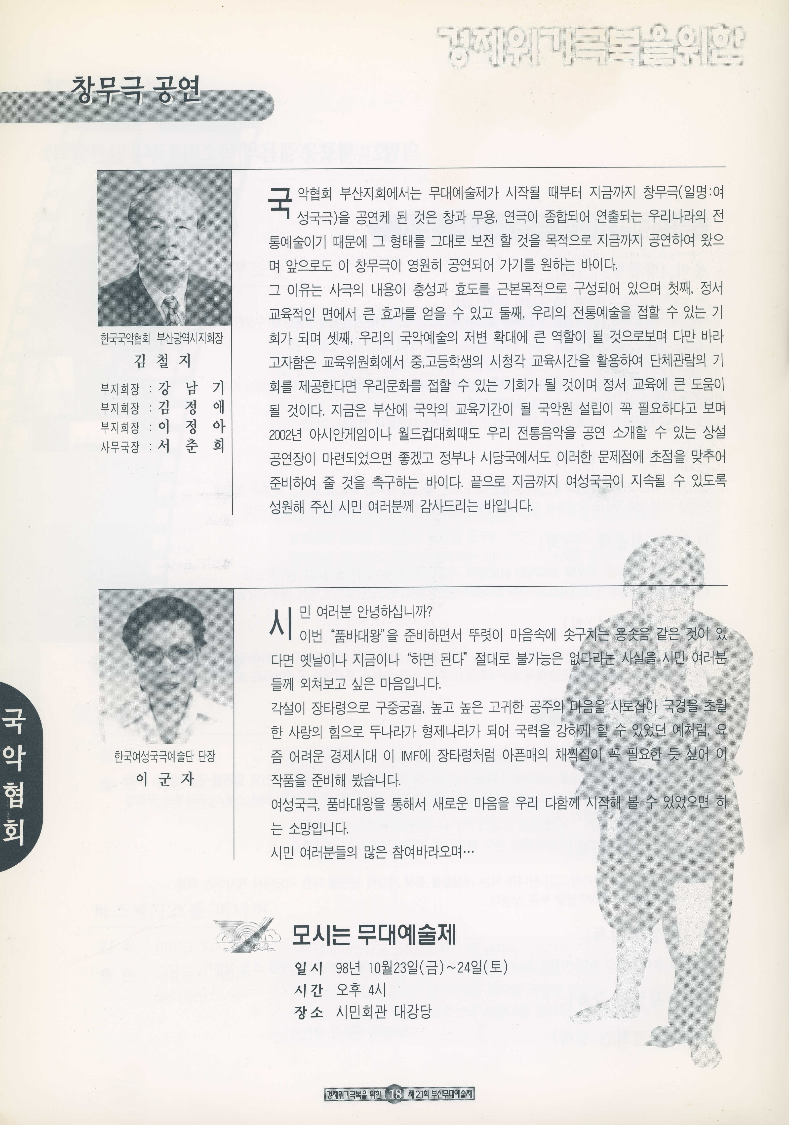 1998년 10월 10일부터 11월 8일까지 열린 '경제위기극복을 위한 21회 부산무대예술제' 프로그램북이다.