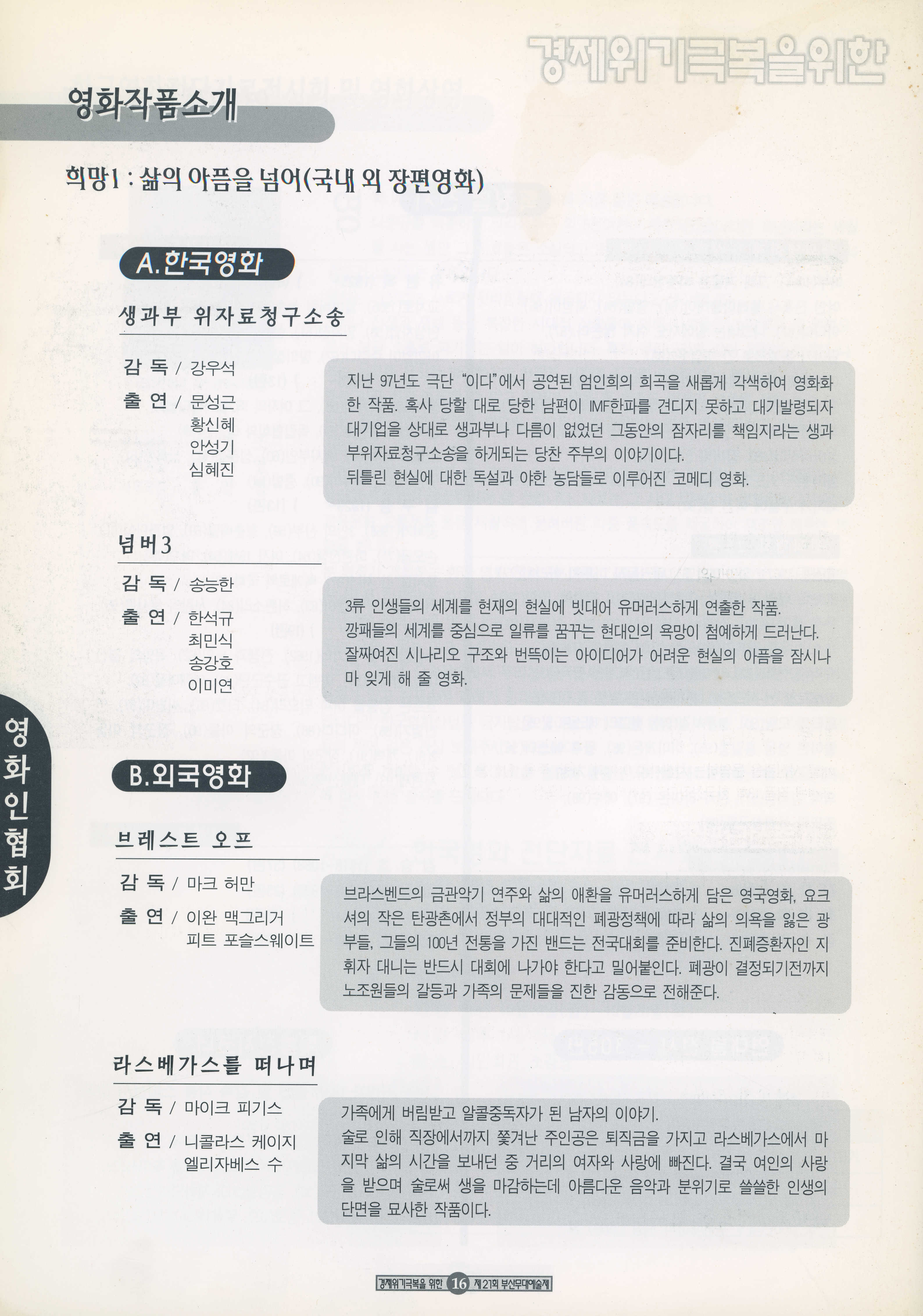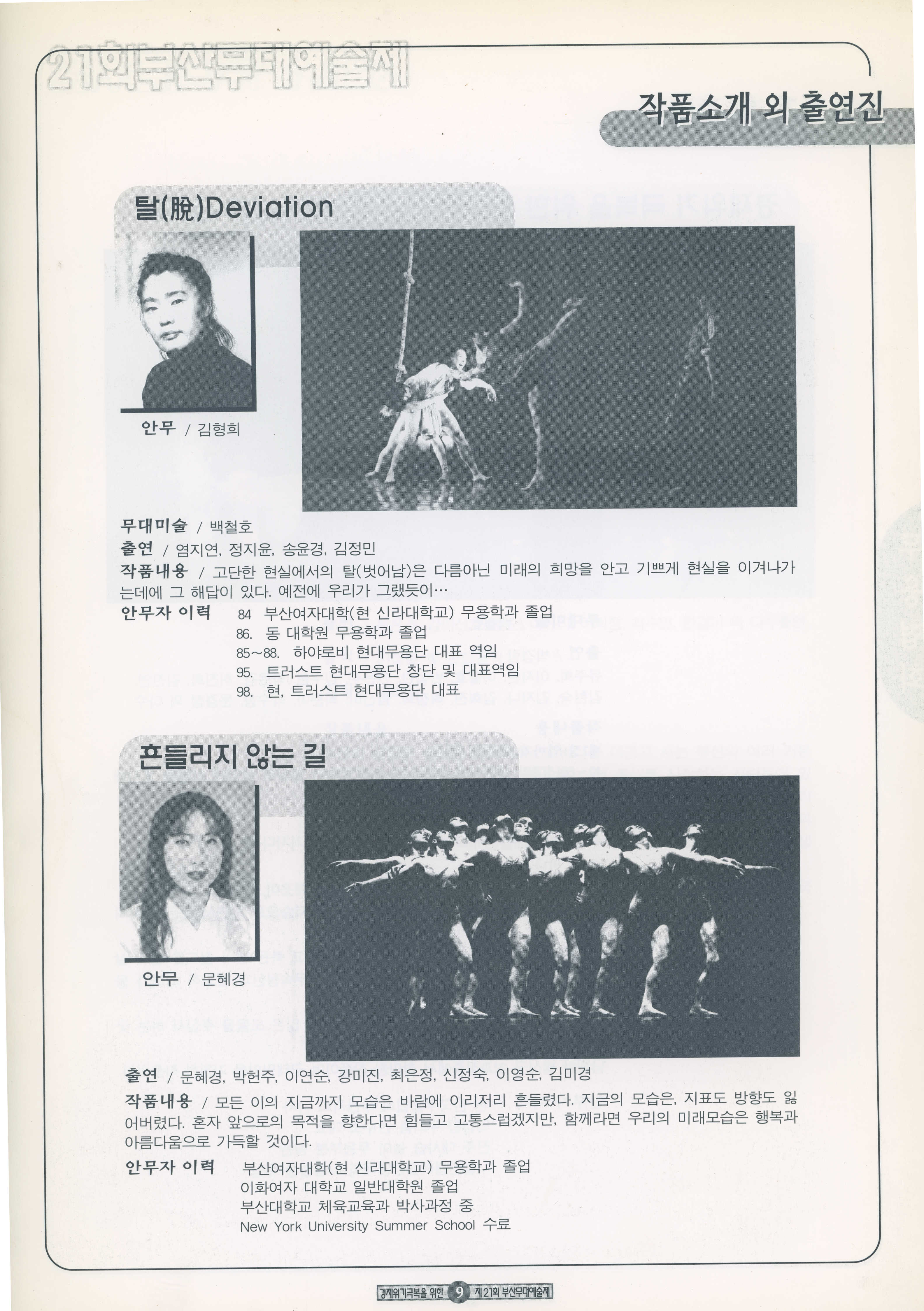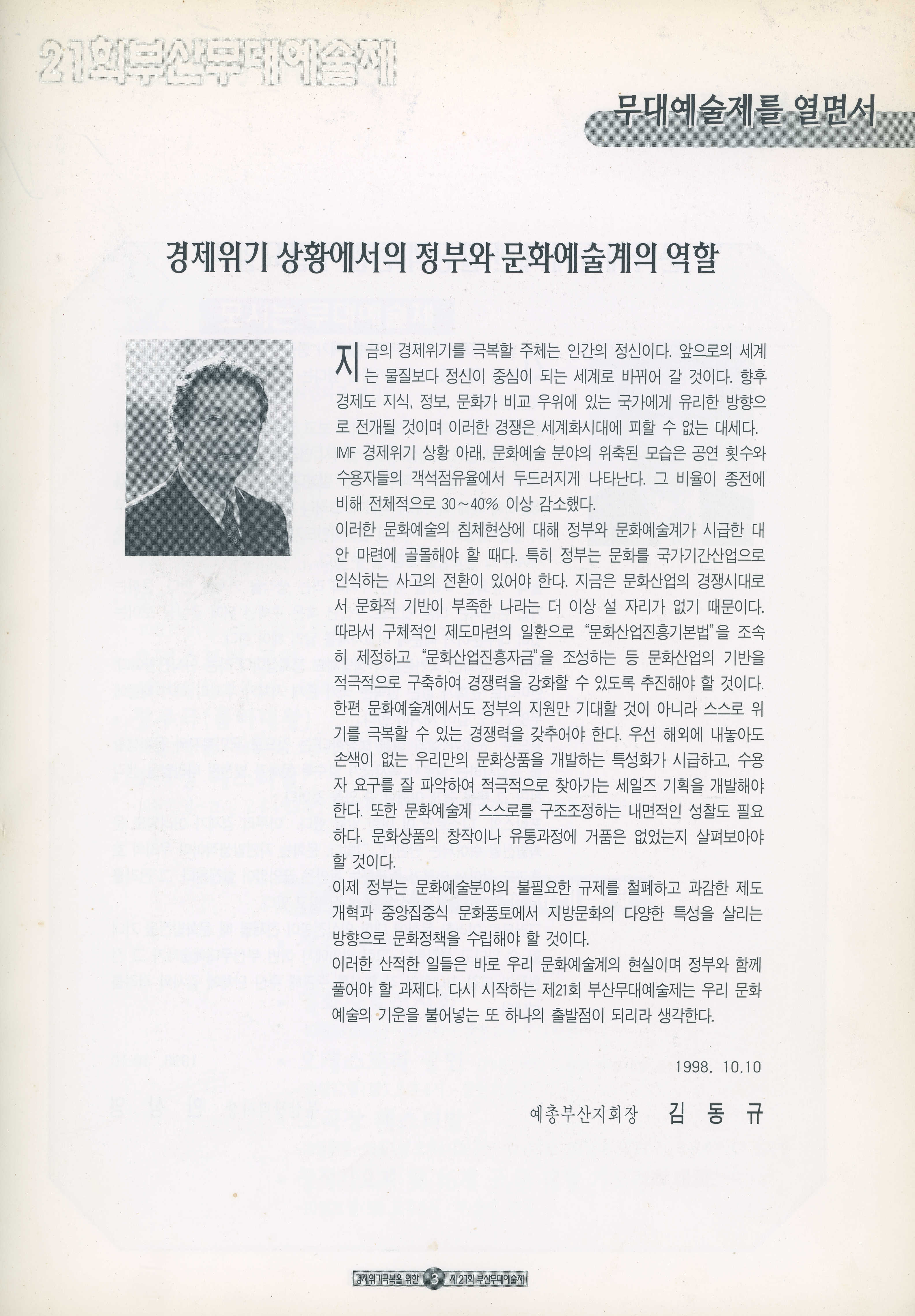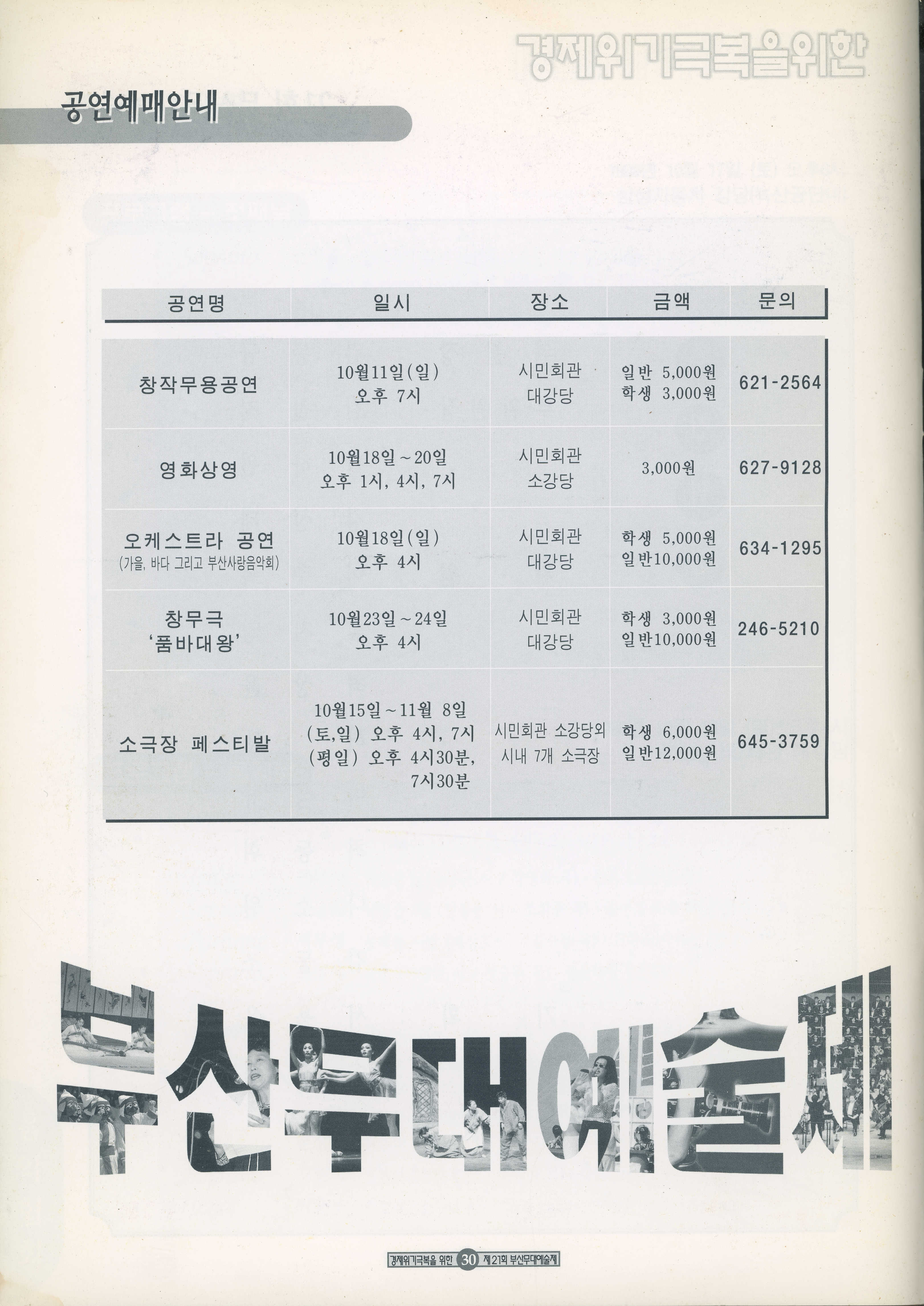 1998년 10월 10일부터 11월 8일까지 열린 '경제위기극복을 위한 21회 부산무대예술제' 프로그램북이다.