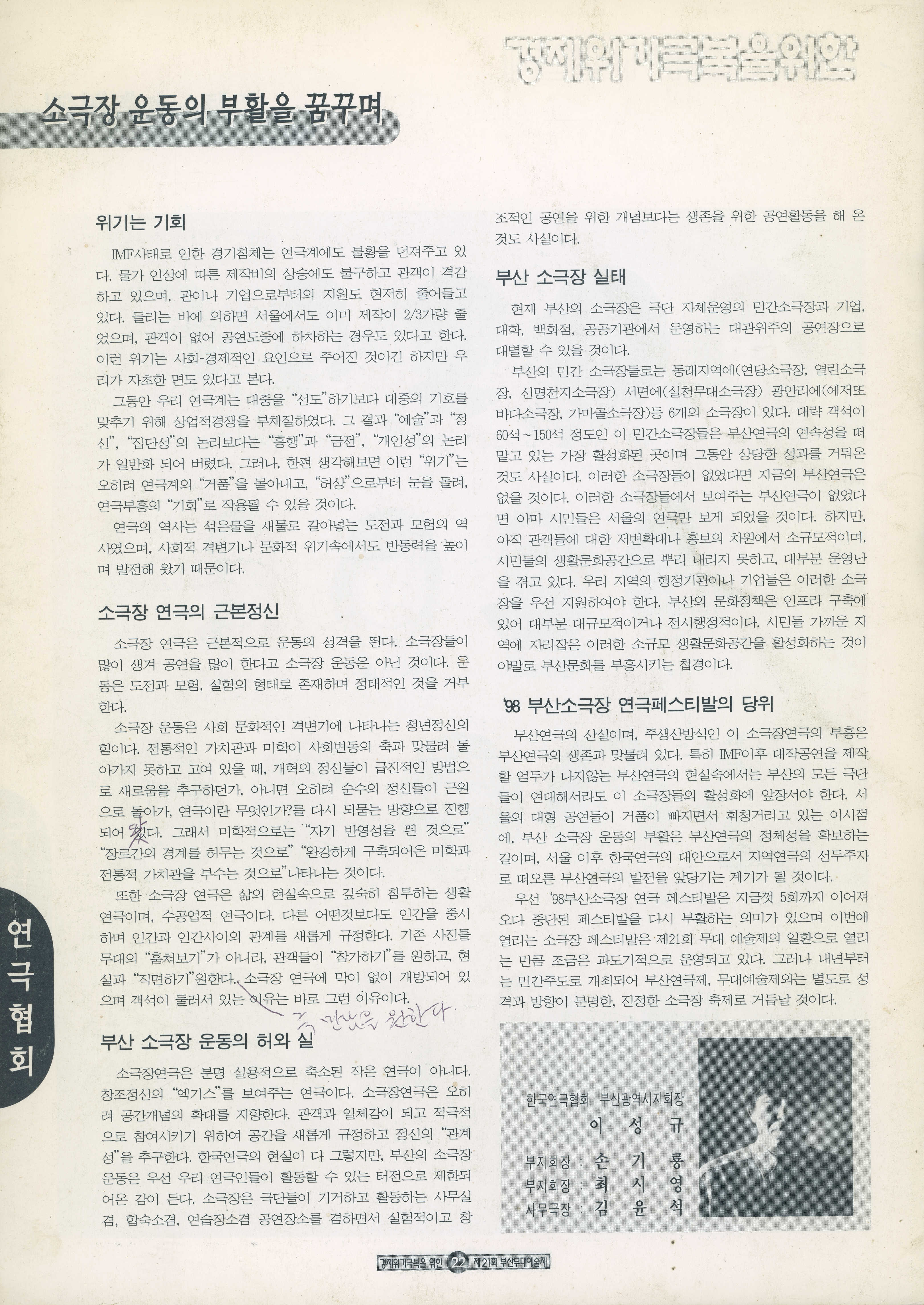 23페이지 소극장페스티발 일정 이성규 연출 공연 있음. 29페이지 21회 부산무대예술제 추진위원 이성규 이름 있음.