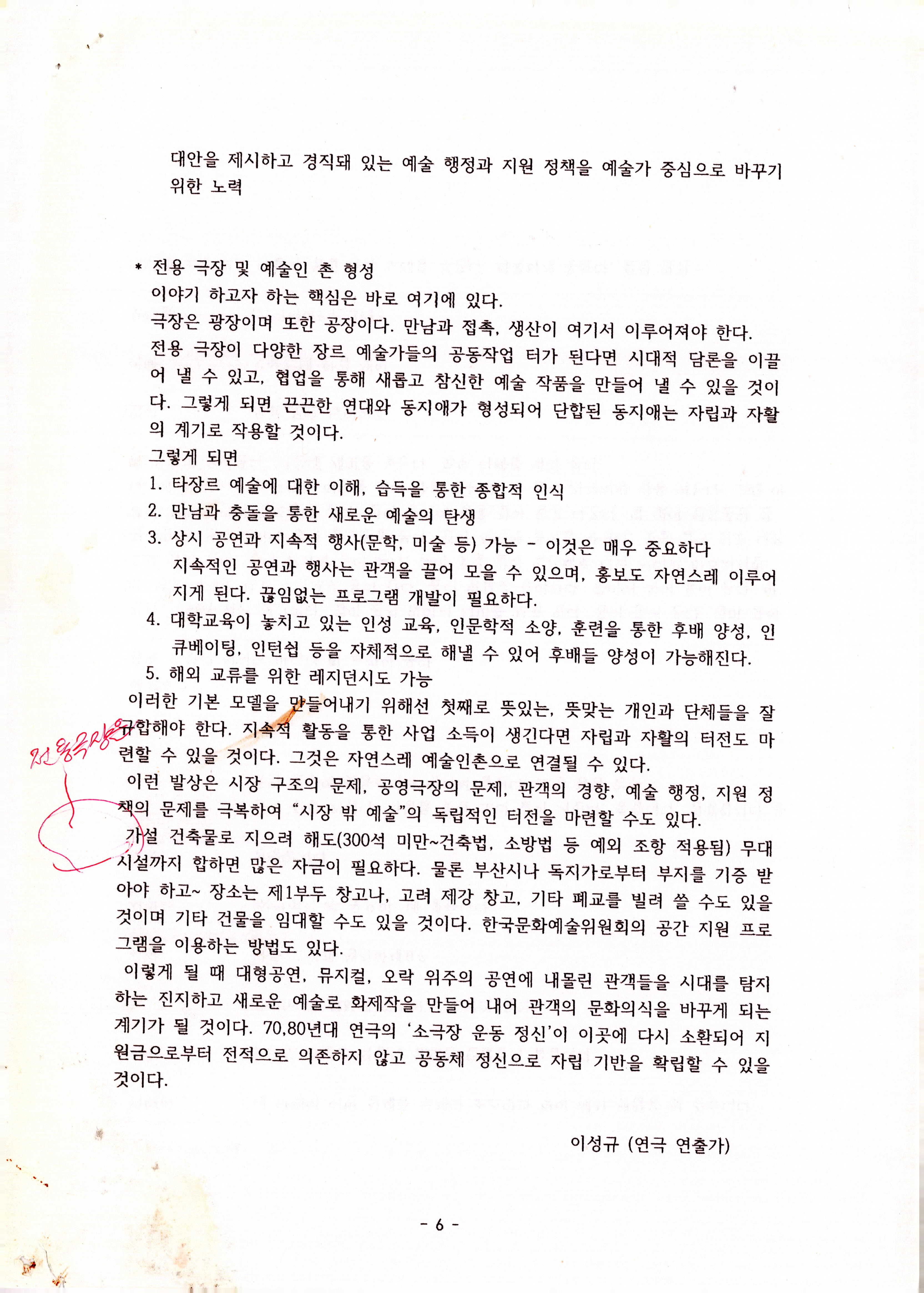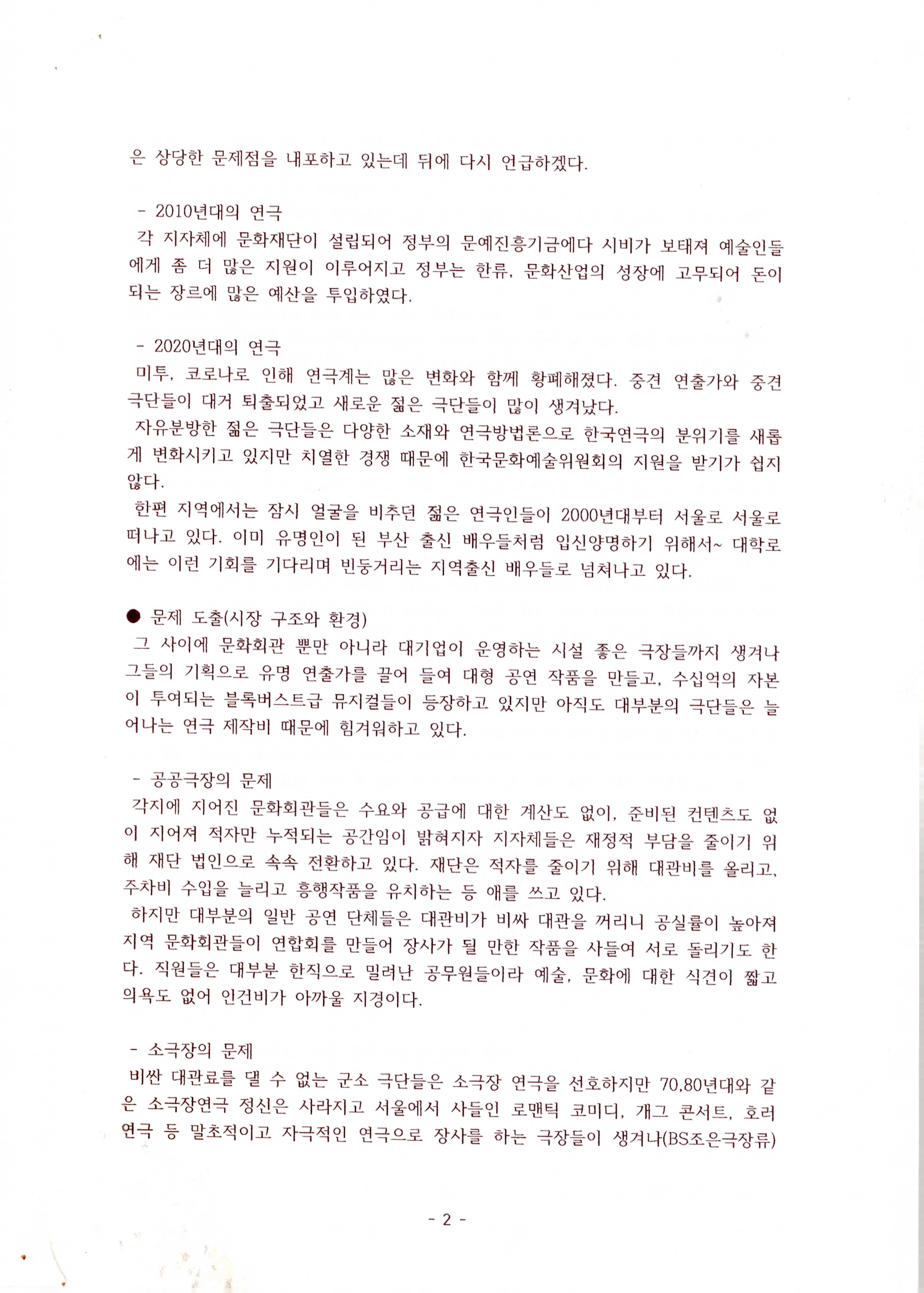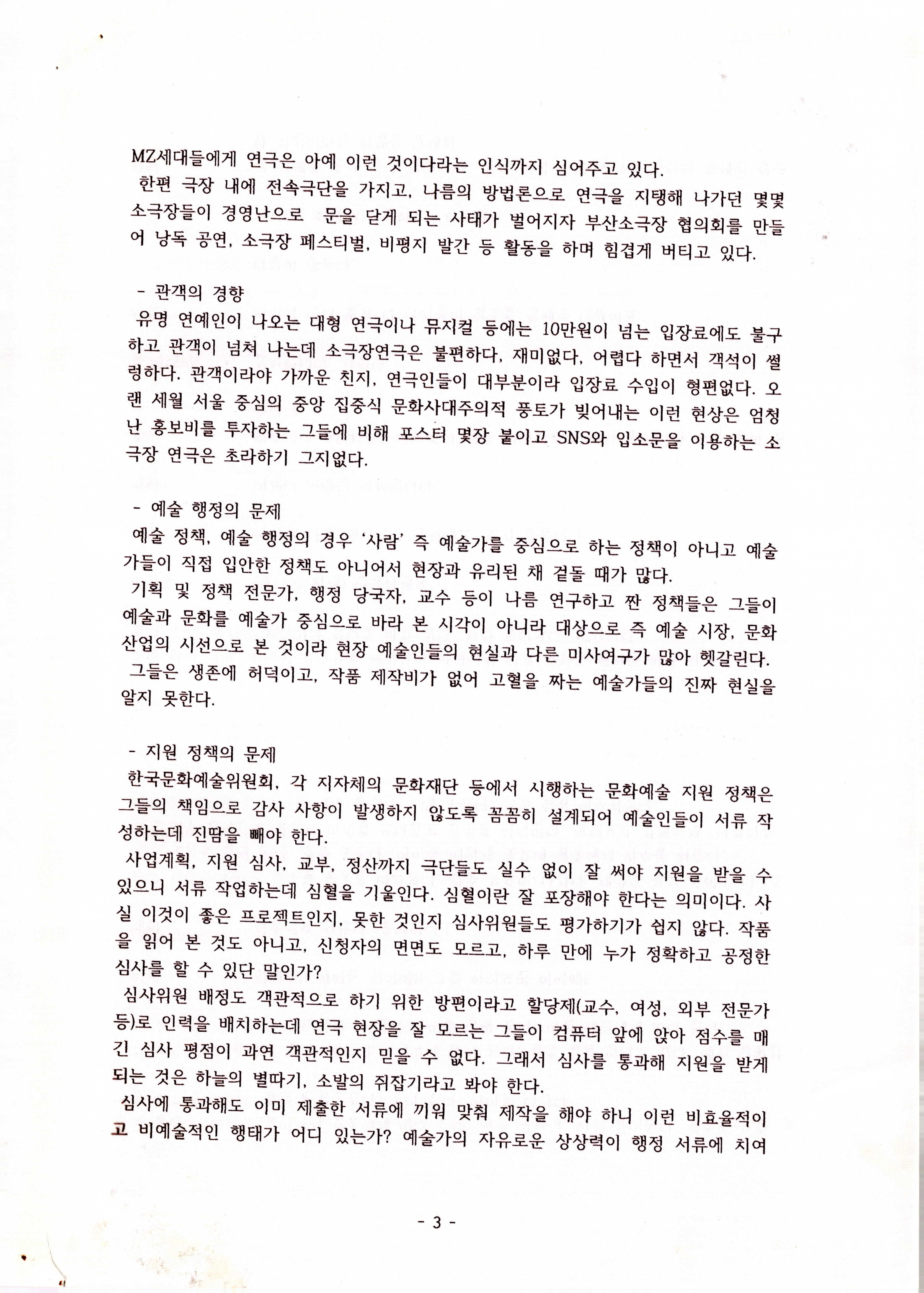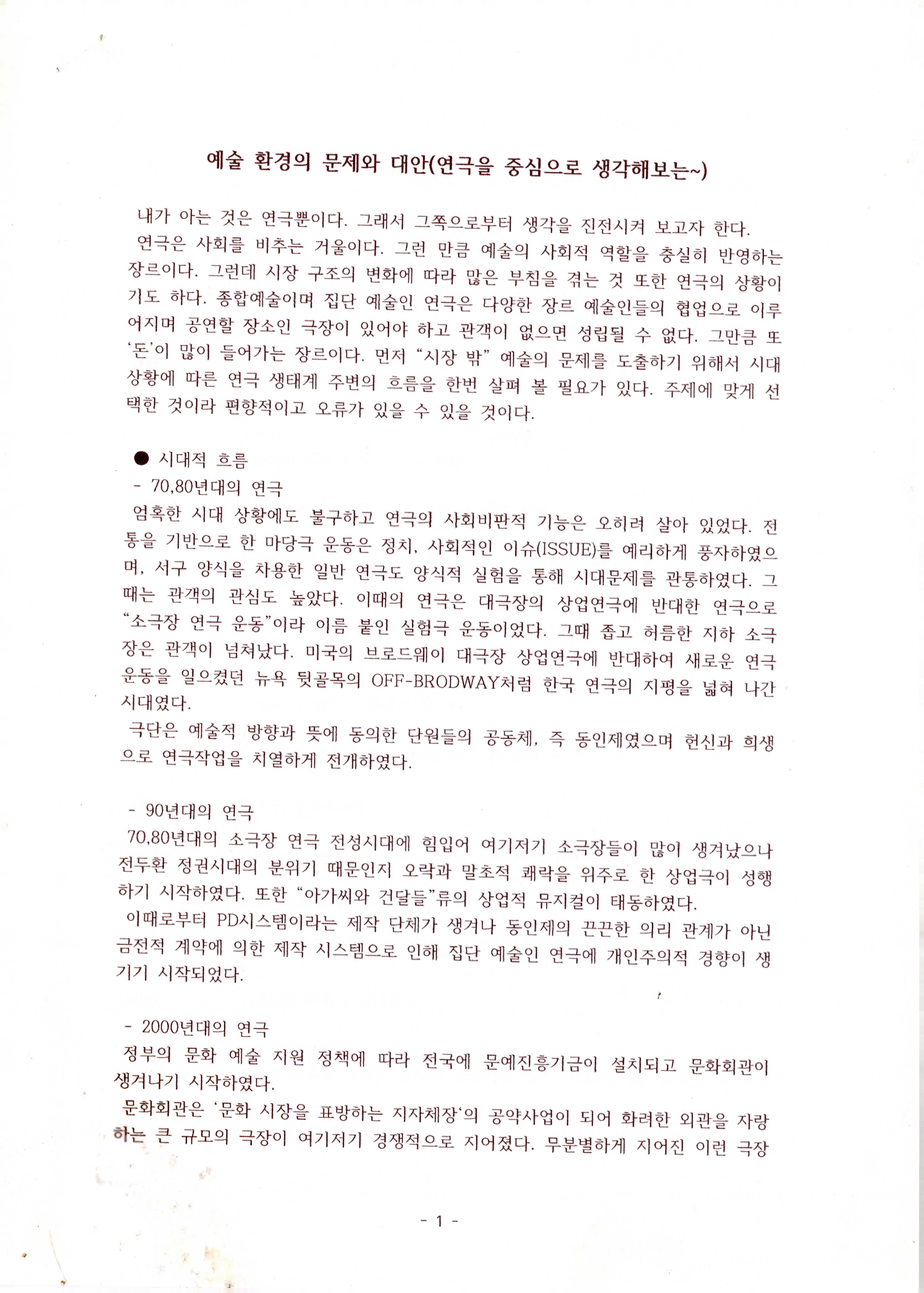 연도미상의 '예술 환경의 문제와 대안(연극을 중심으로 생각해 보는) (이성규 기고)' 논평 발제문의 일부이다. 1970~2020년대 연극에 대한 시대적 흐름, 시장 구조와 환경에 대한 문제 도출, 모순 해결을 위한 연극계 내부의 일부 움직임, 결론 순으로 내용이 기술되어 있다.