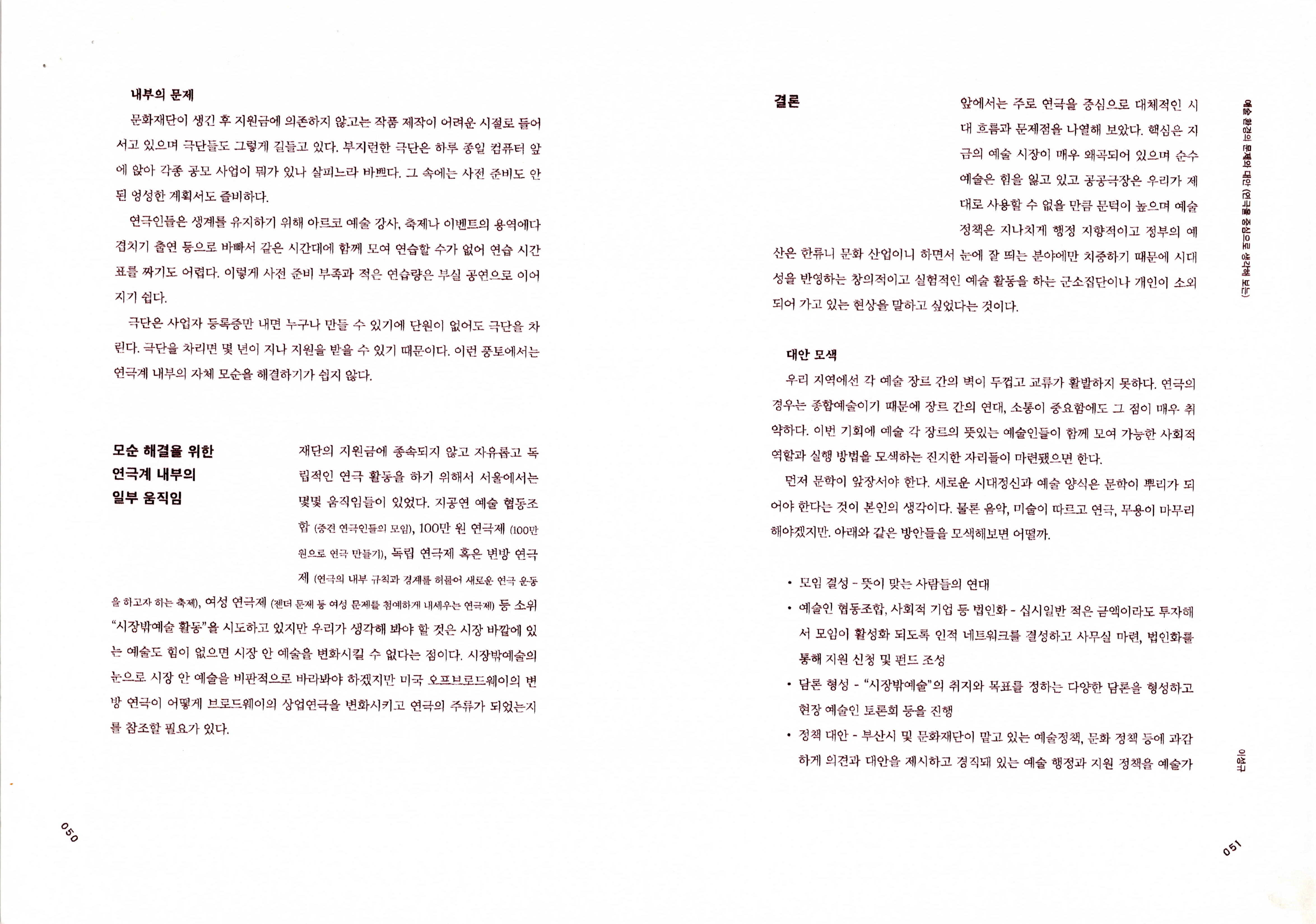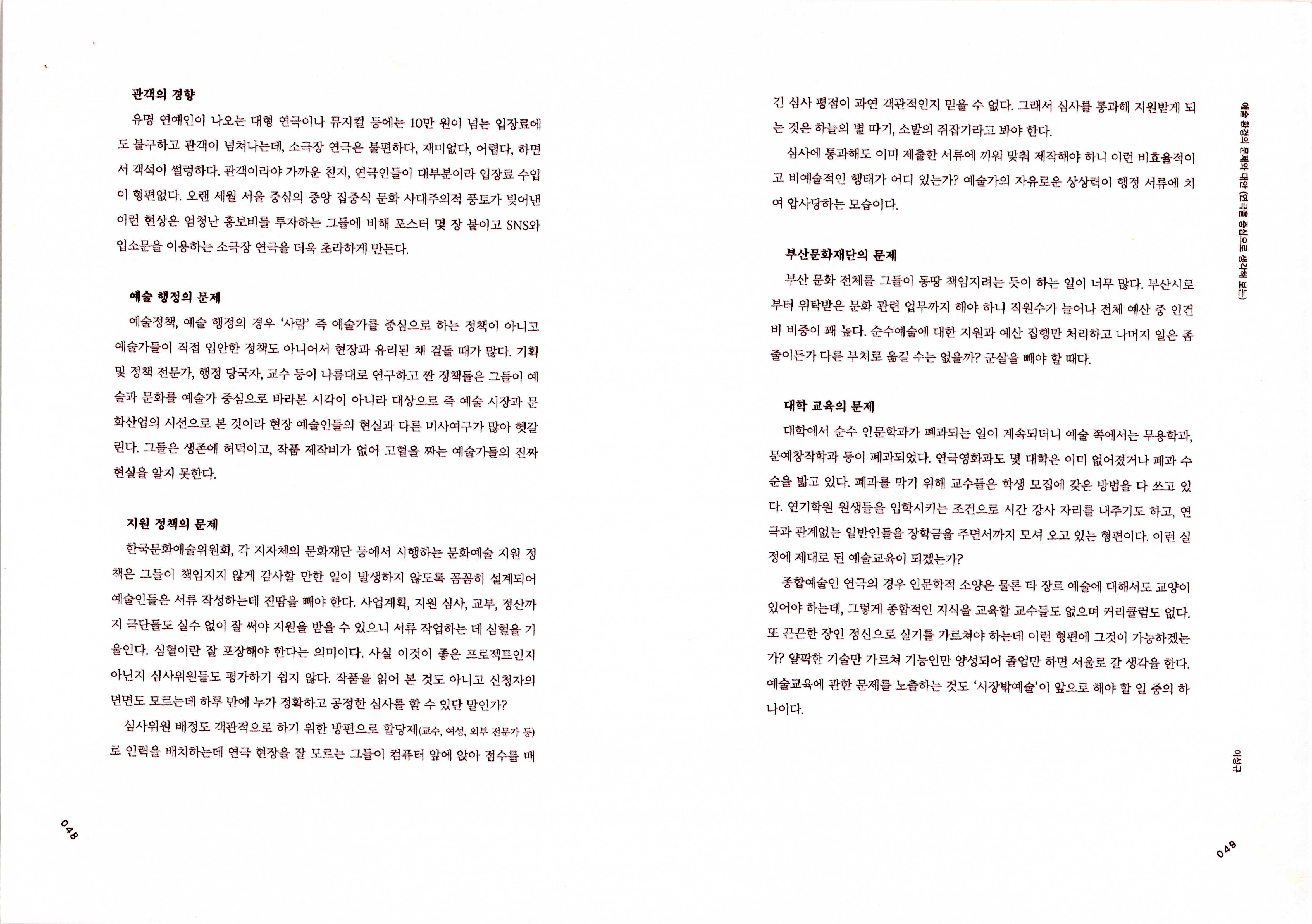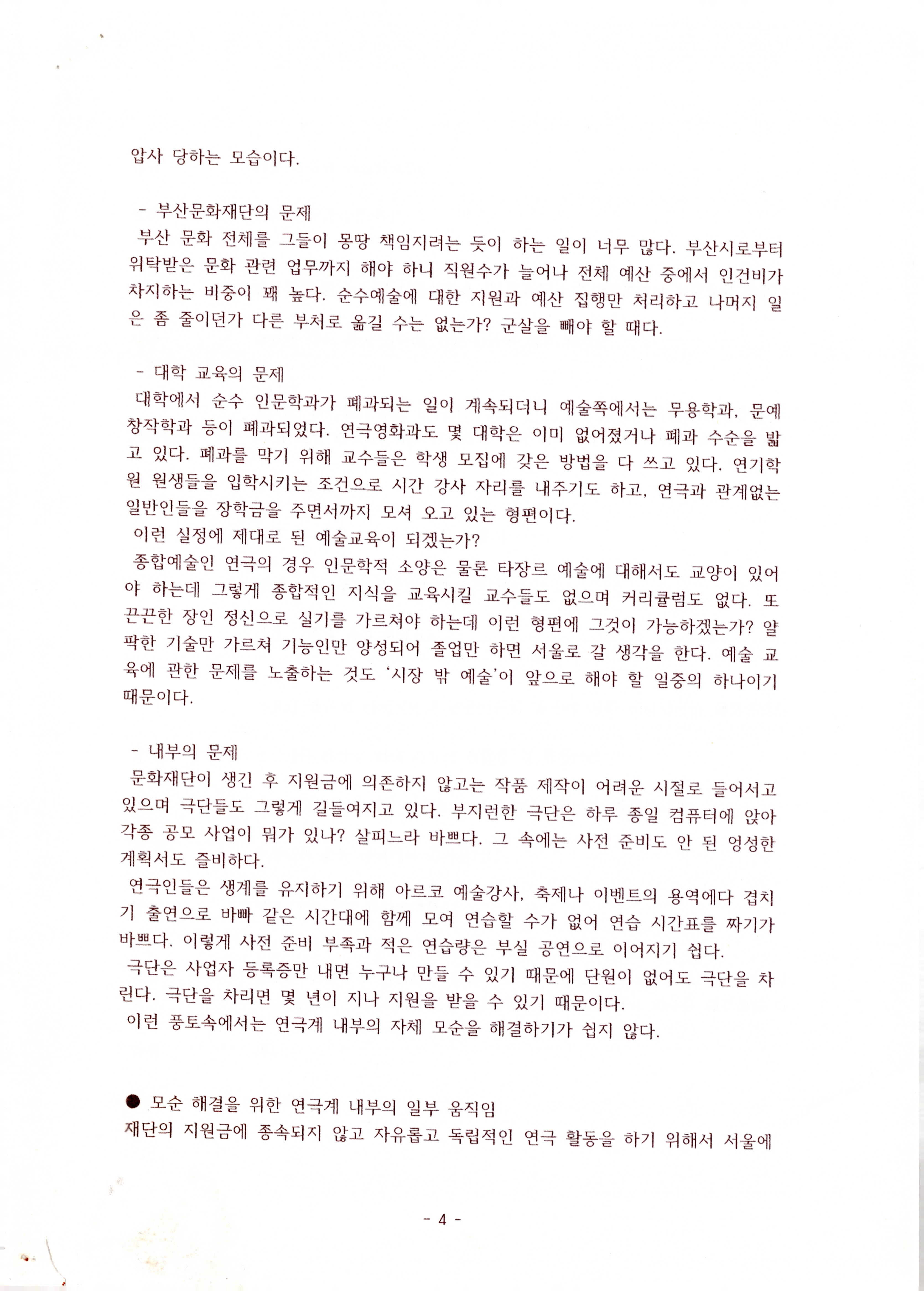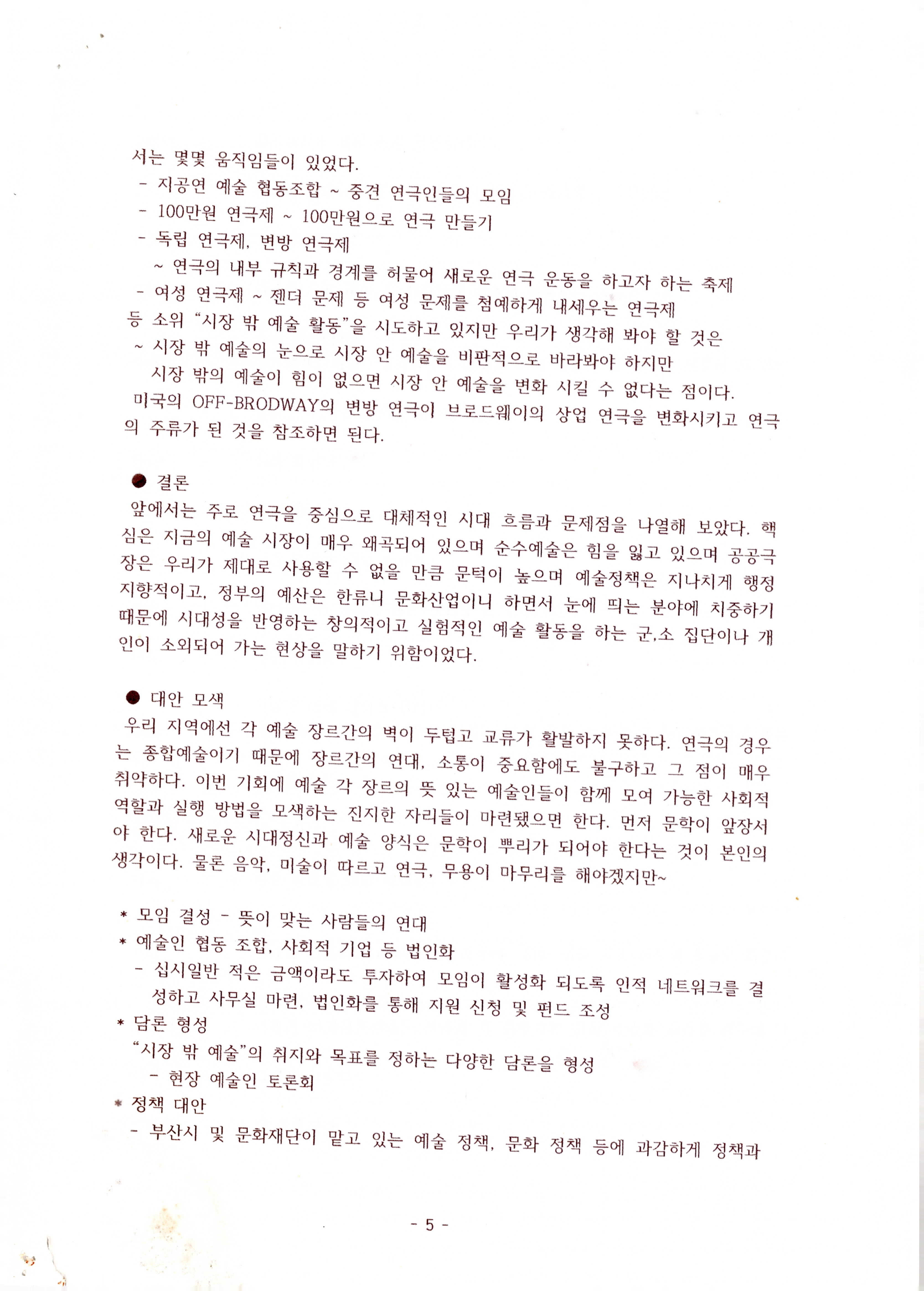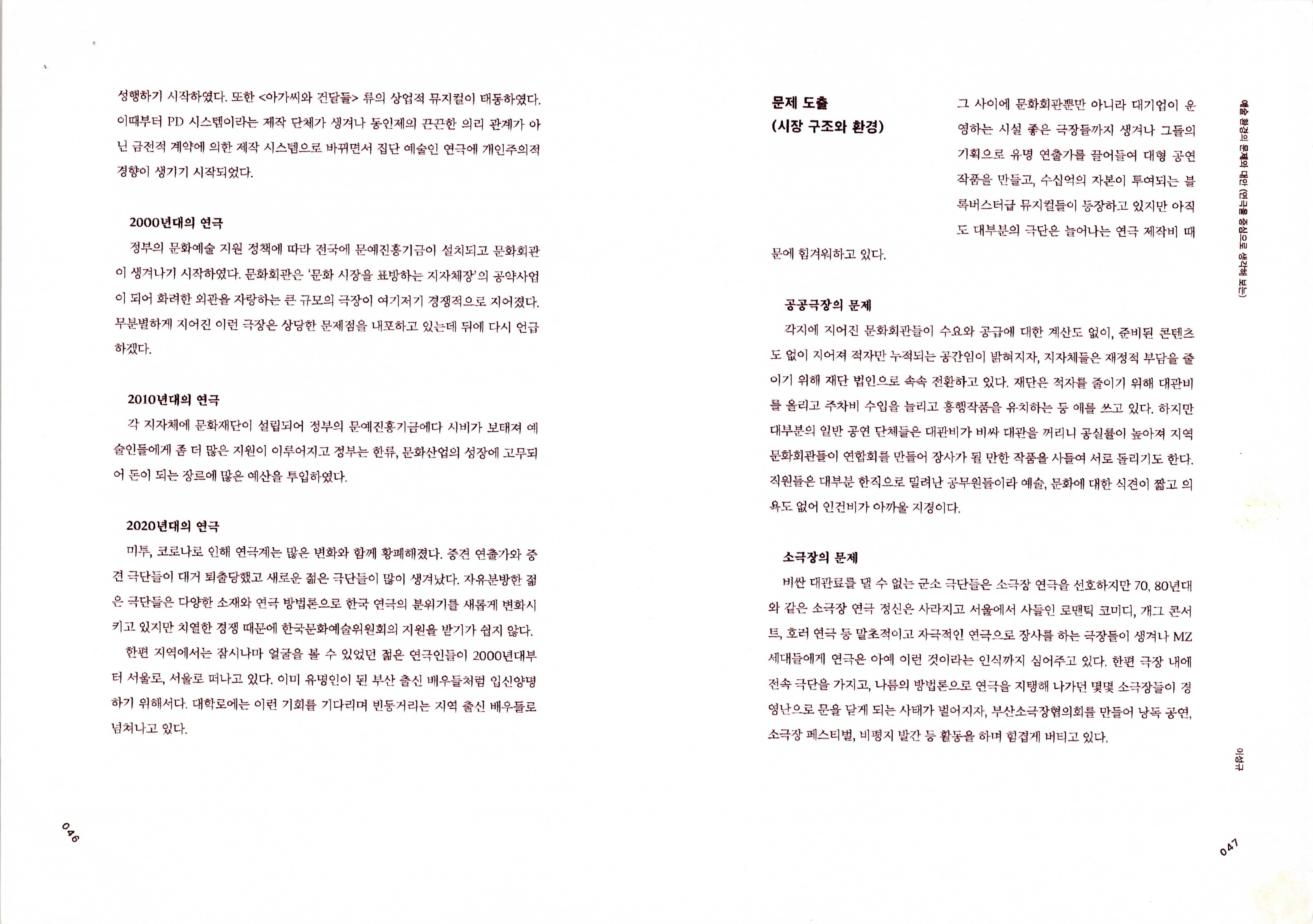 연도미상의 '예술 환경의 문제와 대안(연극을 중심으로 생각해 보는) (이성규 기고)' 논평 발제문의 일부이다. 1970~2020년대 연극에 대한 시대적 흐름, 시장 구조와 환경에 대한 문제 도출, 모순 해결을 위한 연극계 내부의 일부 움직임, 결론 순으로 내용이 기술되어 있다.
