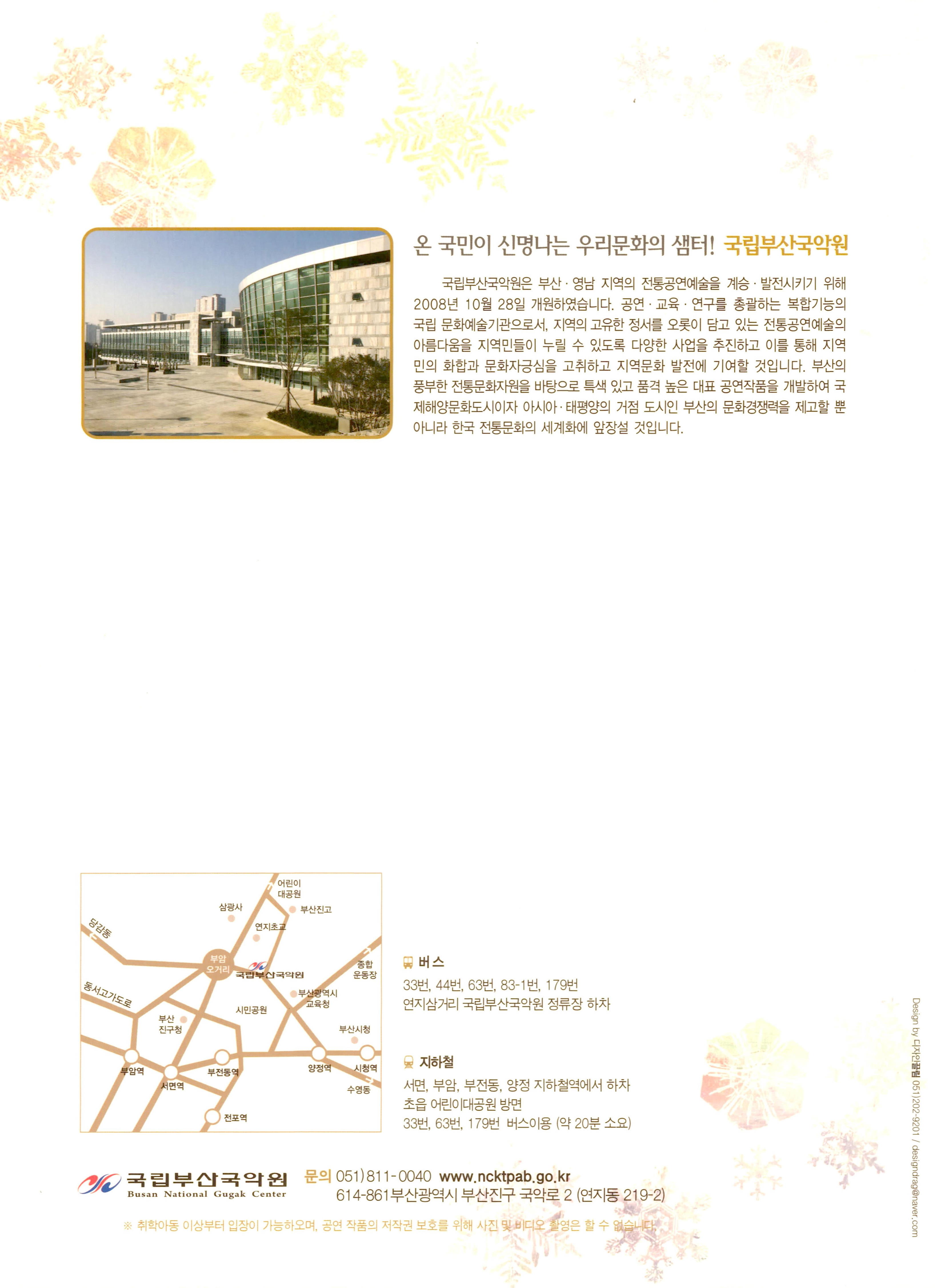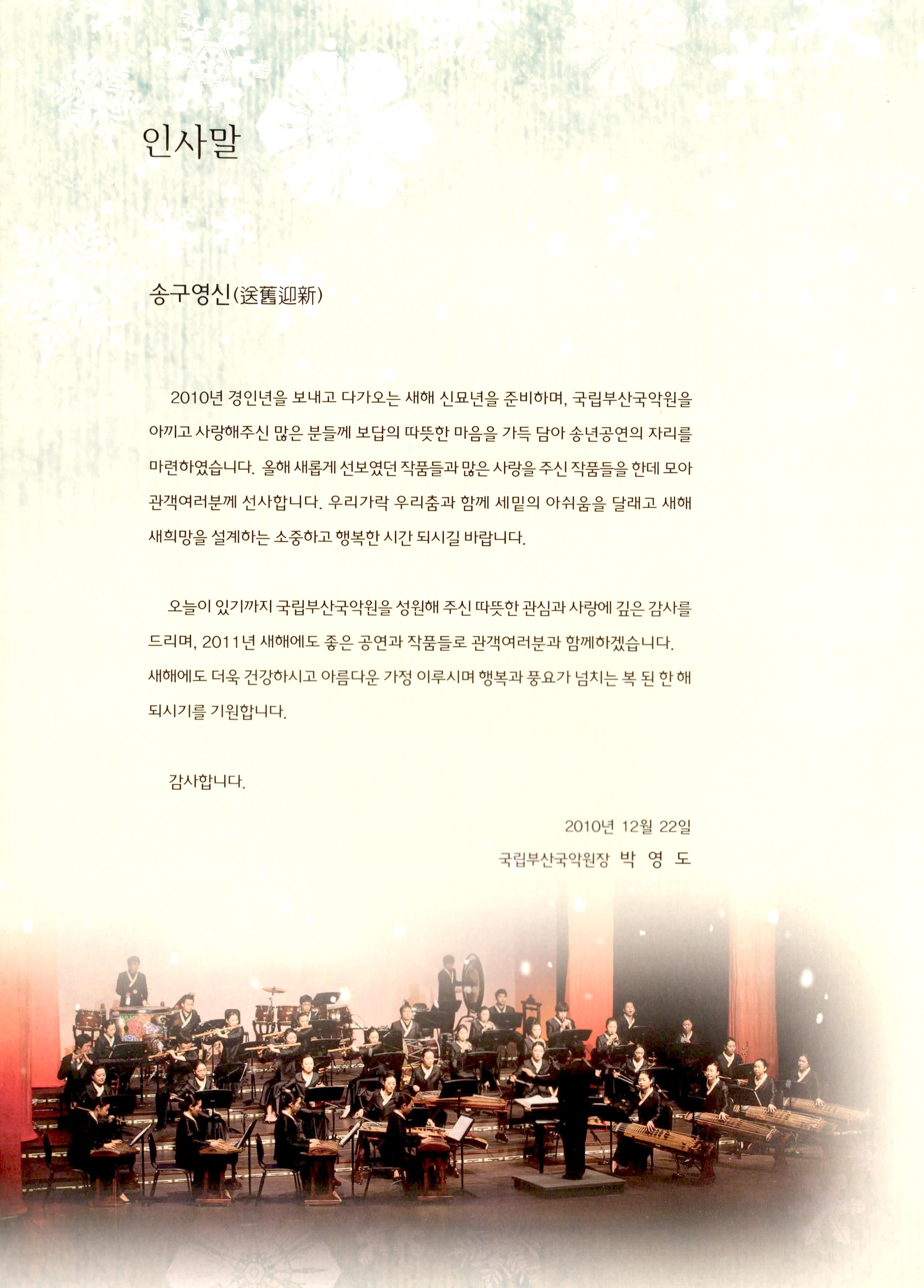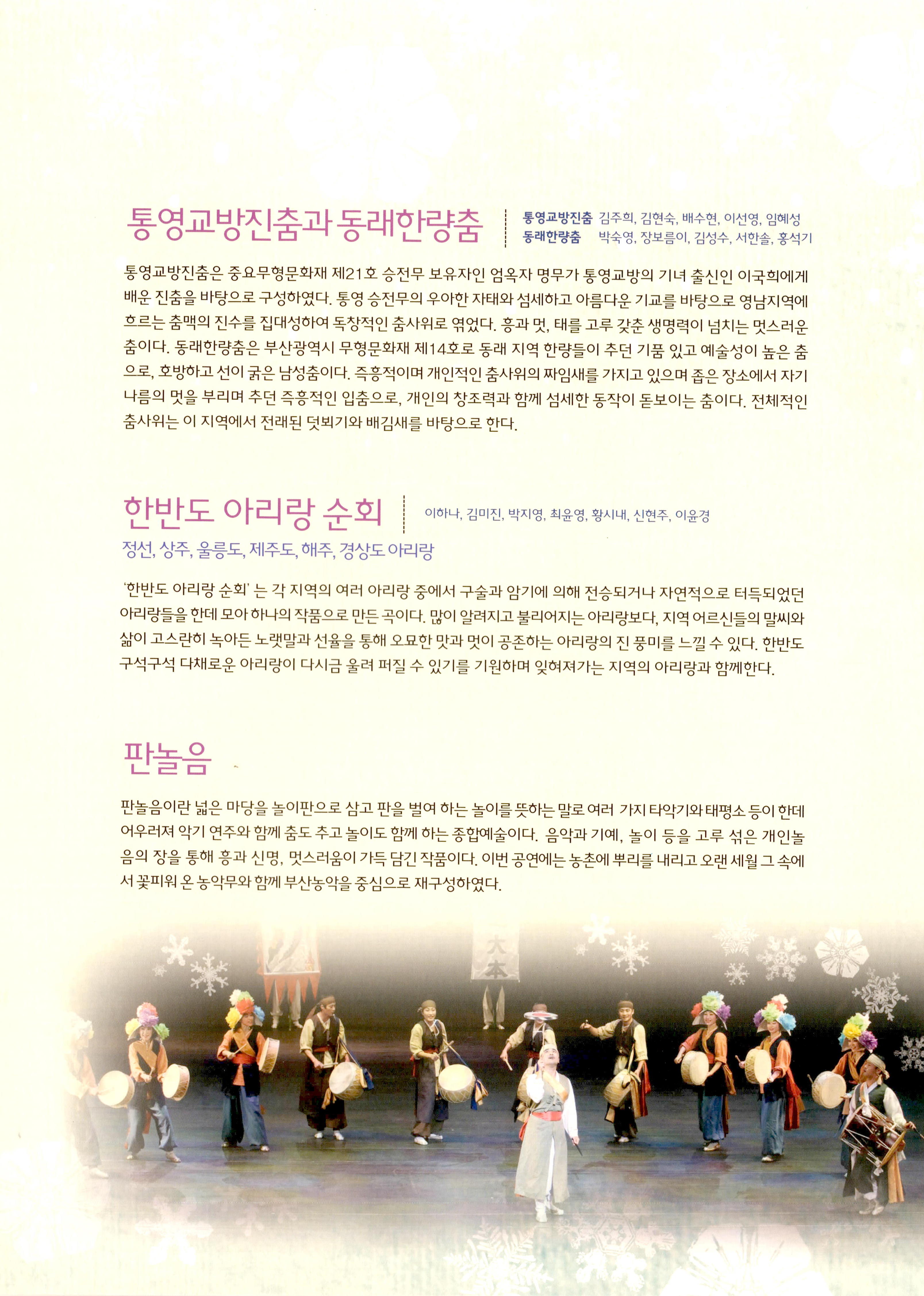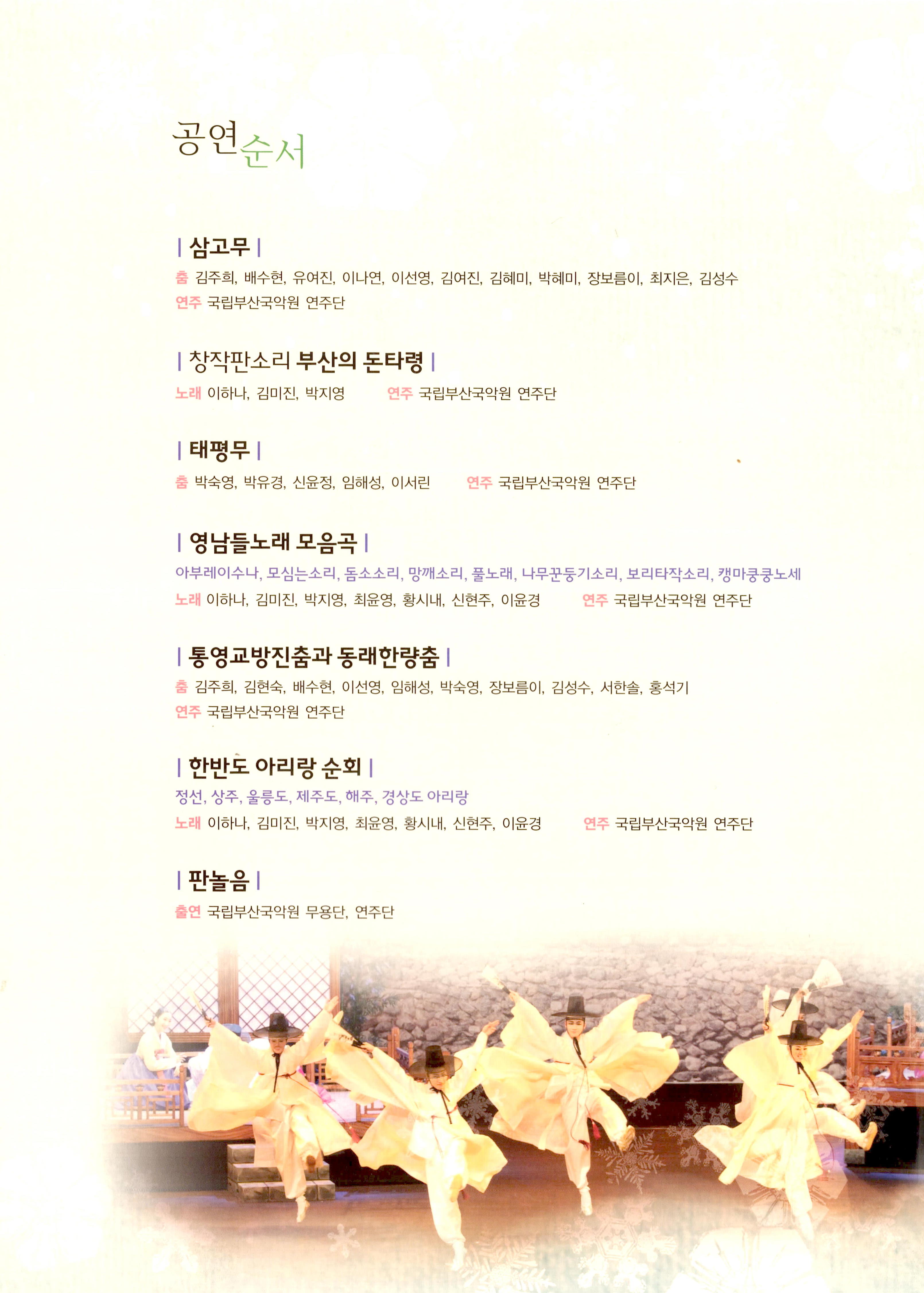 2010년 12월 22일에 국립부산국악원 대극장(연악당)에서 국립부산국악원 무용단, 연주단이 공연한 《국립부산국악원 송년공연 "우리가락 우리춤과 함께하는 마음나눔 음악회"》의 팜플렛이다. 팜플렛의 내용 안에는 국립부산국악원장 '박영도'의 인사말, 공연 작품별 순서와 해설이 기술되어 있다. 추가적으로 국립부산국악원 연주단과 무용단, 행정지원과와 장악과 명단이 기술되어 있으며 국립부산국악원에 대한 소개를 끝으로 팜플렛 구성이 끝난다.