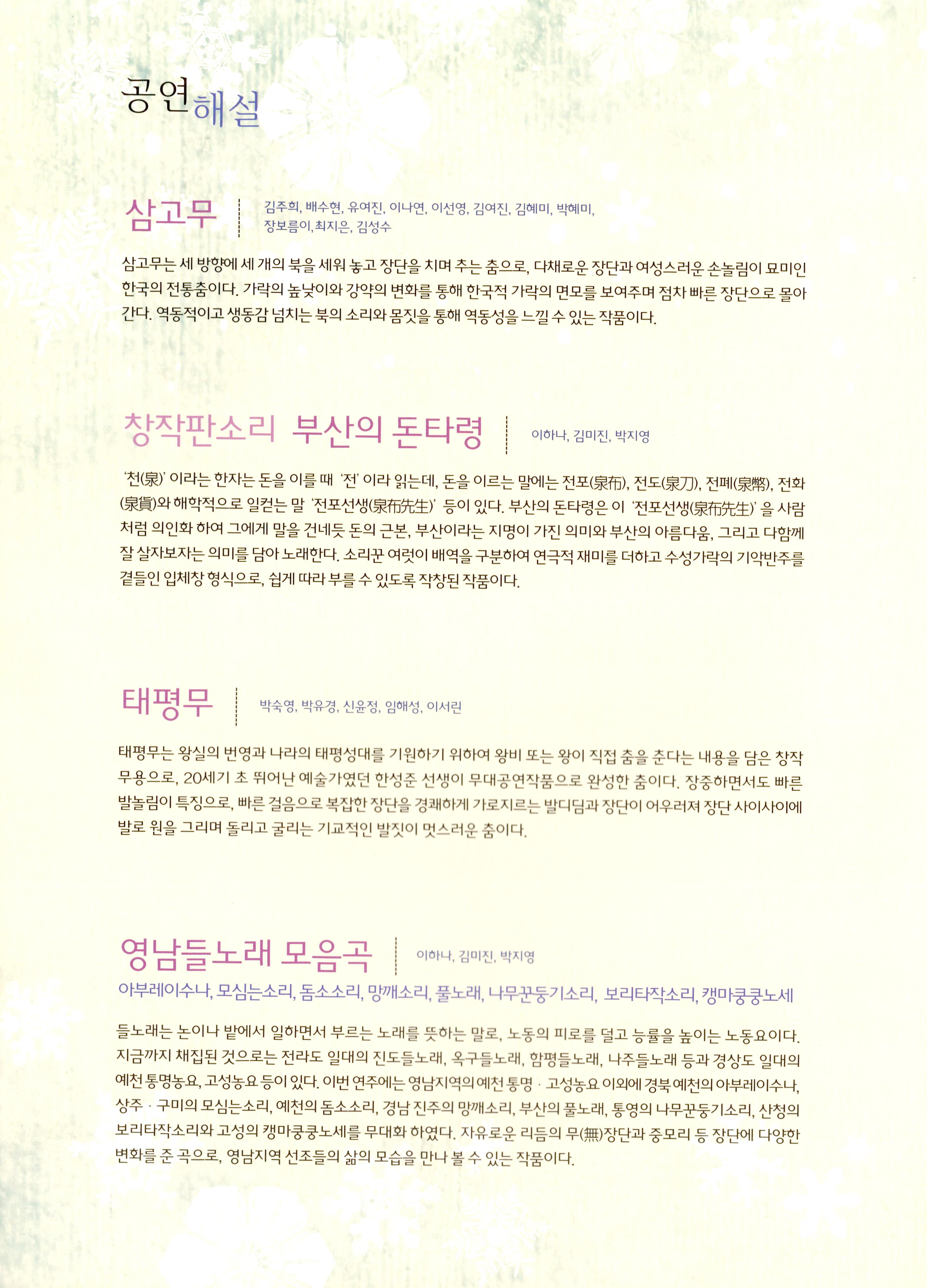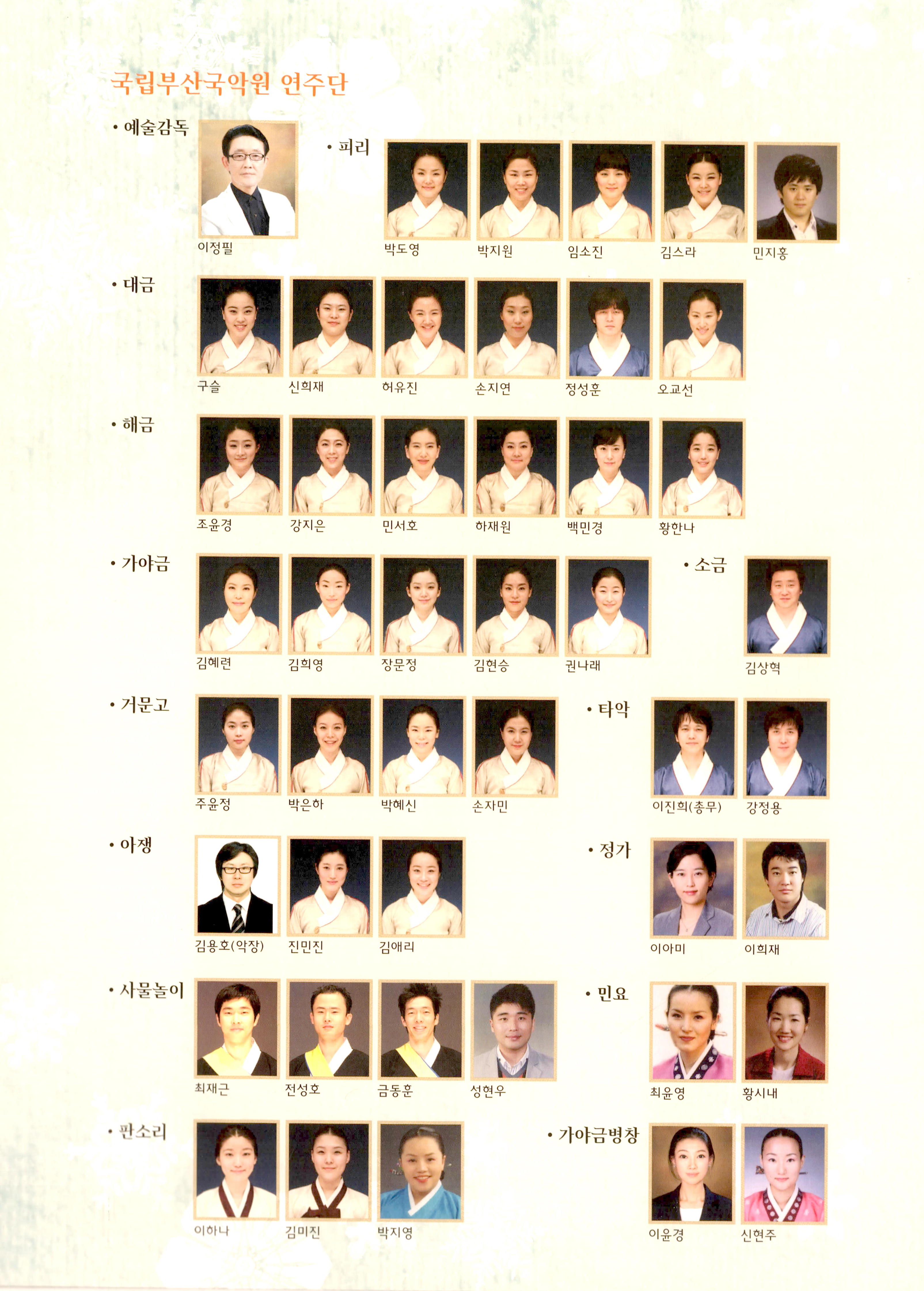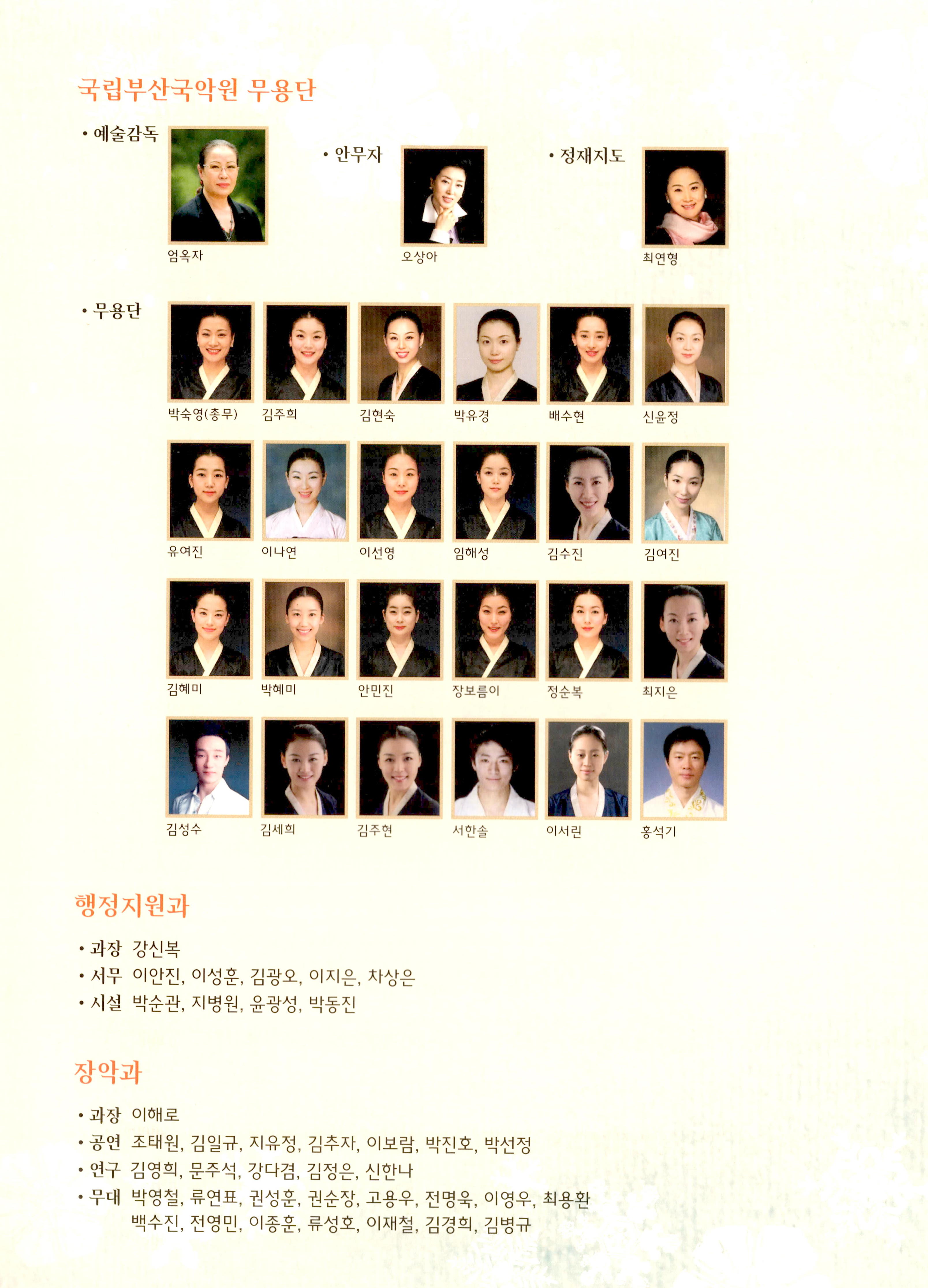 오상아, 최연형, 박숙영, 김주희, 김현숙, 박유경, 배수현, 신윤정, 유여진, 이나연, 이선영, 임해성, 김수진, 김여진, 김혜미, 박혜미, 안미진, 장보름이, 정순복, 최지은, 김성수, 김세희, 김주현, 서한솔, 이서린, 홍석기, 국립부산국악원 연주단 박도영 외 다수