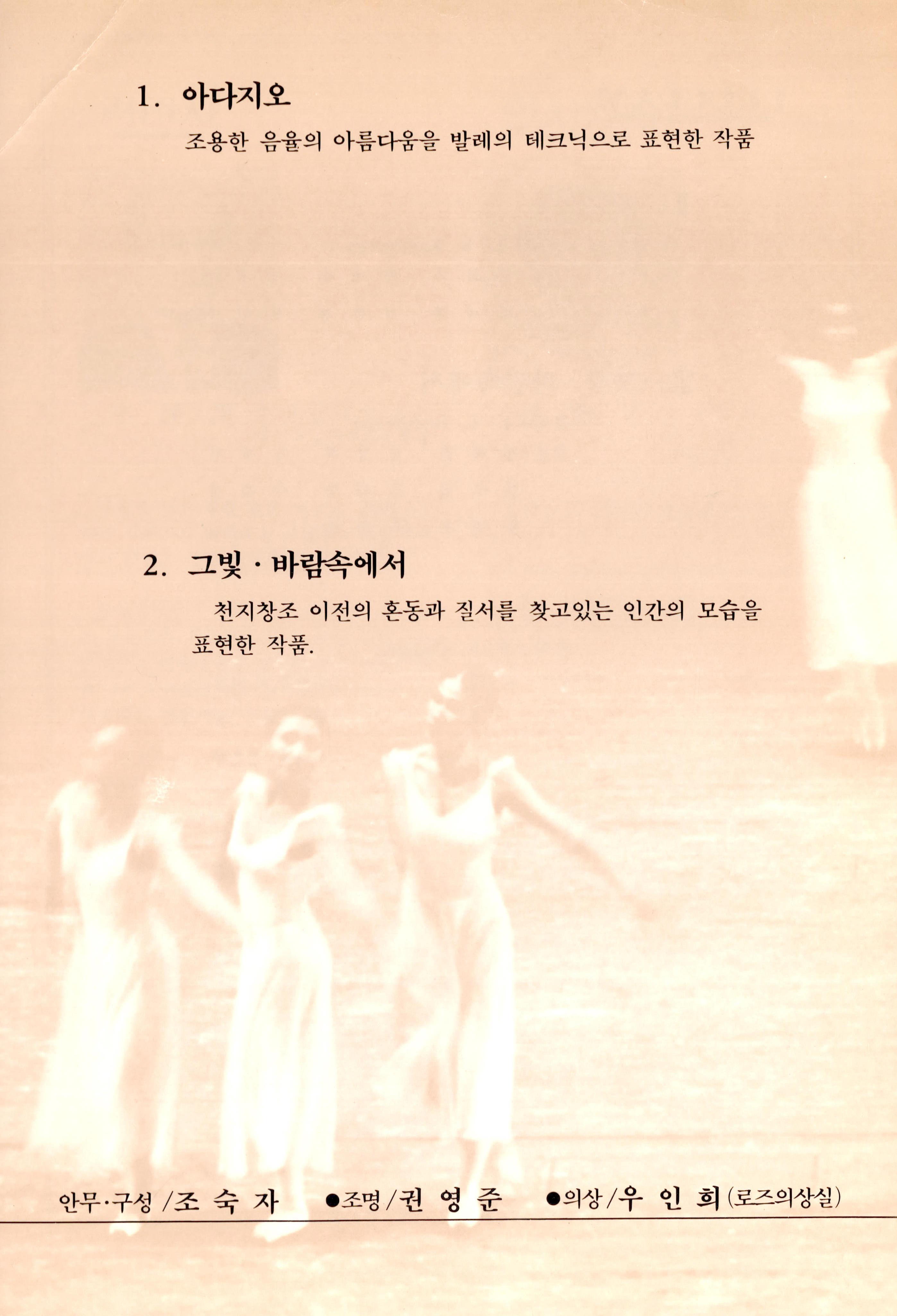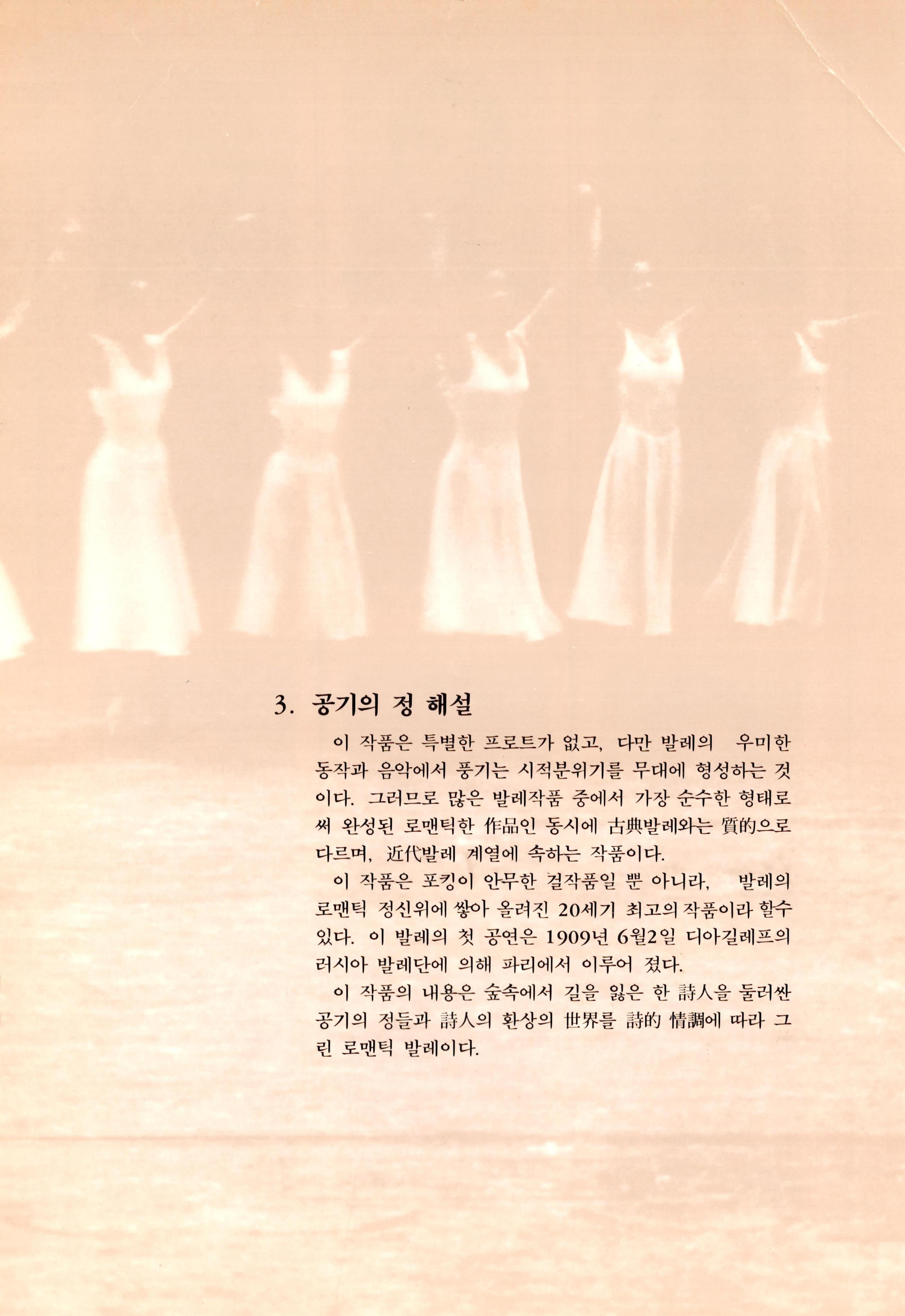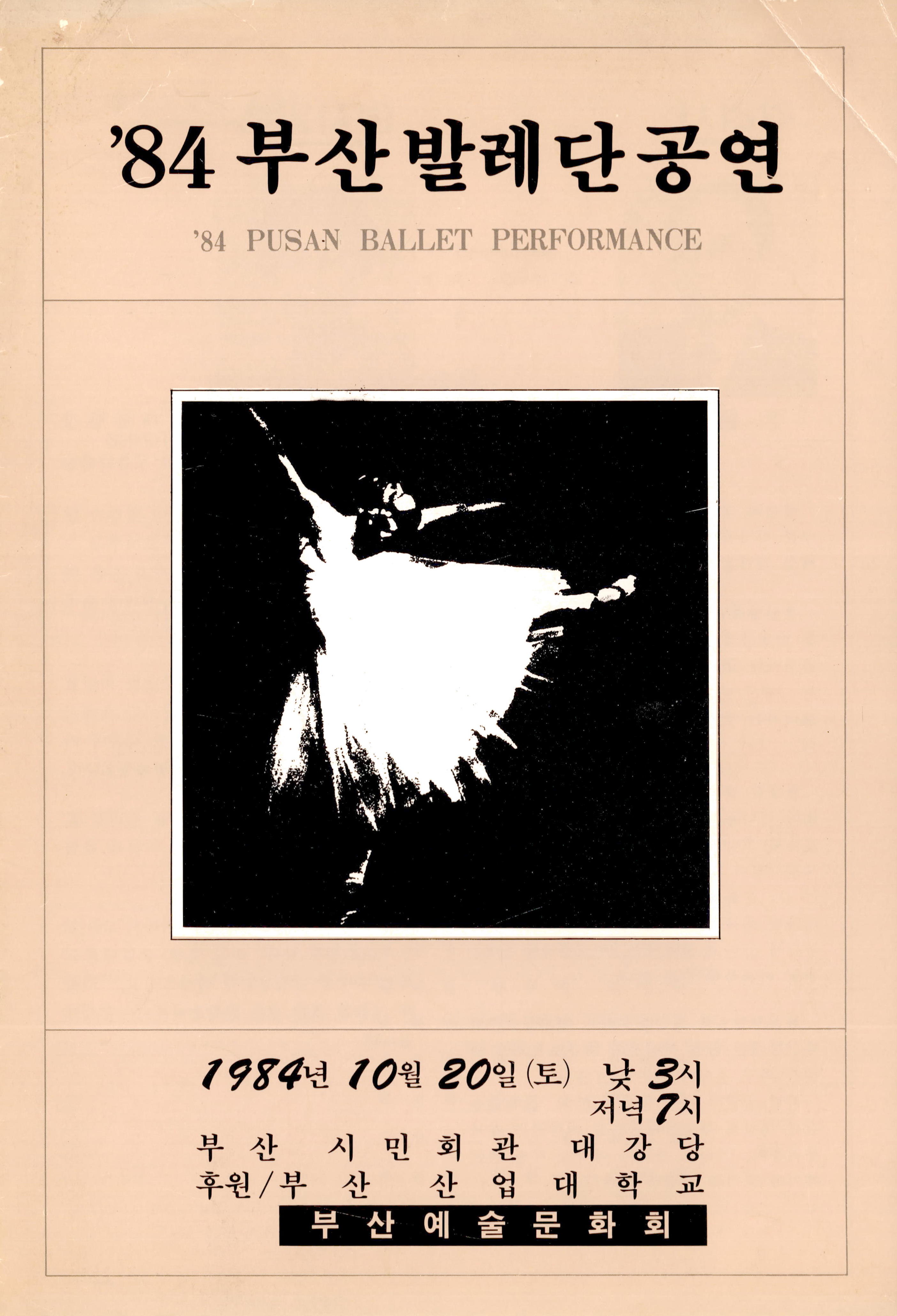1984년 10월 20일 부산시민회관 대강당에서 공연된 《'84 부산발레단 공연》의 팜플렛이다. 부산산업대학교 부총장 이종석의 격려사와 부산발레단단장 조숙자의 인사말씀이 기술되어 있고, 프로그램 안내와 출연진의 이름이 기재되어 있으며, 작품소개글과 출연진의 사진 및 이름 나열을 끝으로 팜플렛 구성이 끝난다.