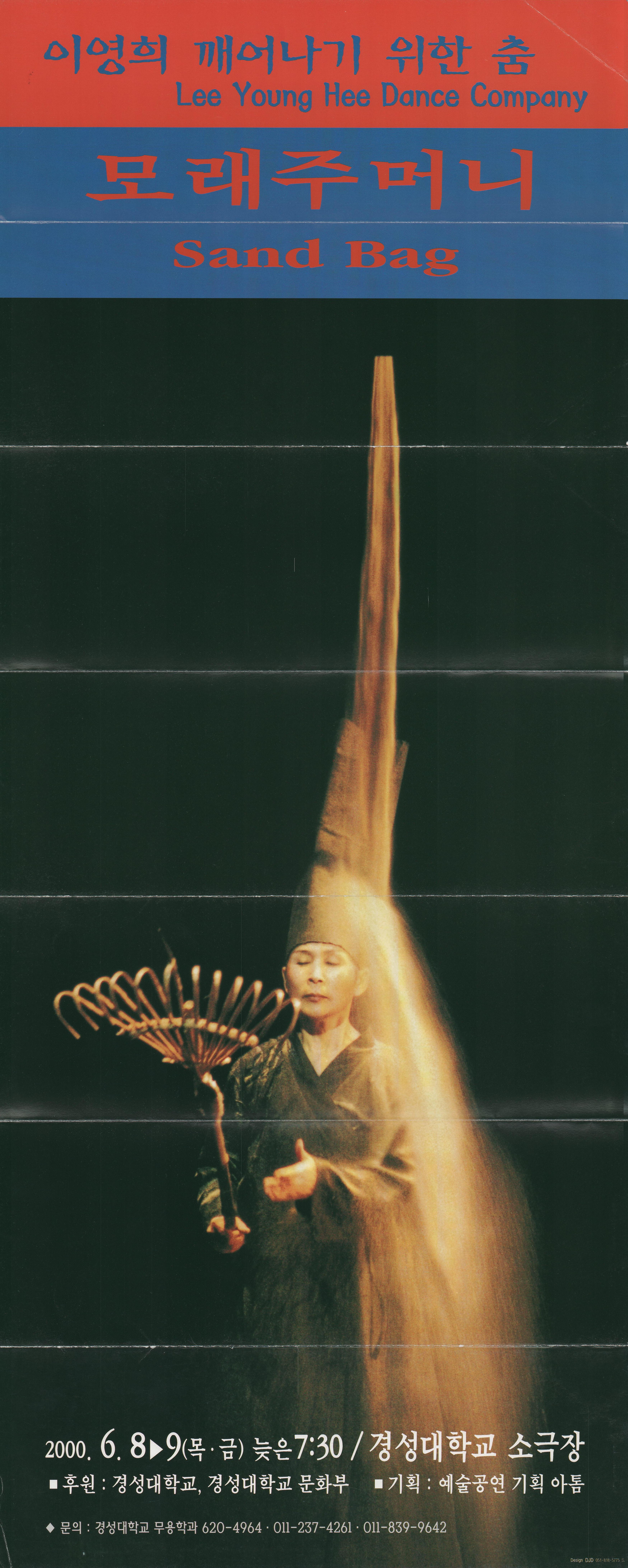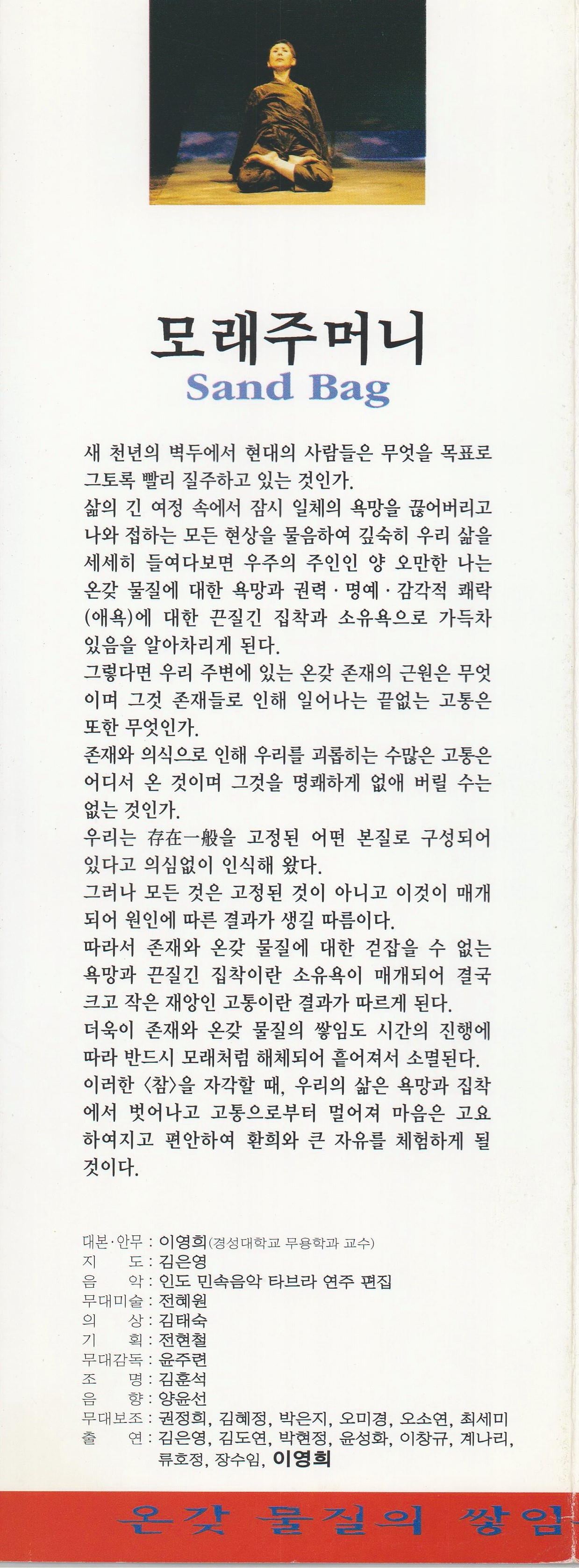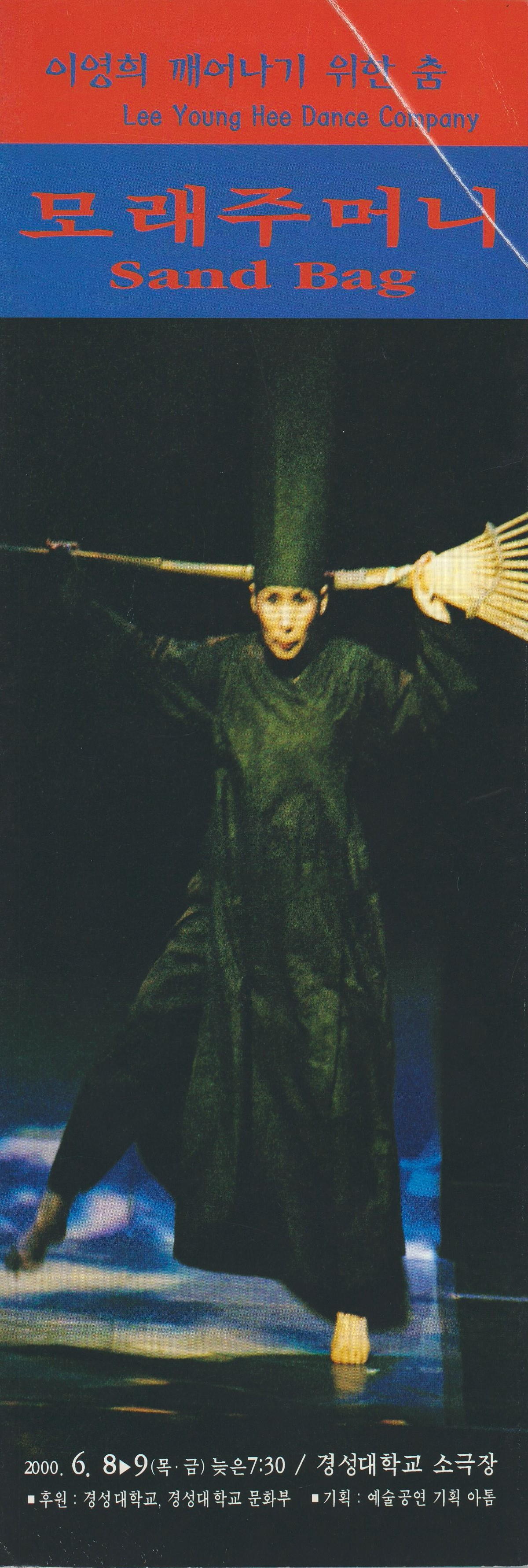 2000년 6월 8일, 9일 양일간 경성대학교 소극장에서 열린 이영희 깨어나기 위한 춤 Lee Young Hee Dance Company 《모래주머니 Sand Bag》 리플렛이다. '모래주머니 Sand Bag' 작품 내용, 이영희의 약력과 약력에 대한 영문 번역을 포함하고 있으며, 출연자의 사진과 명단이 기술되어 있다.