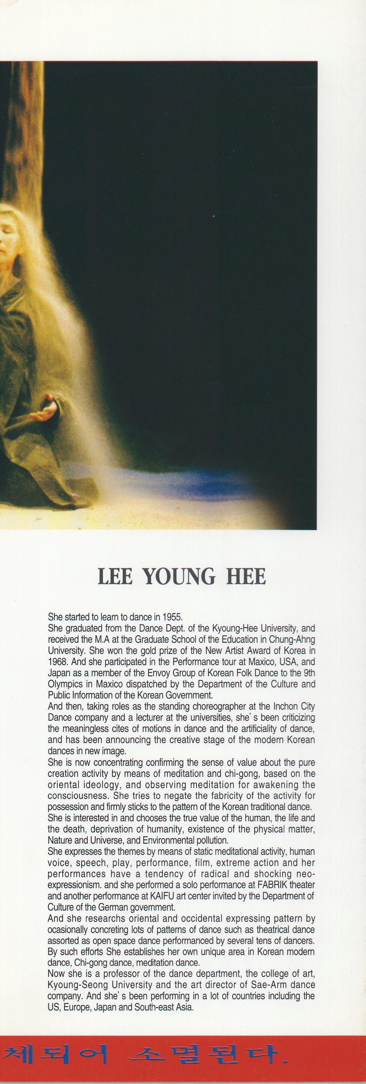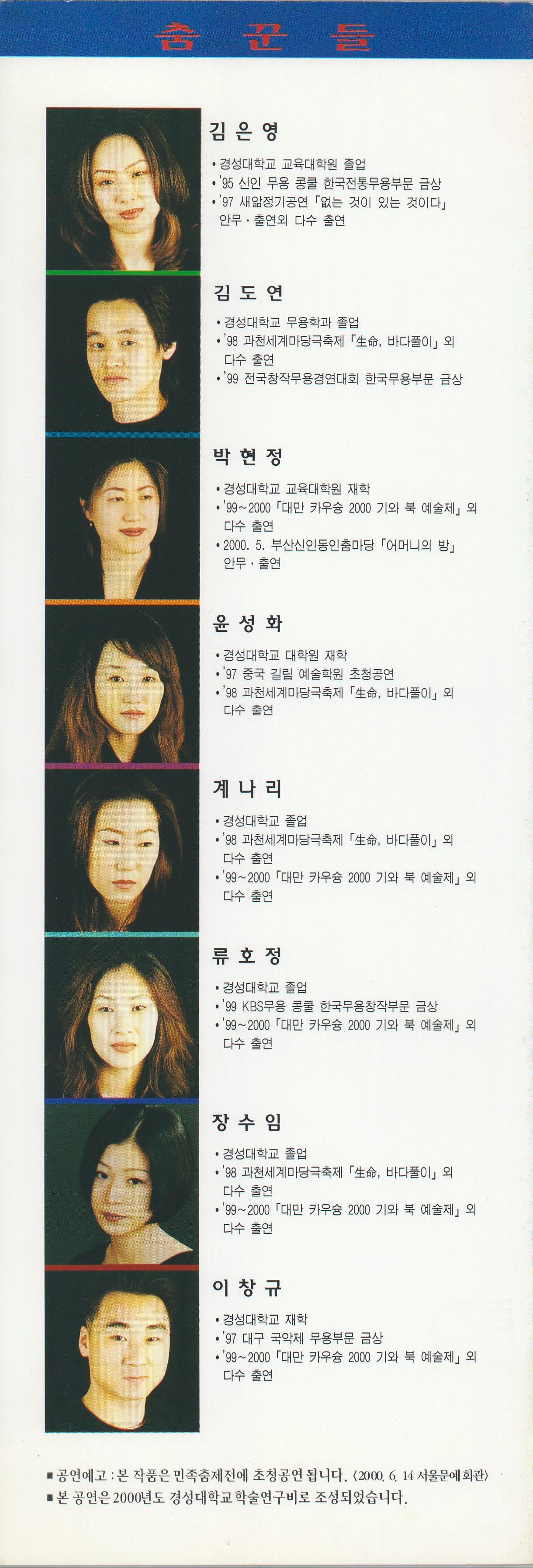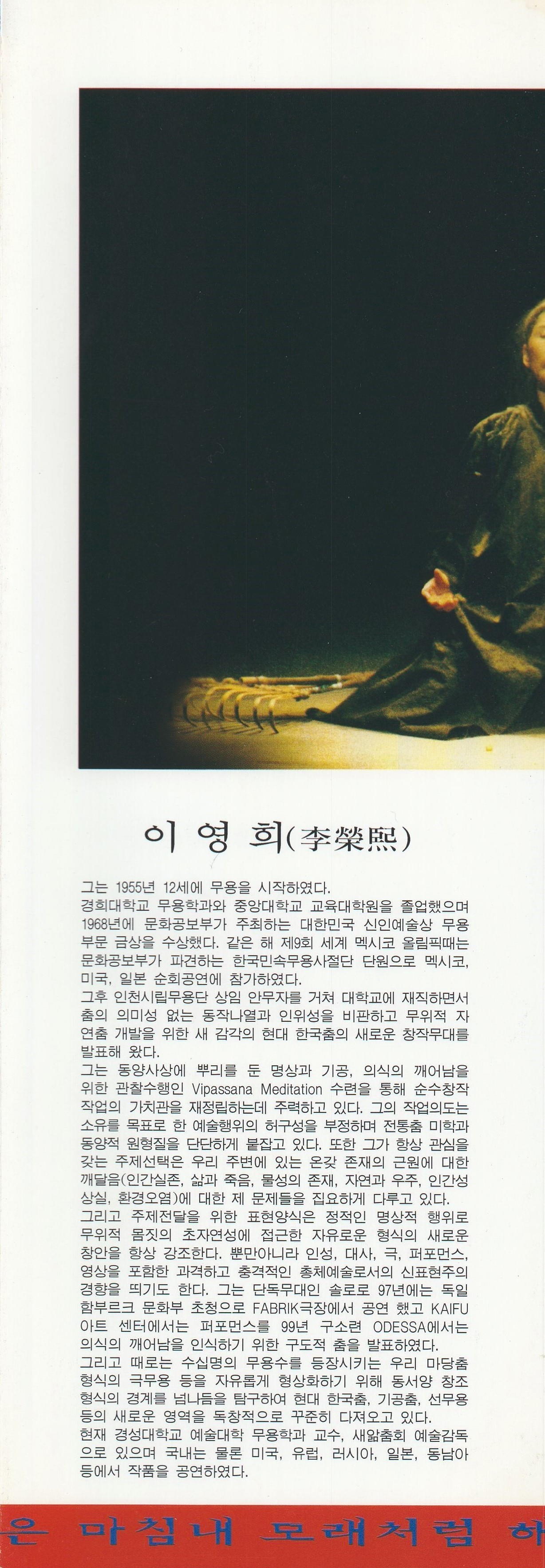 2000년 6월 8일, 9일 양일간 경성대학교 소극장에서 열린 이영희 깨어나기 위한 춤 Lee Young Hee Dance Company 《모래주머니 Sand Bag》 리플렛이다. '모래주머니 Sand Bag' 작품 내용, 이영희의 약력과 약력에 대한 영문 번역을 포함하고 있으며, 출연자의 사진과 명단이 기술되어 있다.