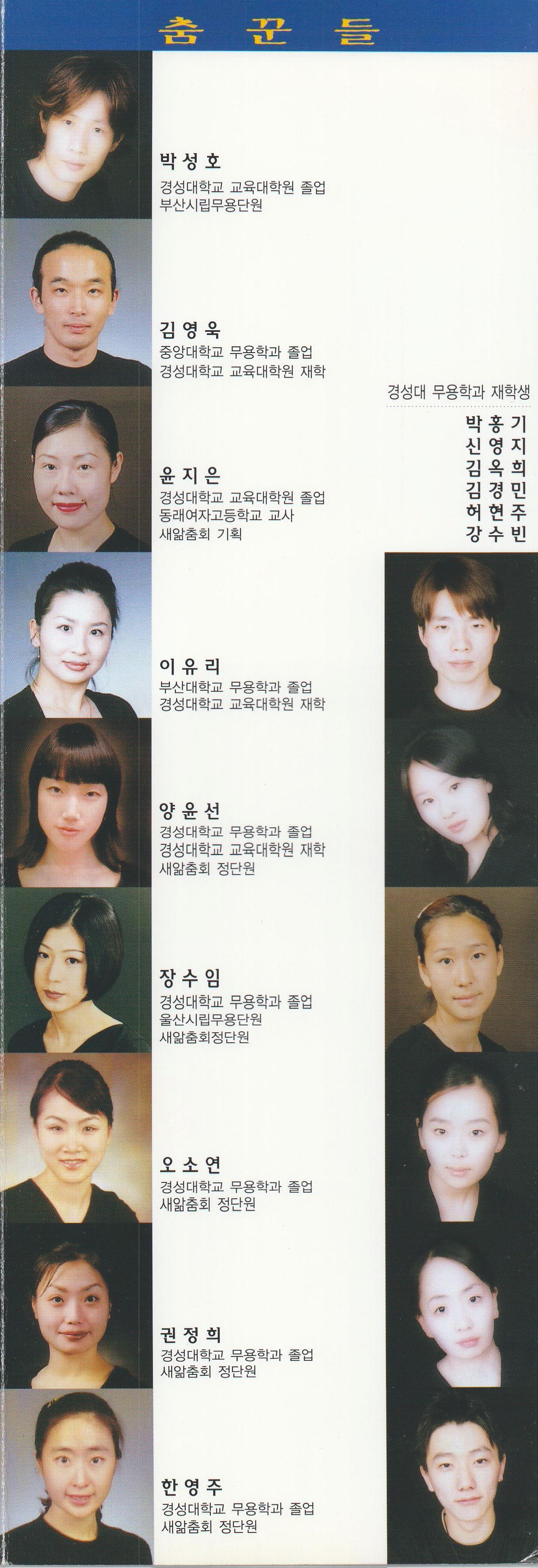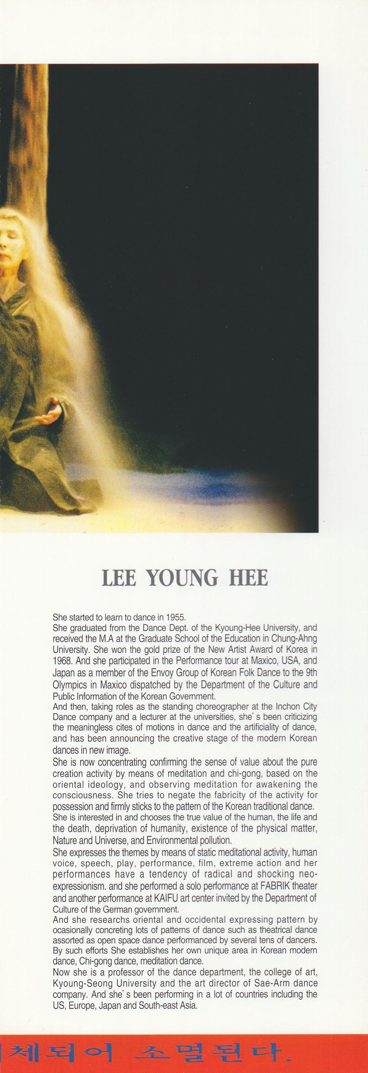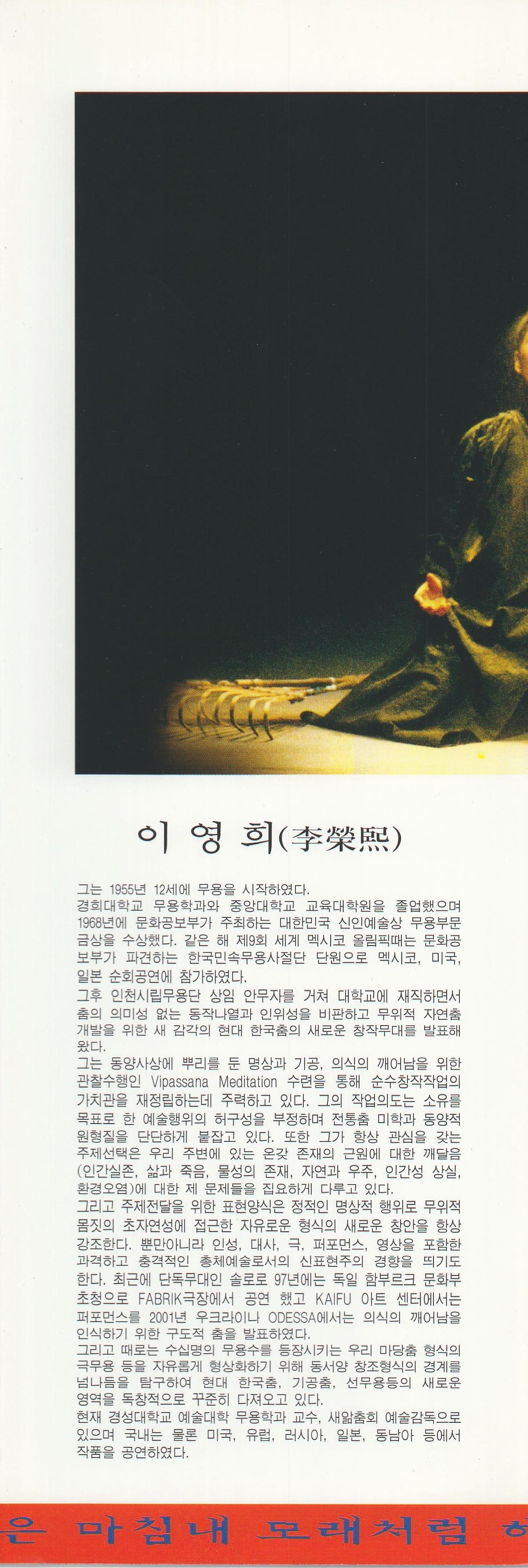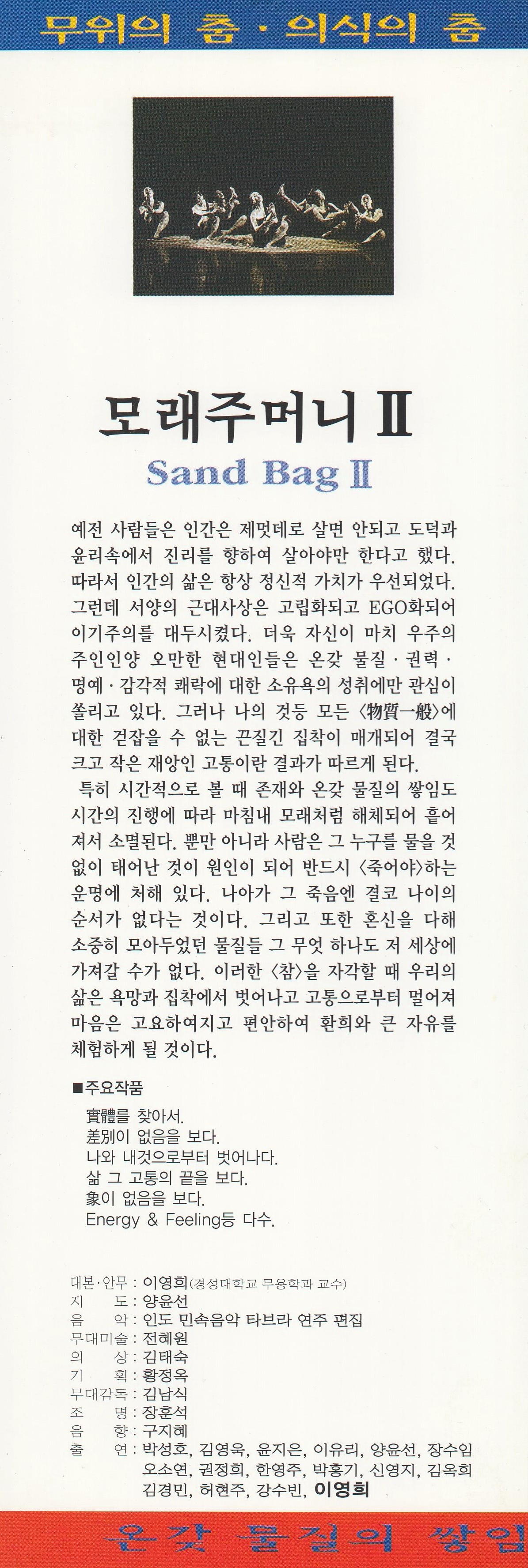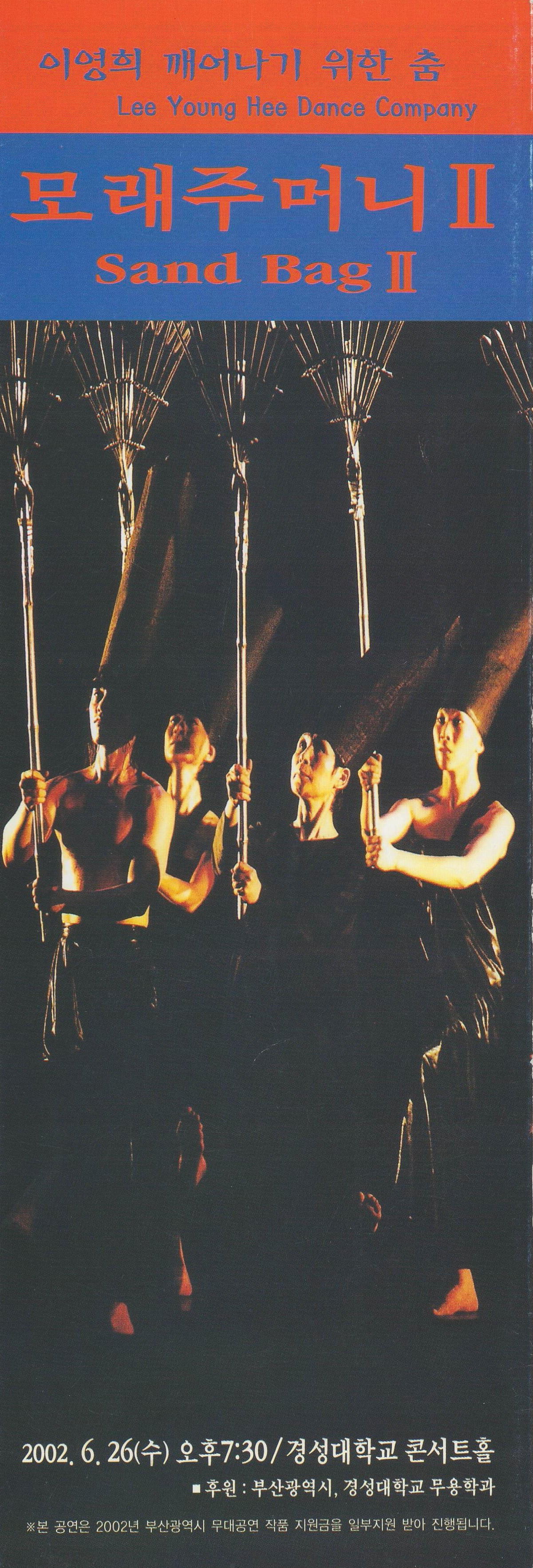(리플렛)2002년 6월 26일 경성대학교 콘서트홀에서 열린 이영희 깨어나기 위한 춤 Lee Young Hee Dance Company 《모래주머니 Ⅱ Sand Bag Ⅱ》 리플렛이다. '모래주머니Ⅱ'의 작품 내용, 이영희의 약력 및 약력에 대한 영문 번역을 포함하고 있으며, 출연자의 사진과 명단이 기술되어 있다.