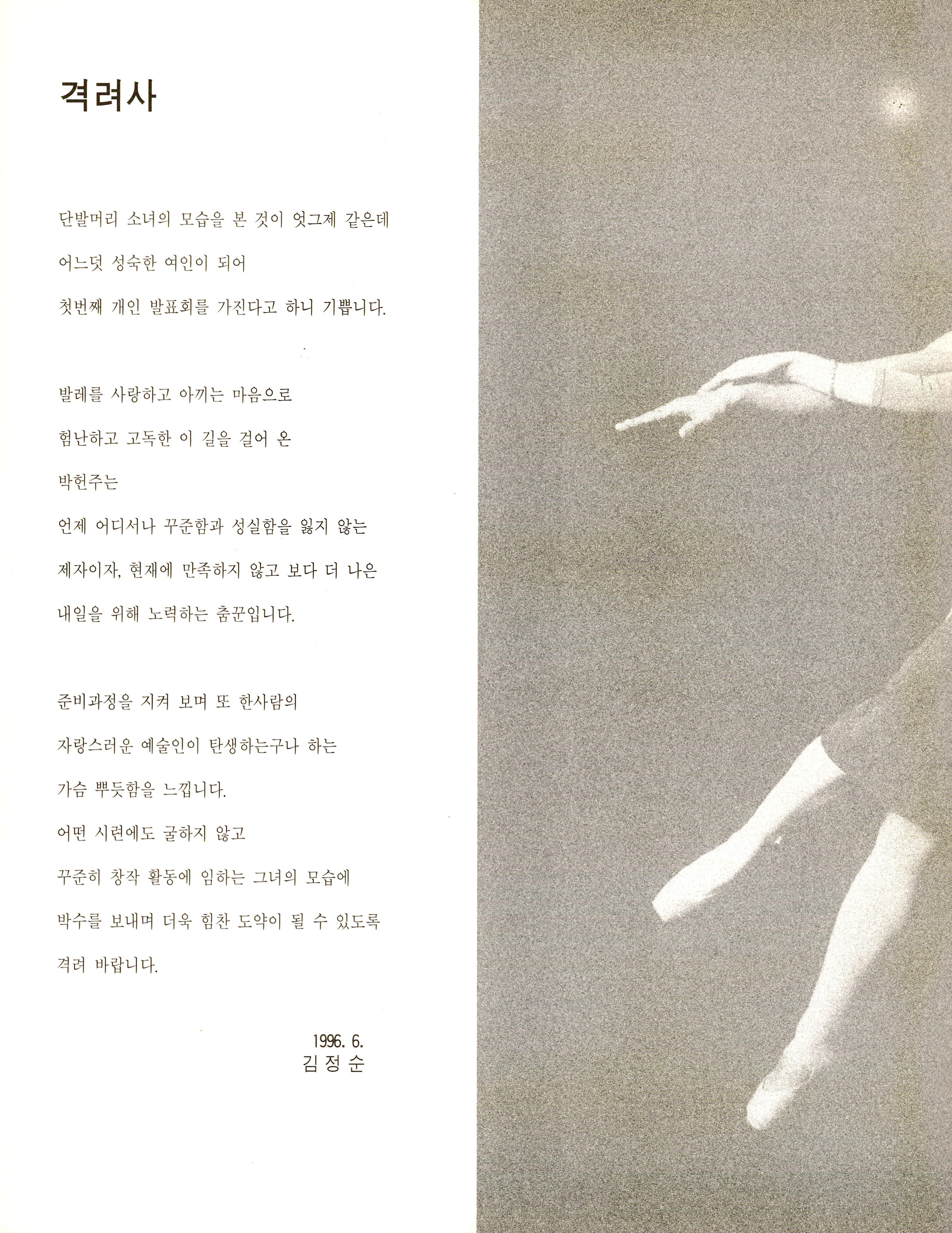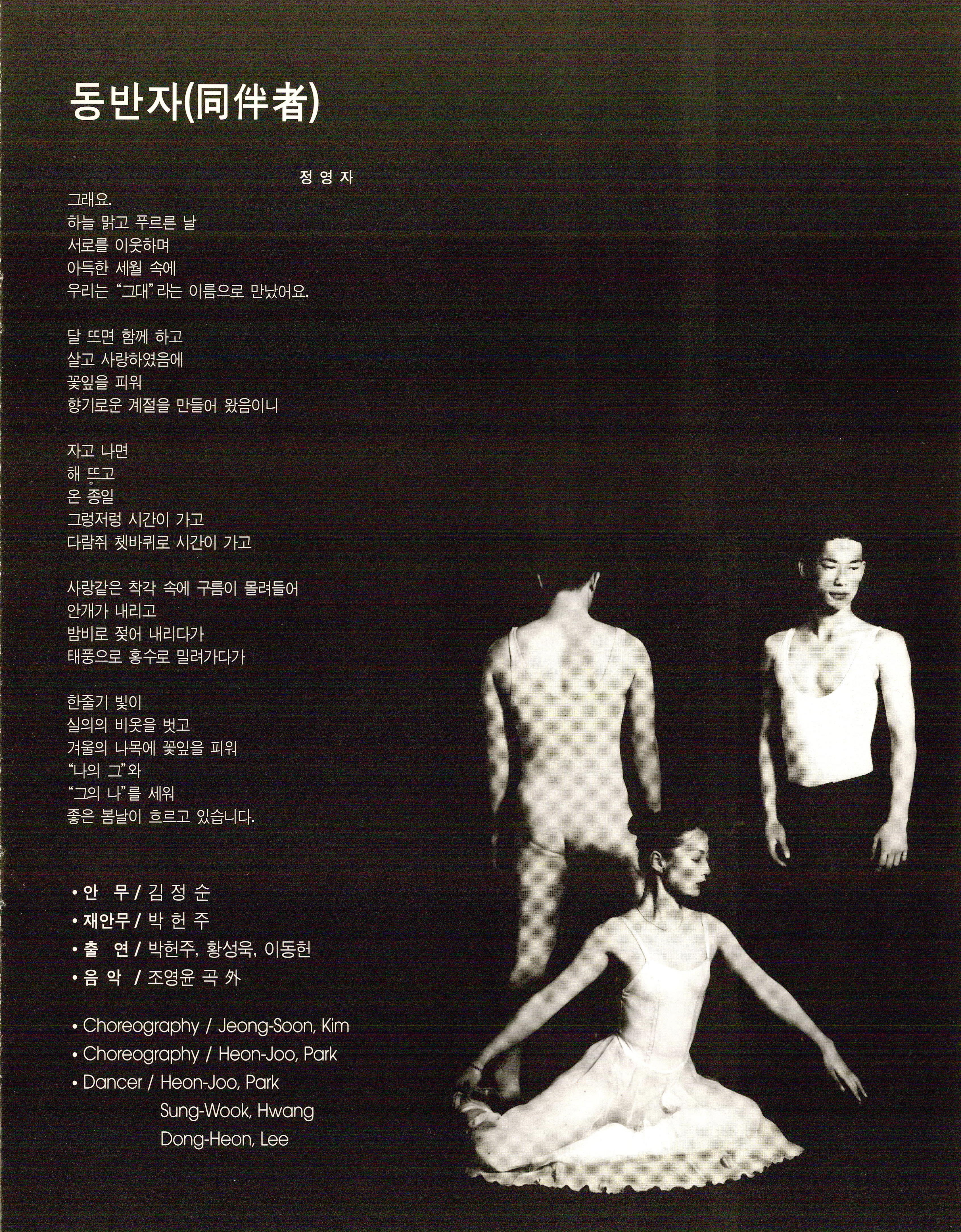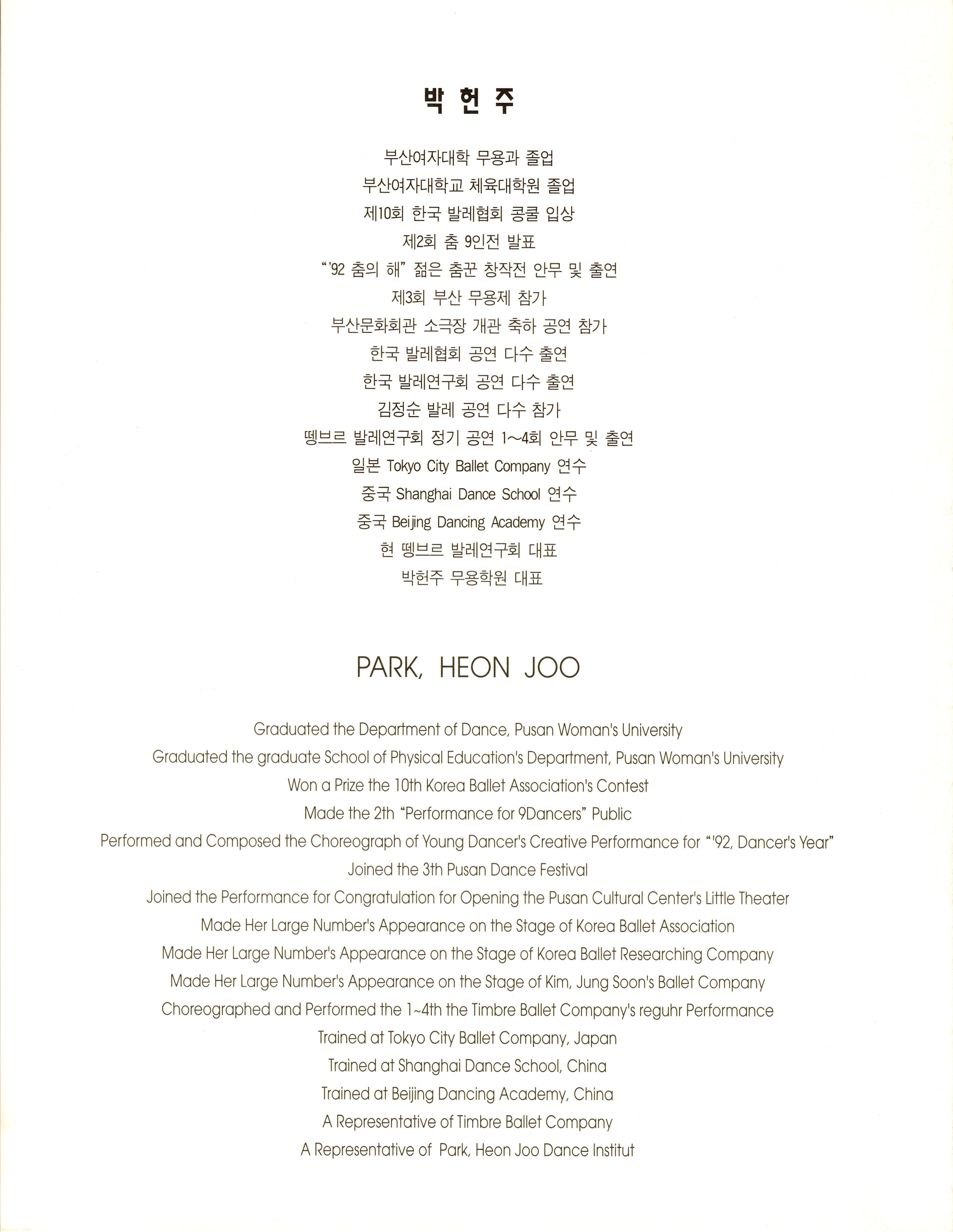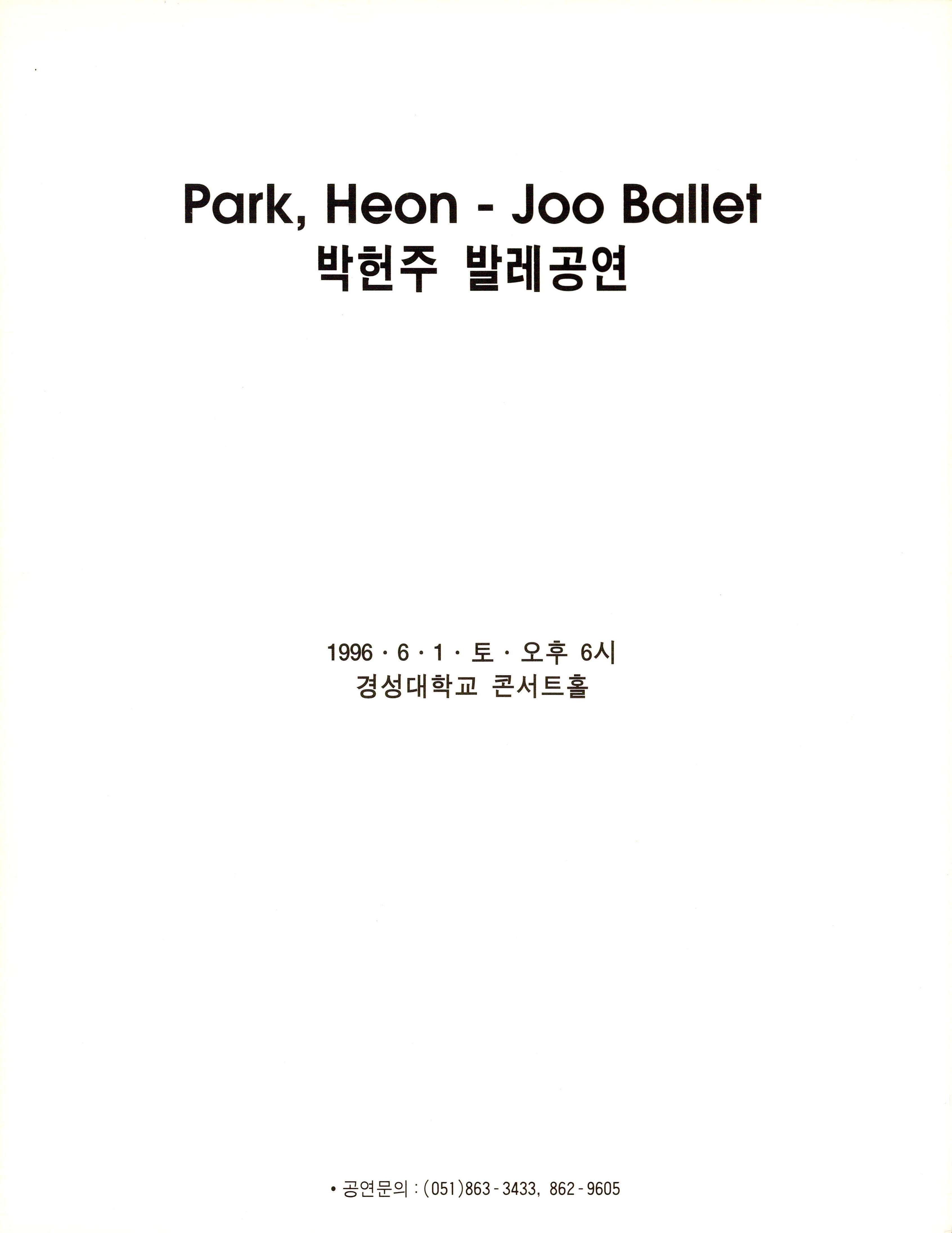 (팜플렛)1996년 6월 1일에 경성대학교 콘서트홀에서 박헌주가 공연한 《박헌주 발레공연(Park, Heon-Joo Ballet)》의 팜플렛이다. 팜플렛의 내용 안에는 예술감독 '김정순'의 격려사와 박헌주의 인사말, 작품공연으로 '4인무', '동반자(同伴者)', '도심의 하루'의 줄거리 및 안무의도가 기술되어 있으며 출연자 및 제작진의 사진·명단도 함께 기술되어 있다. 추가적으로 박헌주의 프로필을 끝으로 팜플렛 구성이 끝난다.