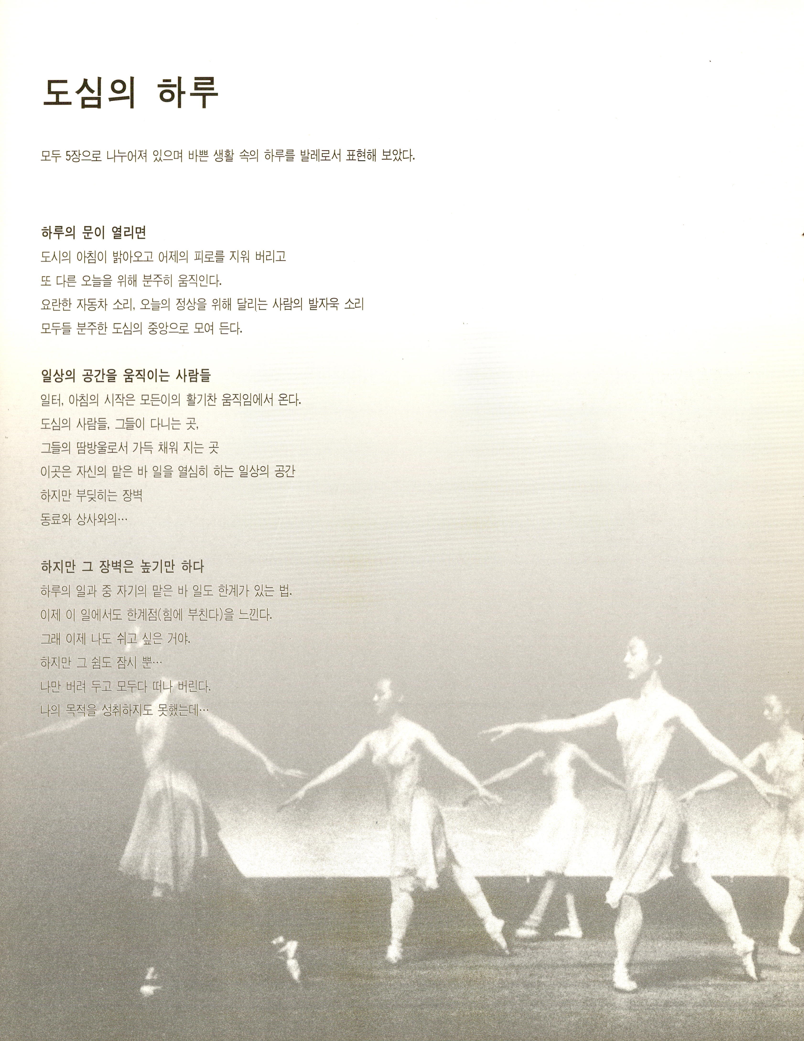 도심의 하루 : 모두 5장으로 나누어져 있다. 늦은 사회생활을 시작한 한 셀러리맨이 느낀 사회의 낙후와 좌절감, 절망을 표현했을 뿐만 아니라 희망 찬 미래도 열려있다는 의미를 발레로 표현하고자 한다.
