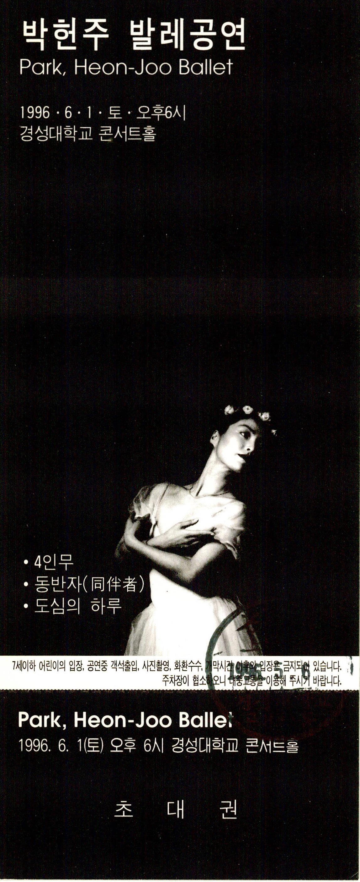 (초대권)1996년 6월 1일에 경성대학교 콘서트홀에서 박헌주가 공연한 《박헌주 발레공연(Park, Heon-Joo Ballet)》의 초대권이다. 초대권의 내용에는 공연일시, 장소, 작품공연으로 '4인무', '동반자(同伴者)', '도심의 하루'의 제목이 기술되어 있으며 유의사항이 기술되어 있다.