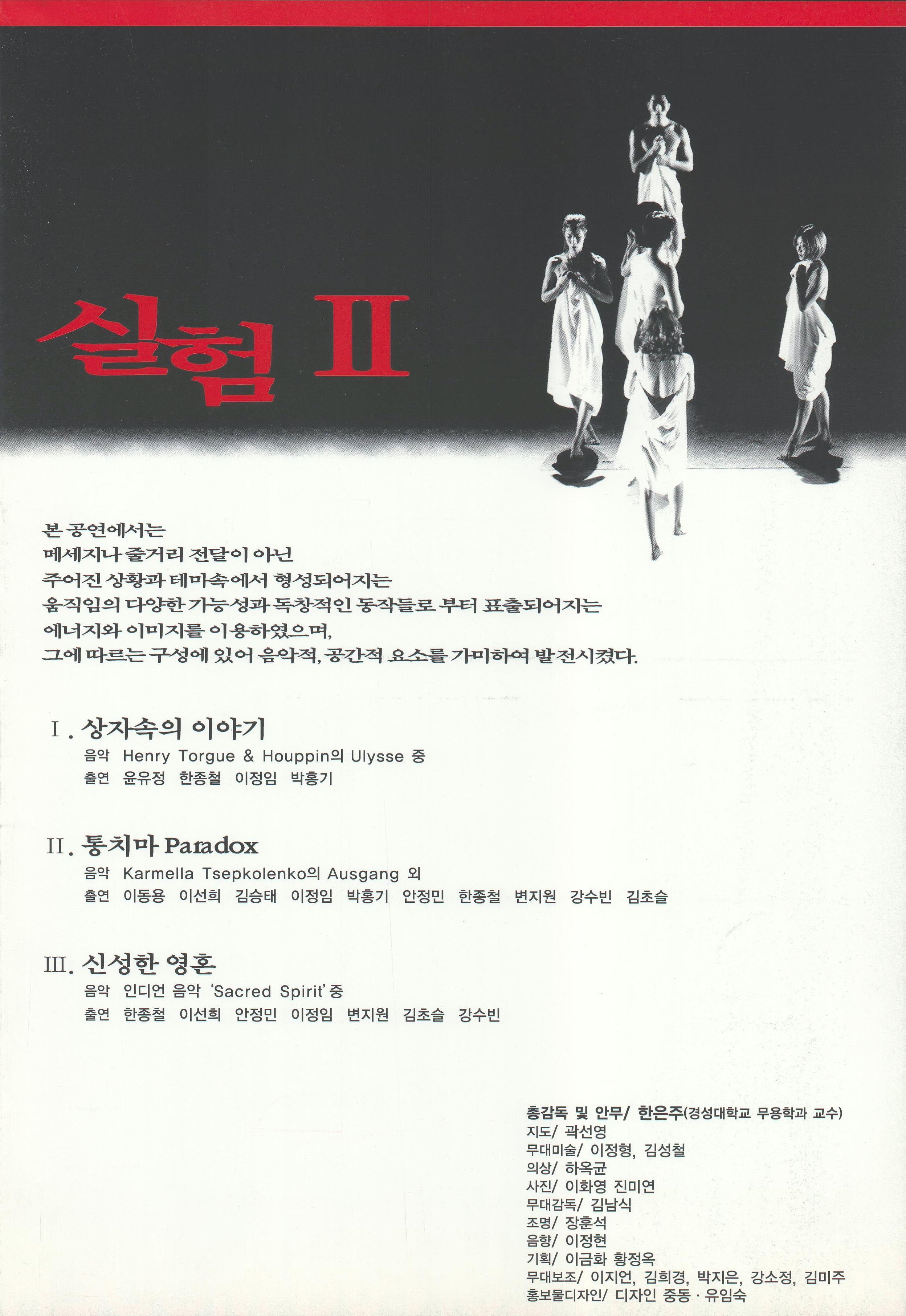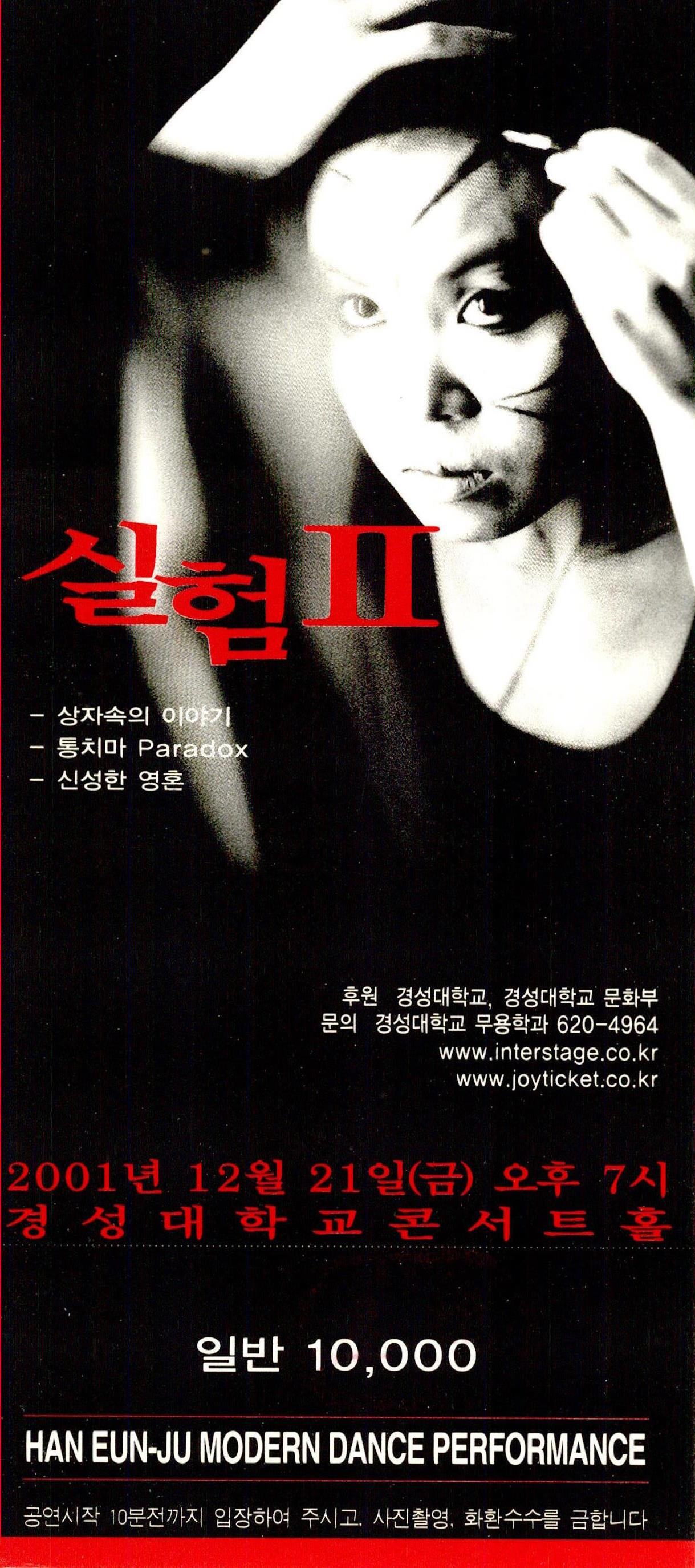 (팜플렛)2001년 12월 21일에 경성대학교 콘서트홀에서 한은주가 공연한 《실험 Ⅱ》의 팜플렛이다. 팜플렛의 내용 안에는 공연 주체인 한은주의 프로필, 한은주의 춤에 대한 소개글, 출연진과 스탭 명단이 기술되어 있다. 또한 작품 '실험 Ⅱ'에 대한 설명이 추가적으로 기술되어 있다. 한은주의 프로필과 그의 춤에 대한 소개글은 영어로도 기술되어 있다.