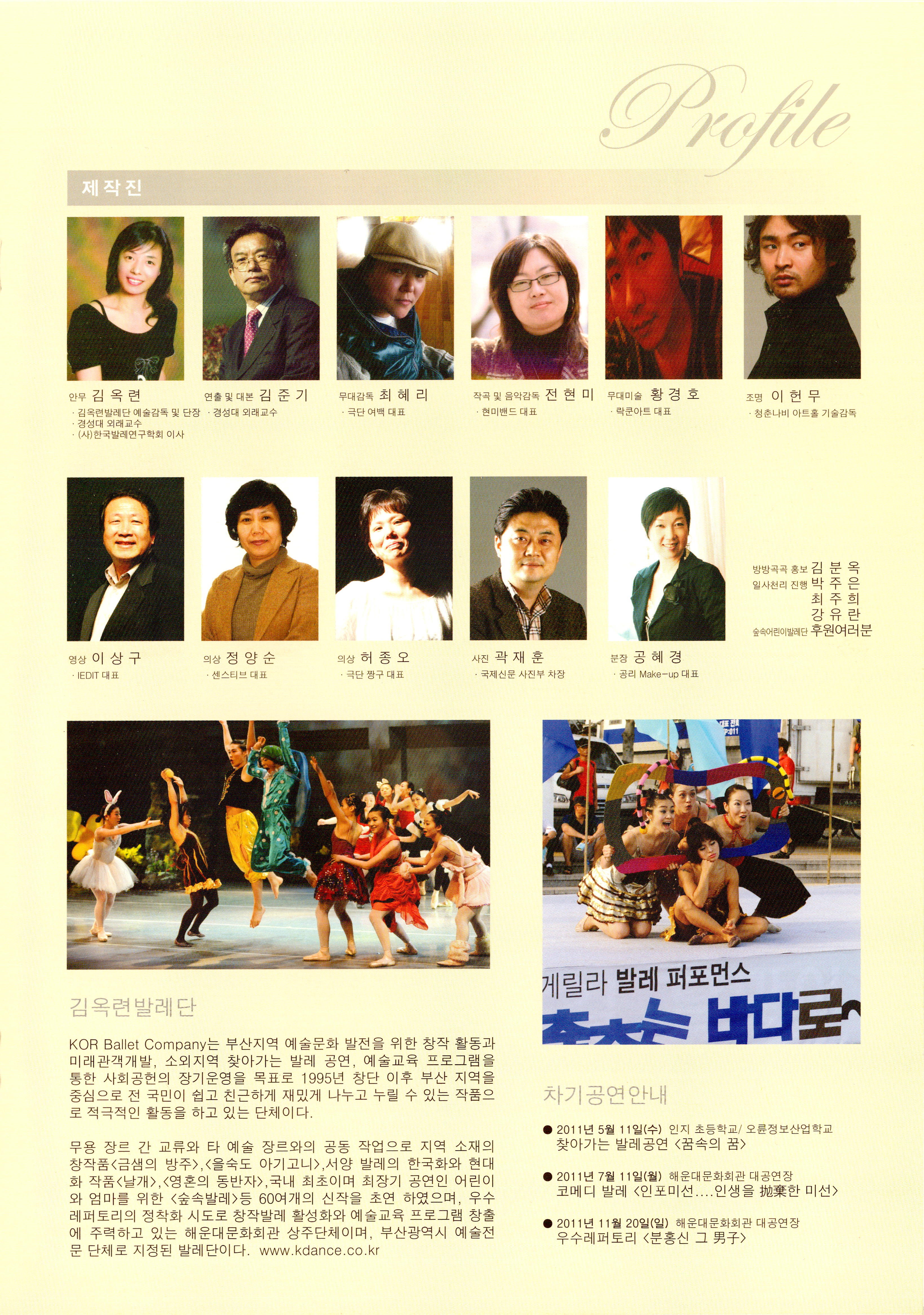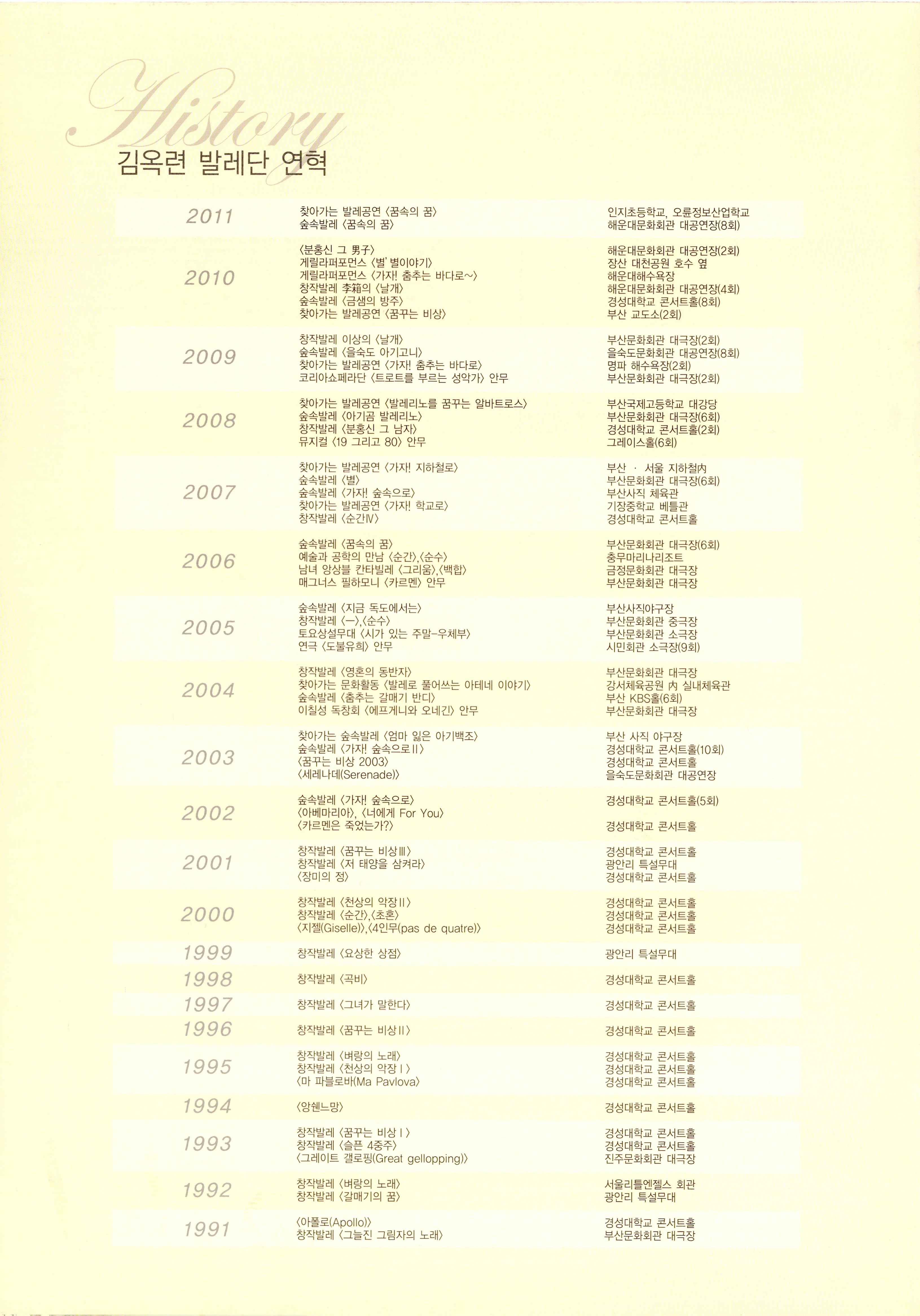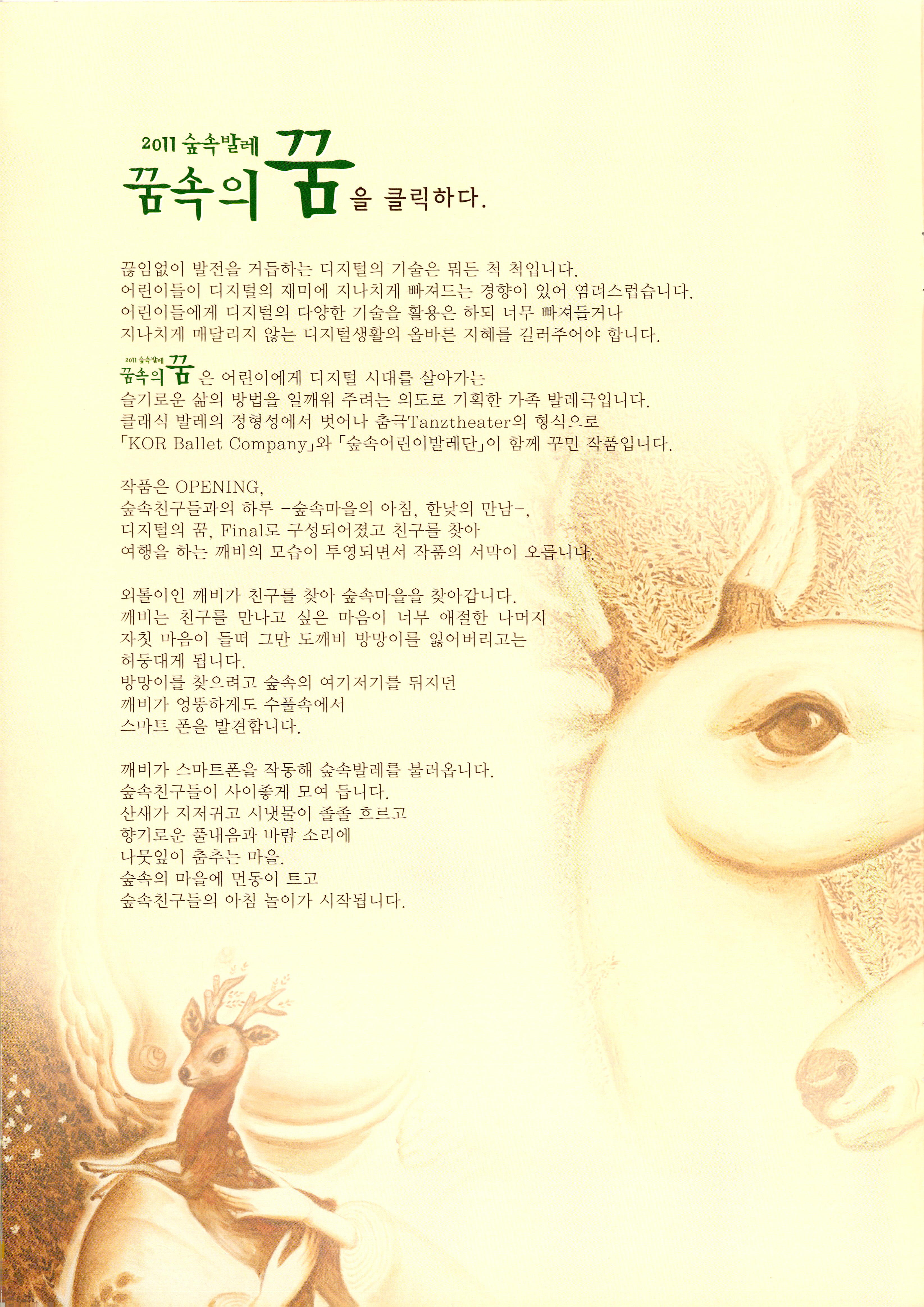 2011년 5월 5일부터 7일까지 해운대문화회관 대공연장에서 김옥련 발레단, 숲속어린이발레단이 공연한 《2011 숲속발레 "꿈속의 꿈"》의 팜플렛이다. 팜플렛의 내용 안에는 공연주체인 김옥련 발레단에 대한 소개글, 연혁, 작품 '꿈속의 꿈'에 대한 소개글, 출연진과 제작진 명단이 기술되어 있다. 마지막으로 김옥련발레단의 차기공연안내와 함께 팜플렛 구성이 끝난다.