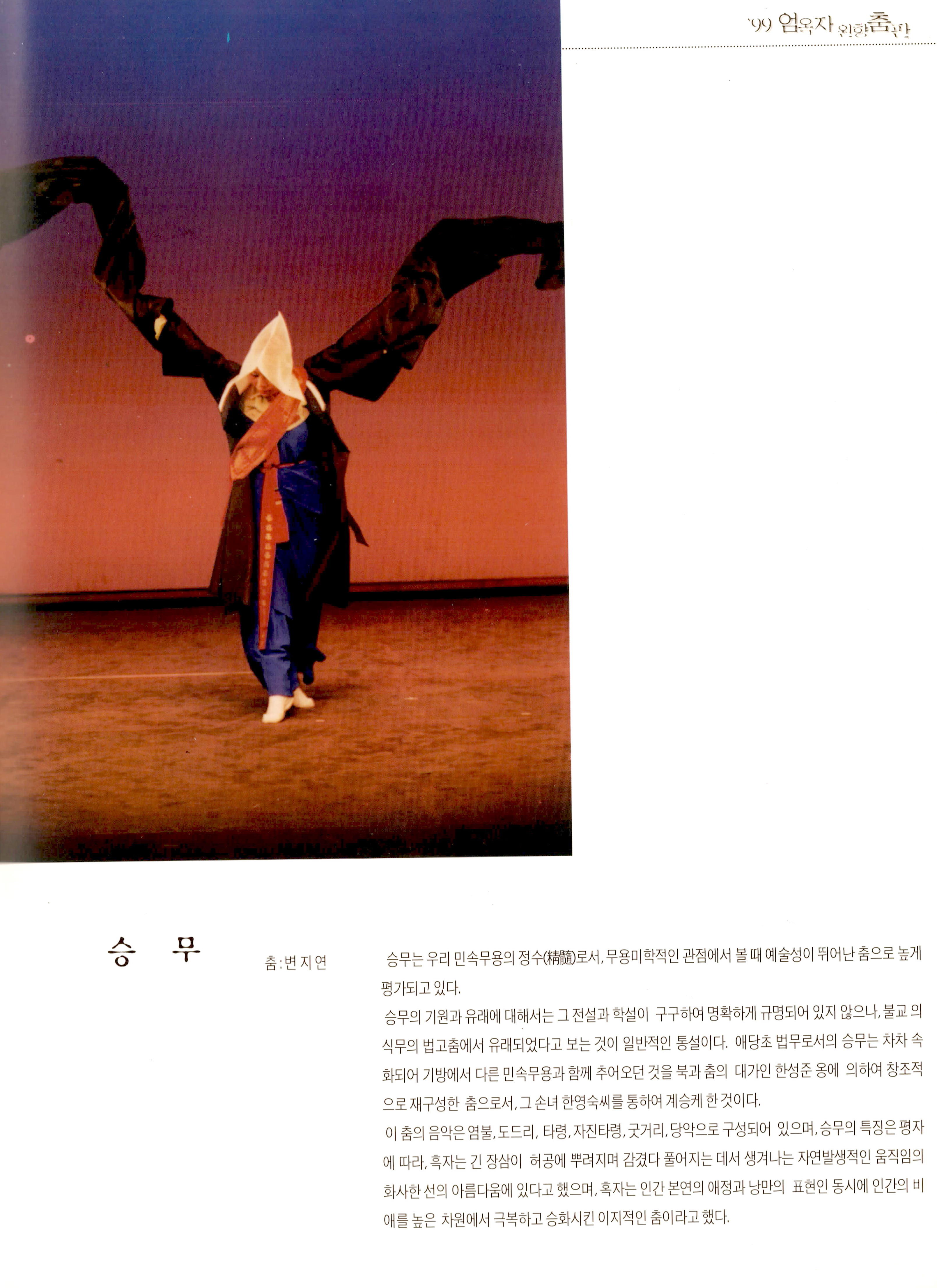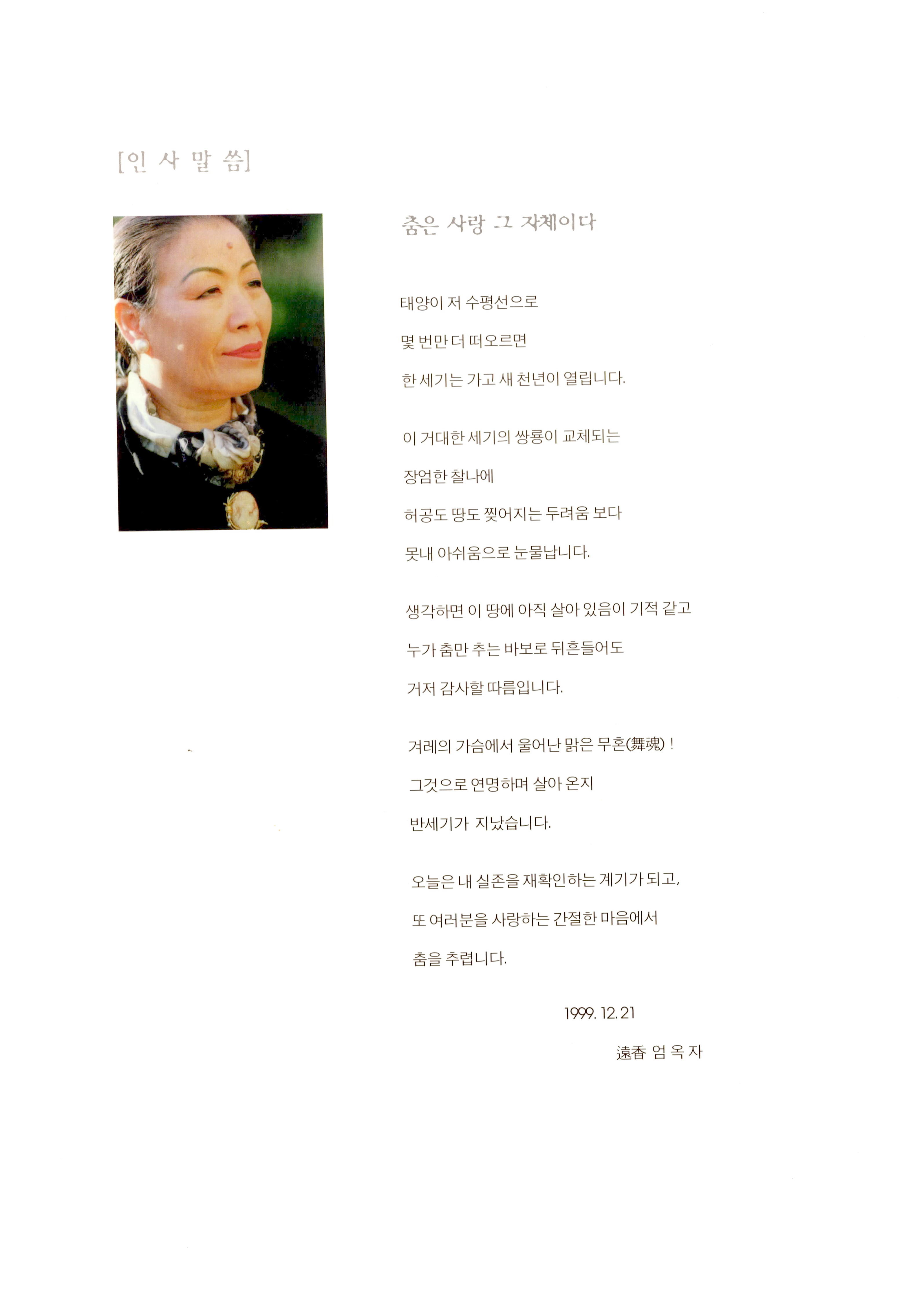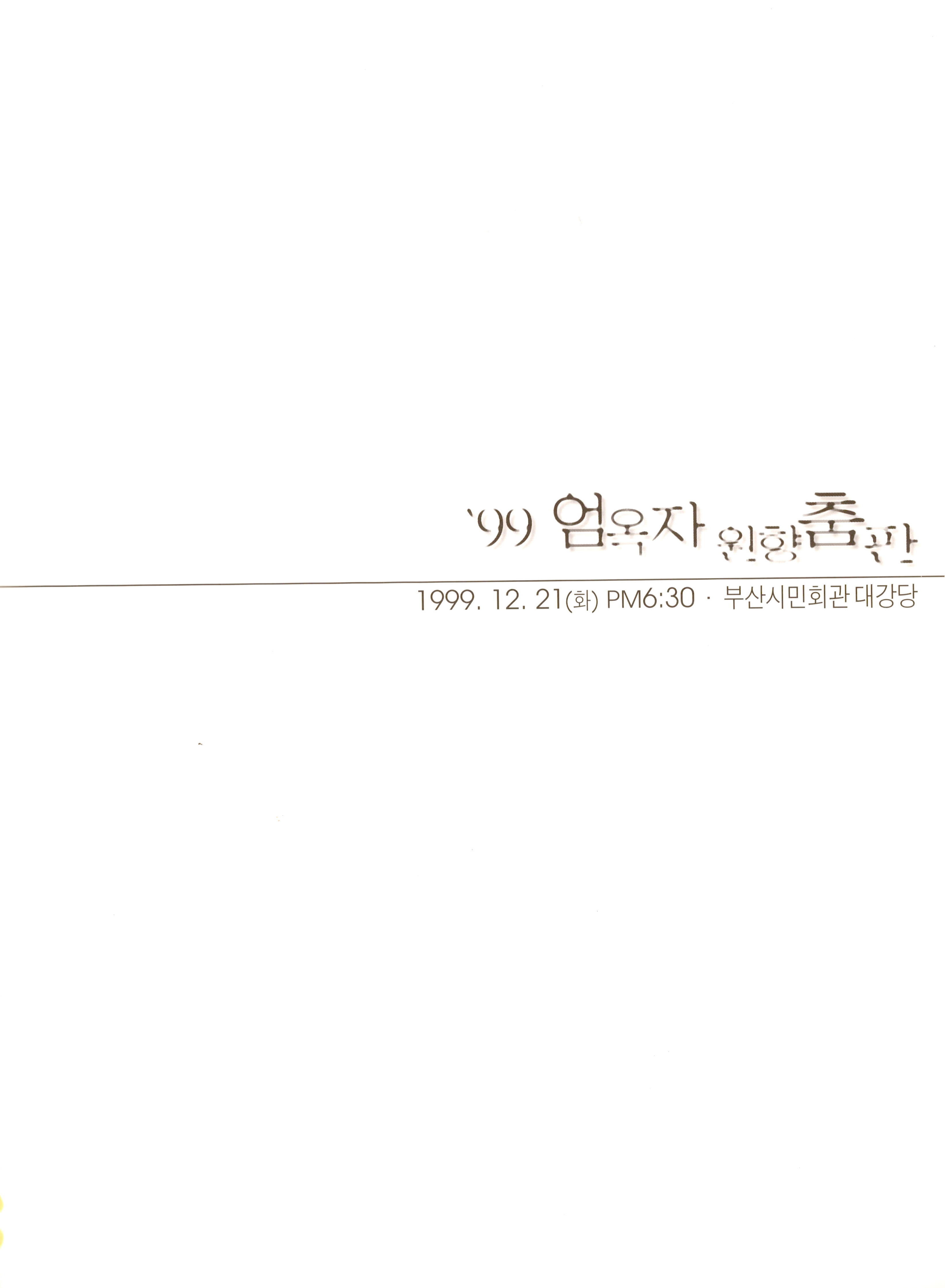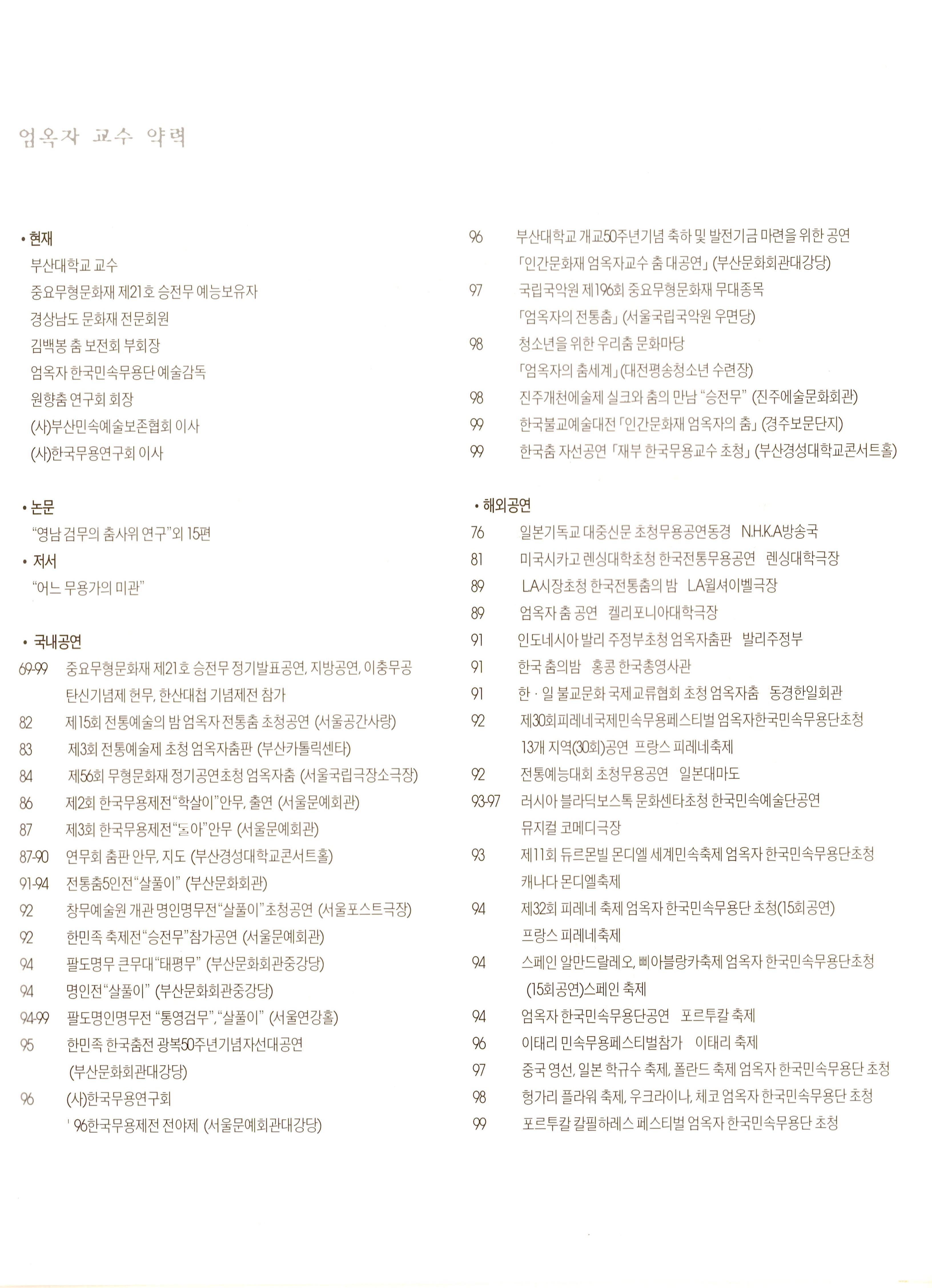 1999년 12월 21일 부산시민회관 대강당에서 열린 《'99 엄옥자 원향 춤판》 팜플렛이다. 遠㕿 엄옥자의 인사말과 '승전무', '북춤', '살풀이춤', '승무', '태평무', '농악무'로 구성된 공연 내용, 엄옥자 약력, 출연자의 사진과 명단이 기술되어 있다.