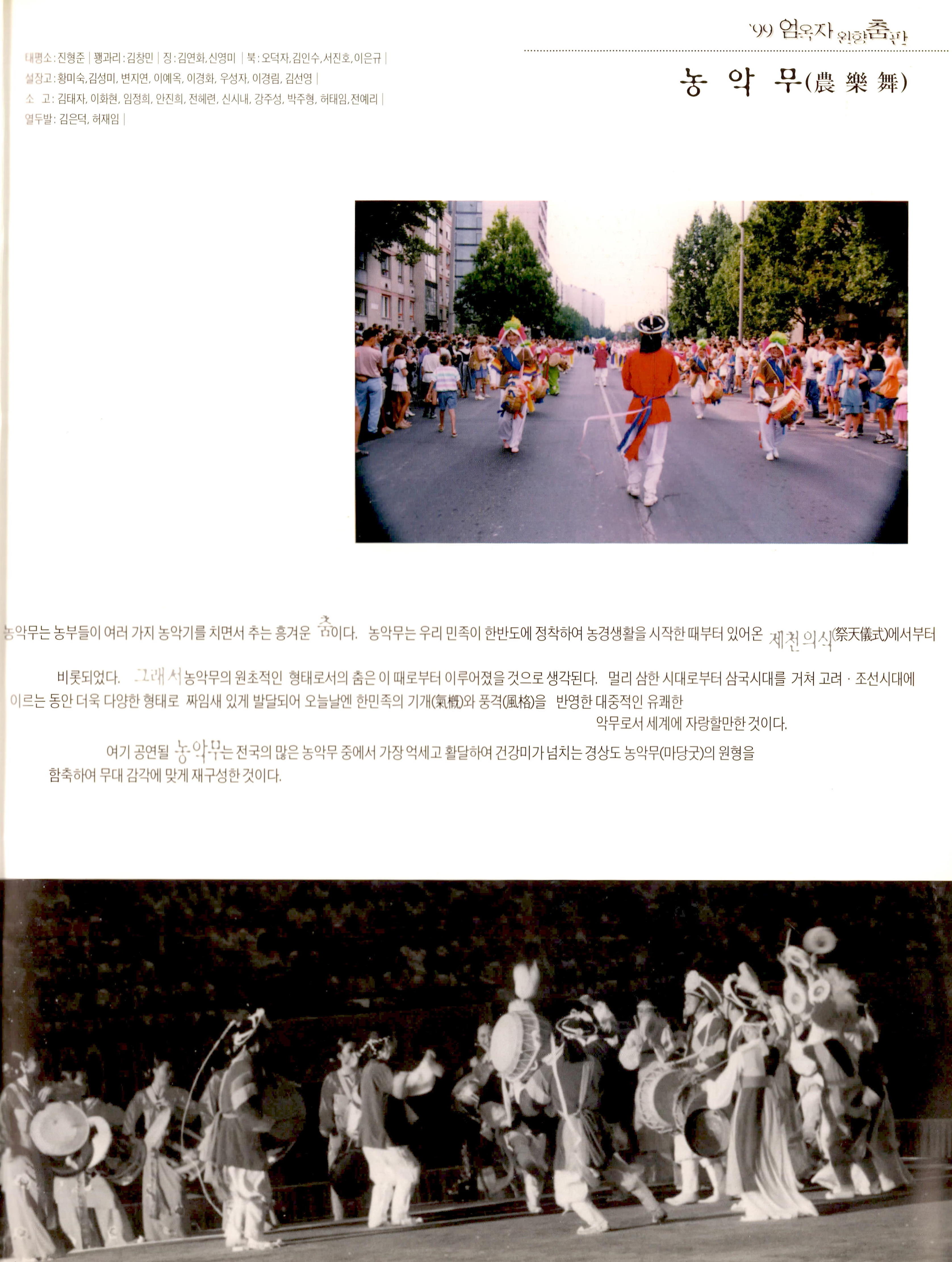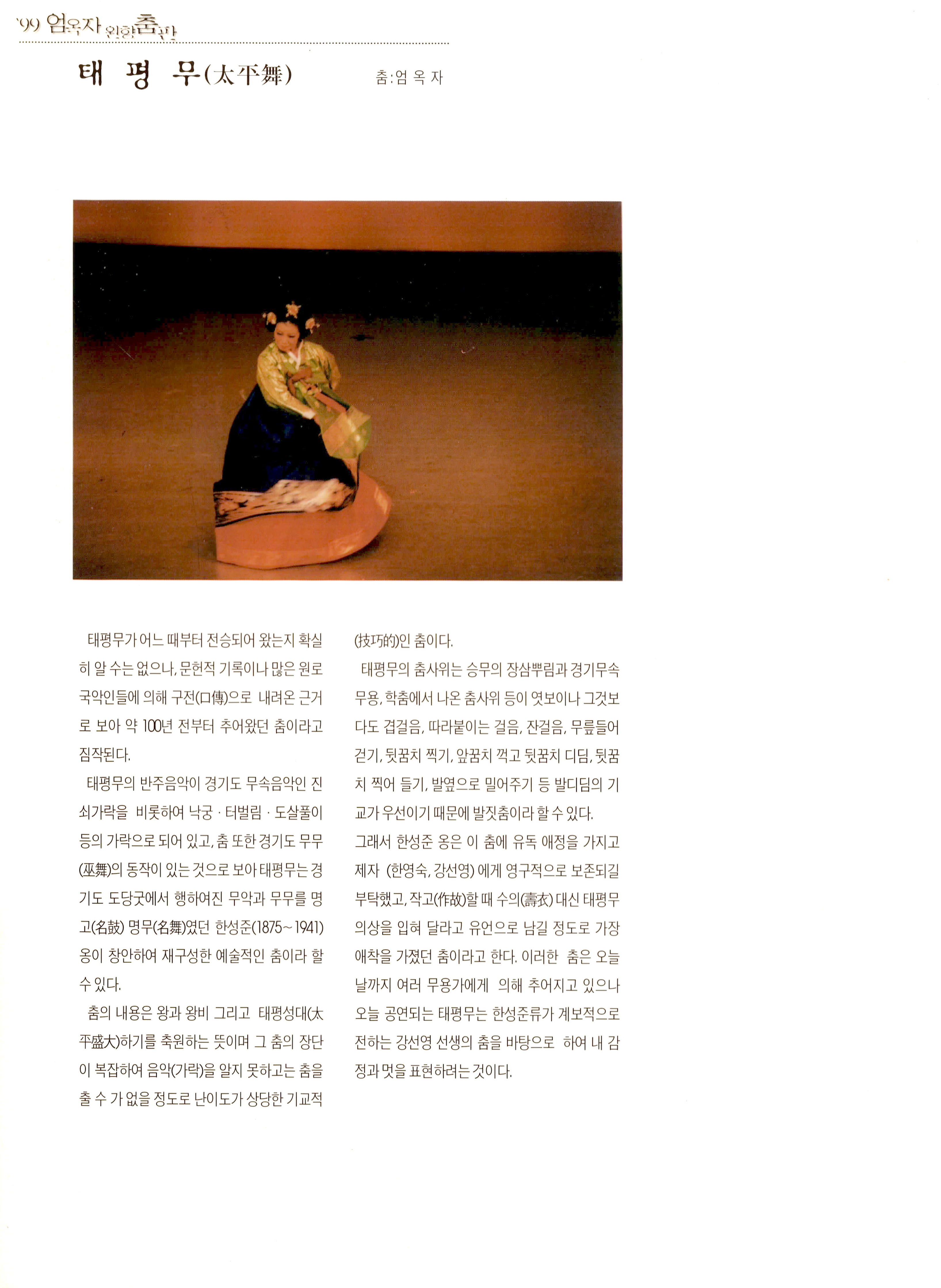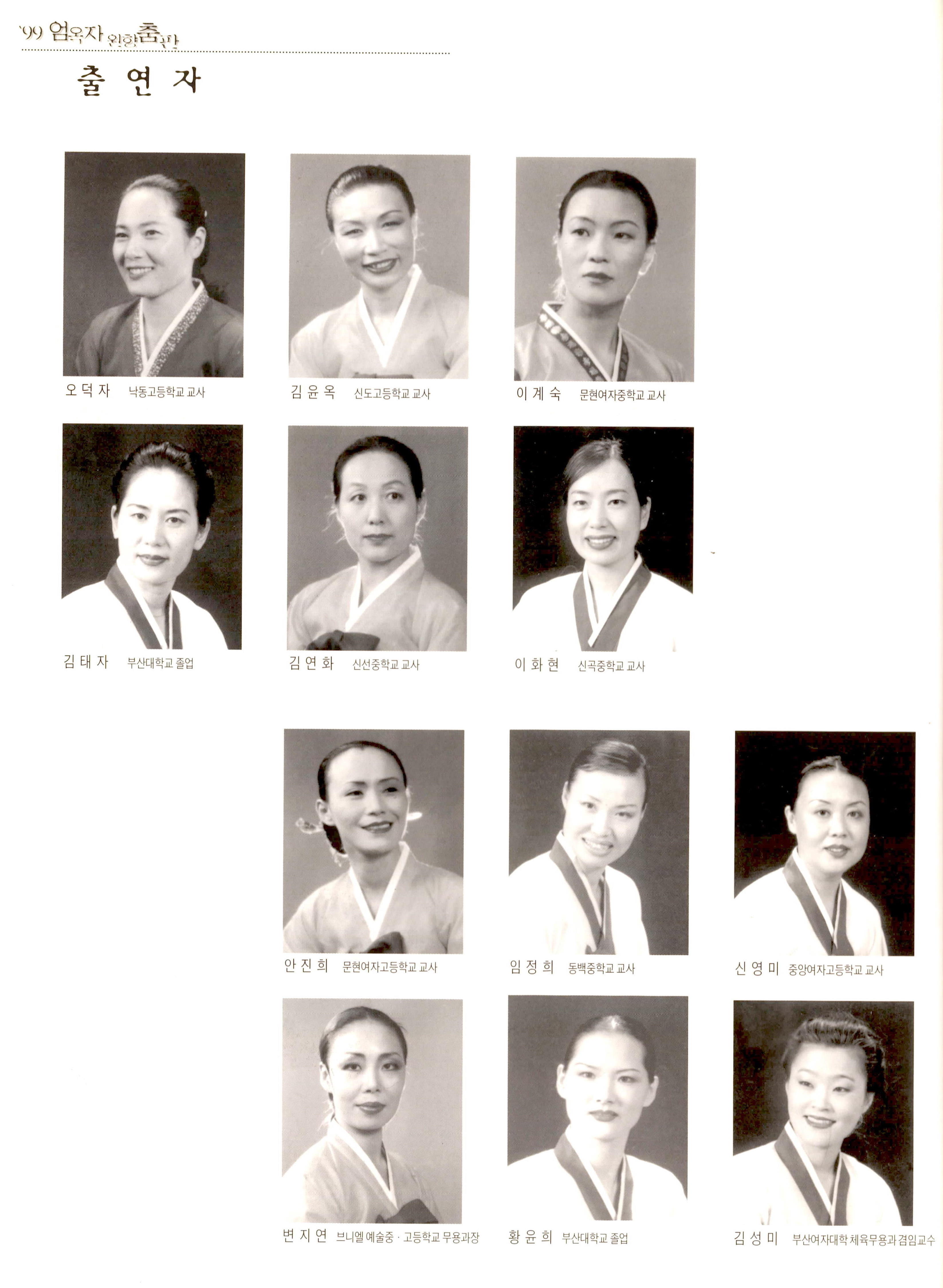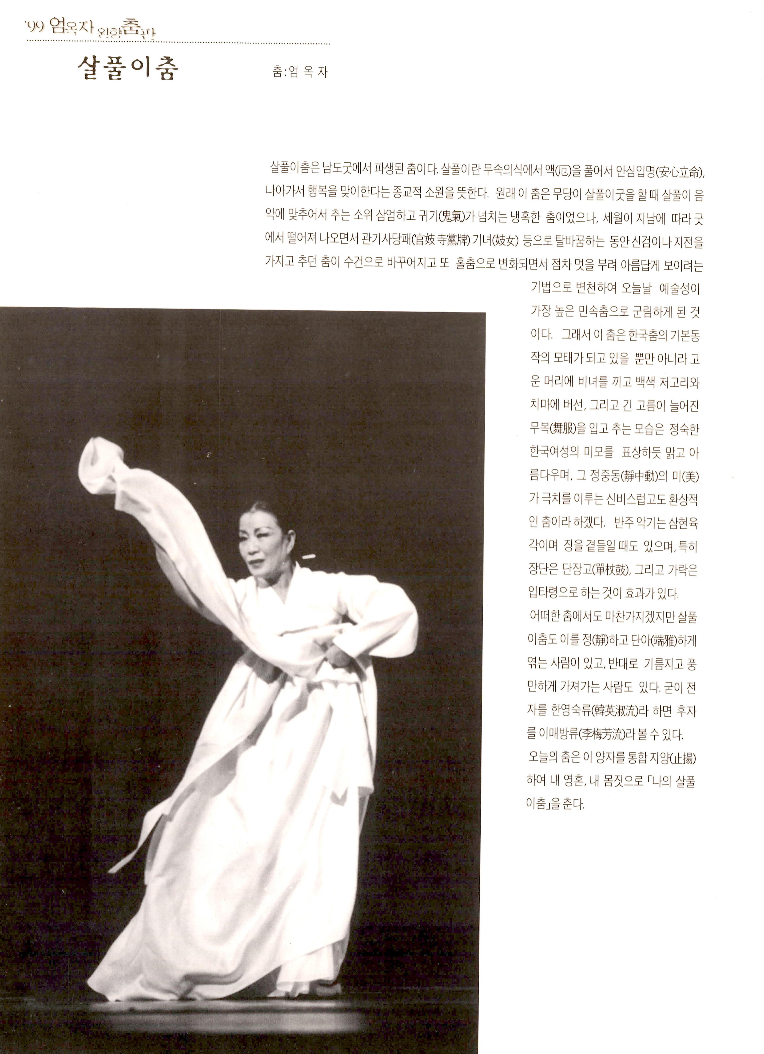1999년 12월 21일 부산시민회관 대강당에서 열린 《'99 엄옥자 원향 춤판》 팜플렛이다. 遠㕿 엄옥자의 인사말과 '승전무', '북춤', '살풀이춤', '승무', '태평무', '농악무'로 구성된 공연 내용, 엄옥자 약력, 출연자의 사진과 명단이 기술되어 있다.
