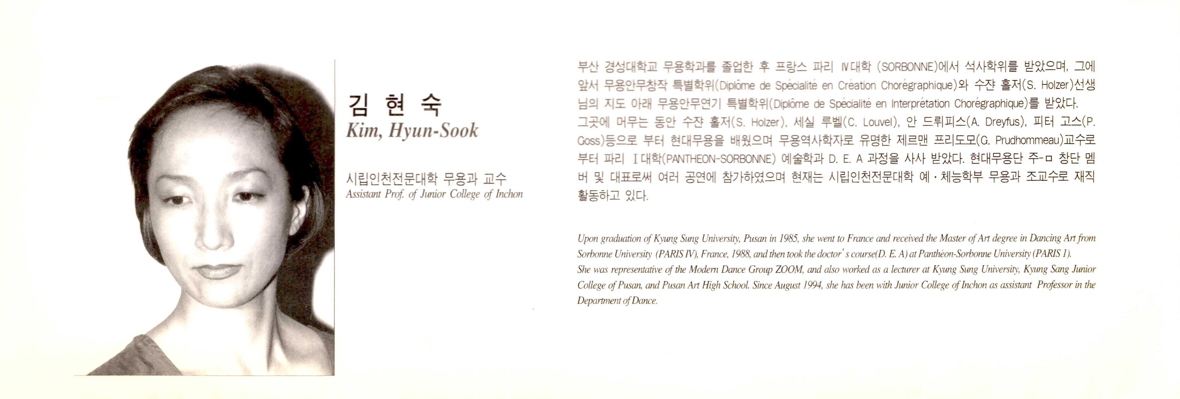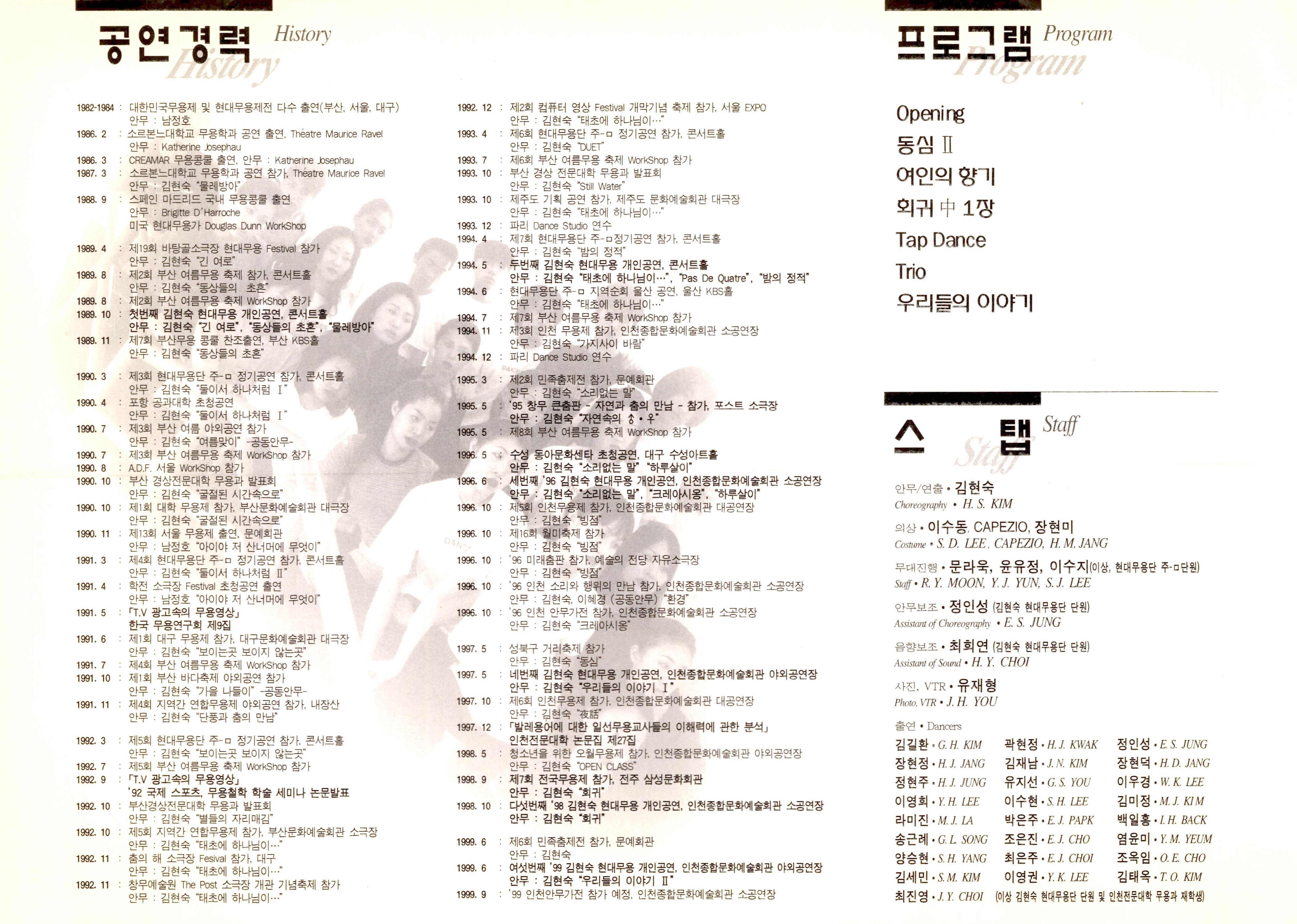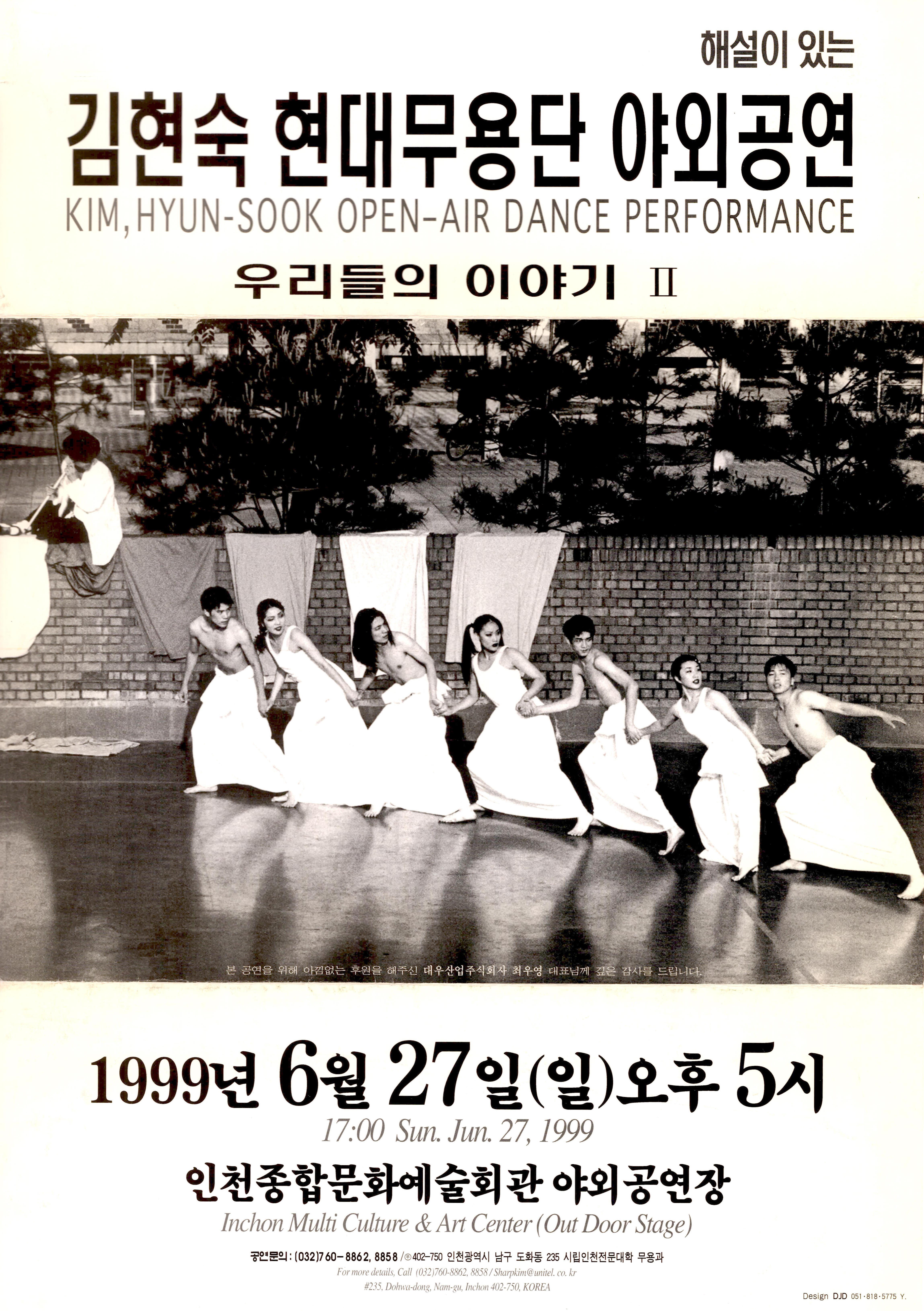 1999년 6월 27일 인천종합문화예술회관 야외공연장에서 공연된 《해설이 있는 김현숙 현대무용단 야외공연(KIM, HYUN-SOOK OPEN-AIR DANCE PERFORMANCE) "우리들의 이야기 Ⅱ"》의 리플렛이다. 김현숙의 사진과 연혁이 기술되어 있고, 공연경력이 기재되어 있으며, 프로그램으로는 동심Ⅱ, 여인의 향기, 회귀中1장, Tap Dance, Trio, 우리들의 이야기가 있다. STAFF기술과 출연진이 사진과 함께 나열되어 리플렛 구성이 끝난다.