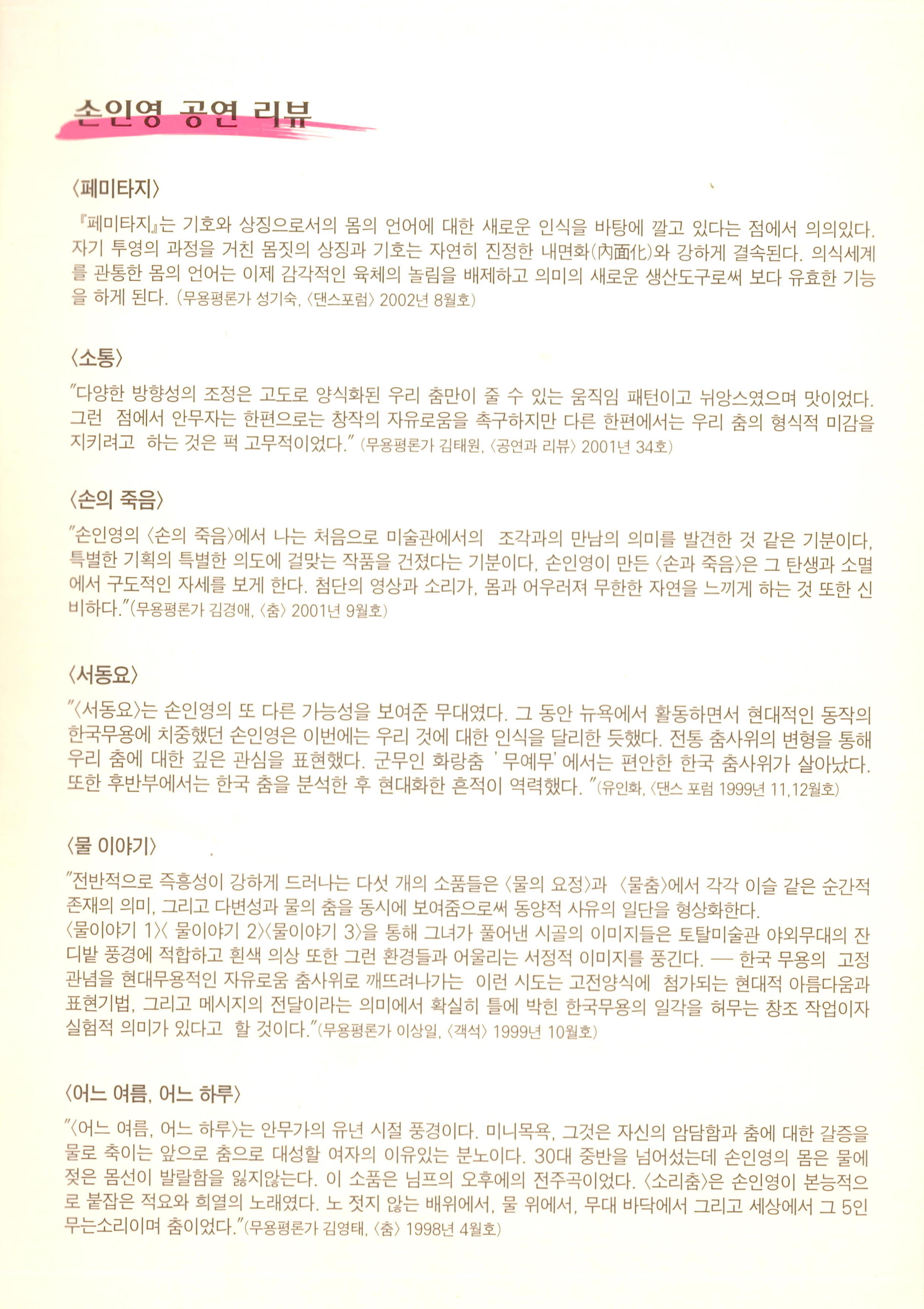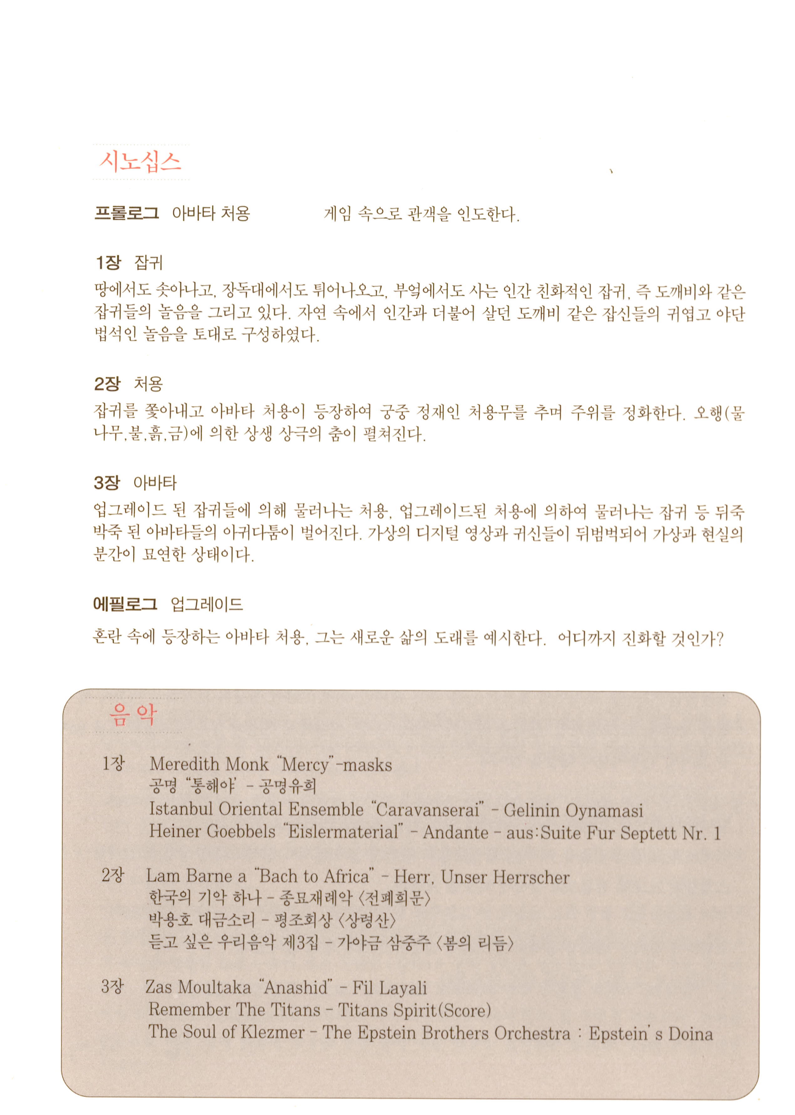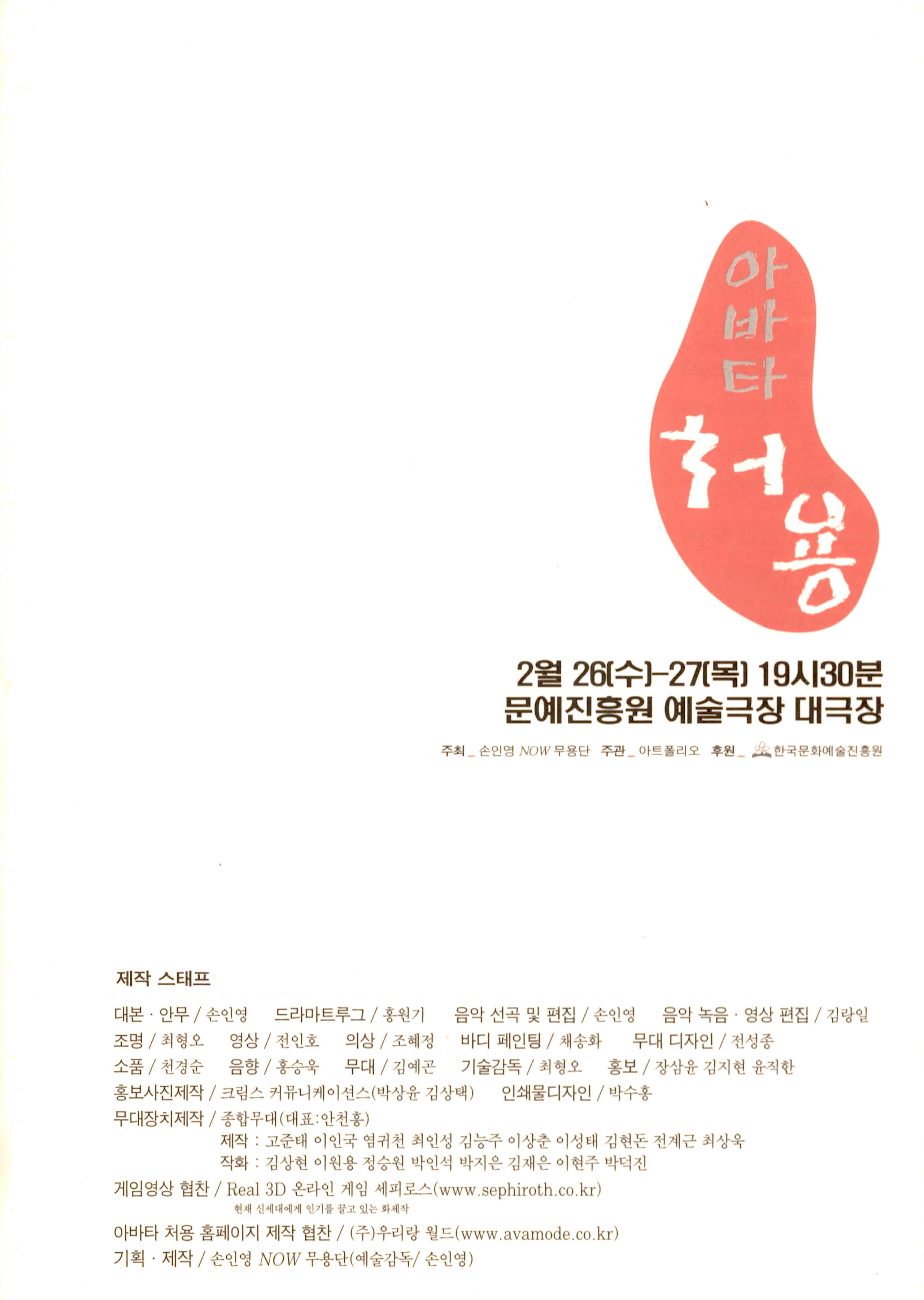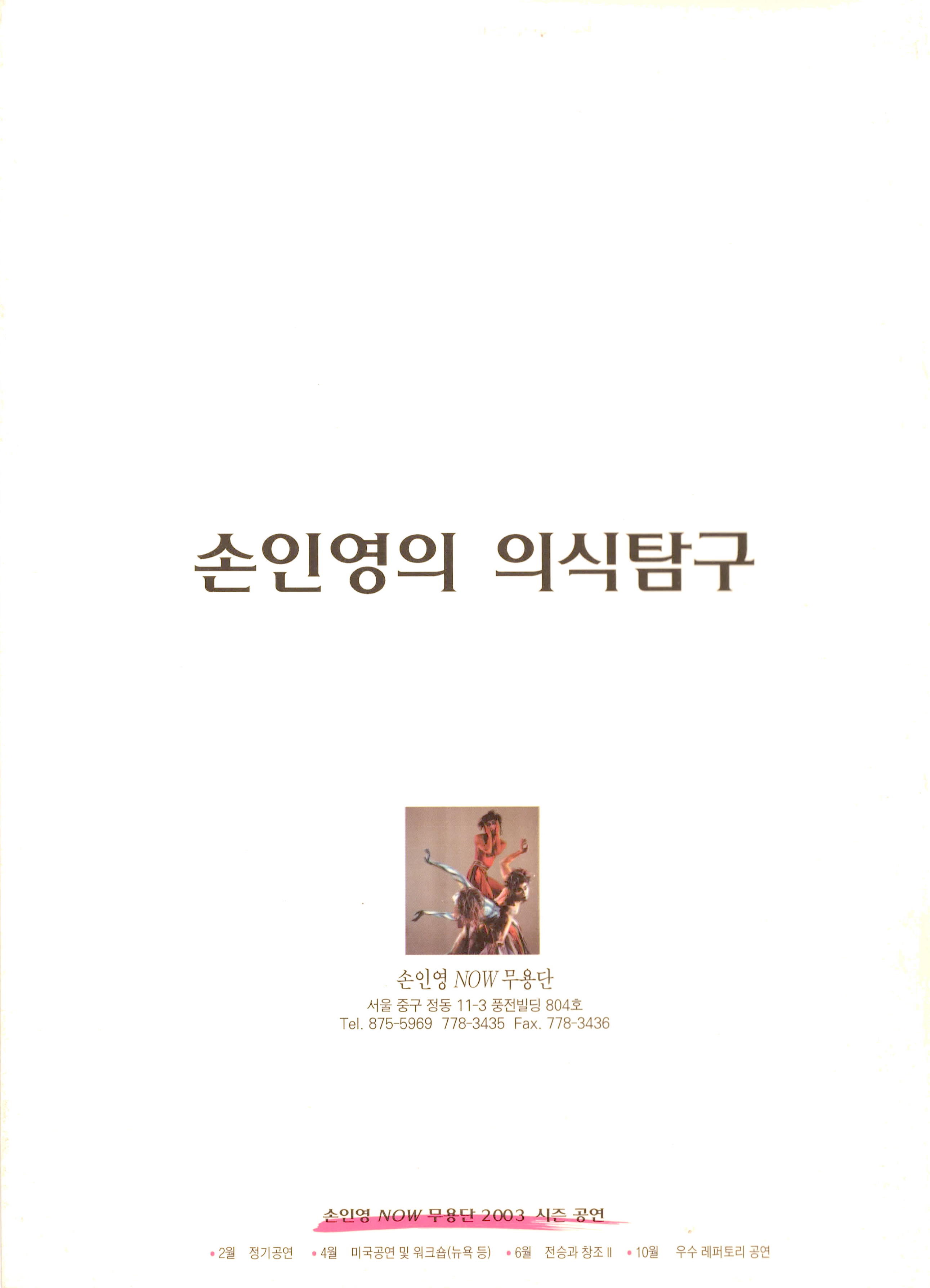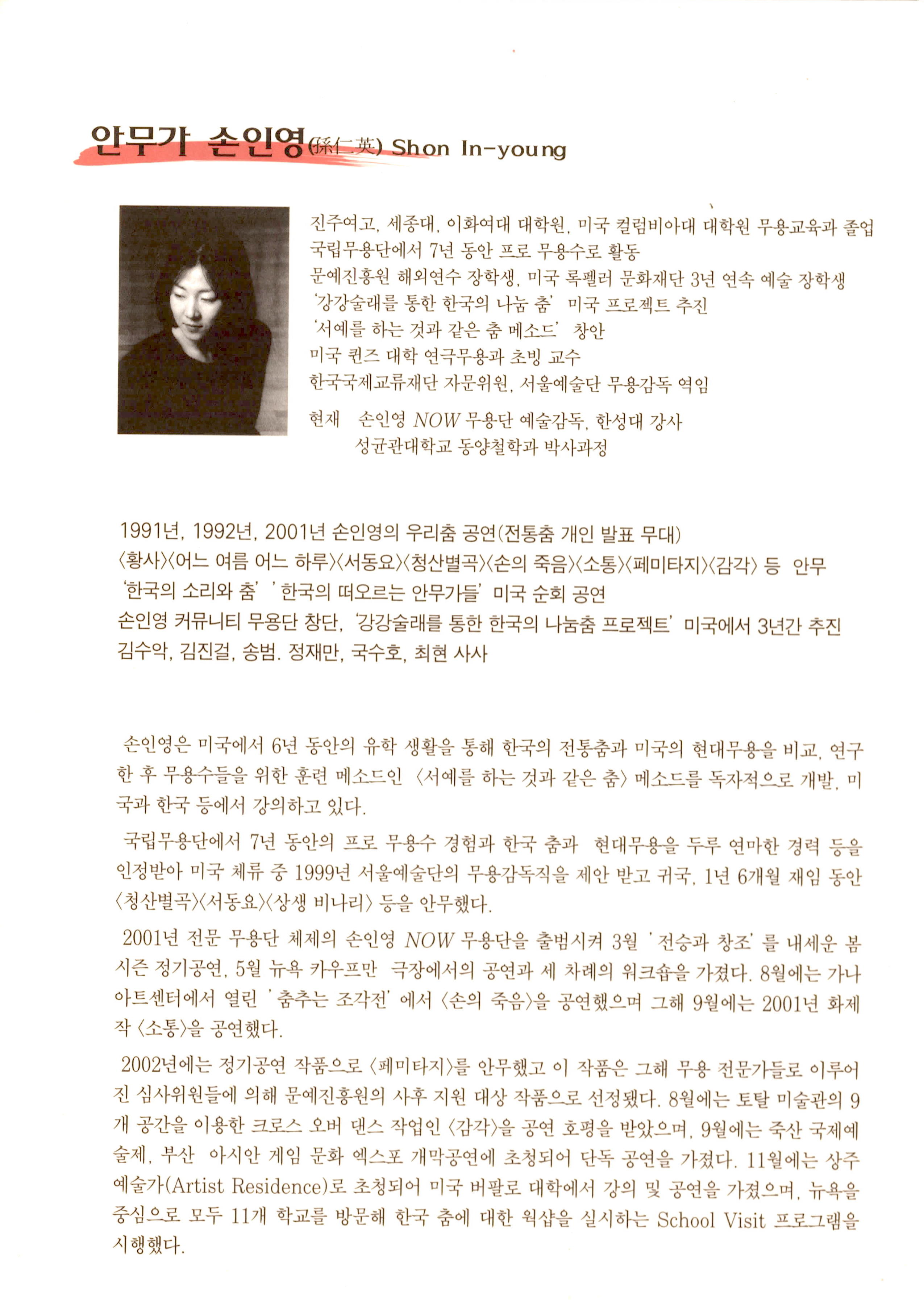 2002년 2월 26일, 27일 양일간 문예진흥원 예술극장 대극장에서 열린 손인영 NOW무용단 2003시즌 정기공연 《아바타 처용》 팜플렛이다. 기획 제작 배경, 프롤로그 '아바타 처용', 1장 '잡귀', 2장 '처용', 3장 '아바타' 에필로그 '업그레이드'로 구성된 시노십스의 내용과 사용된 음악 정보, 안무자의 변과 안무가 손인영(孫仁英) Shon In-young 소개글이 기술되어 있으며 출연자의 사진 및 명단과 약력, 스태프 소개, 작업을 준비하면서 주제와 관련된 글귀와 작업 노트, 성기숙 무용평론가의 손인영의 작품세계에 관한 평론과 손인영이 창안한 무용수들을 위한 훈련 메소드 <서예를 하는 것과 같은 춤>요약과 기본원리, 손인영 공연 리뷰가 실려 있다.