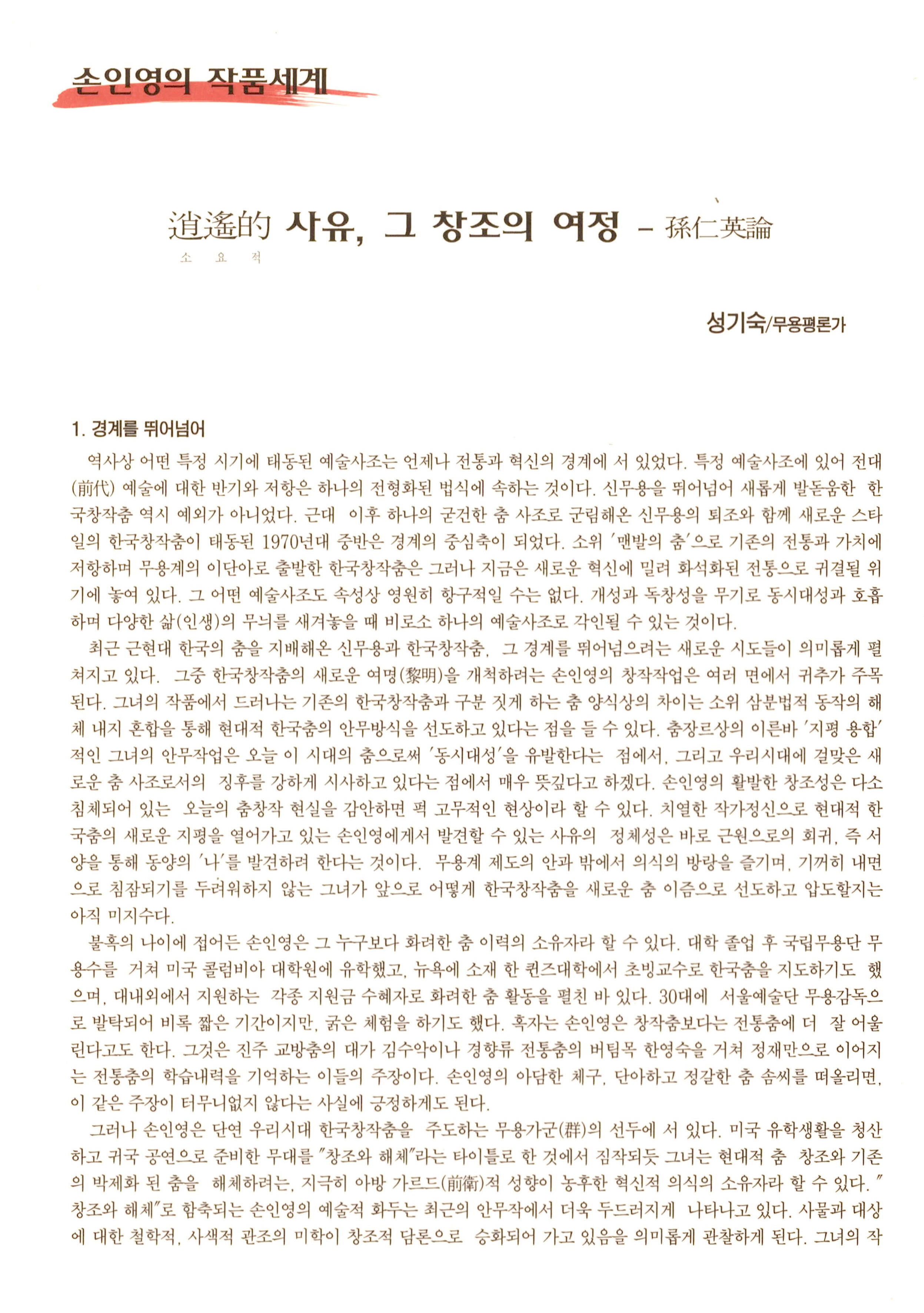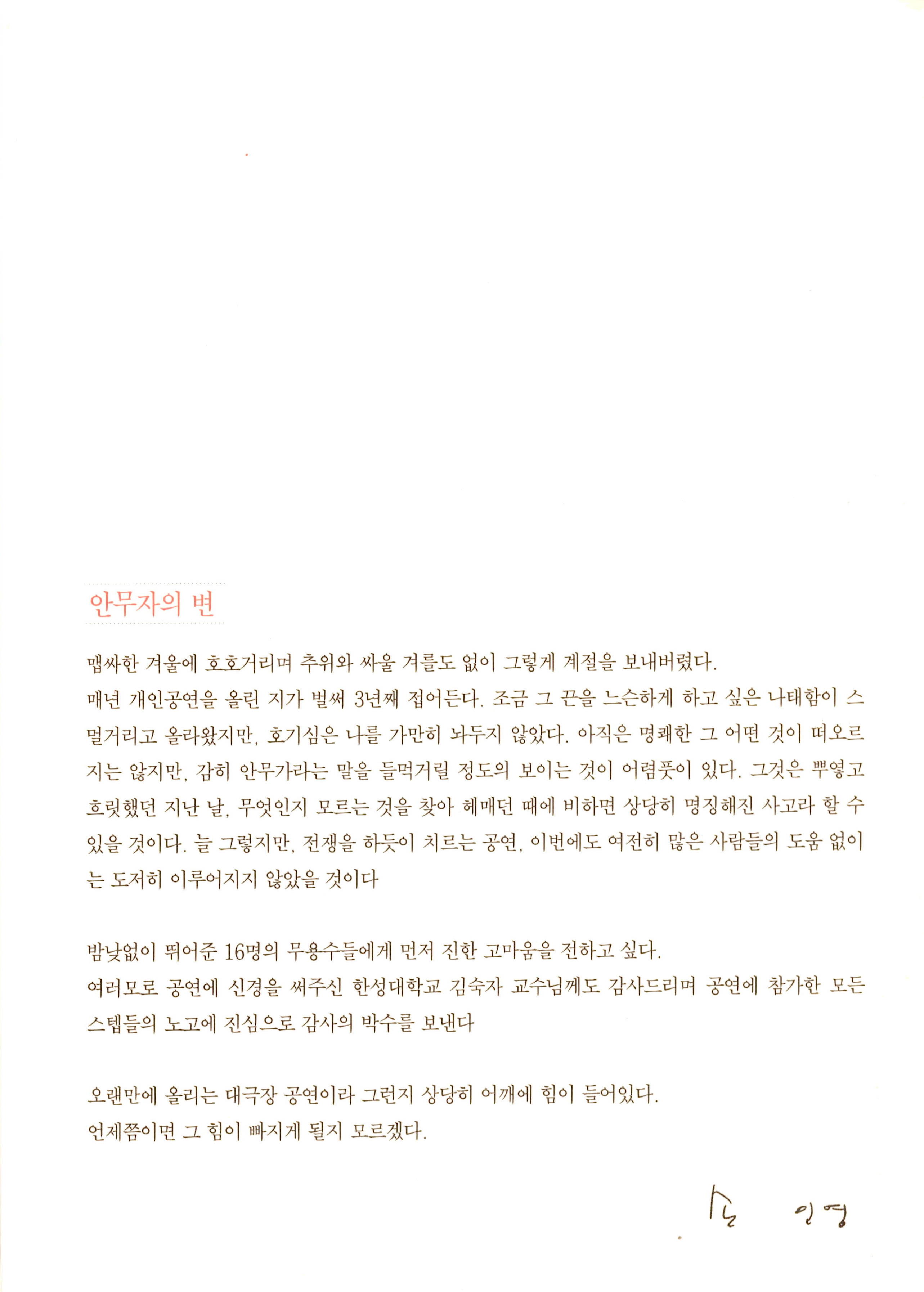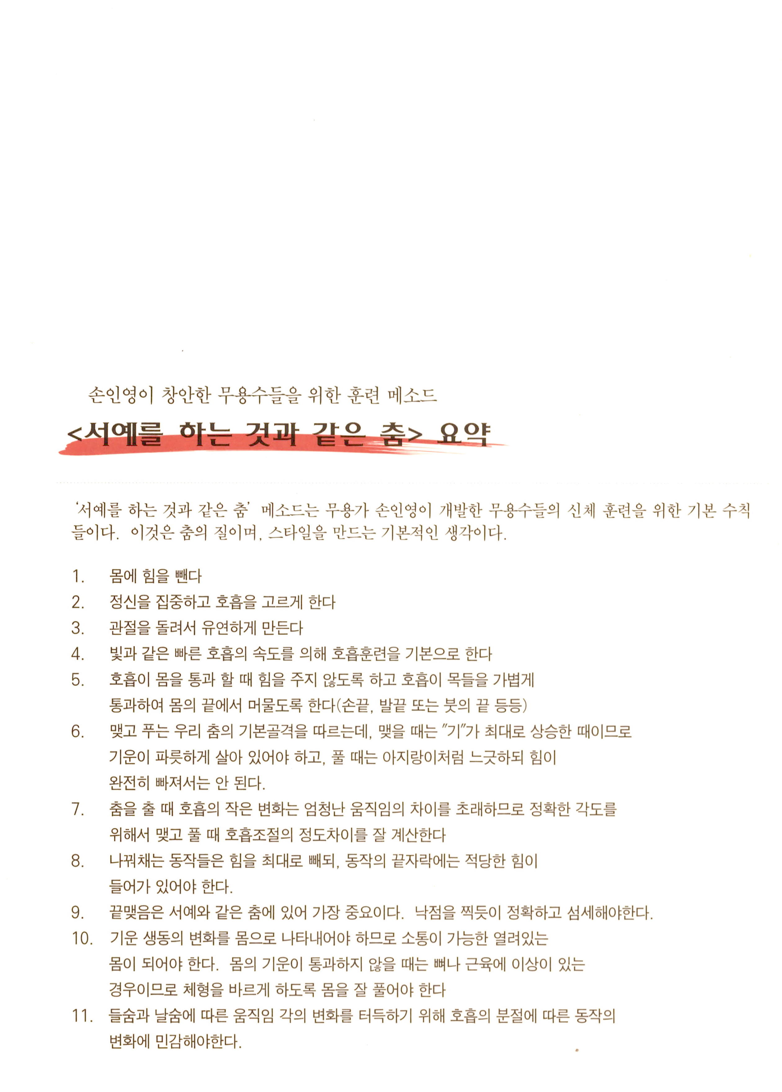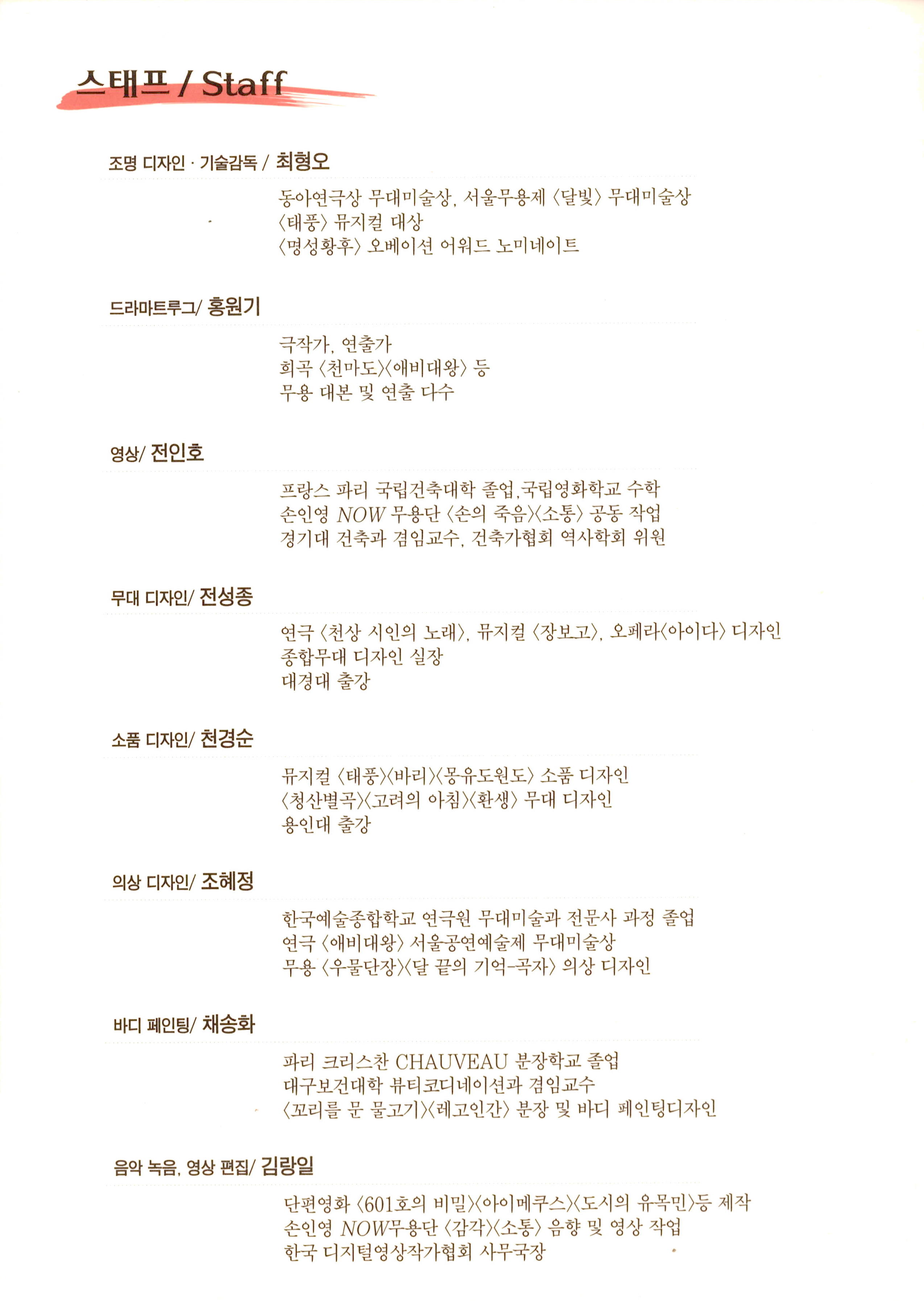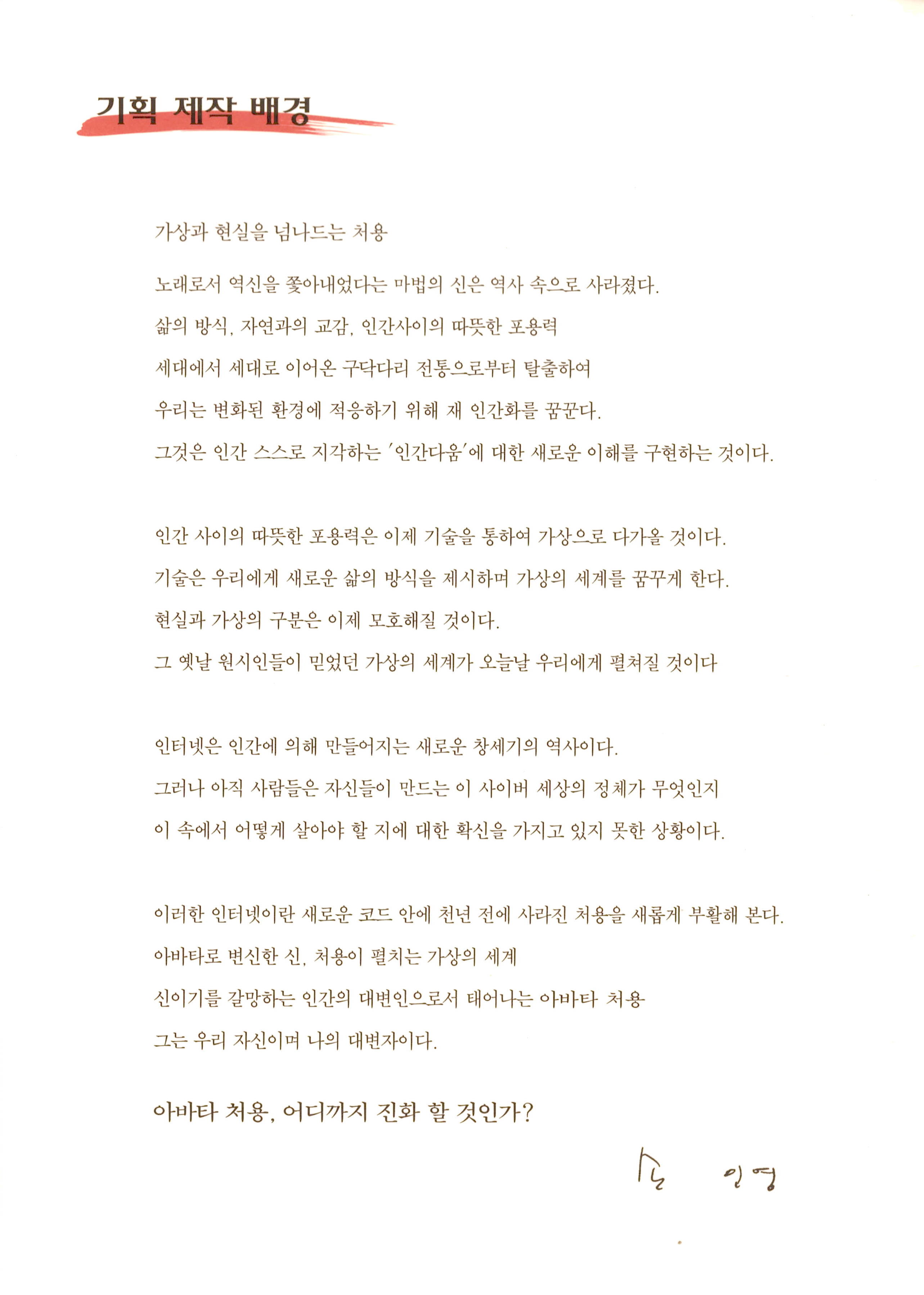 2002년 2월 26일, 27일 양일간 문예진흥원 예술극장 대극장에서 열린 손인영 NOW무용단 2003시즌 정기공연 《아바타 처용》 팜플렛이다. 기획 제작 배경, 프롤로그 '아바타 처용', 1장 '잡귀', 2장 '처용', 3장 '아바타' 에필로그 '업그레이드'로 구성된 시노십스의 내용과 사용된 음악 정보, 안무자의 변과 안무가 손인영(孫仁英) Shon In-young 소개글이 기술되어 있으며 출연자의 사진 및 명단과 약력, 스태프 소개, 작업을 준비하면서 주제와 관련된 글귀와 작업 노트, 성기숙 무용평론가의 손인영의 작품세계에 관한 평론과 손인영이 창안한 무용수들을 위한 훈련 메소드 <서예를 하는 것과 같은 춤>요약과 기본원리, 손인영 공연 리뷰가 실려 있다.