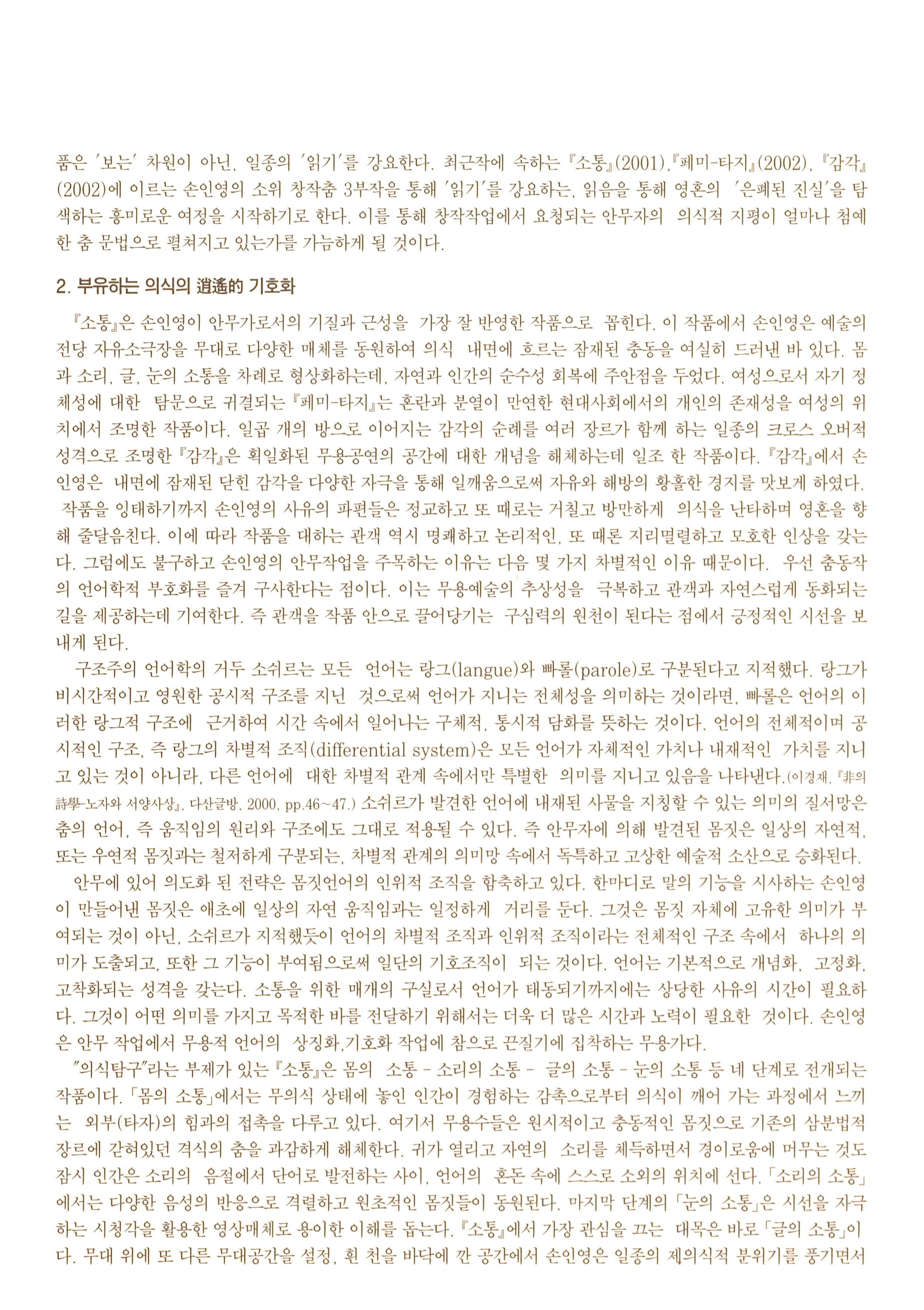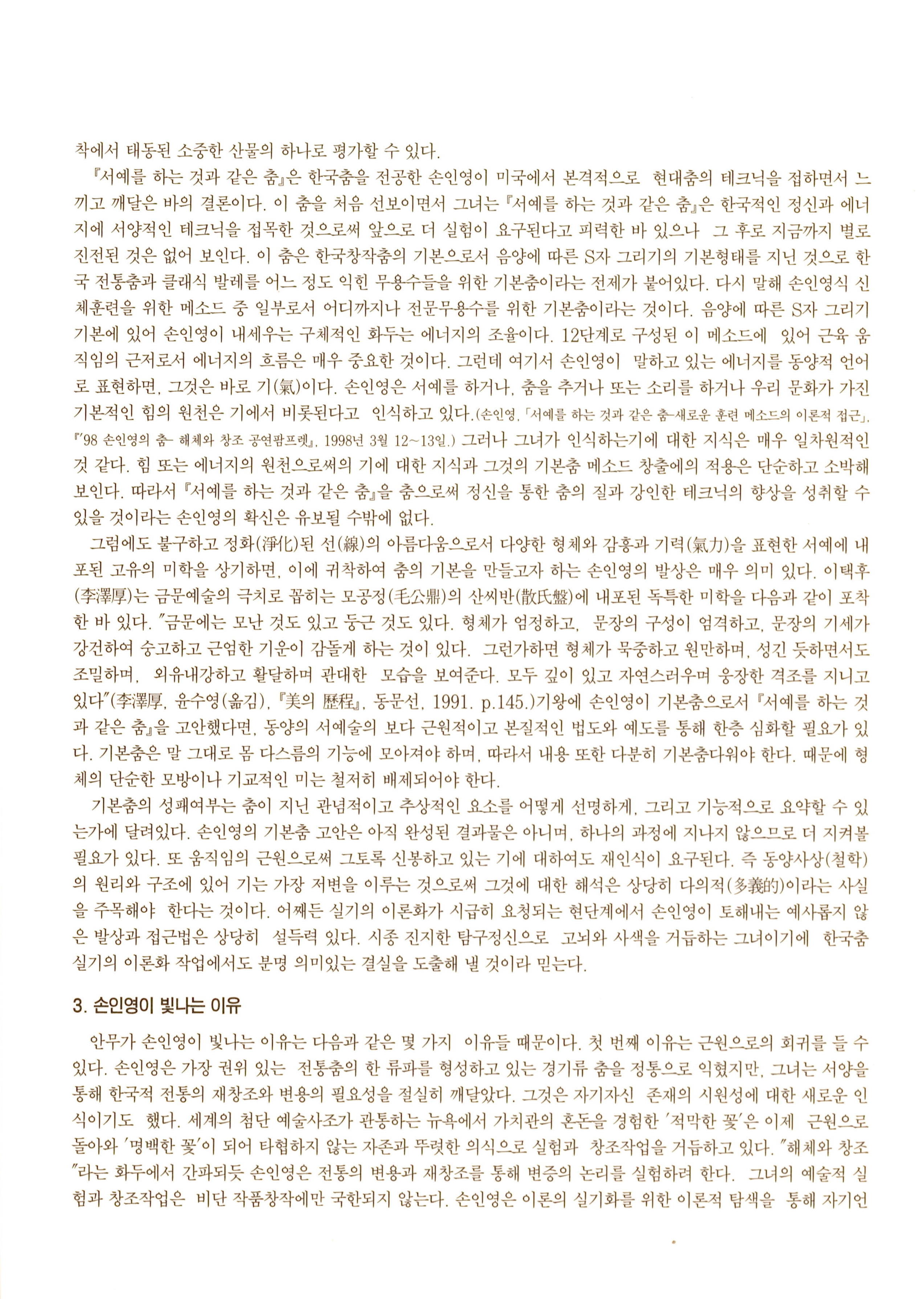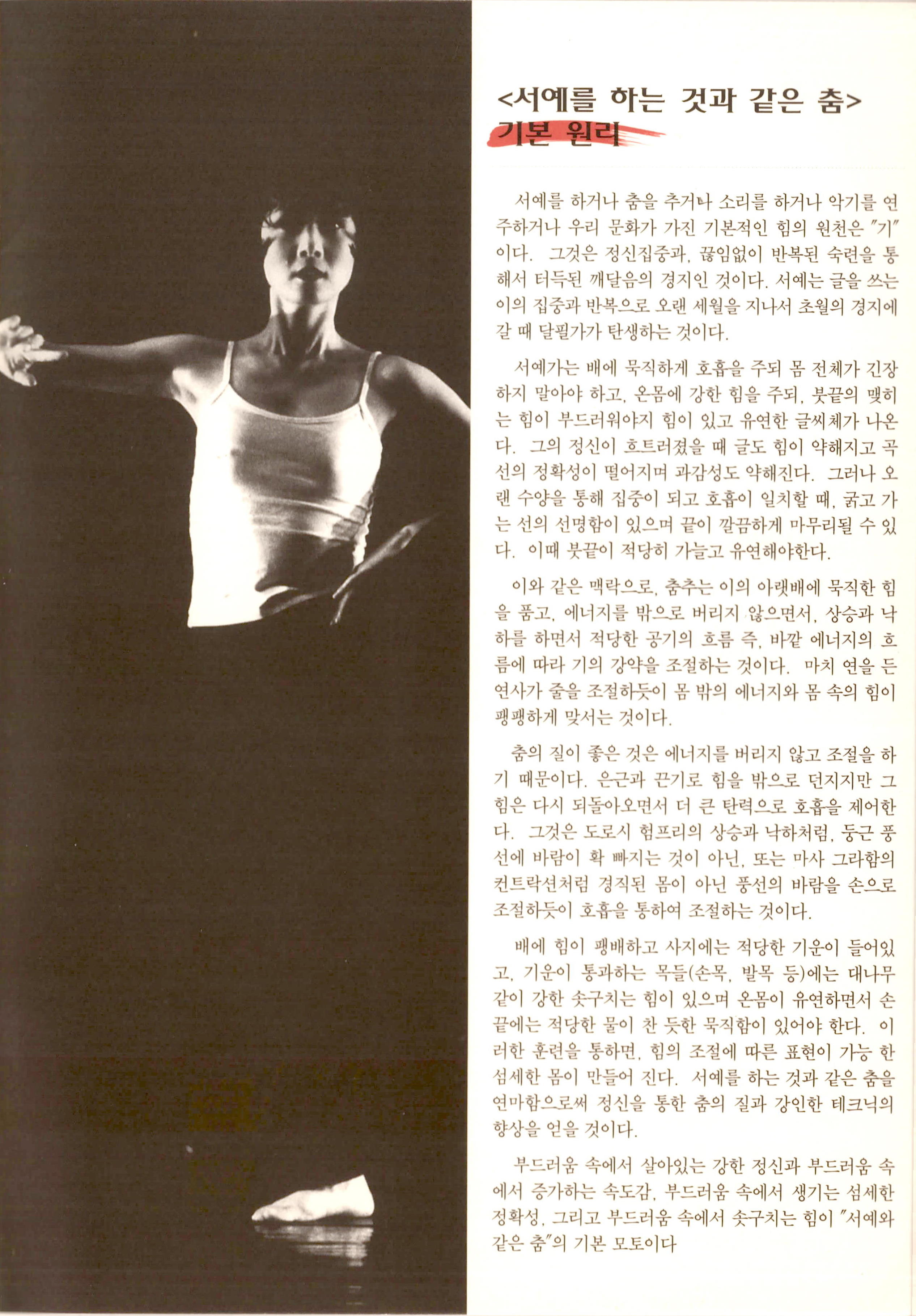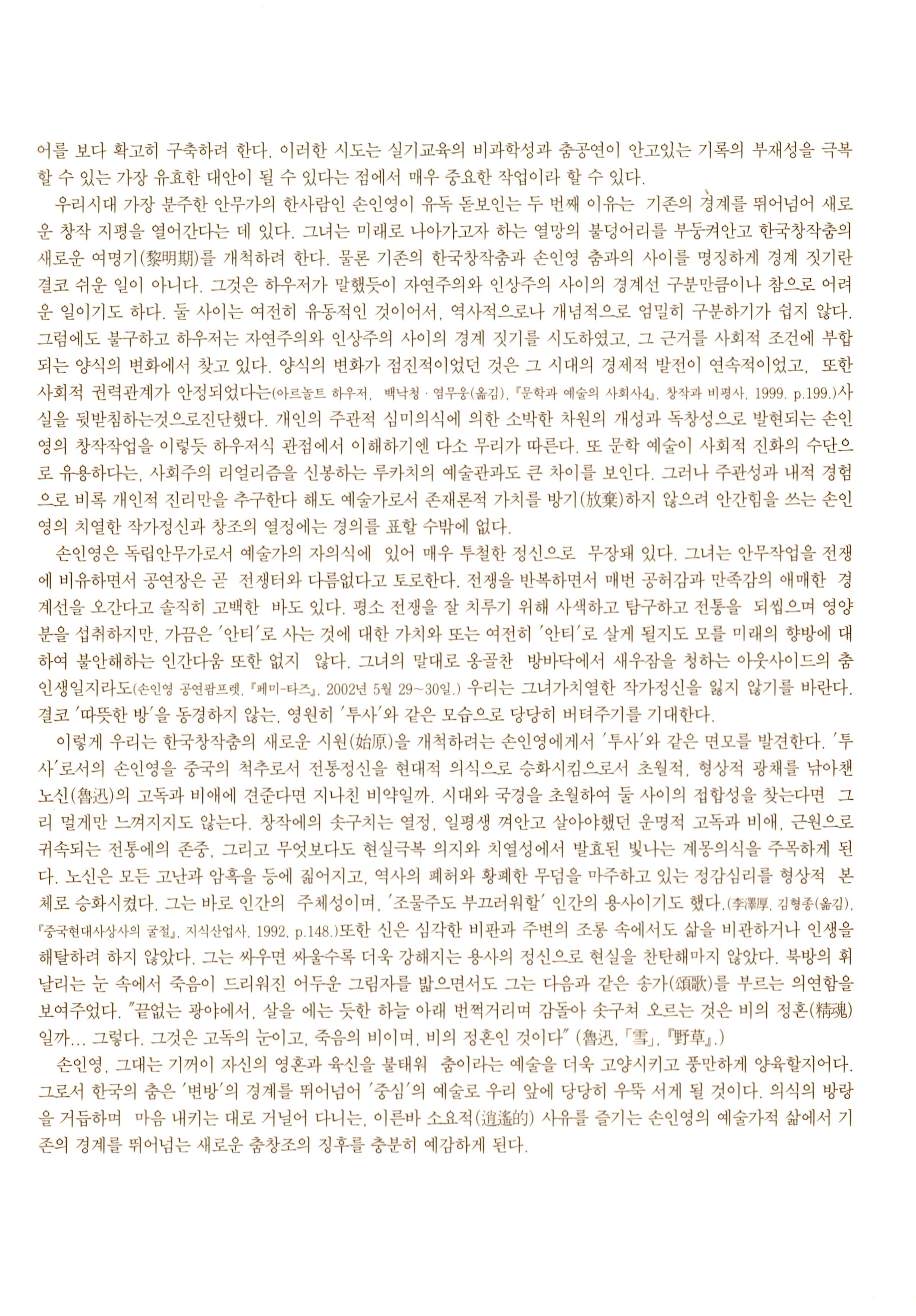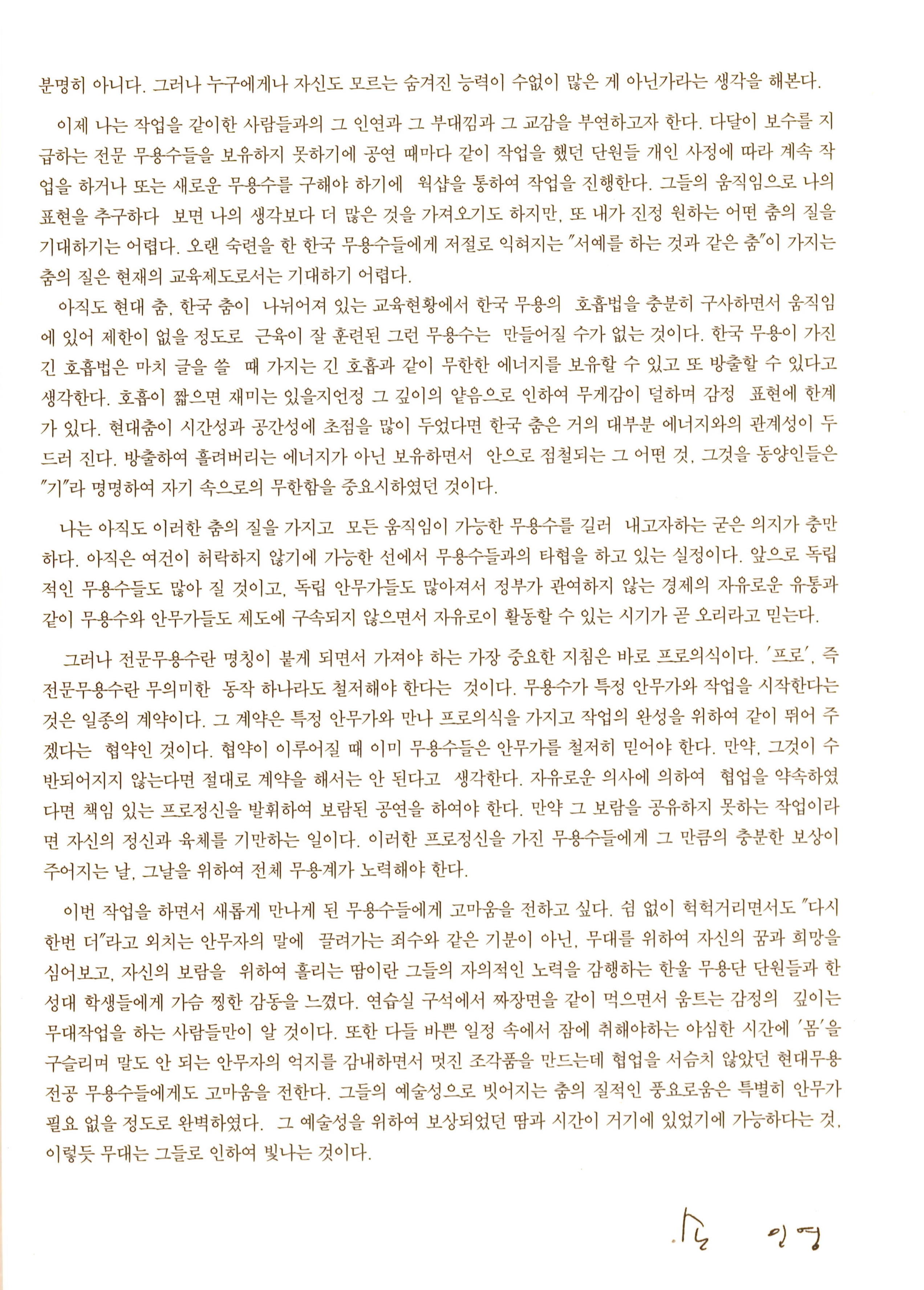 2002년 2월 26일, 27일 양일간 문예진흥원 예술극장 대극장에서 열린 손인영 NOW무용단 2003시즌 정기공연 《아바타 처용》 팜플렛이다. 기획 제작 배경, 프롤로그 '아바타 처용', 1장 '잡귀', 2장 '처용', 3장 '아바타' 에필로그 '업그레이드'로 구성된 시노십스의 내용과 사용된 음악 정보, 안무자의 변과 안무가 손인영(孫仁英) Shon In-young 소개글이 기술되어 있으며 출연자의 사진 및 명단과 약력, 스태프 소개, 작업을 준비하면서 주제와 관련된 글귀와 작업 노트, 성기숙 무용평론가의 손인영의 작품세계에 관한 평론과 손인영이 창안한 무용수들을 위한 훈련 메소드 <서예를 하는 것과 같은 춤>요약과 기본원리, 손인영 공연 리뷰가 실려 있다.