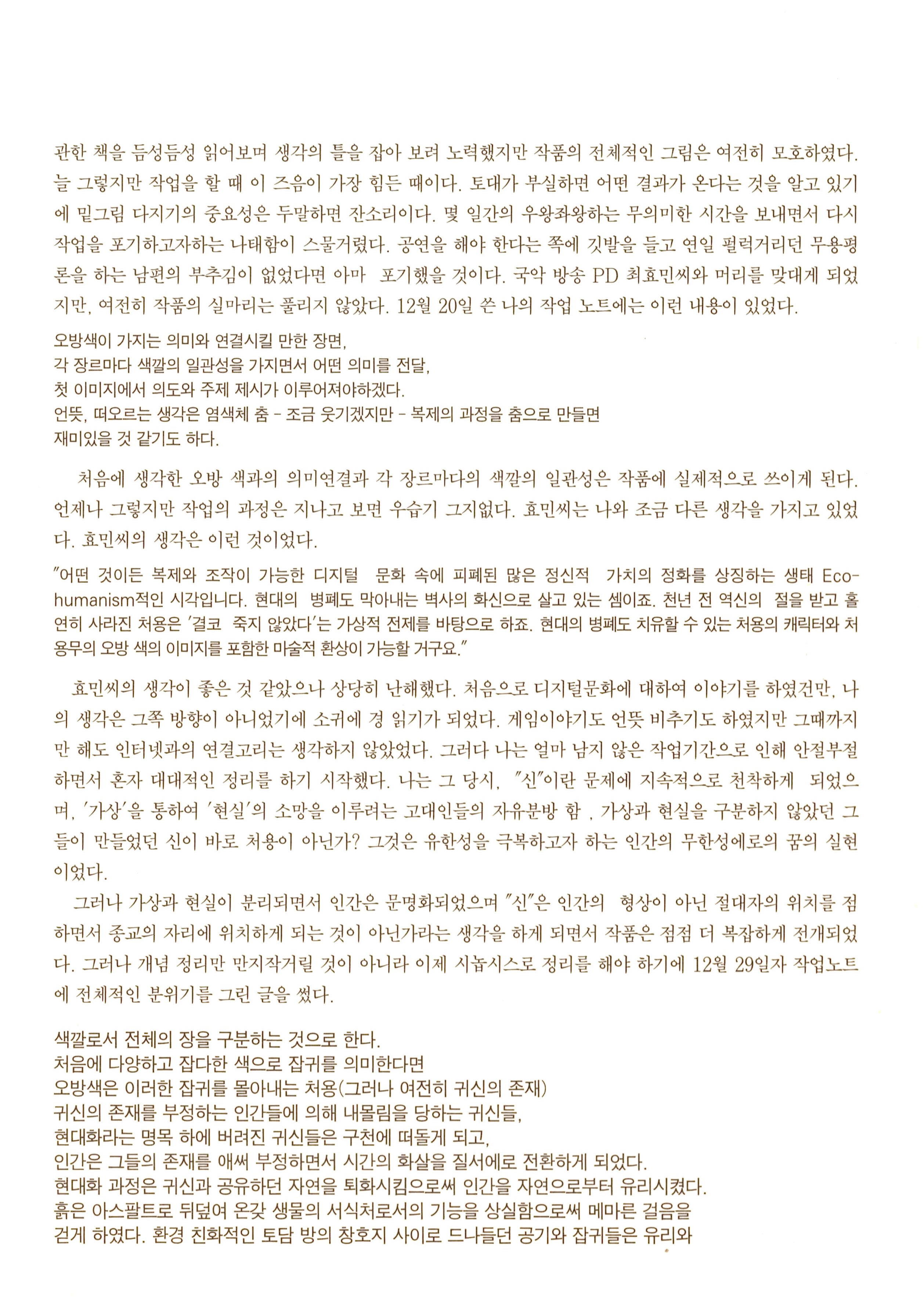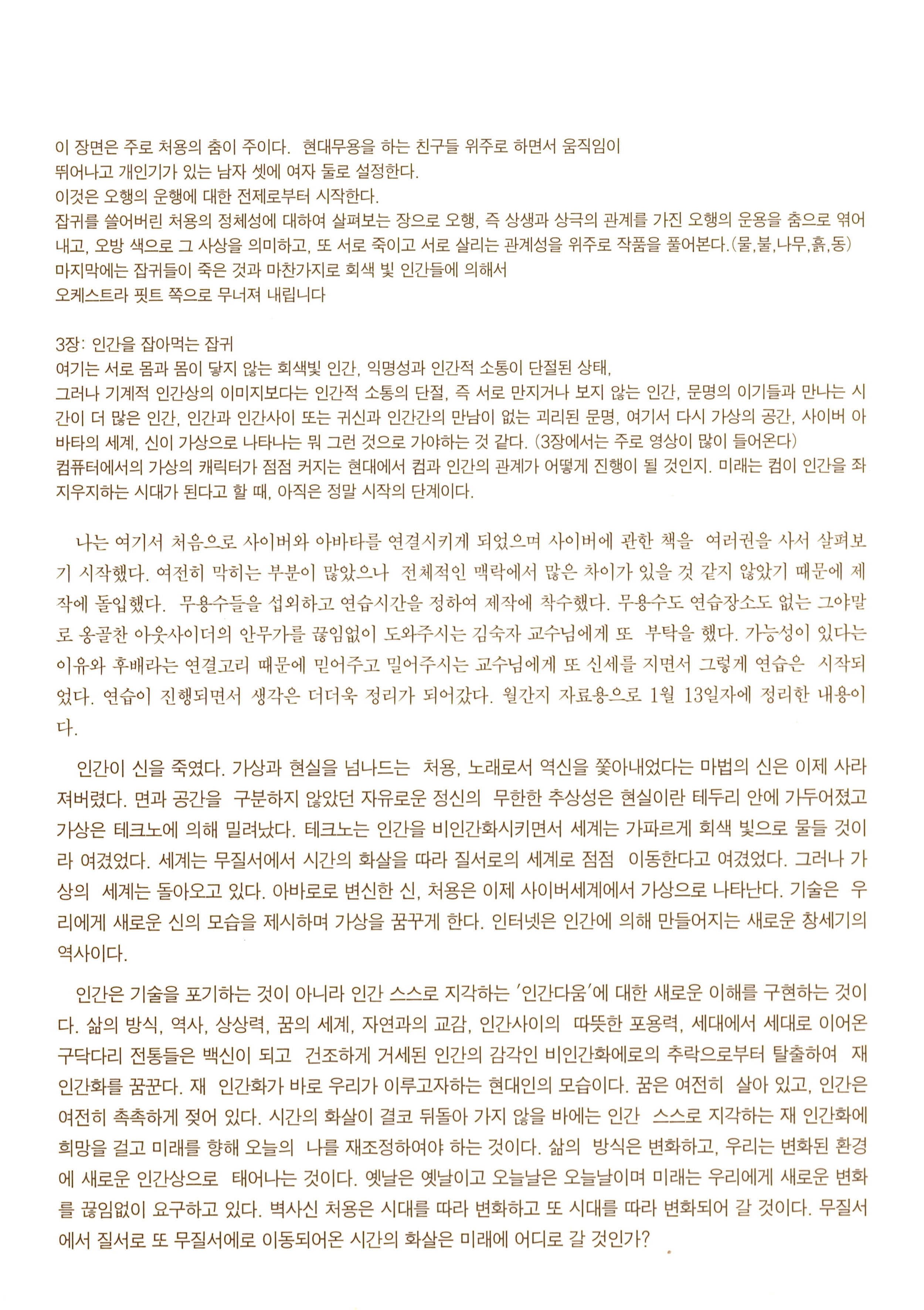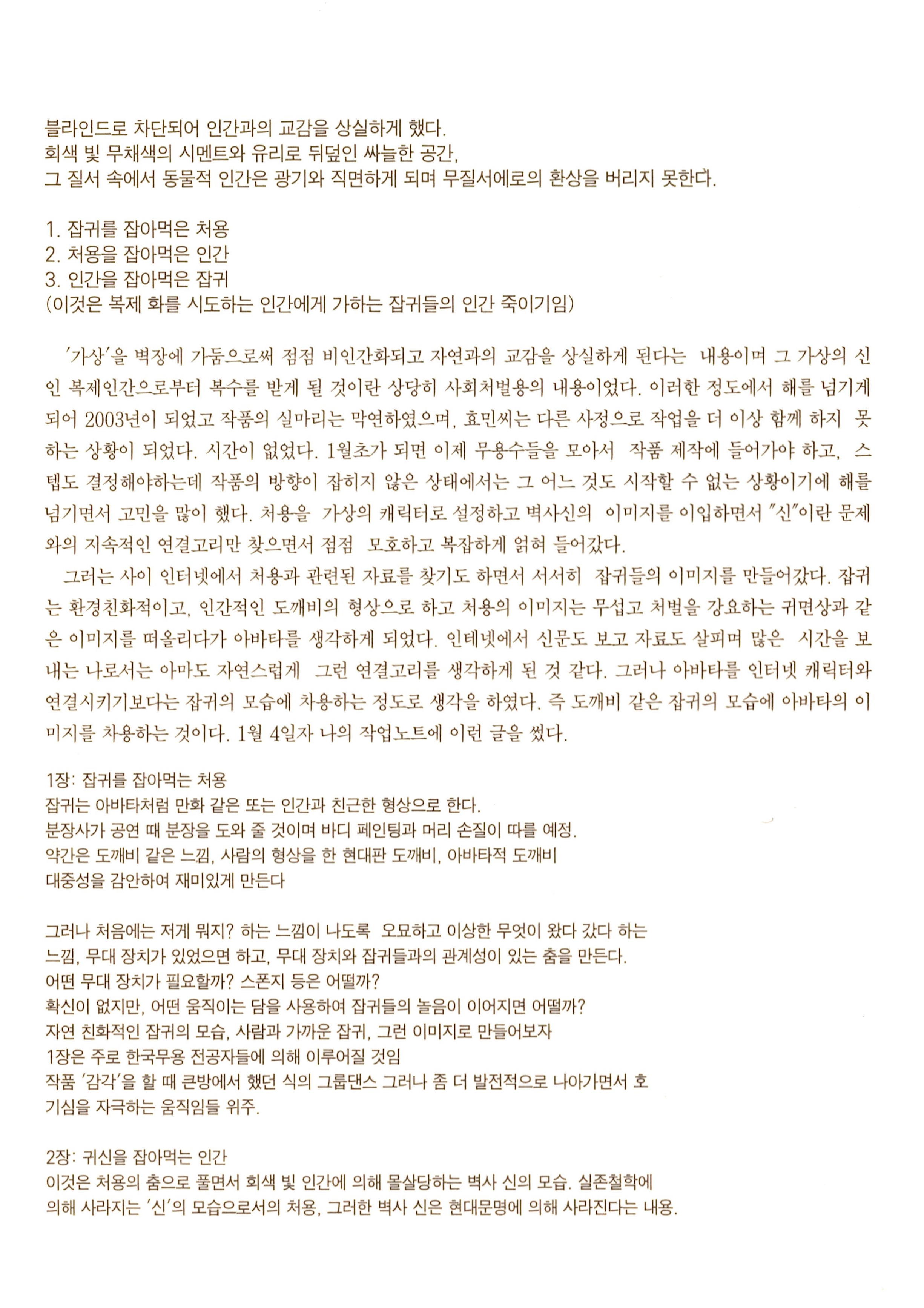 인간과 더불어 살던 도깨비같은 잡귀가 노는 가운데, 잡귀를 쫓아내고 아바타 처용이 등장하여 궁중 정재인 처용무를 추며 주위를 정화한다. 업그레이드 된 잡귀들과 처용간의 아귀다툼이 벌어지면서 가상과 현실의 분간이 묘연해진 상태에서 새롭게 진화하고자 하는 아바타 처용의 모습을 춤으로 표현한 작품이다.