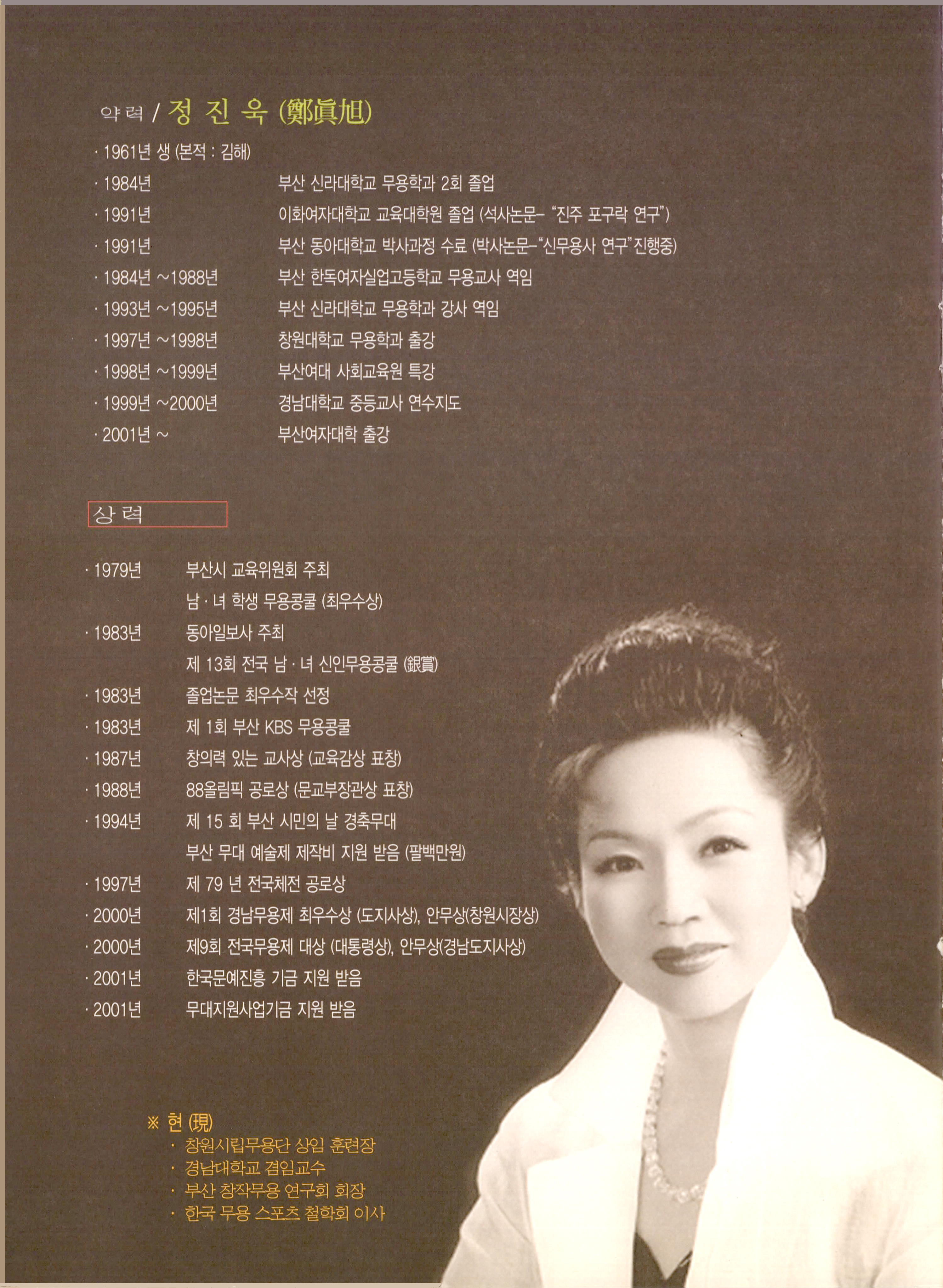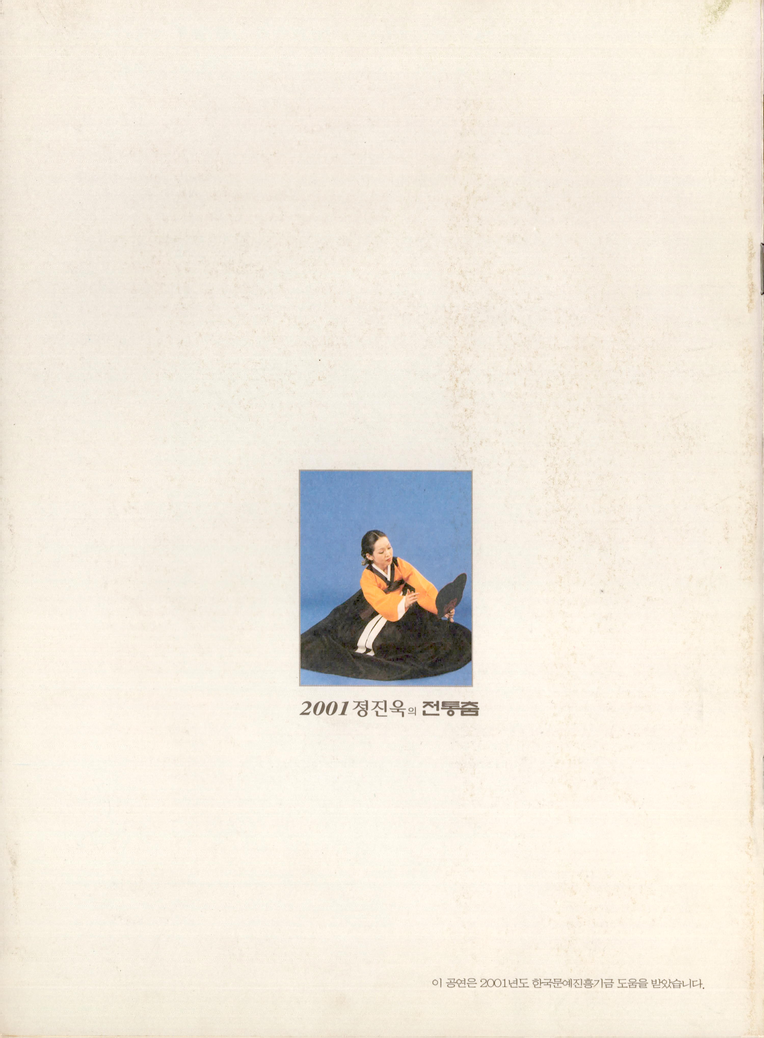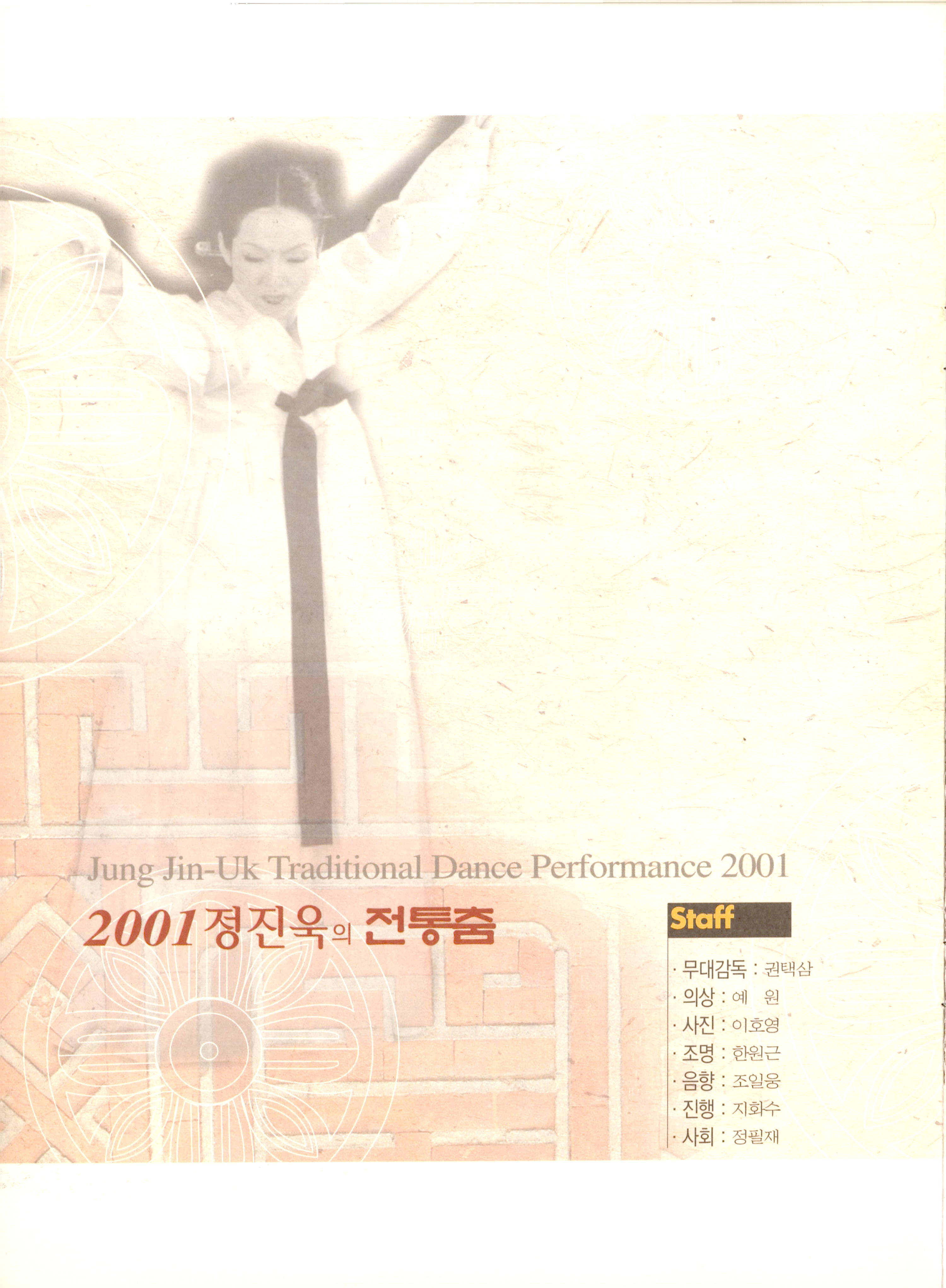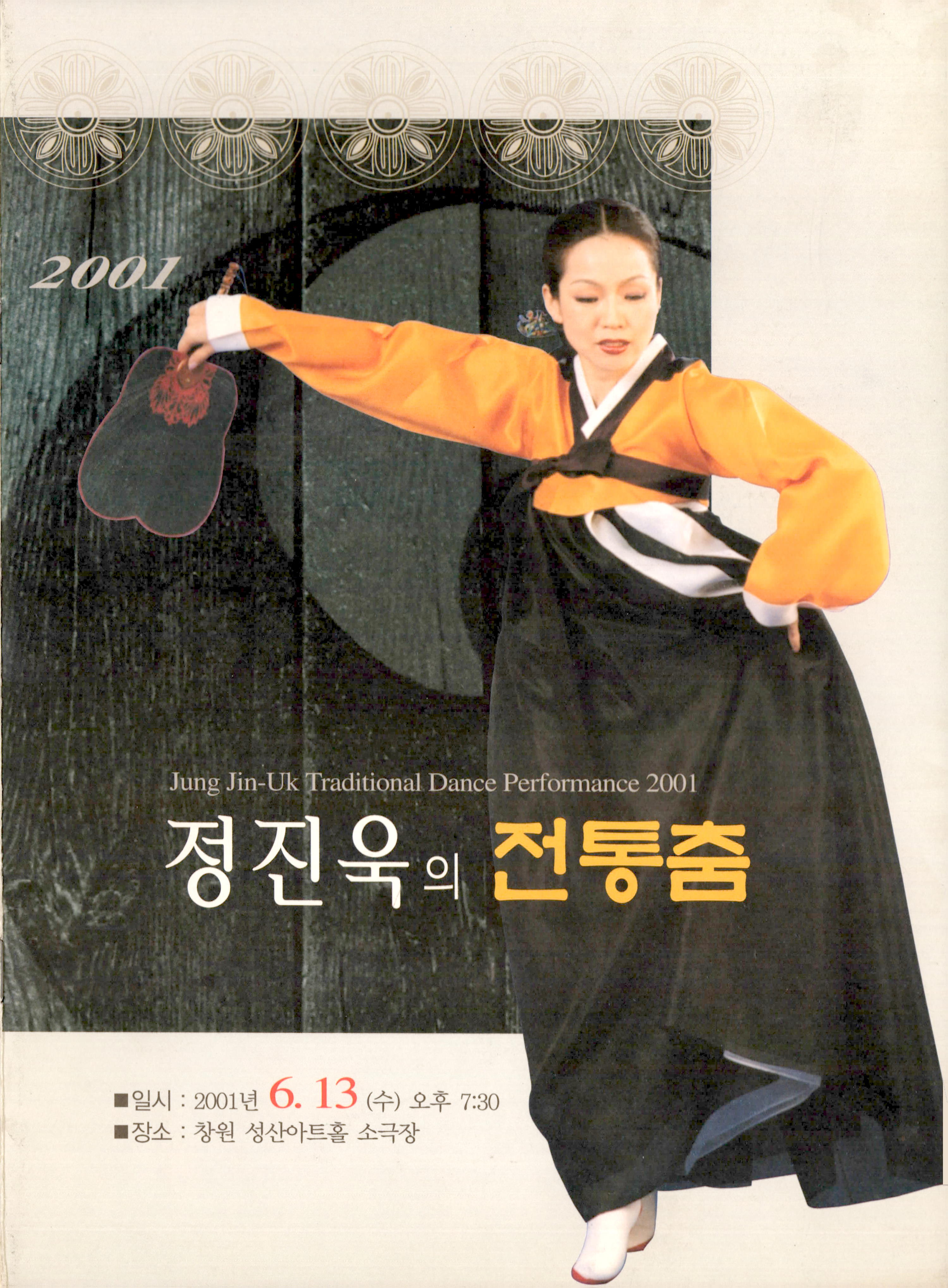 (팜플렛)2001년 6월 13일에 창원 성산아트홀 소극장에서 정진욱이 공연한 《2001 정진욱의 전통춤(Jung Jin-Uk Traditional Dance Performance 2001)》의 팜플렛이다. 팜플렛의 내용 안에는 정진욱의 인사말, 작품공연으로 '살풀이춤', '진주검무', '몽골전통무용', '산조(散調) 몸의 눈'의 줄거리가 기술되어 있으며 출연자 및 제작진의 사진·명단·약력이 기술되어 있다. 추가적으로 정진욱의 약력, 상력, 활동경력사항을 끝으로 팜플렛 구성이 끝난다.