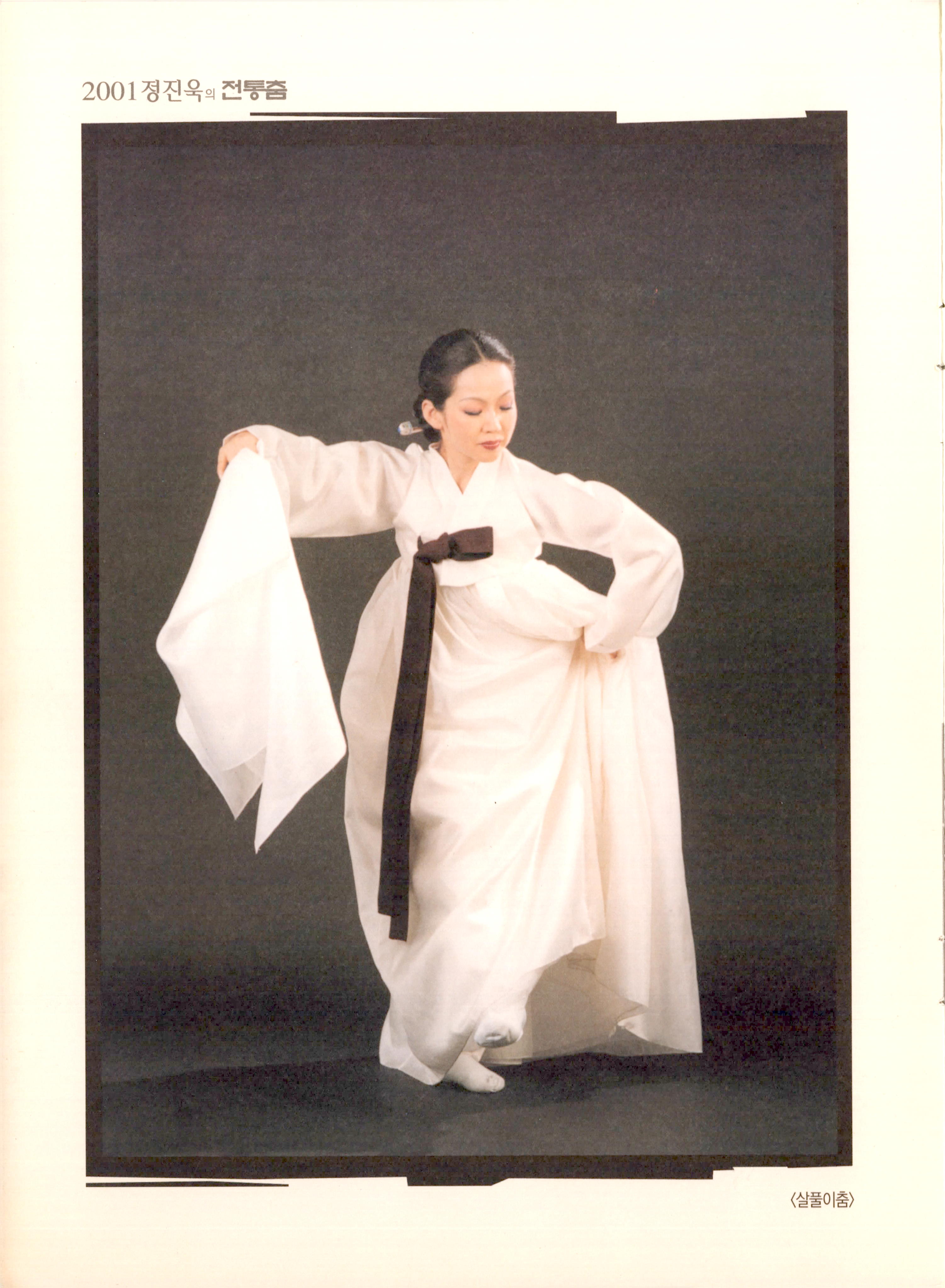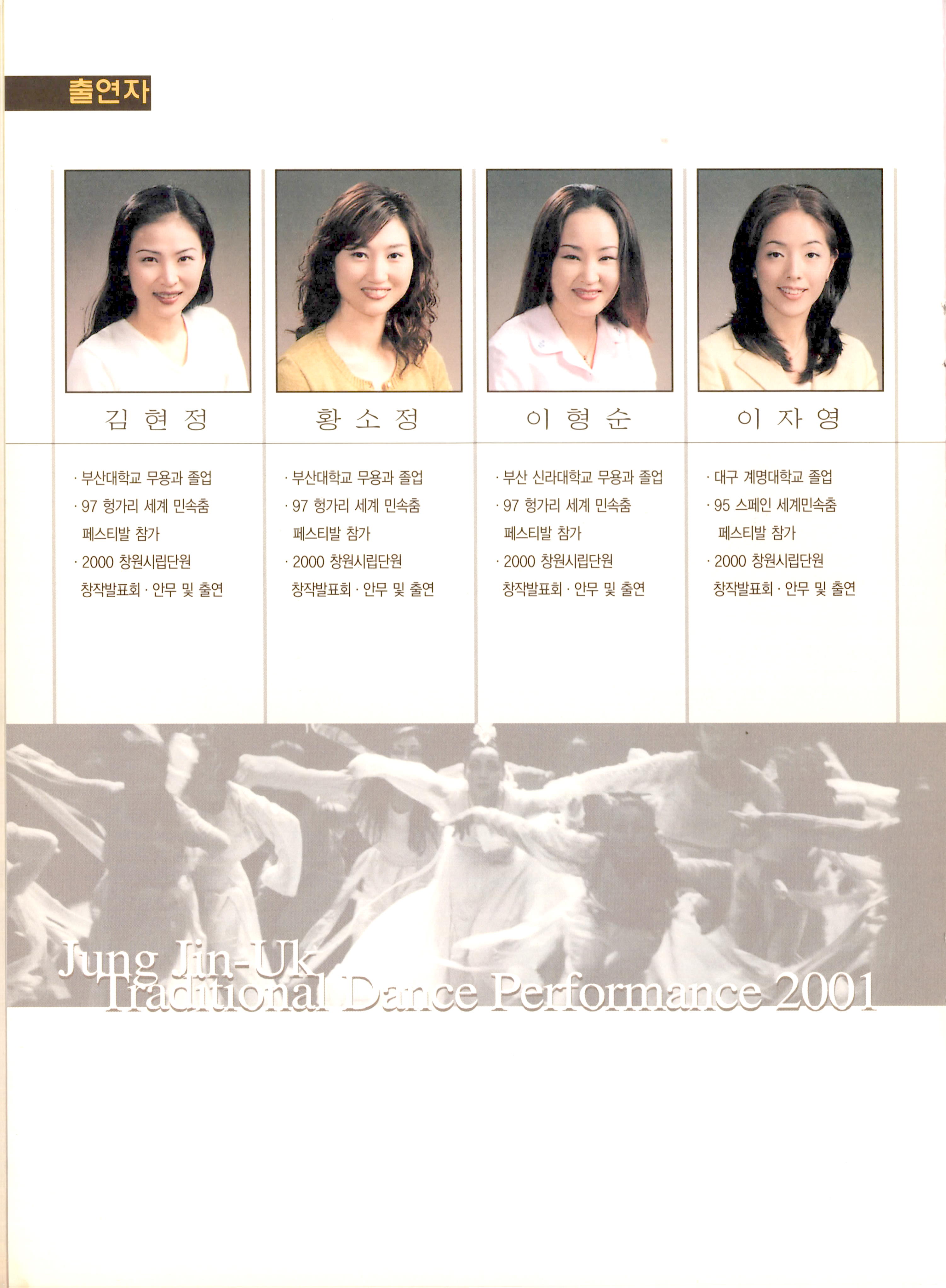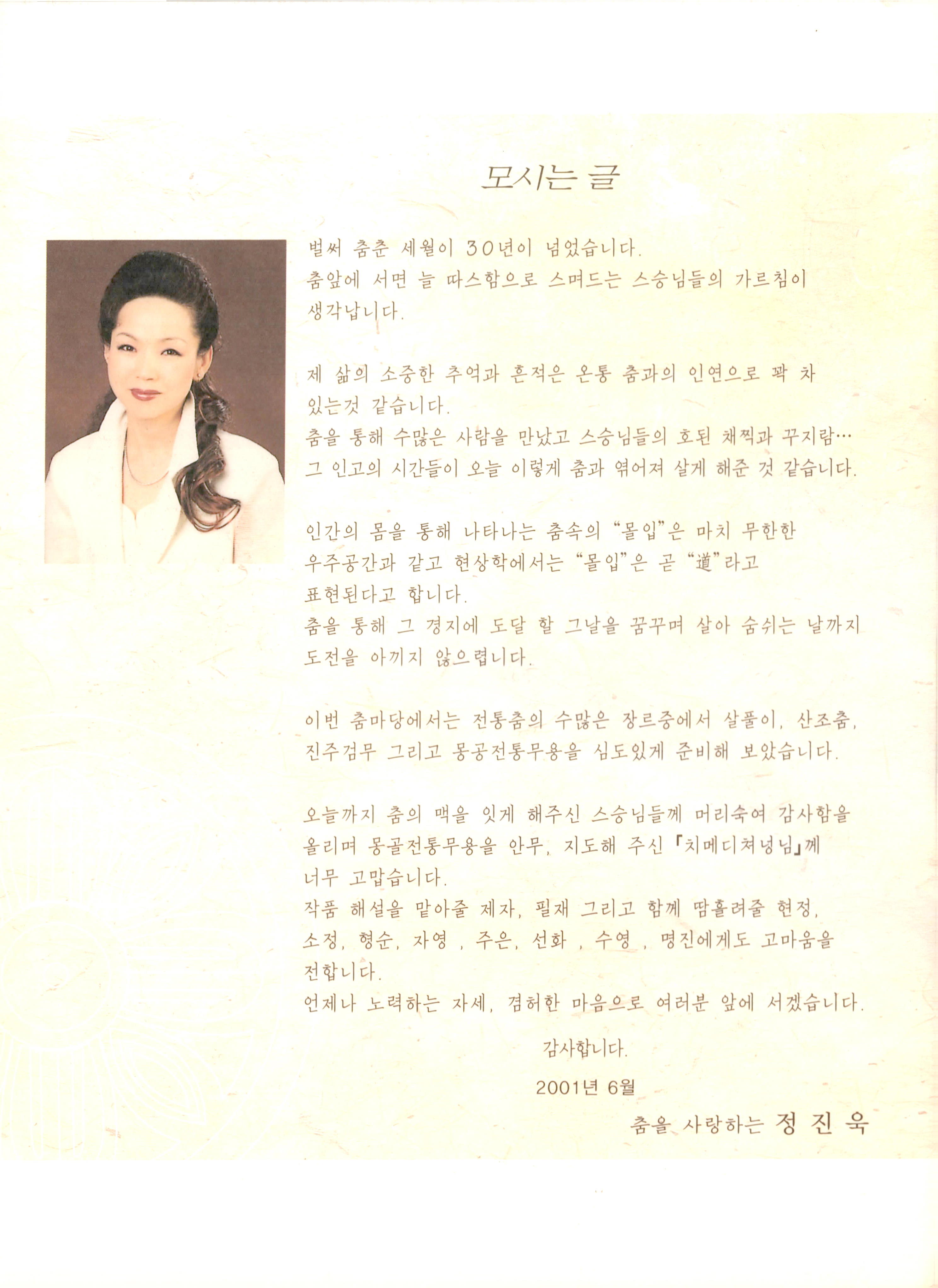 (팜플렛)2001년 6월 13일에 창원 성산아트홀 소극장에서 정진욱이 공연한 《2001 정진욱의 전통춤(Jung Jin-Uk Traditional Dance Performance 2001)》의 팜플렛이다. 팜플렛의 내용 안에는 정진욱의 인사말, 작품공연으로 '살풀이춤', '진주검무', '몽골전통무용', '산조(散調) 몸의 눈'의 줄거리가 기술되어 있으며 출연자 및 제작진의 사진·명단·약력이 기술되어 있다. 추가적으로 정진욱의 약력, 상력, 활동경력사항을 끝으로 팜플렛 구성이 끝난다.