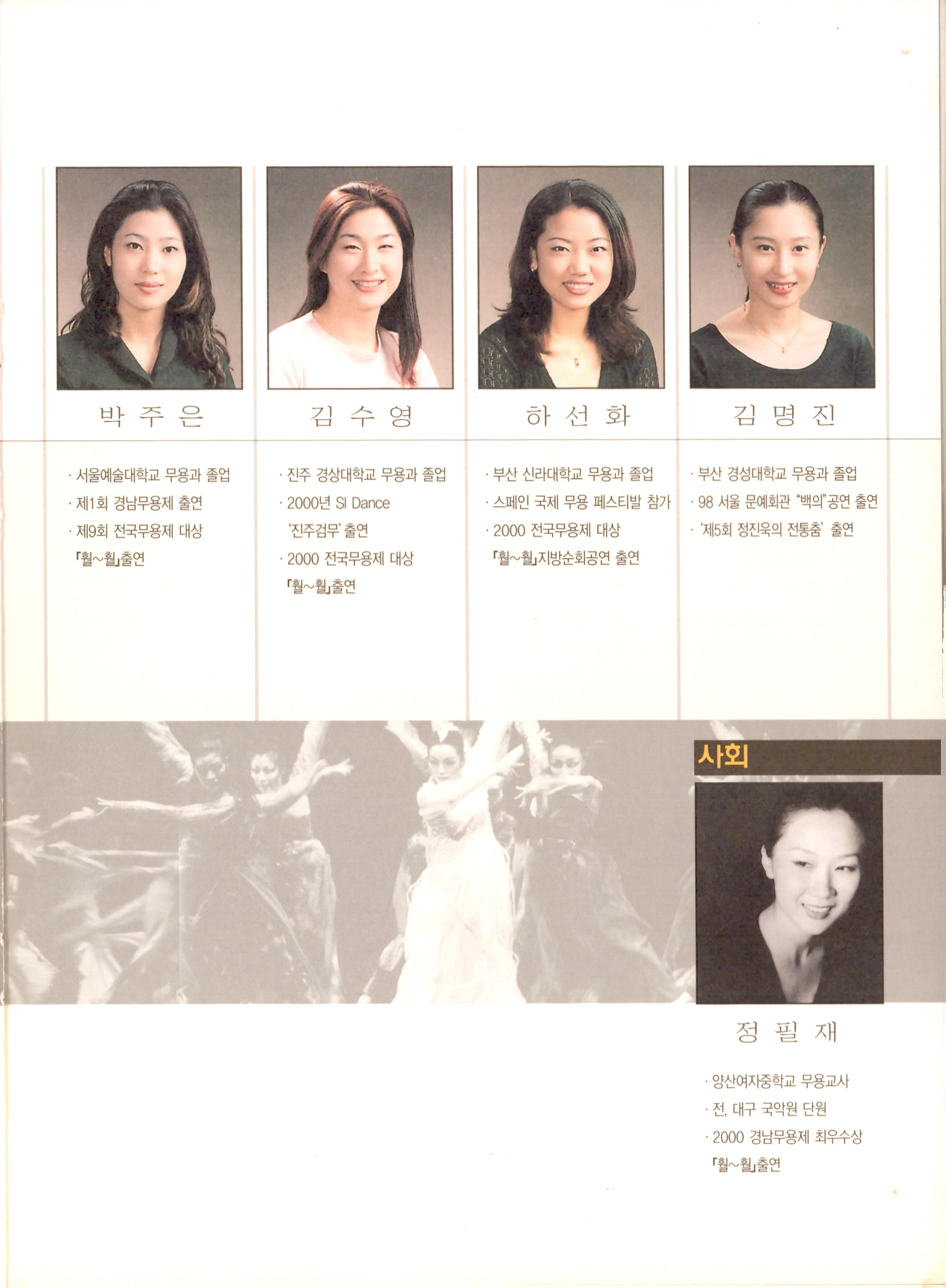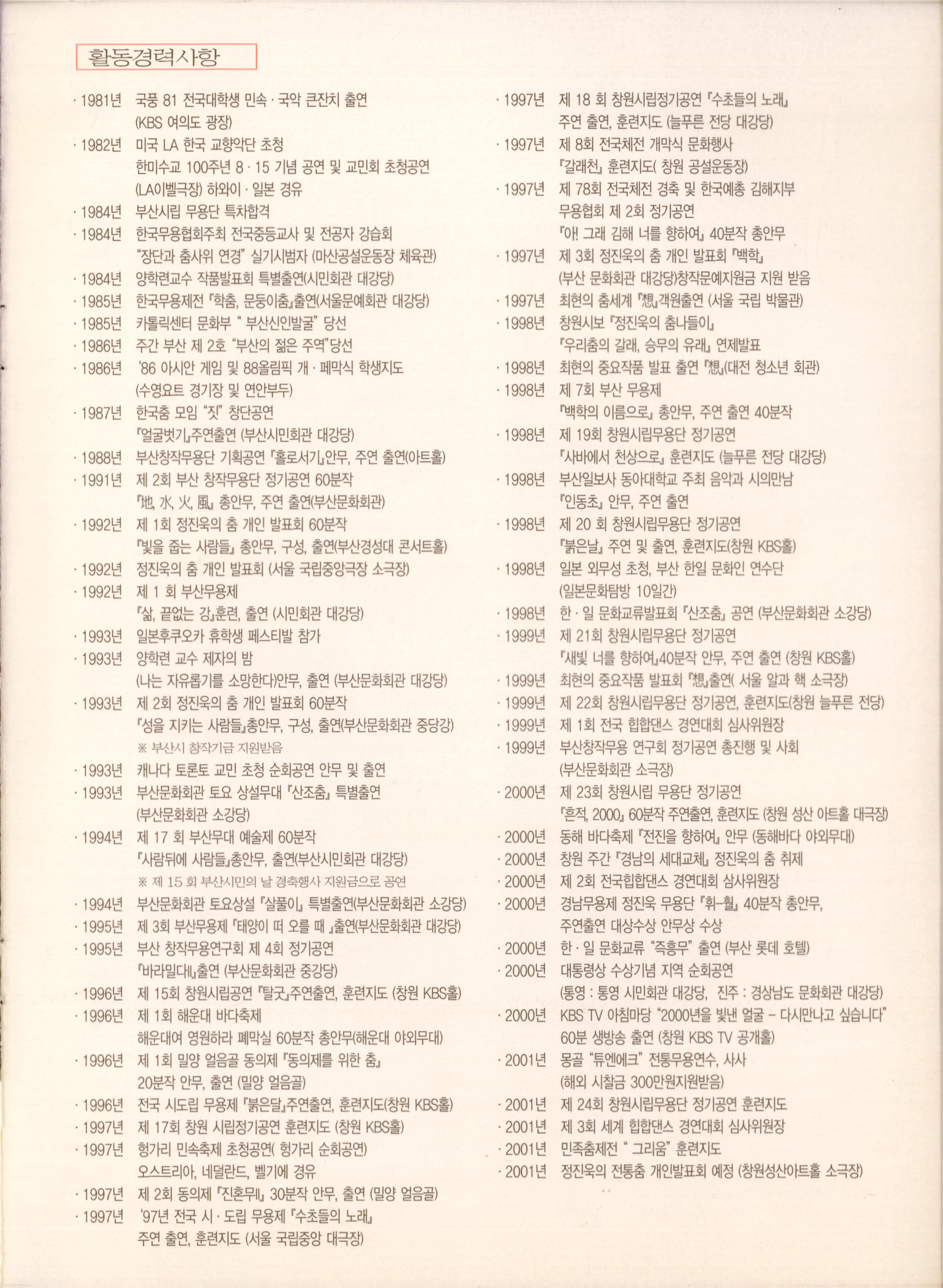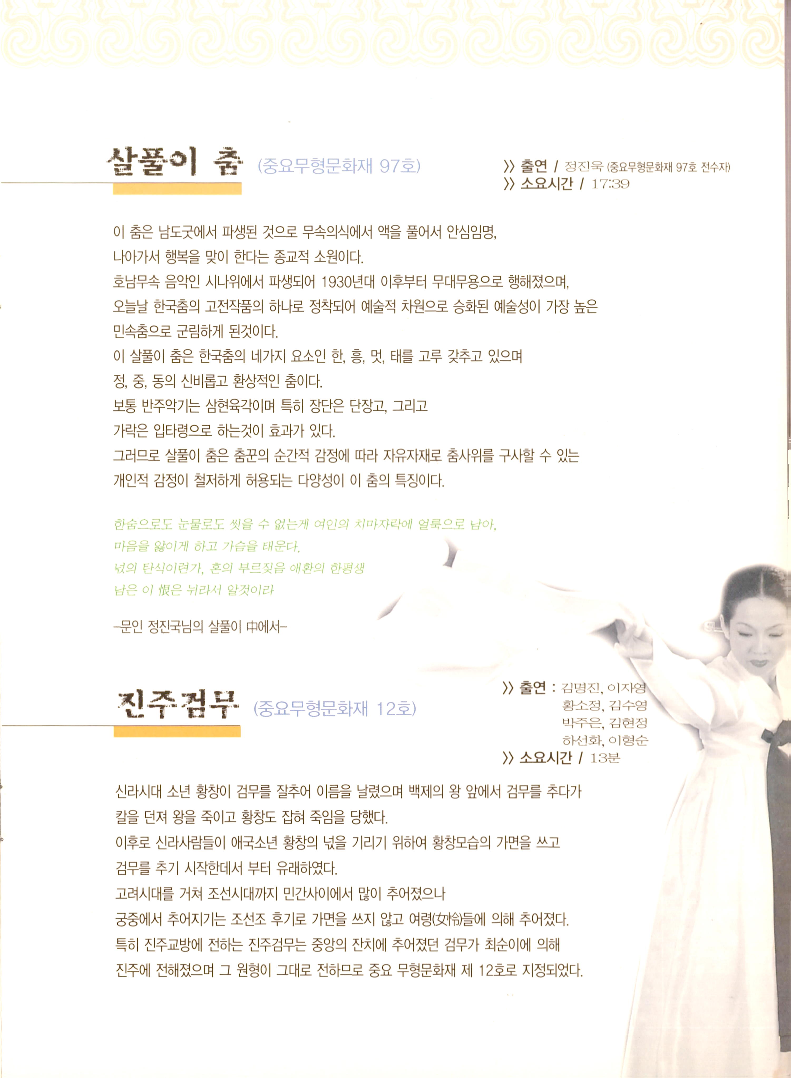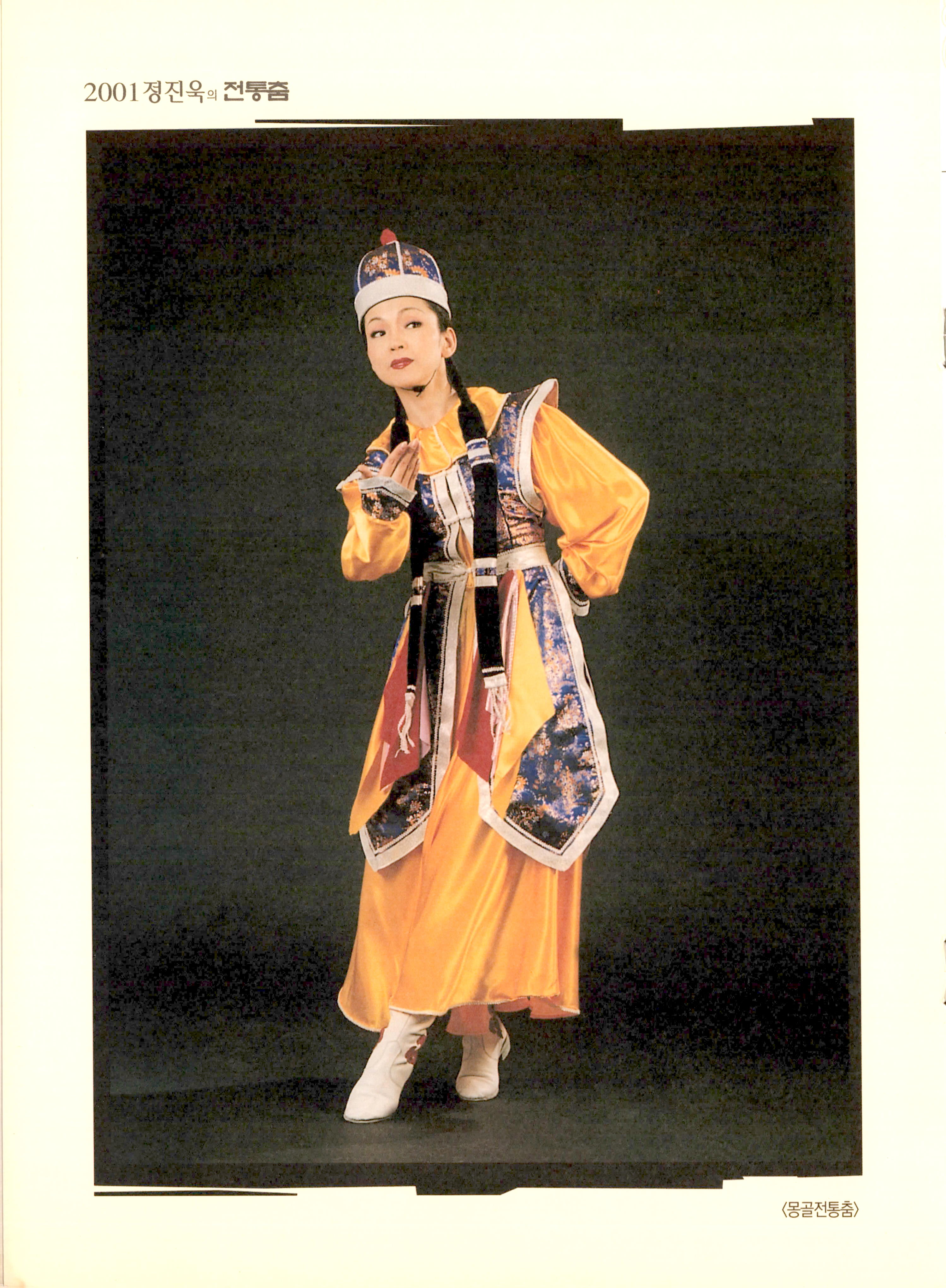 (팜플렛)2001년 6월 13일에 창원 성산아트홀 소극장에서 정진욱이 공연한 《2001 정진욱의 전통춤(Jung Jin-Uk Traditional Dance Performance 2001)》의 팜플렛이다. 팜플렛의 내용 안에는 정진욱의 인사말, 작품공연으로 '살풀이춤', '진주검무', '몽골전통무용', '산조(散調) 몸의 눈'의 줄거리가 기술되어 있으며 출연자 및 제작진의 사진·명단·약력이 기술되어 있다. 추가적으로 정진욱의 약력, 상력, 활동경력사항을 끝으로 팜플렛 구성이 끝난다.