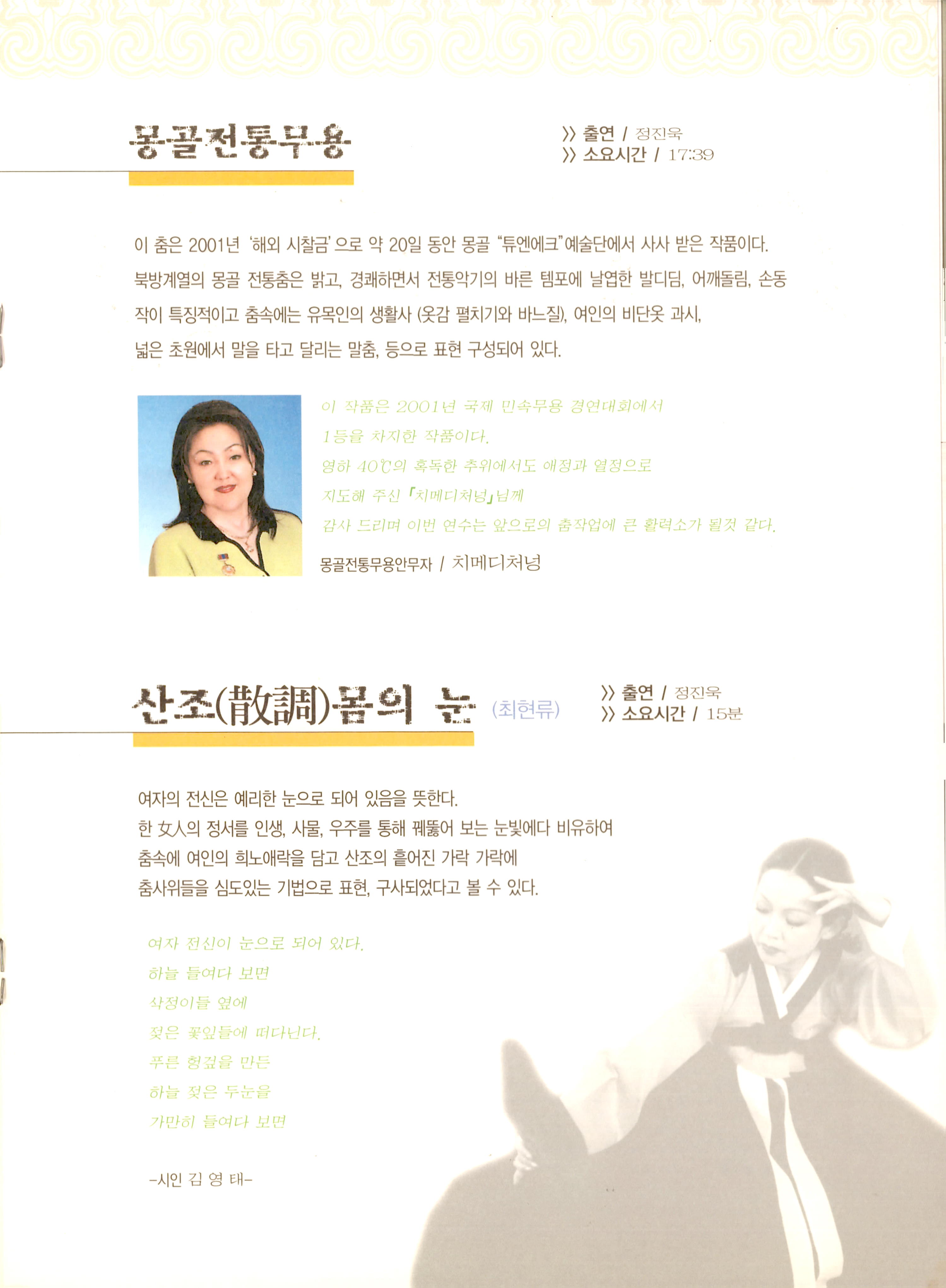 2001년 '해외 시찰금'으로 약 20일 동안 몽골 "튜엔에크" 예술단이 사사한 작품이다. 북방 계열의 몽골 전통춤은 밝고, 경쾌하면서 전통악기의 빠른 템포에 날렵한 발디딤, 어깨 돌림, 손동작이 특징인 춤이다.