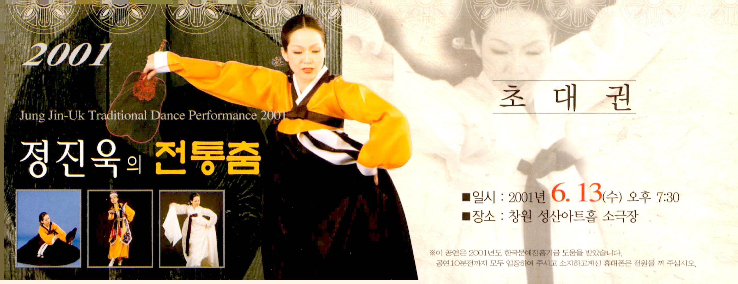 (초대권)2001년 6월 13일에 창원 성산아트홀 소극장에서 정진욱이 공연한 《2001 정진욱의 전통춤(Jung Jin-Uk Traditional Dance Performance 2001)》의 초대권이다. 초대권의 내용에는 공연일시, 장소, 유의사항이 기술되어 있다.