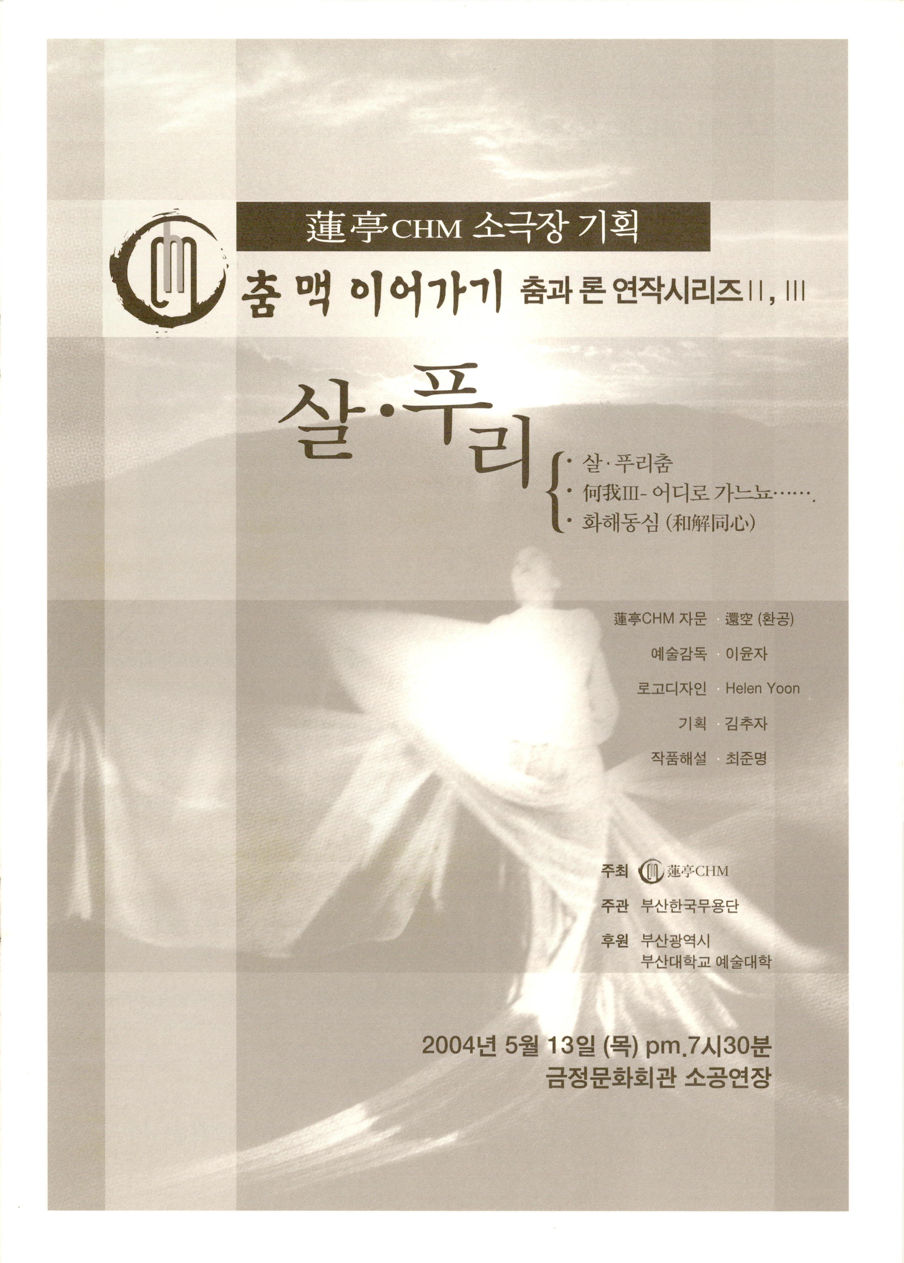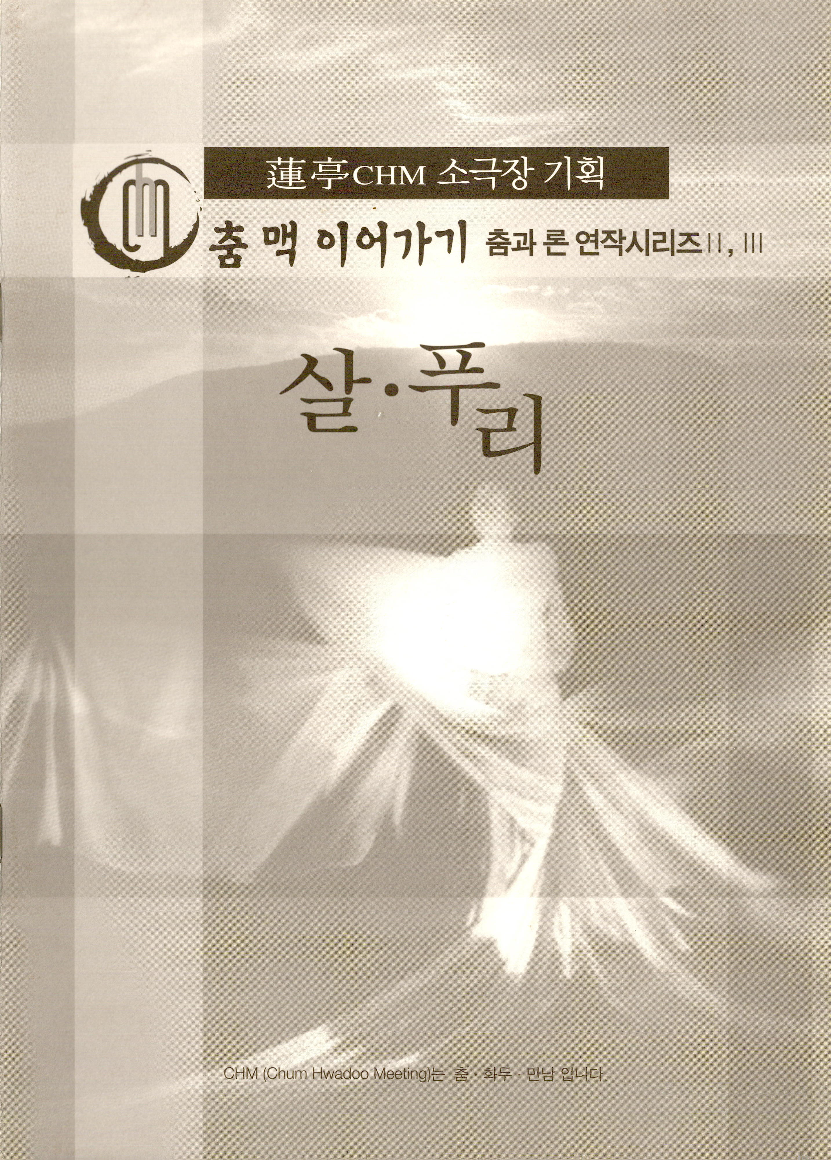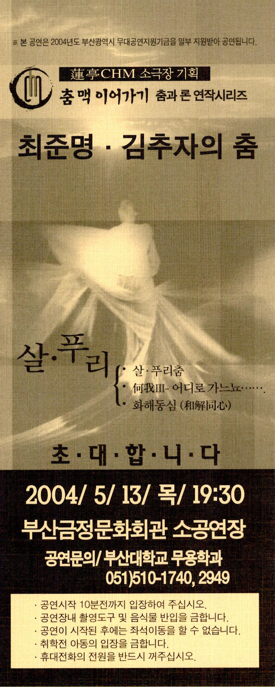 (팜플렛) 2004년 5월 13일 금정문화회관 소공연장에서 공연된 《蓮亭(연정)CHM 소극장 기획 "춤 맥 이어가기 춤과 론 연작시리즈 Ⅱ, Ⅲ -살, 푸리-"》의 팜플렛이다. 티켓을 포함한 구성이며 프로그램과 STAFF들이 나열되어 있고, 춤 전수회장 김추자의 '보은의 마음을 춤으로 배례하며 글과 이윤자의 '회향 그리고 쉼'글이 기술되어 있고, 최준명의 연혁과 '몸과 마음을 다스리며…'글이 기술되어 있다. 연이어 프로그램 소개글이 기술되어 있고 김추자의 연혁이 '마음의 거울을 닦으며...'글과 함께 기술되어 있다. 마지막으로 공연예술평론가 김환의 전통의 포대에 감싸진 창작글을 끝으로 팜플렛 구성이 끝난다.