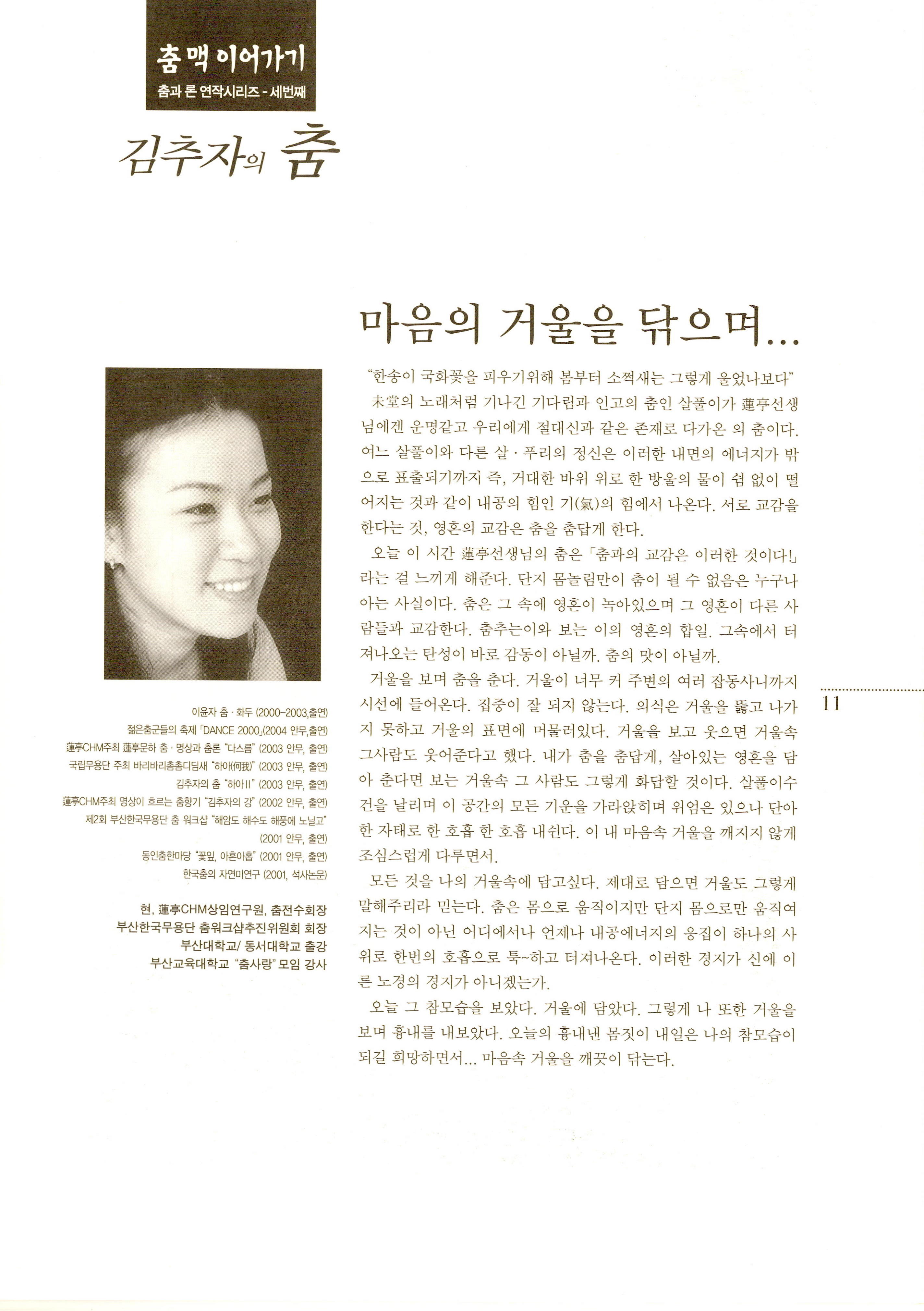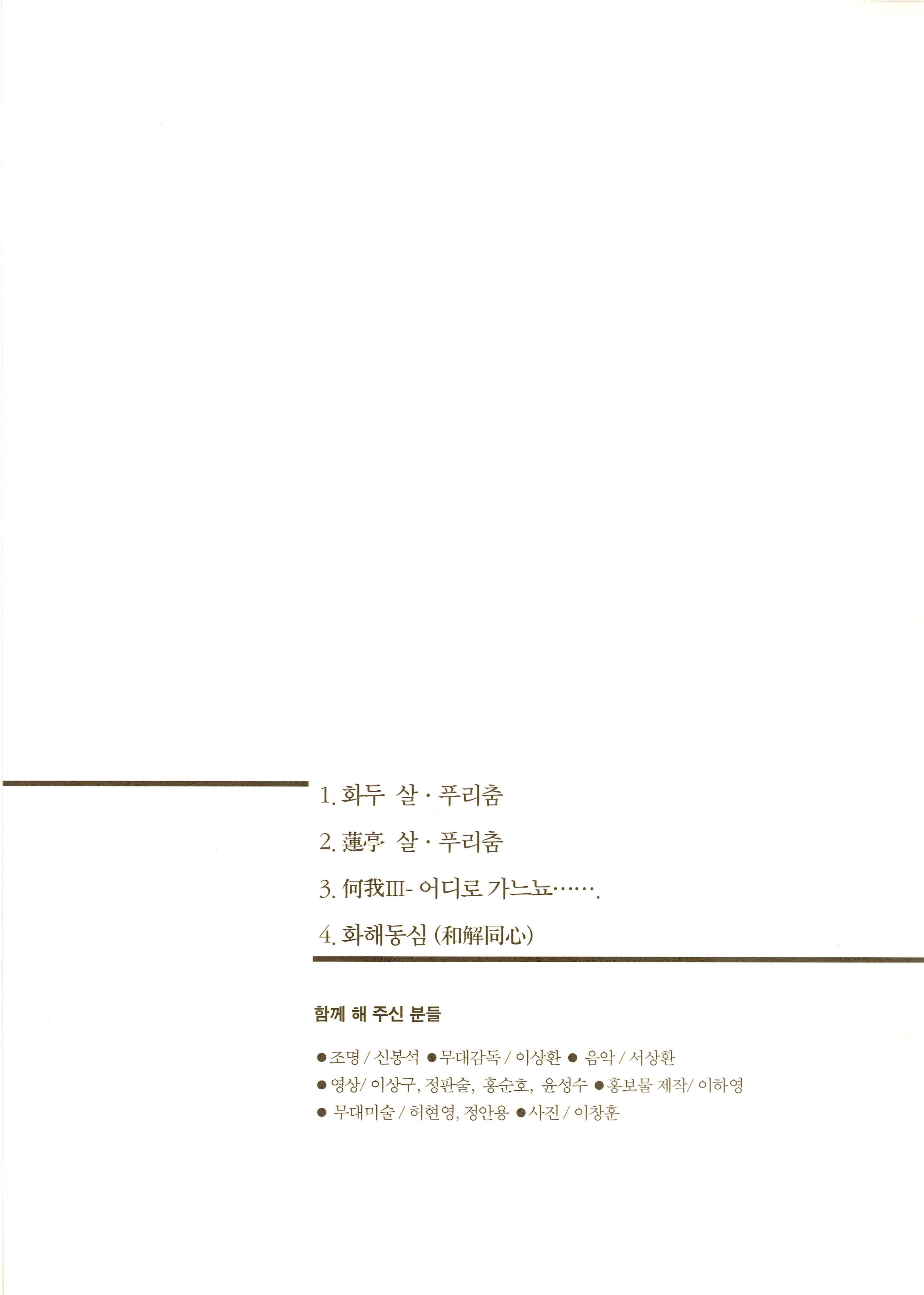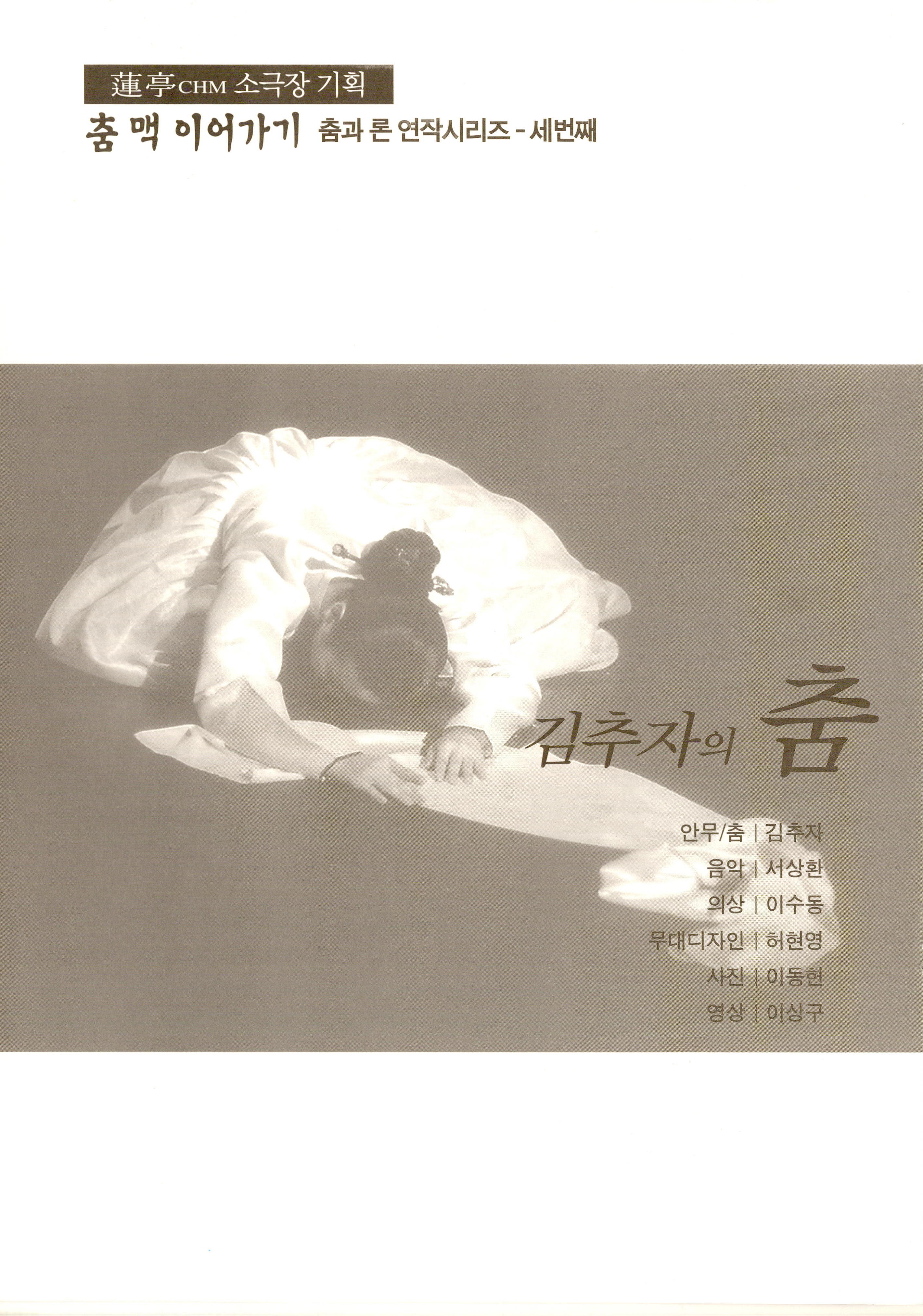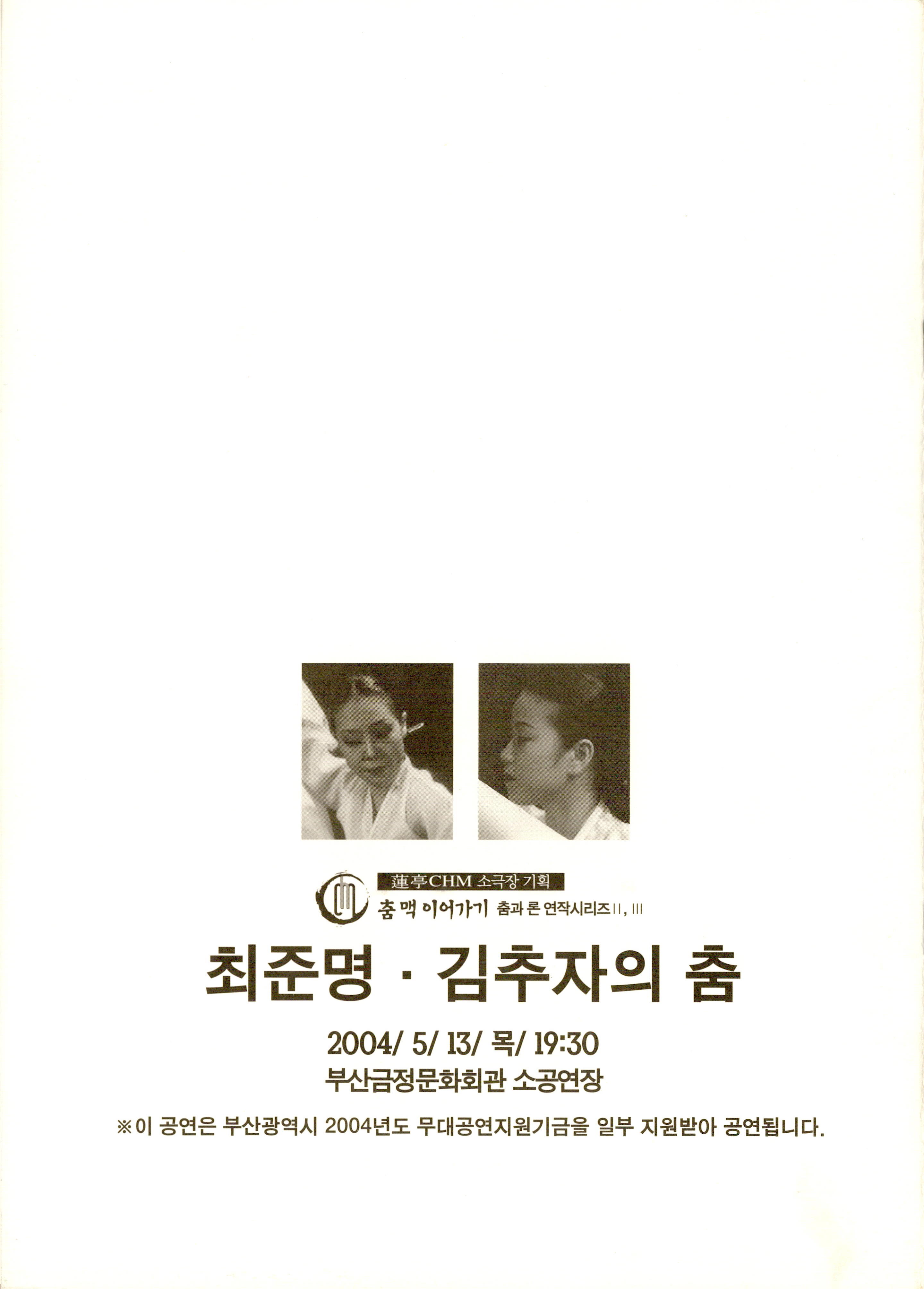(팜플렛) 2004년 5월 13일 금정문화회관 소공연장에서 공연된 《蓮亭(연정)CHM 소극장 기획 "춤 맥 이어가기 춤과 론 연작시리즈 Ⅱ, Ⅲ -살, 푸리-"》의 팜플렛이다. 티켓을 포함한 구성이며 프로그램과 STAFF들이 나열되어 있고, 춤 전수회장 김추자의 '보은의 마음을 춤으로 배례하며 글과 이윤자의 '회향 그리고 쉼'글이 기술되어 있고, 최준명의 연혁과 '몸과 마음을 다스리며…'글이 기술되어 있다. 연이어 프로그램 소개글이 기술되어 있고 김추자의 연혁이 '마음의 거울을 닦으며...'글과 함께 기술되어 있다. 마지막으로 공연예술평론가 김환의 전통의 포대에 감싸진 창작글을 끝으로 팜플렛 구성이 끝난다.