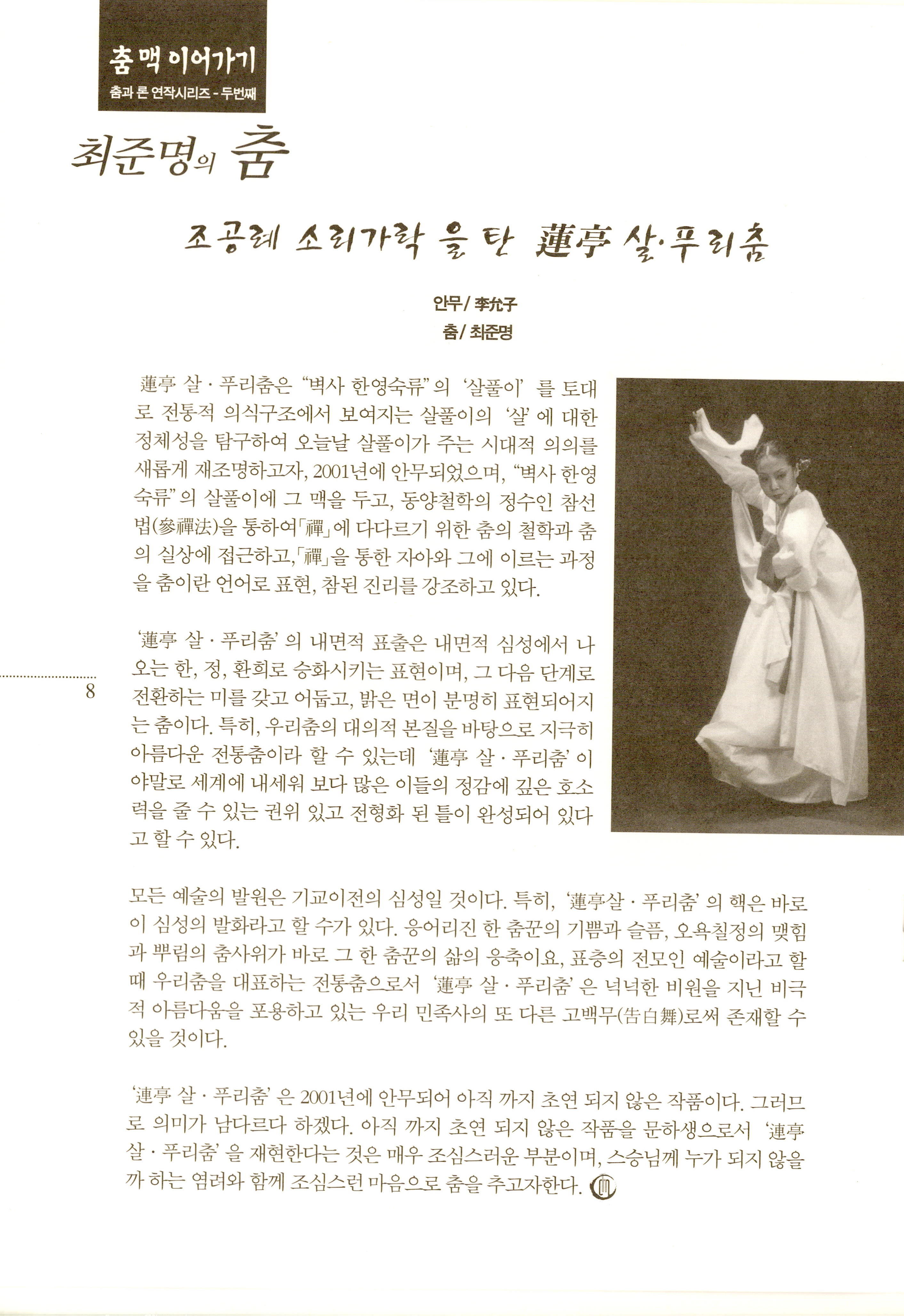 춤과 론 연작시리즈 두 번째로 최준명의 춤으로 공연되었다. 蓮亭(연정) 살 · 푸리춤의 내면적 표출은 내면적 심성에서 나오는 한, 정, 환희로 승화시키는 표현이며, 그 다음 단계로 전환하는 미를 갖고 어둡고 밝은면이 분명히 표현되어 지는 춤이다.