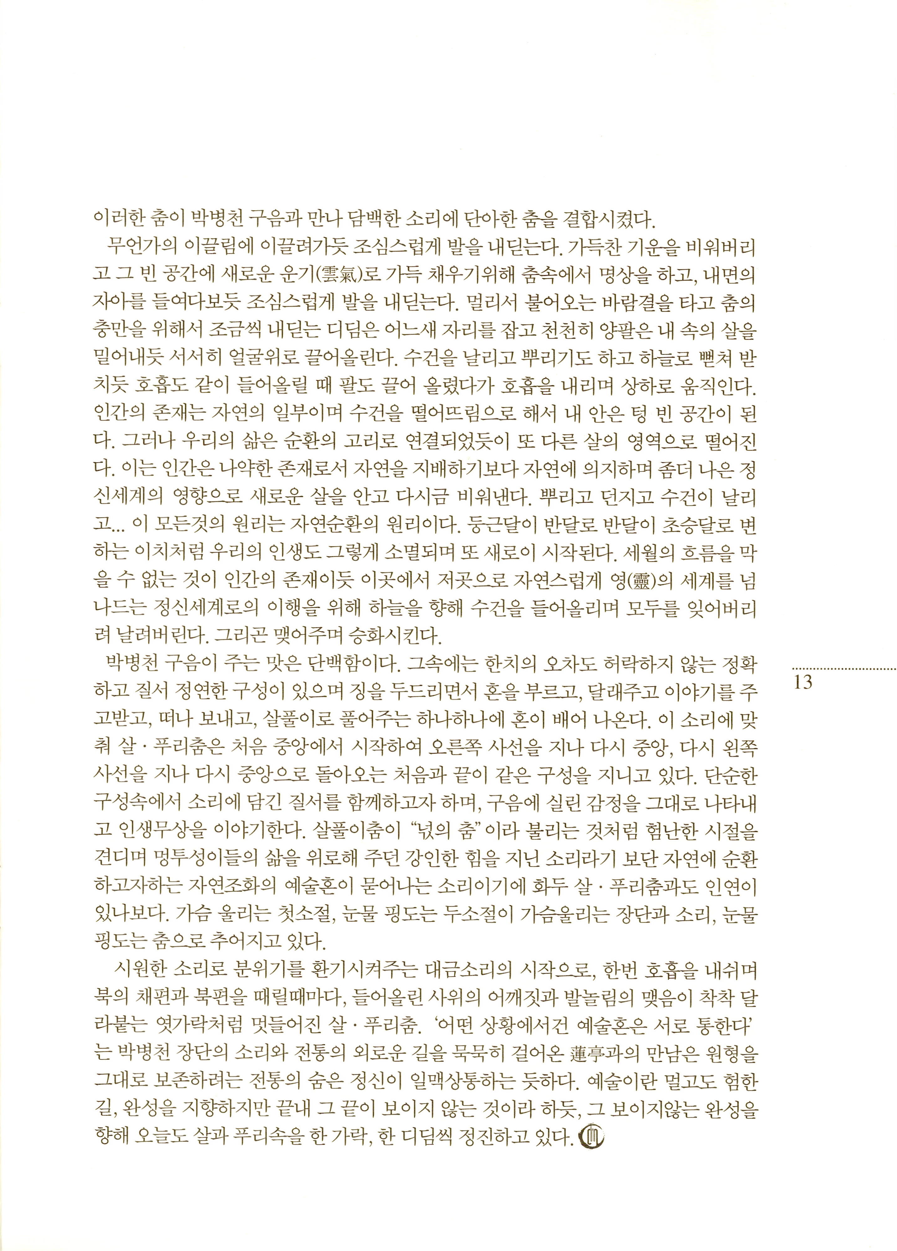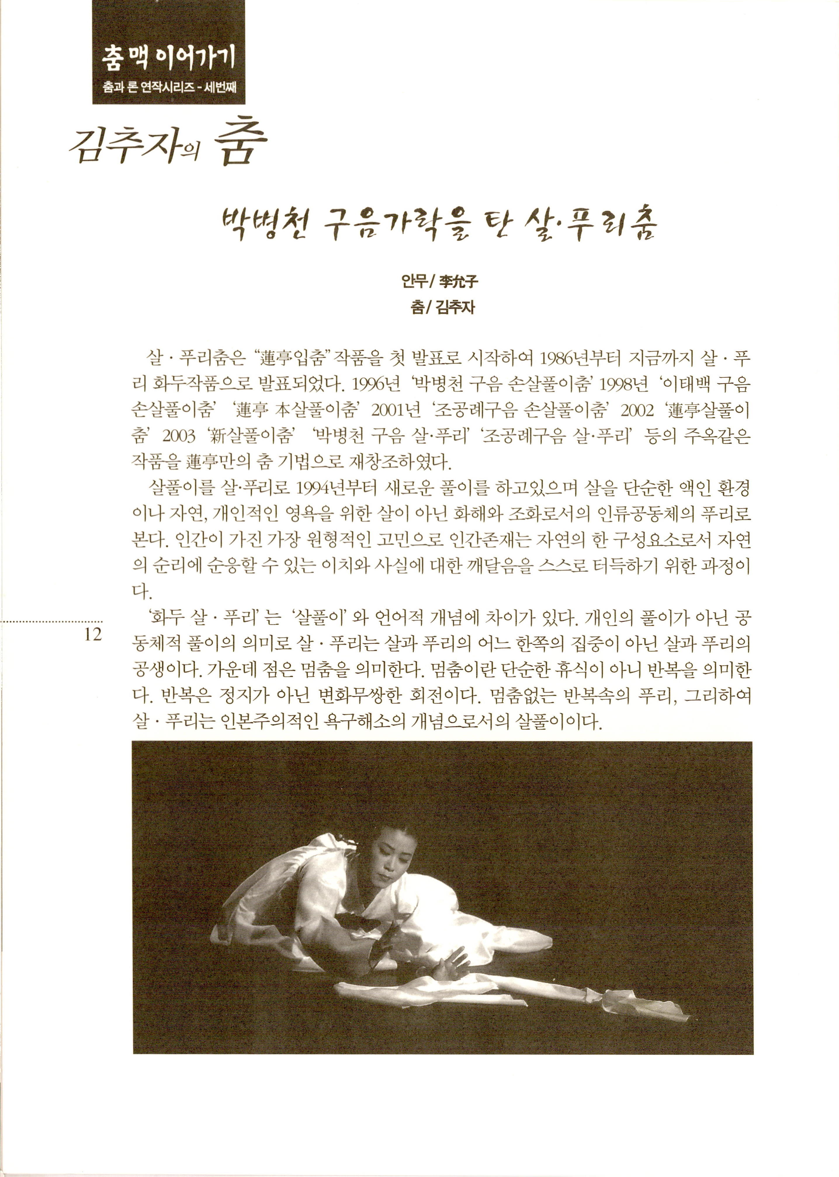 춤과 론 연작시리즈 세번째로 김추자의 춤으로 공연되었다. 살풀이를 살을 단순한 액인 환경이나 자연, 개인적인 영욕을 위한 살이 아닌 화해와 조화로서의 인류공동체의 푸리로 보는데 인간이 가진 가장 원형적인 고민으로 인간존재는 자연의 한 구성요소로서 자연의 순리에 순응할 수 있는 이치와 사실에 대한 깨달음을 스스로 터득하기 위한 과정의 춤이 박병천 구음과 만나 담백한 소리에 단아한 춤을 결합시켰다.