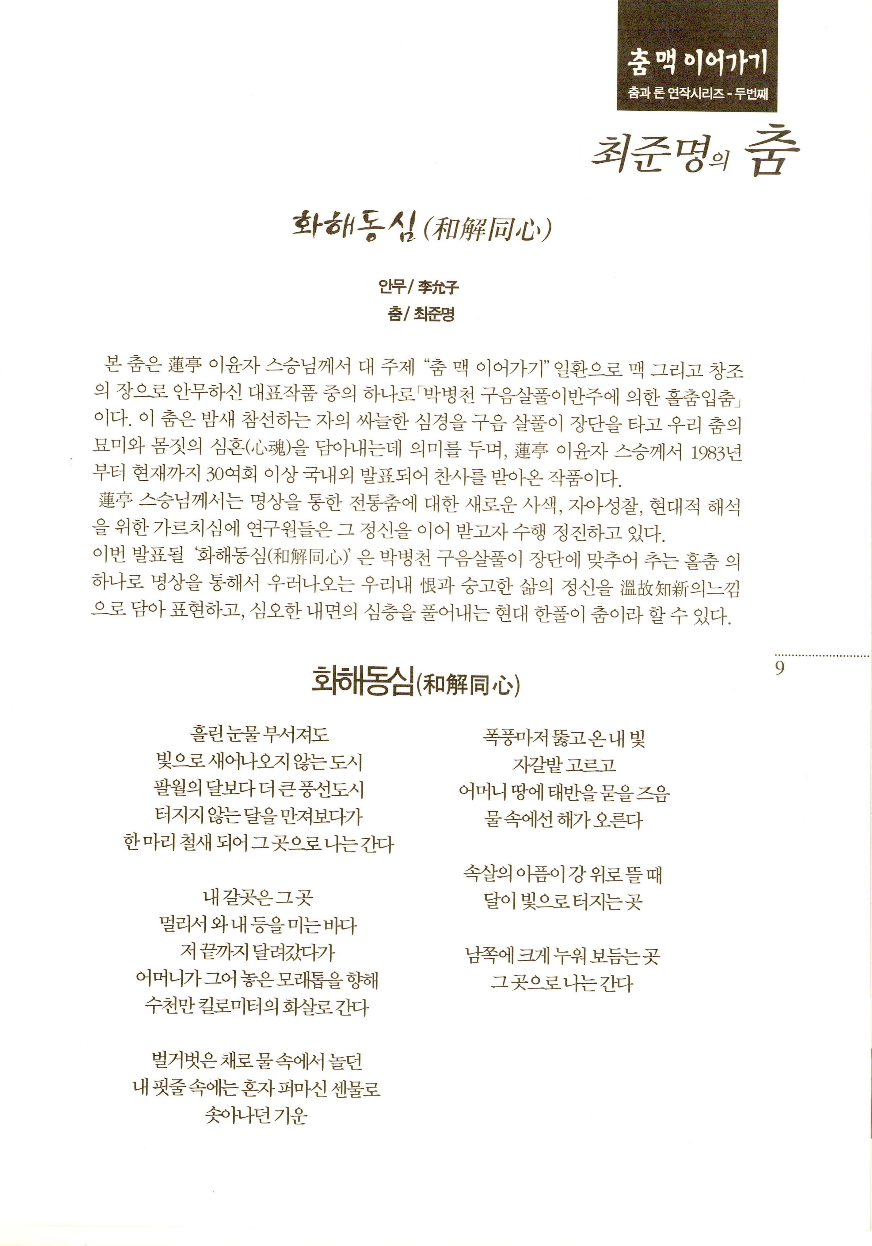 춤과 론 연작시리즈 두 번째로 최준명의 춤으로 공연되었다. 이윤자스승님께서 대 주제 "춤 맥 이어가기" 일환으로 맥 그리고 창조의 장으로 안무하신 대표작품 중의 하나로 "박병천 구음살풀이반주에 의한 홀춤입춤"이다. 이춤은 밤새 참선하는 자의 싸늘한 심경을 구음 살풀이 장단을 타고 우리 춤의 묘미부터 몸짓의 심혼(心魂)을 담아내는데 의미를 두고 있다.